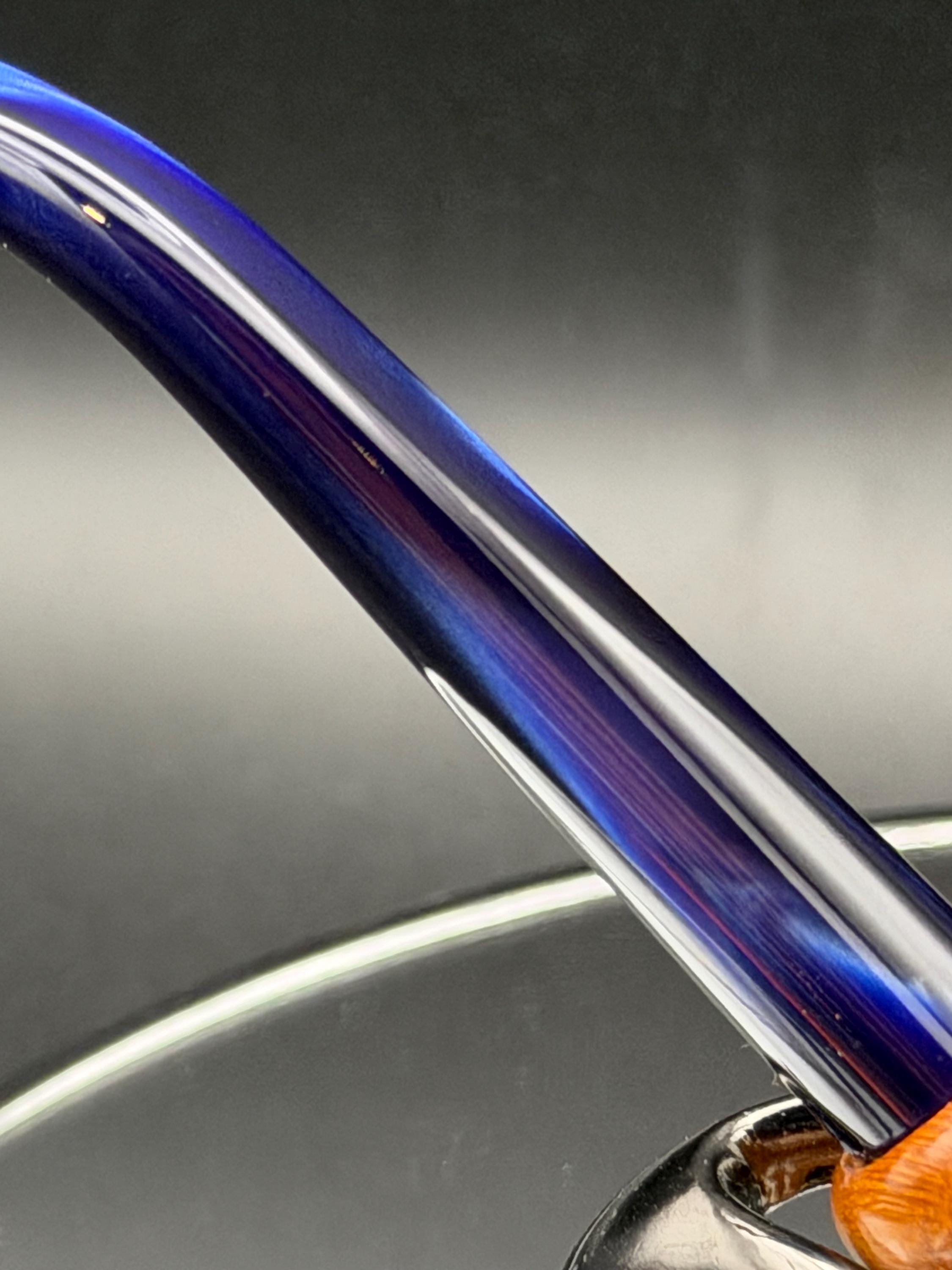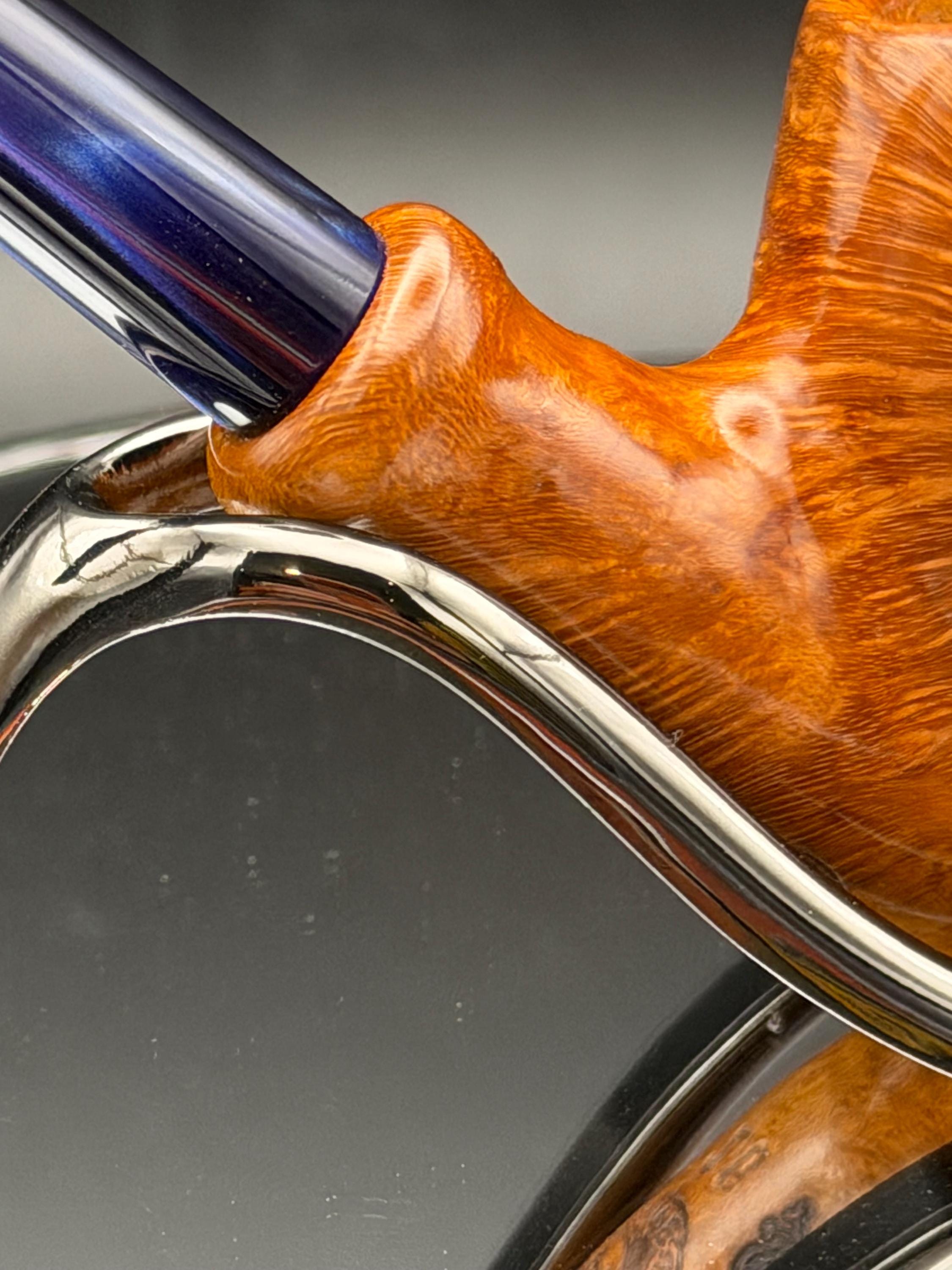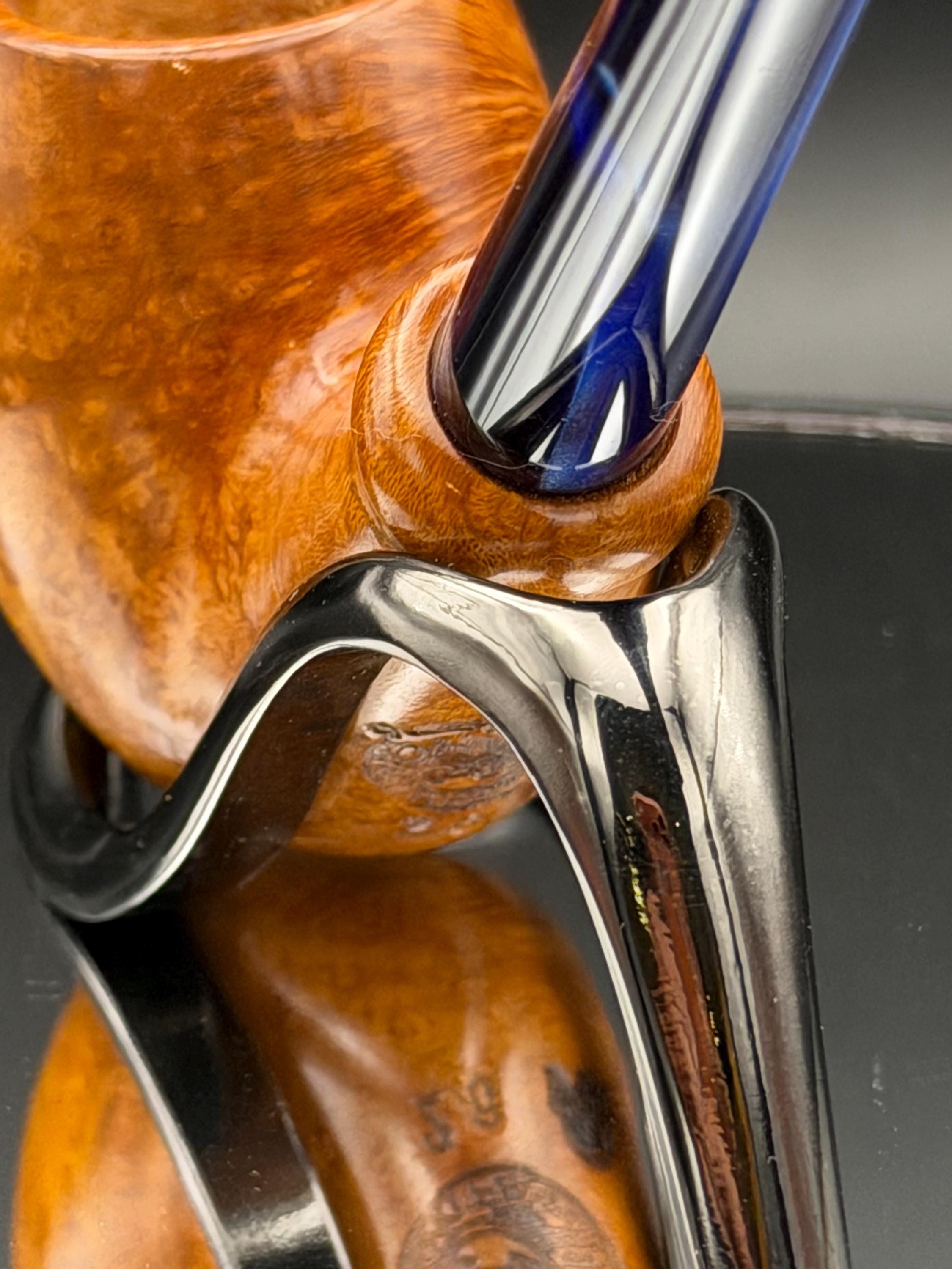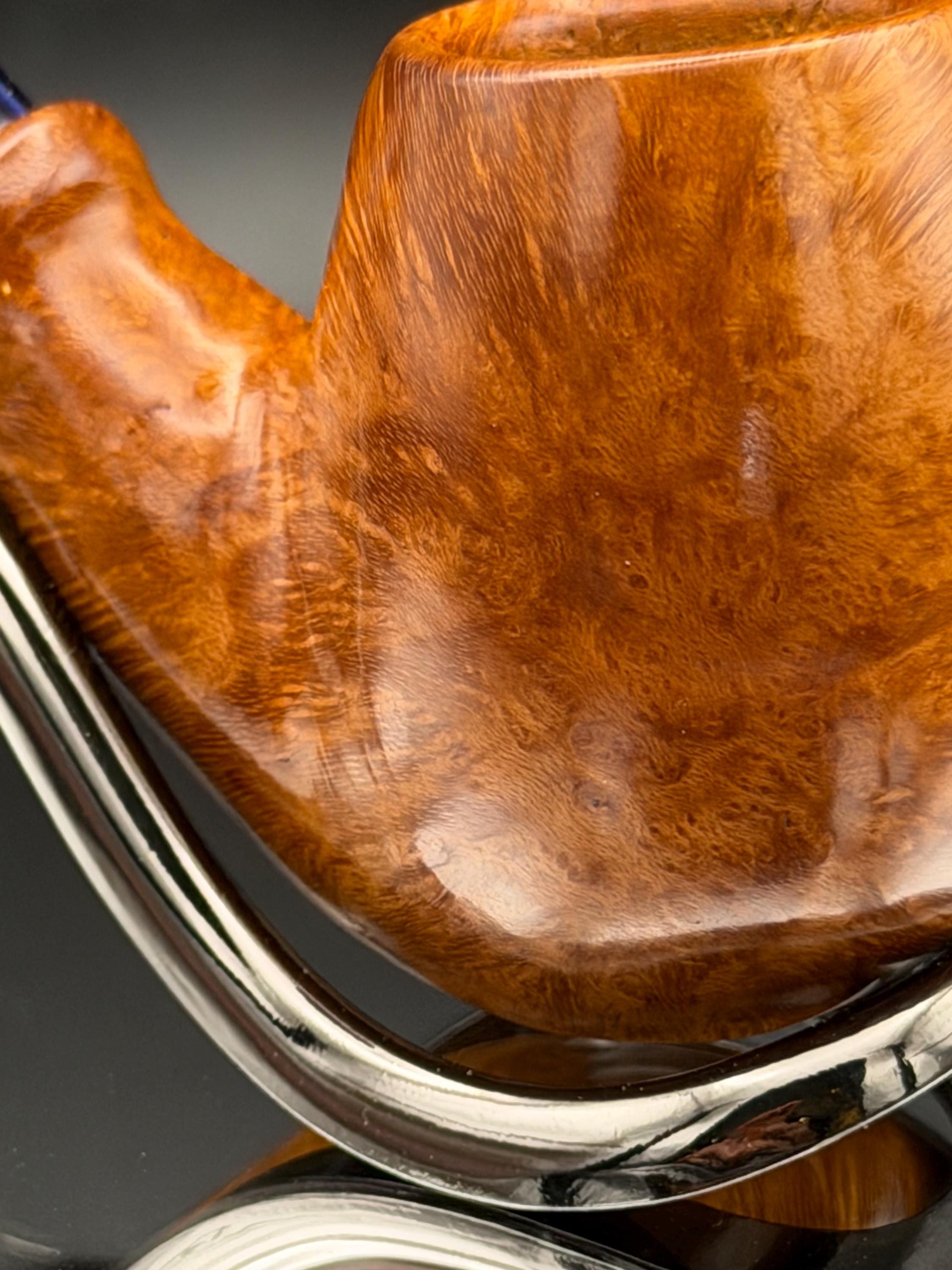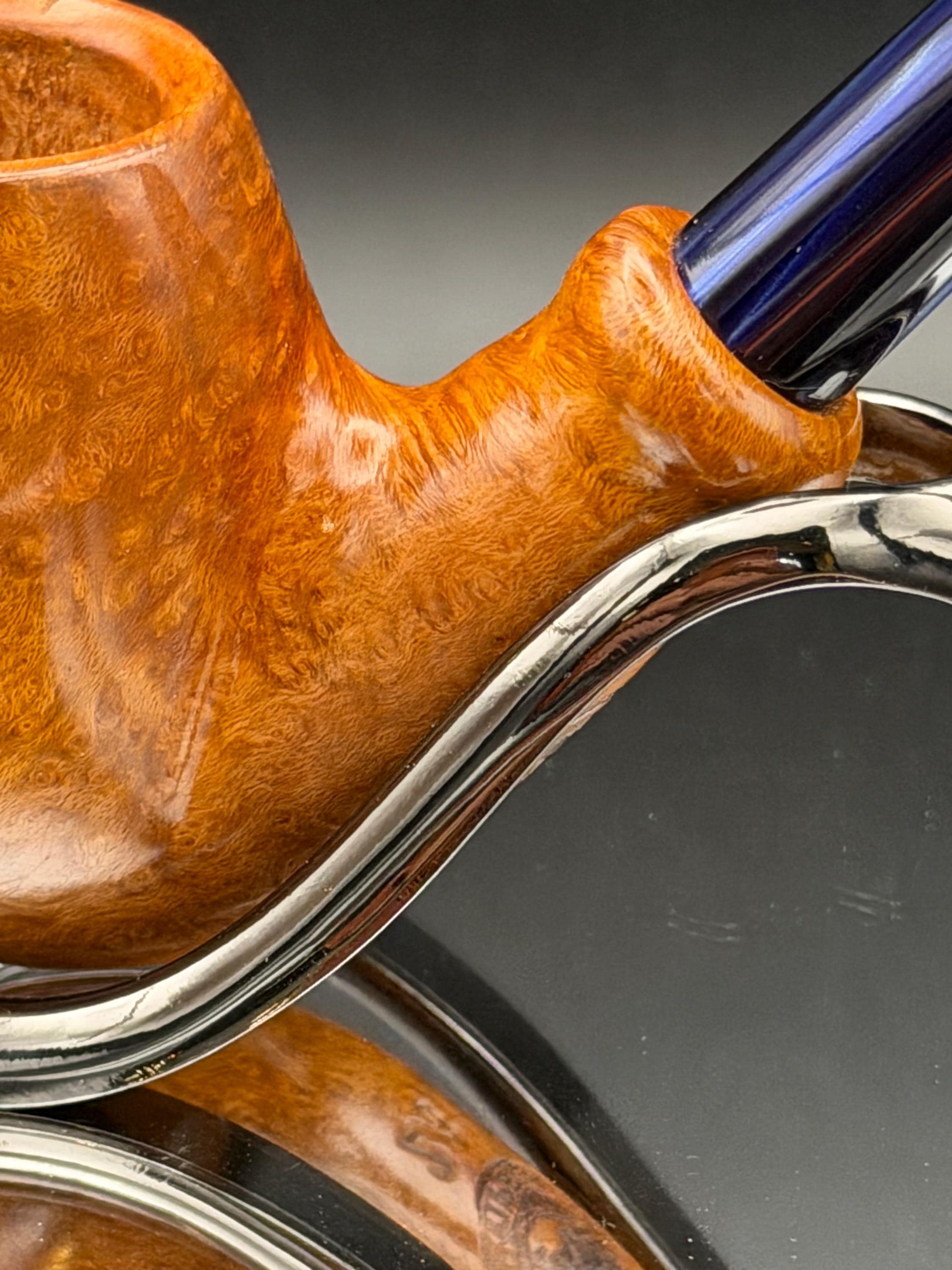 This is a handmade briar pipe that has been carved and sanded by hand . A beautiful acrylic custom made stem was made for it. Non filtered. A very nice daily smoker. medium size and has a little length to it. 7/8x1 3/4 bowl