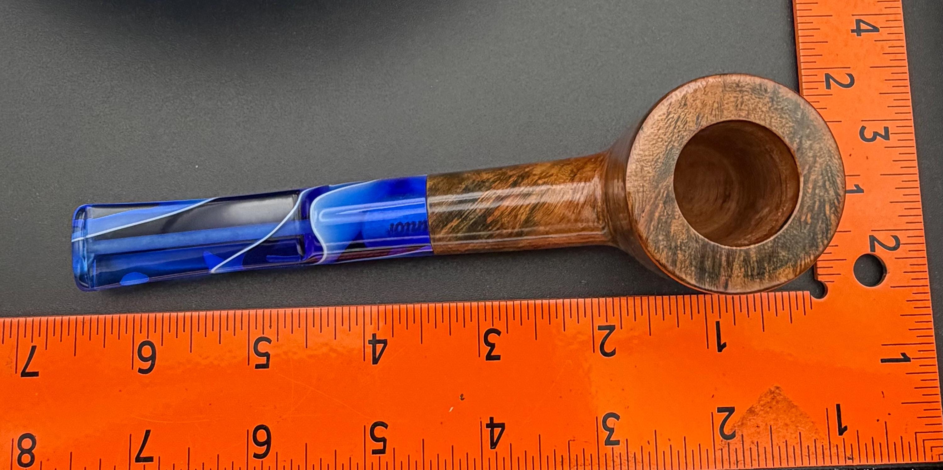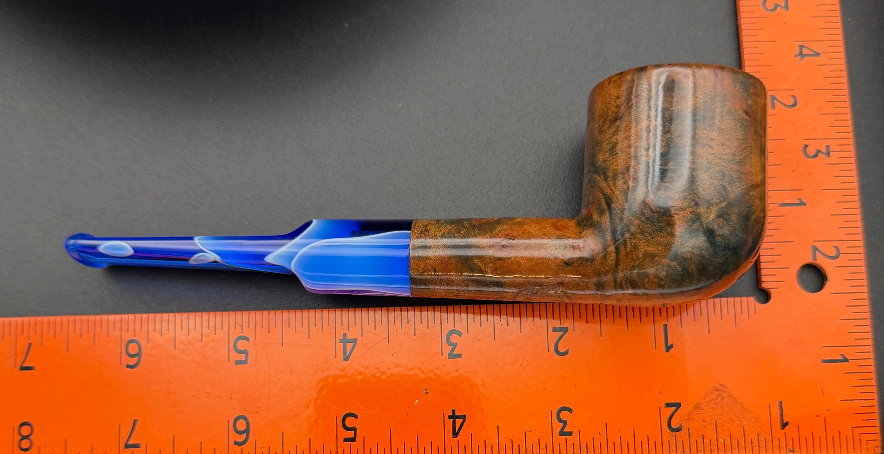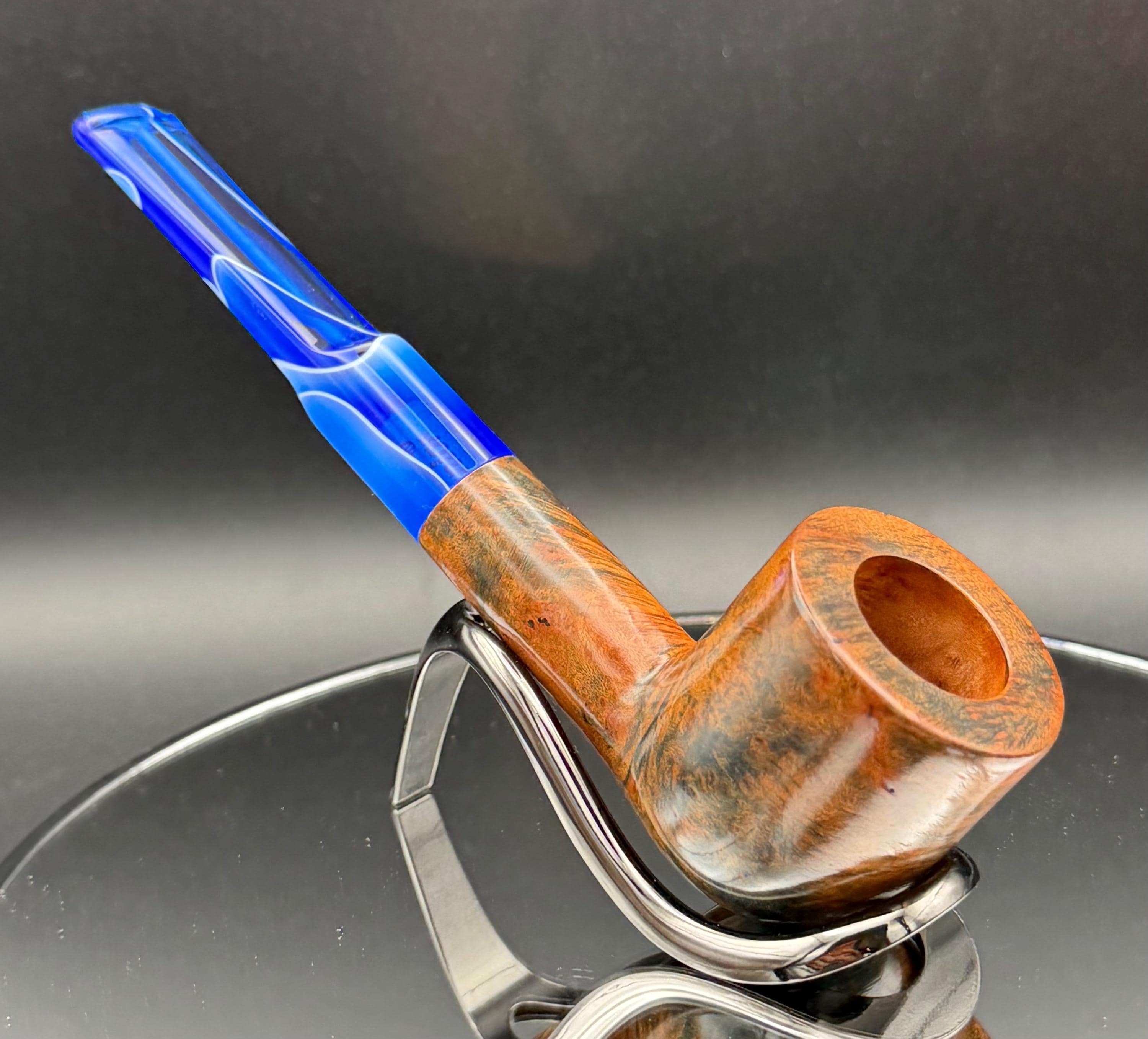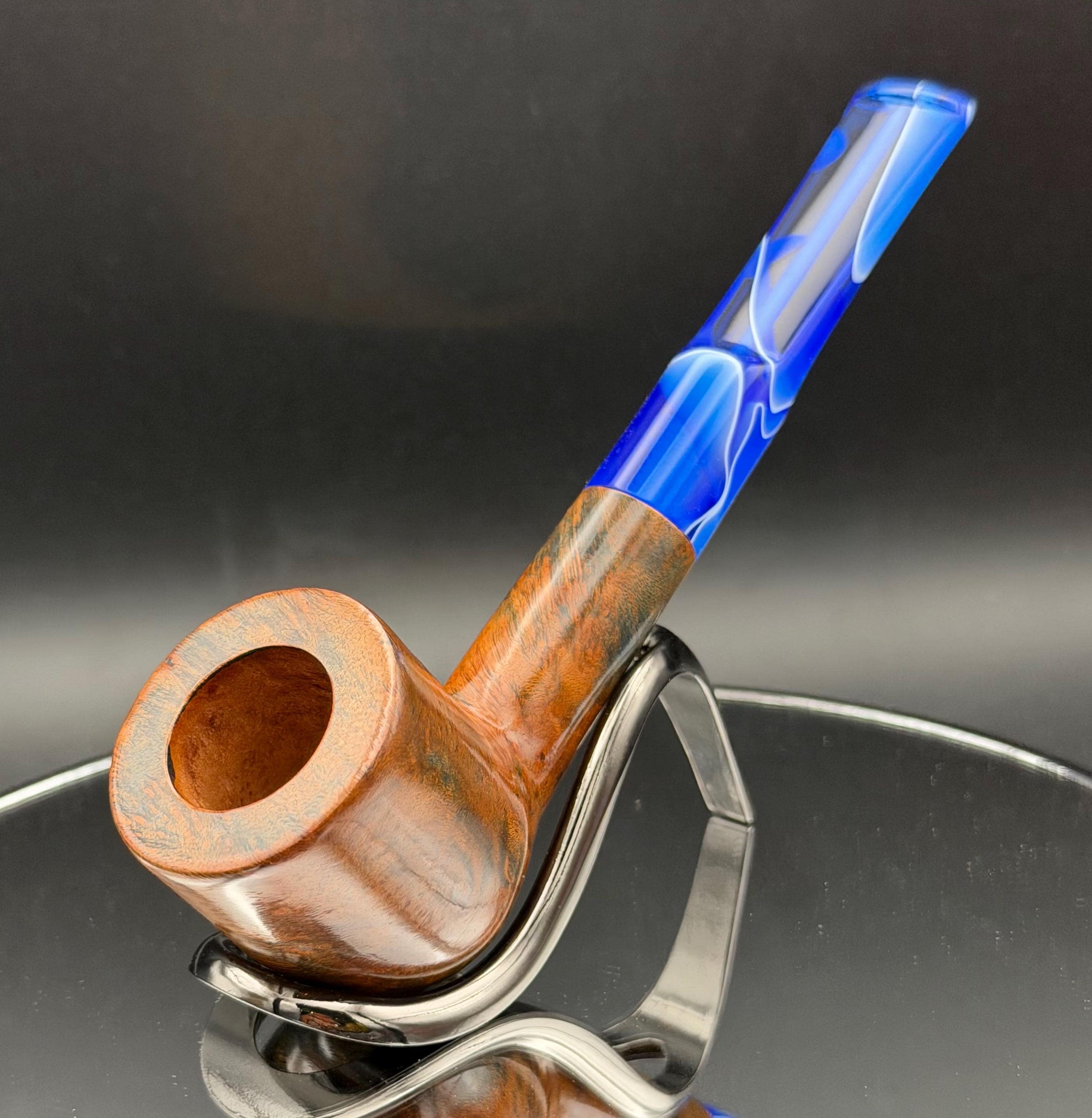 This is a handmade hint of blue colored briar pipe that has been carved and polished by myself . An acrylic stem was formed and polished to finish it off. filtered. A very nice daily smoker. 7/8x1.5 chamber.
