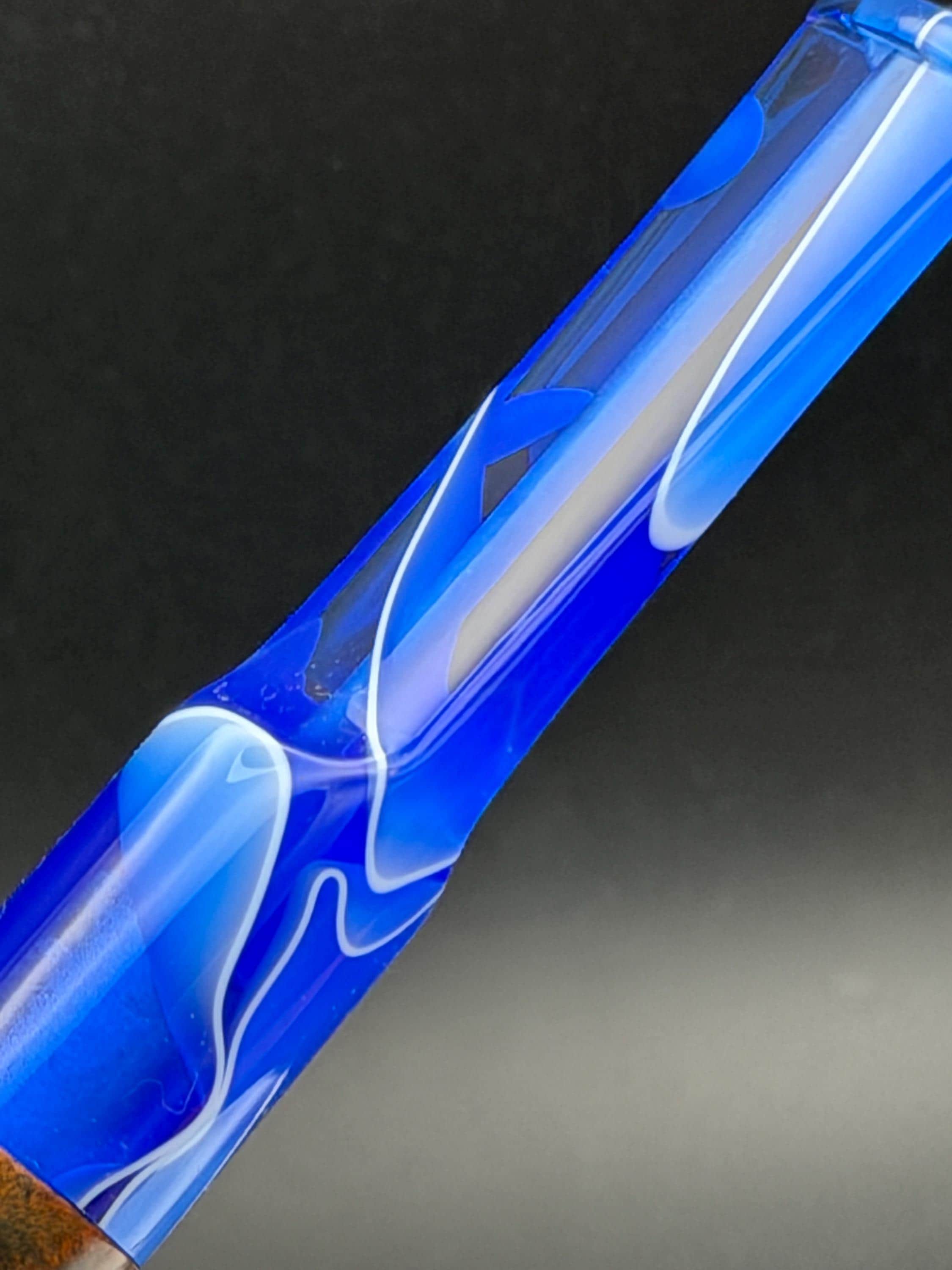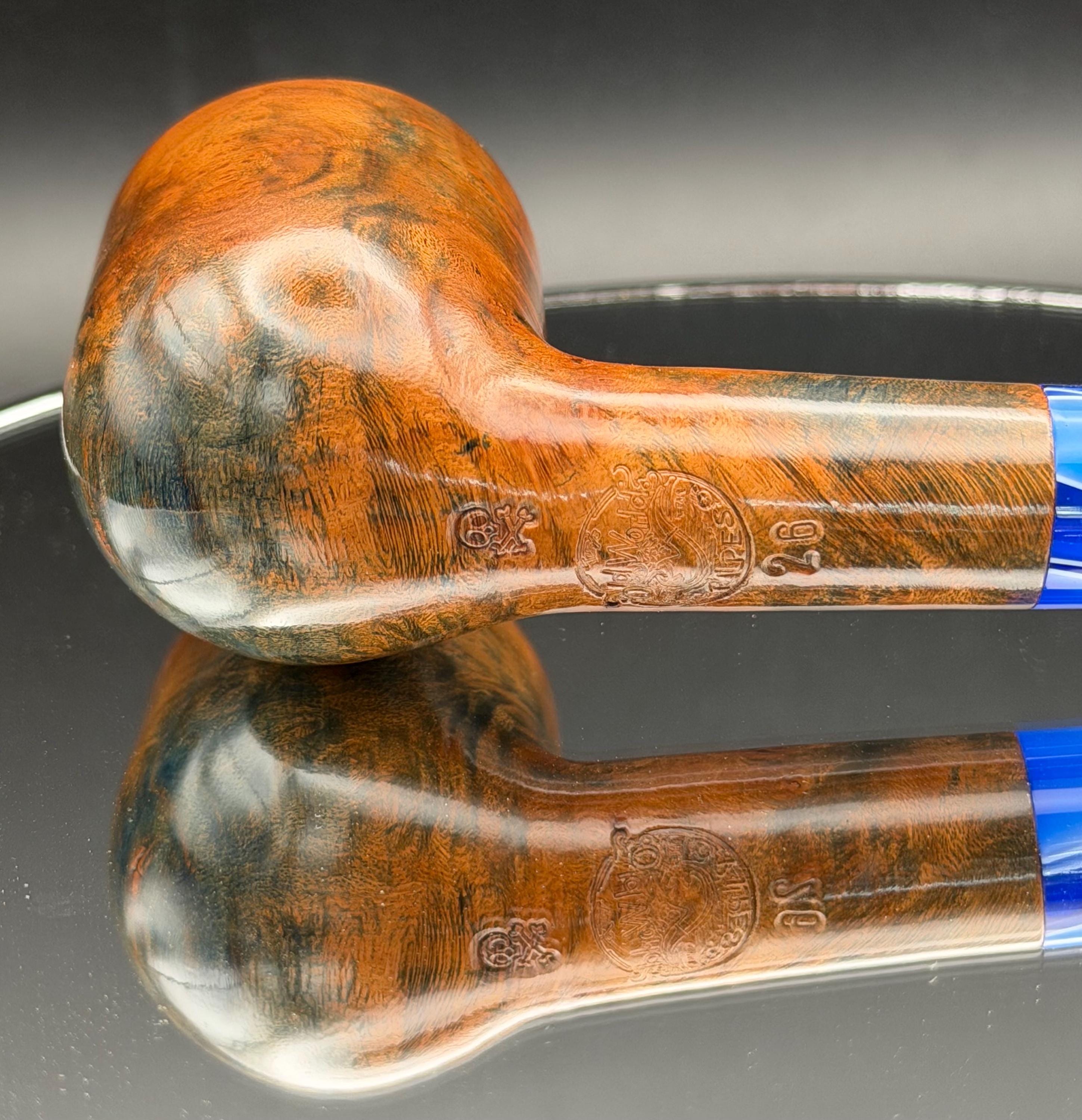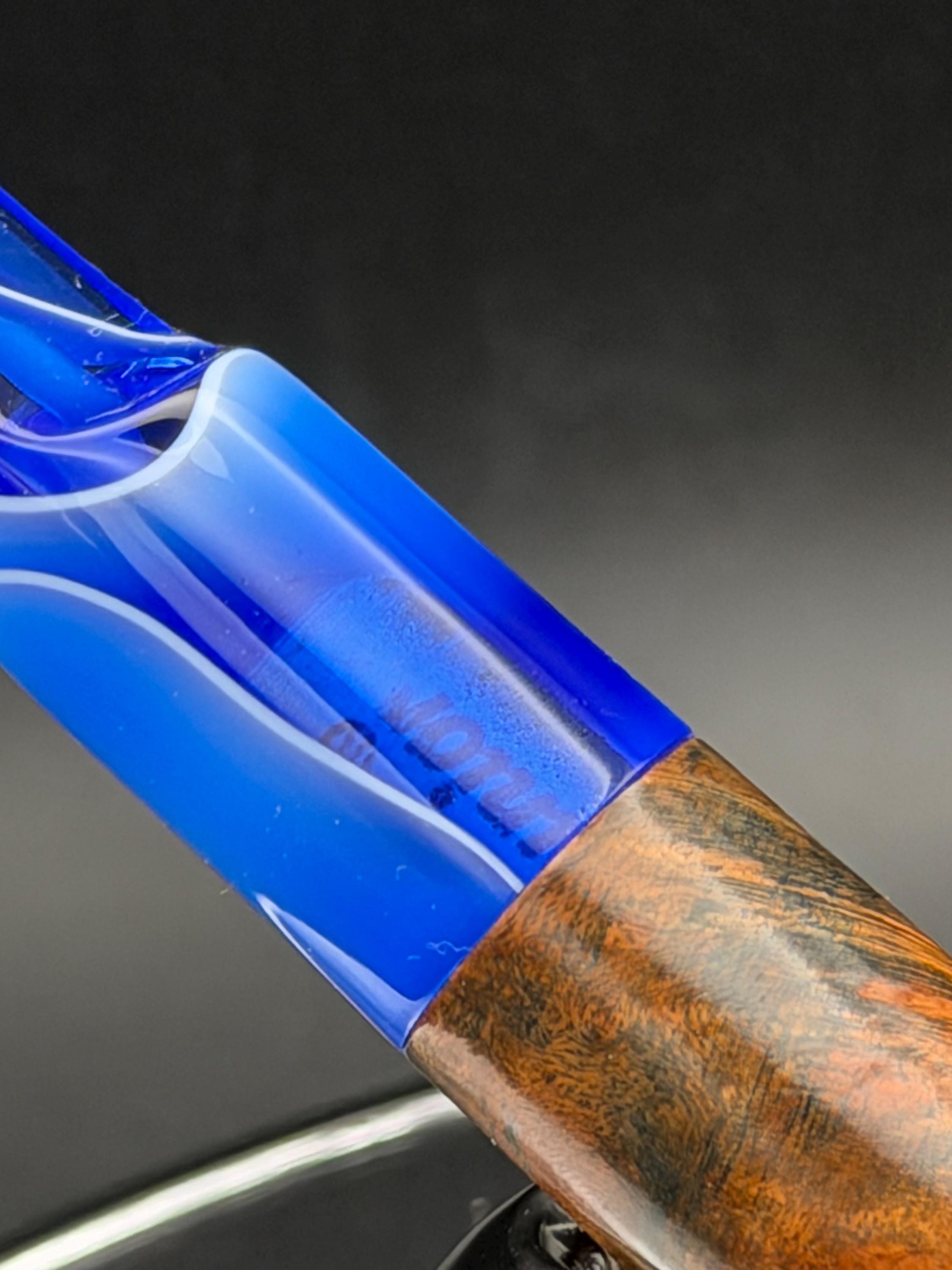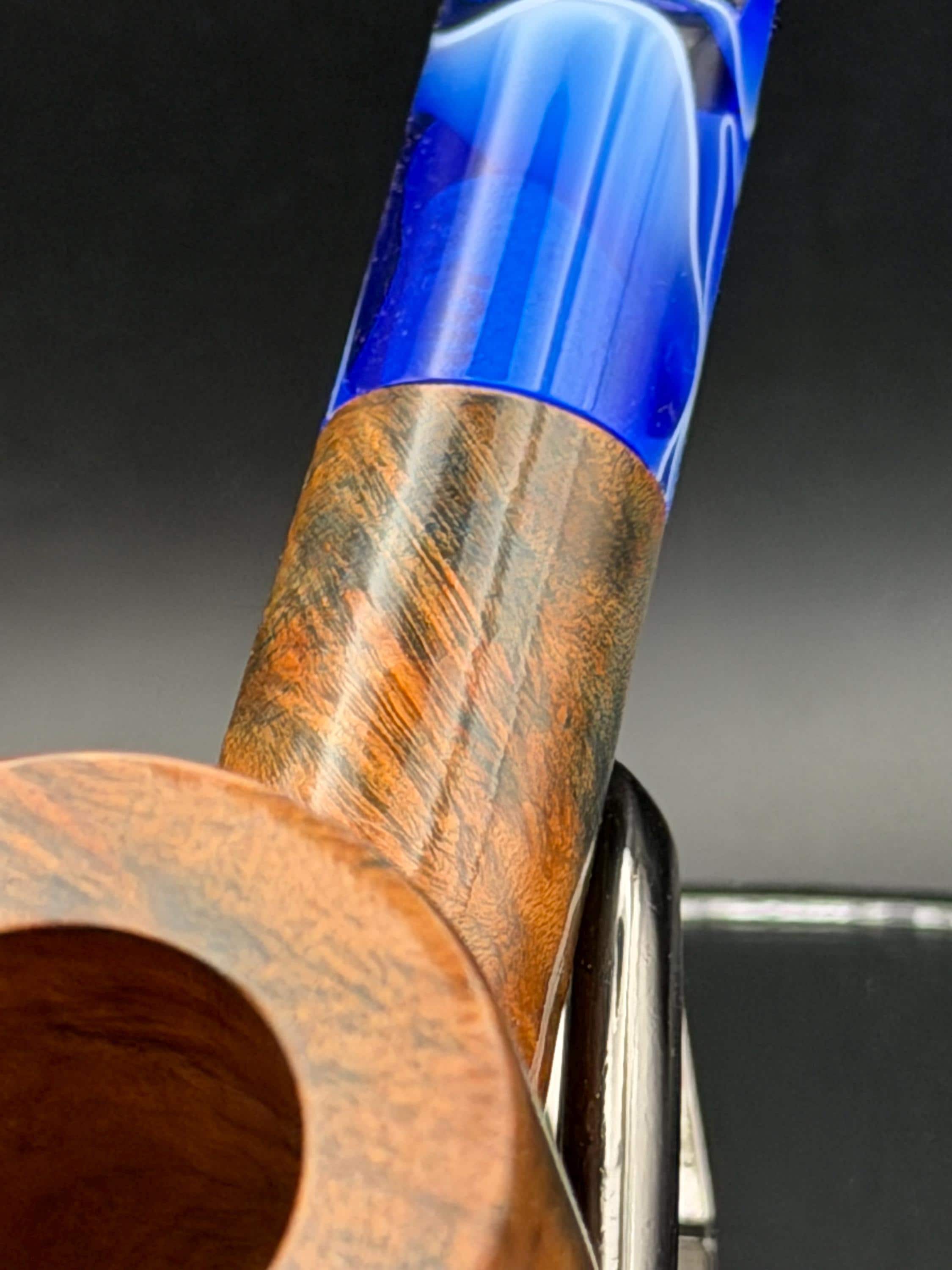This is a handmade hint of blue colored briar pipe that has been carved and polished by myself . An acrylic stem was formed and polished to finish it off. filtered. A very nice daily smoker. 7/8x1.5 chamber.