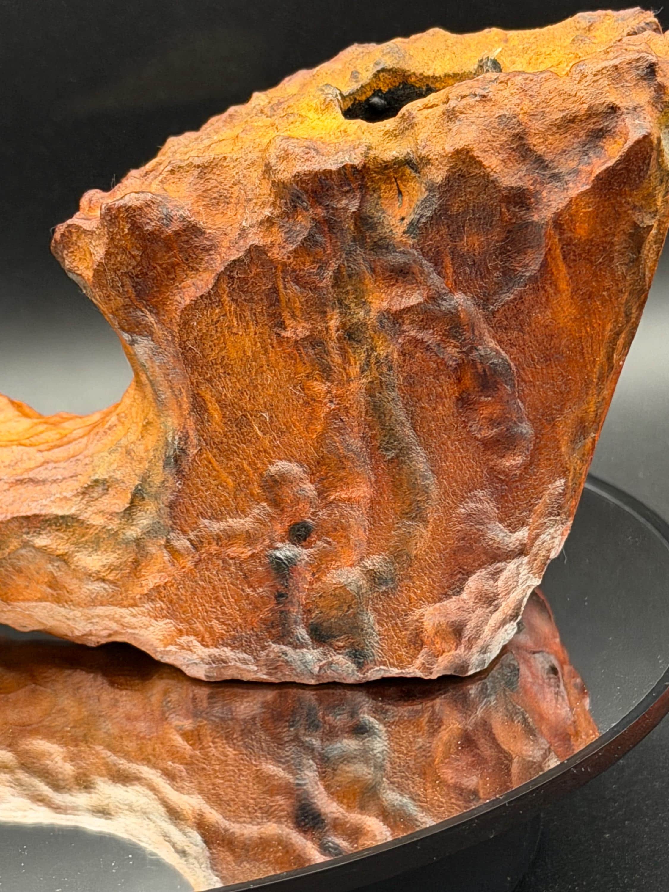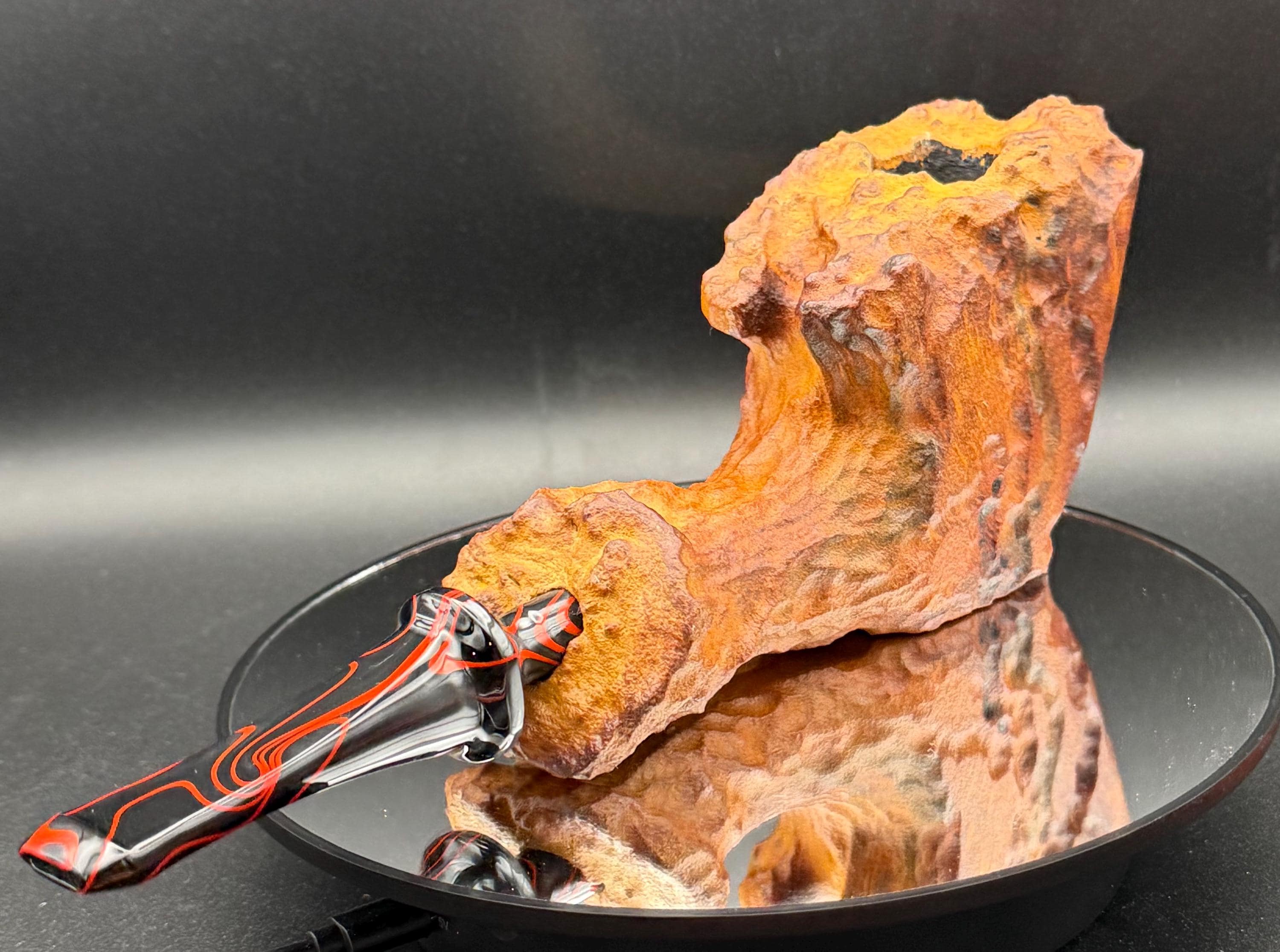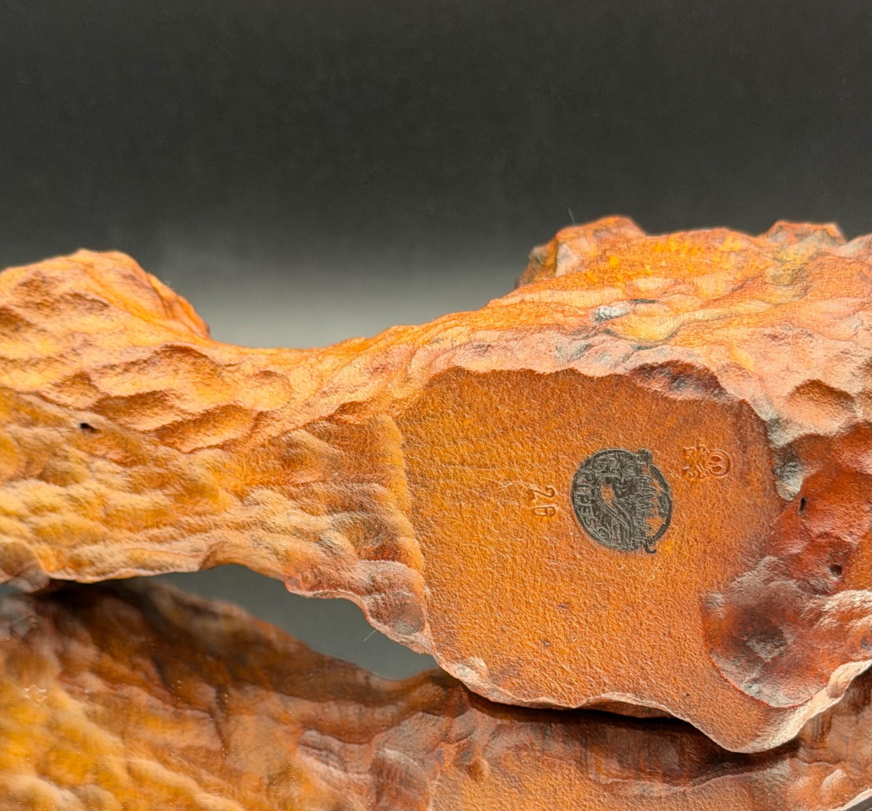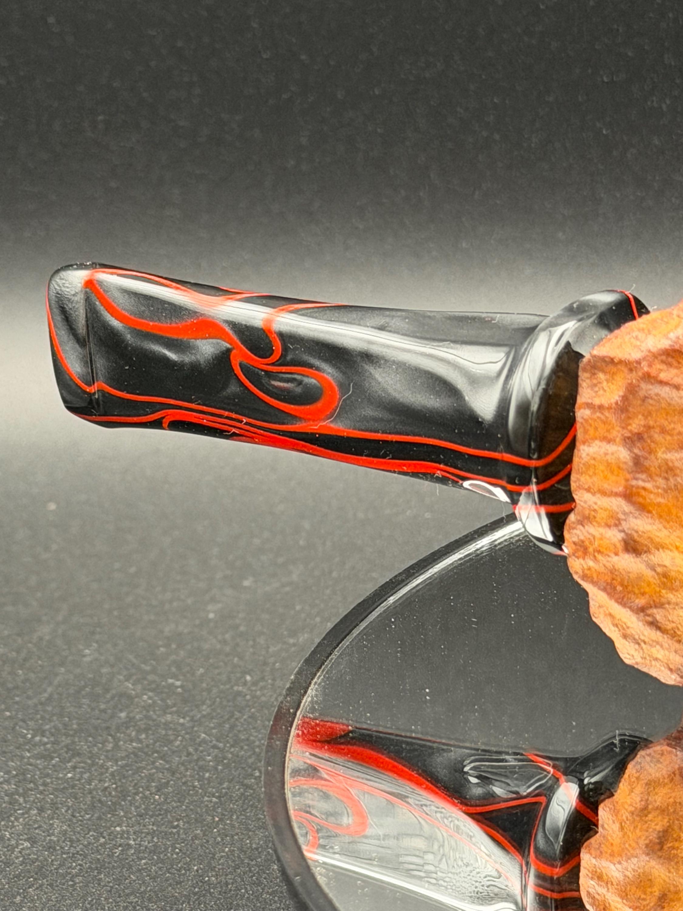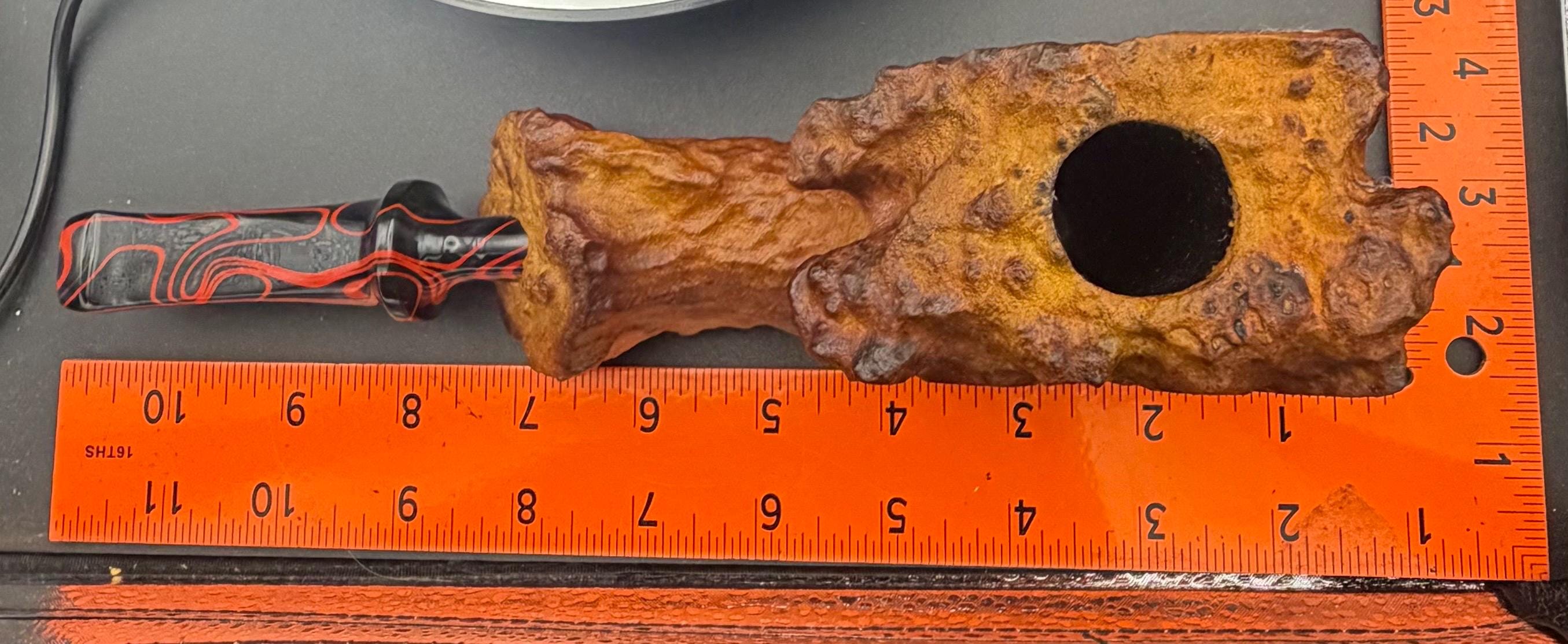 This is a handmade large briar pipe that has been carved and polished/rusticated by me here at the shop. Acrylic larger custom made stem machined and hand filed/polished. Non filtered. A very nice daily smoker. A large 1”x3” chamber and has been coated with a carbon starter cake.
