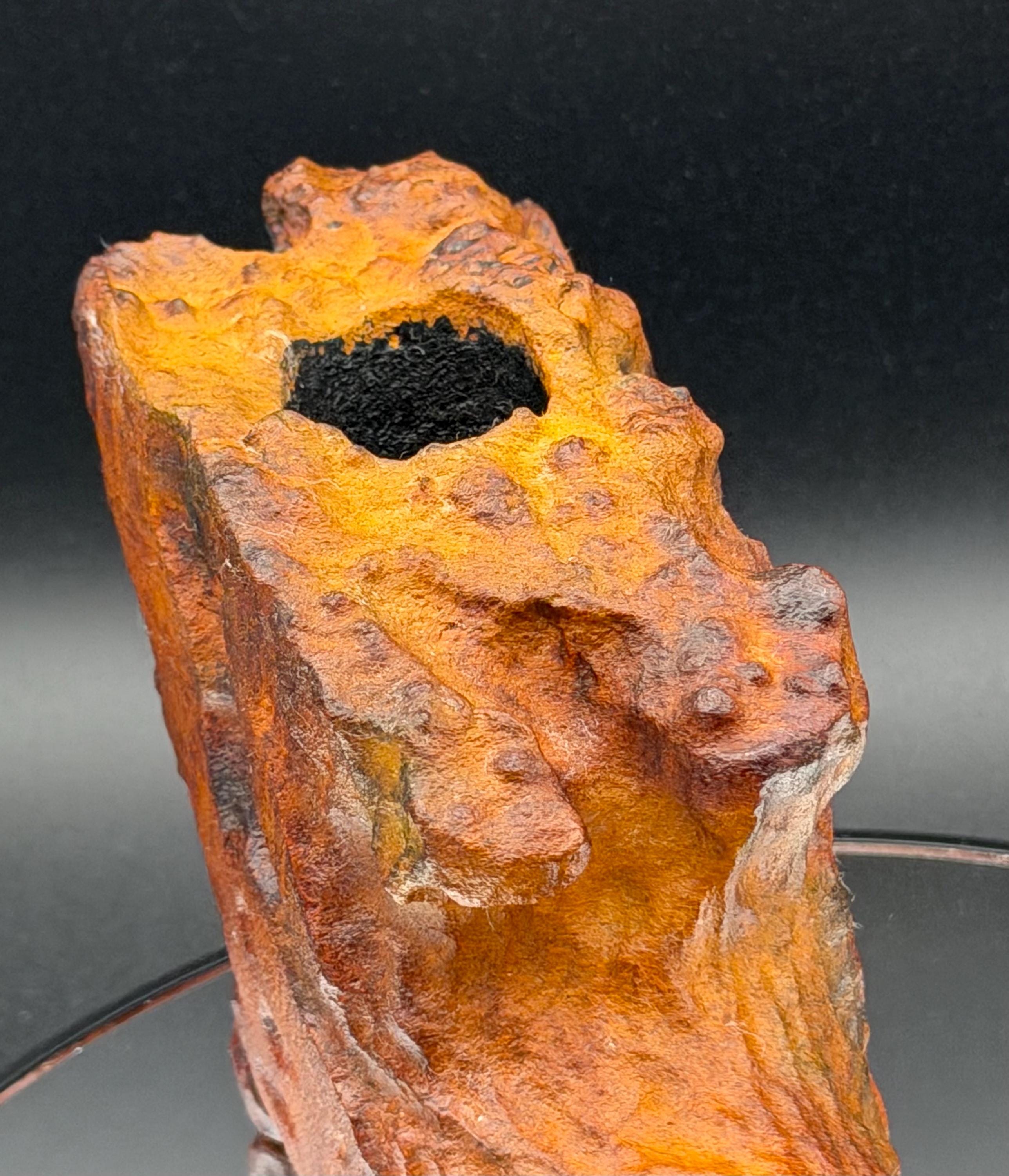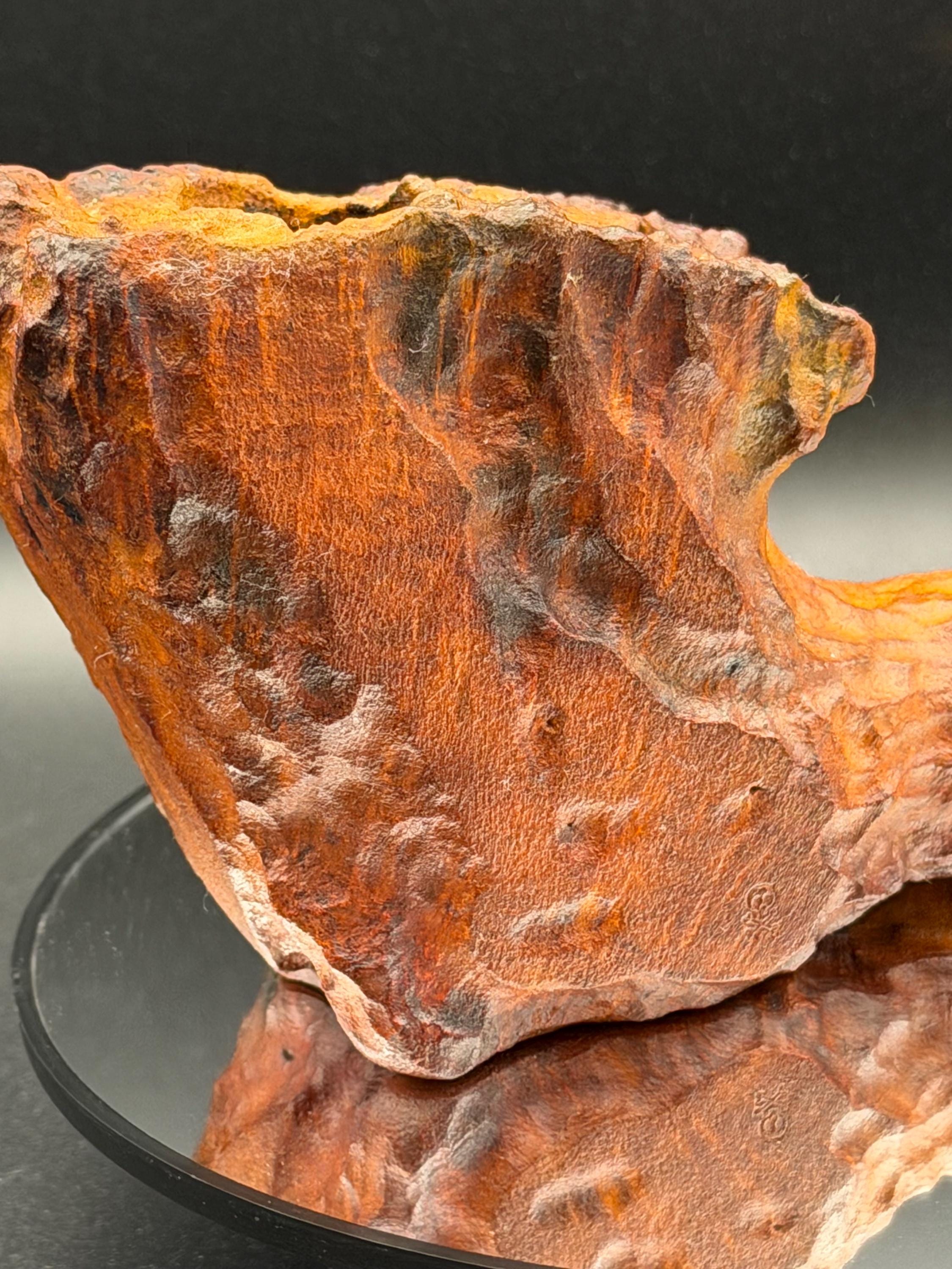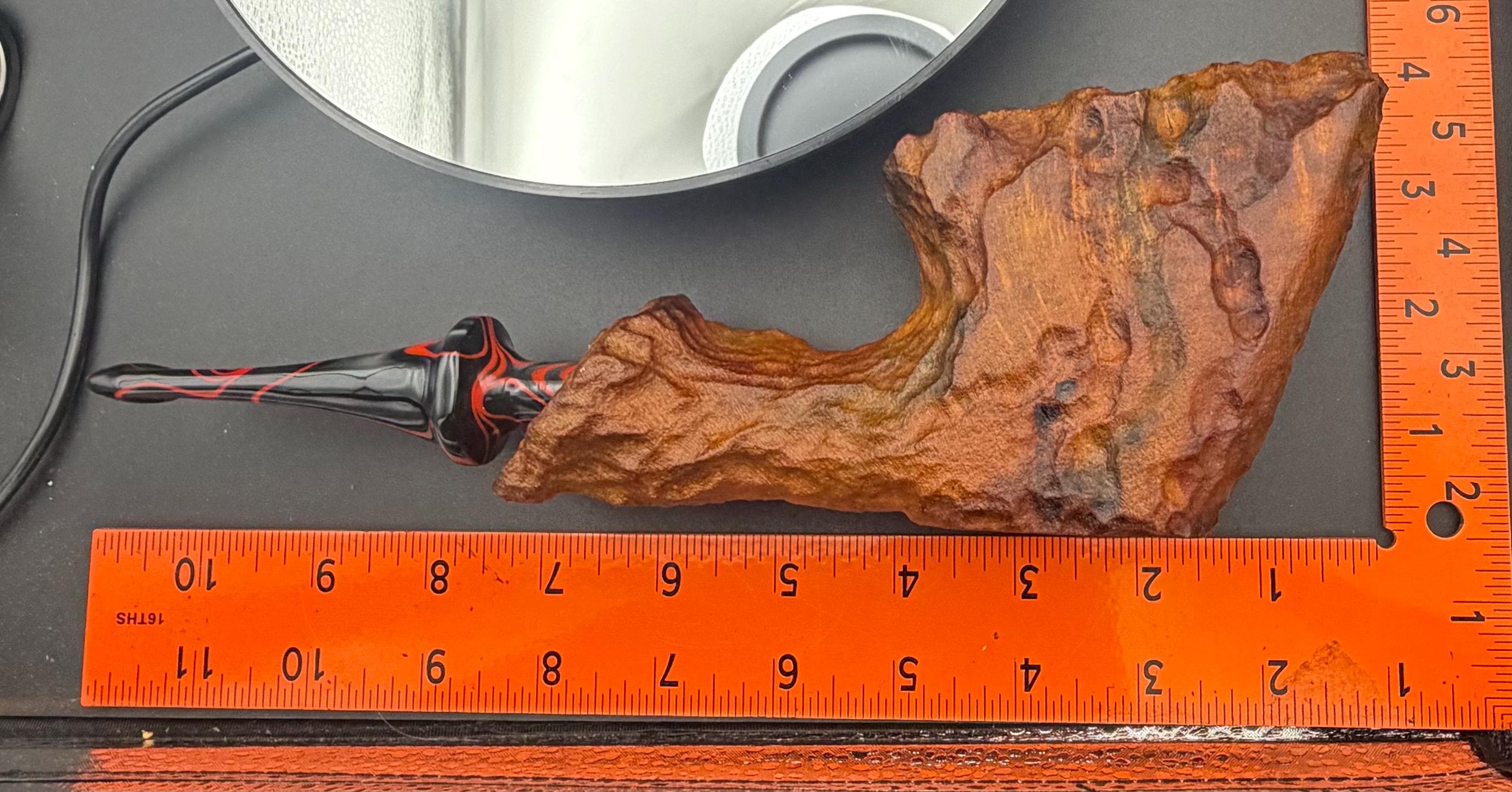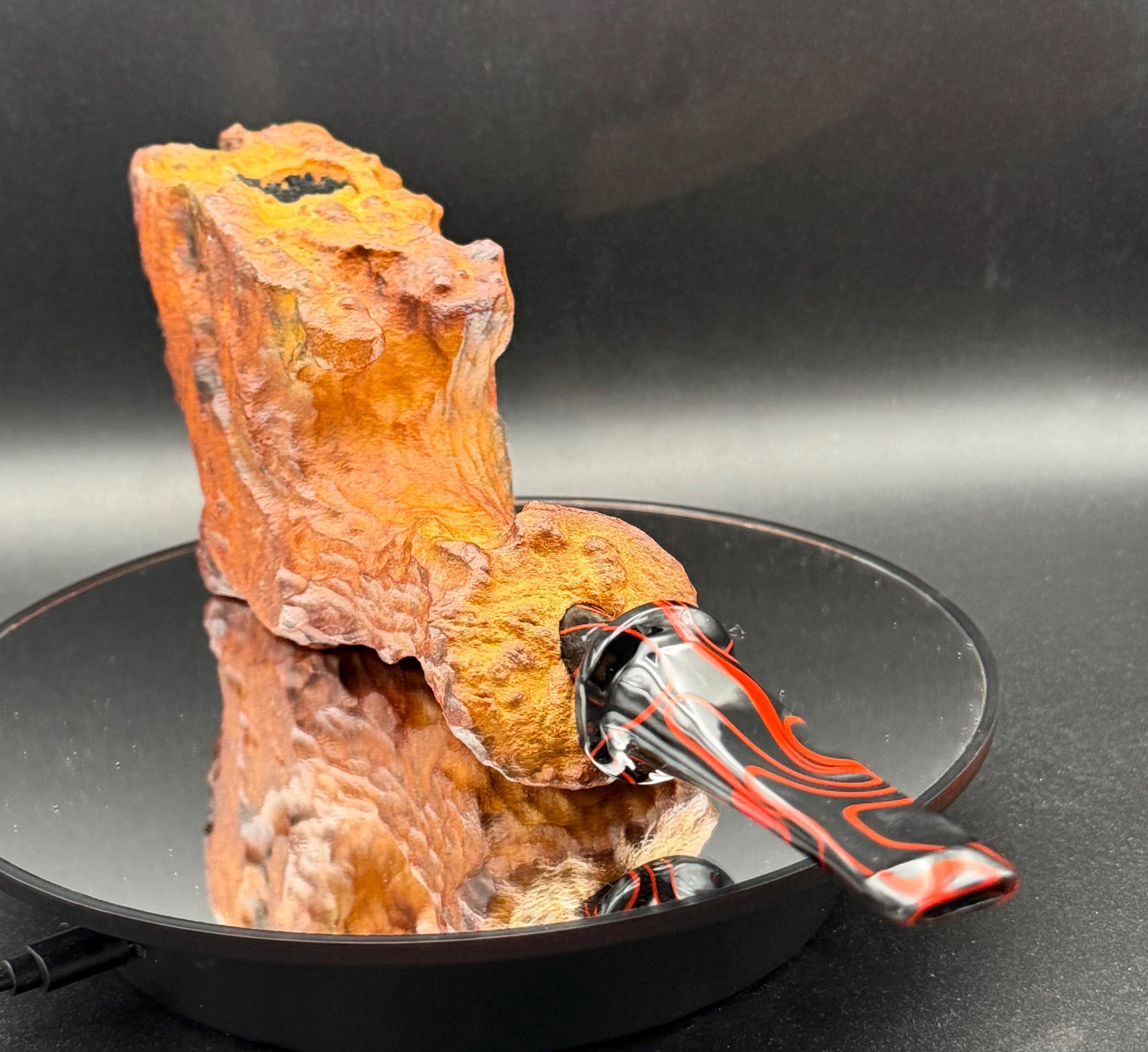 This is a handmade large briar pipe that has been carved and polished/rusticated by me here at the shop. Acrylic larger custom made stem machined and hand filed/polished. Non filtered. A very nice daily smoker. A large 1”x3” chamber and has been coated with a carbon starter cake.