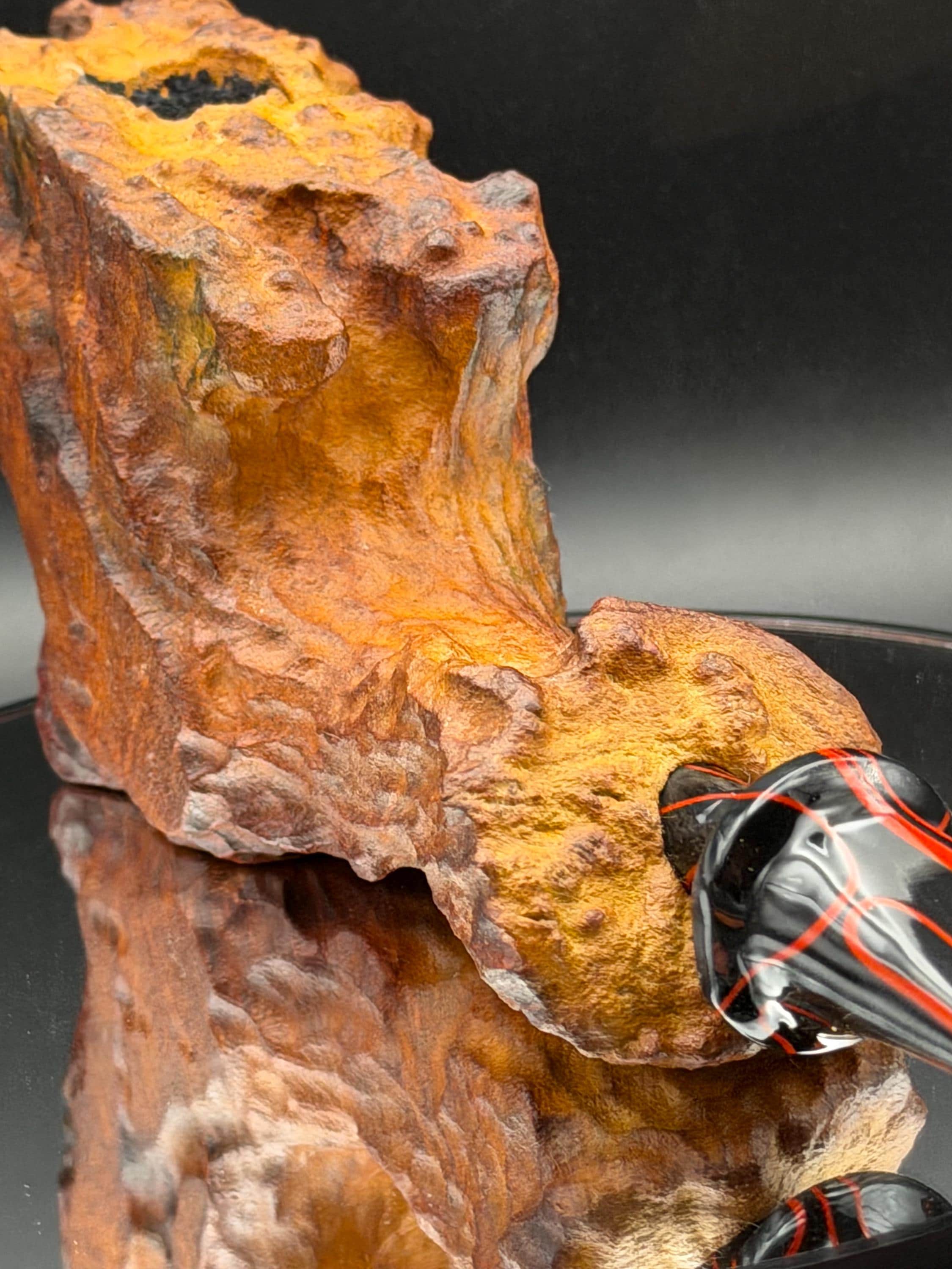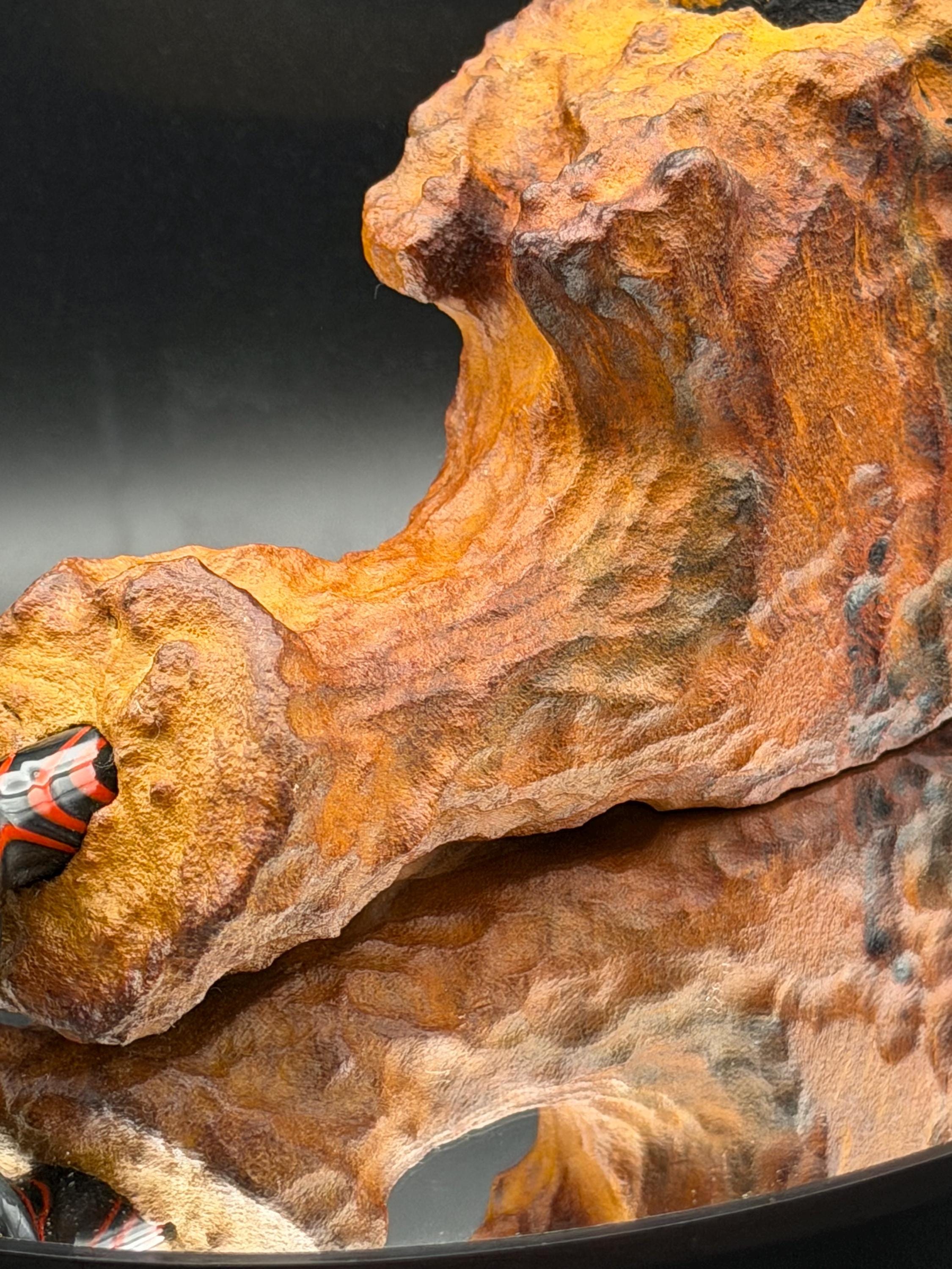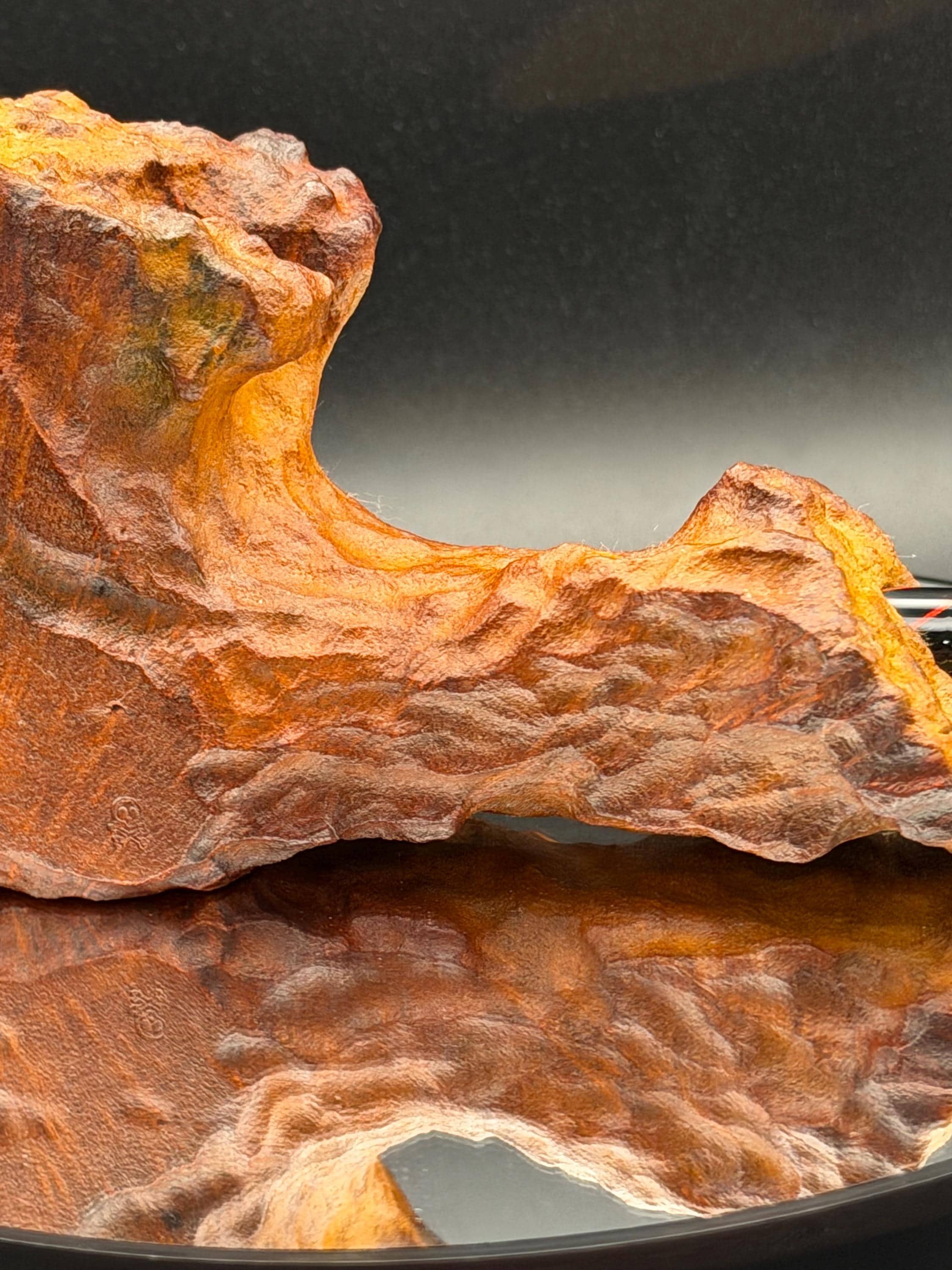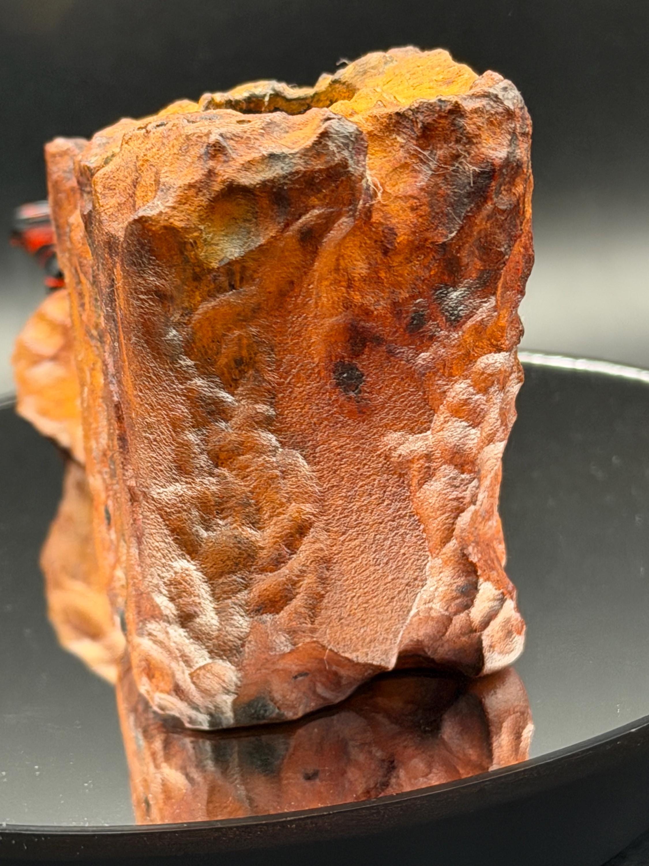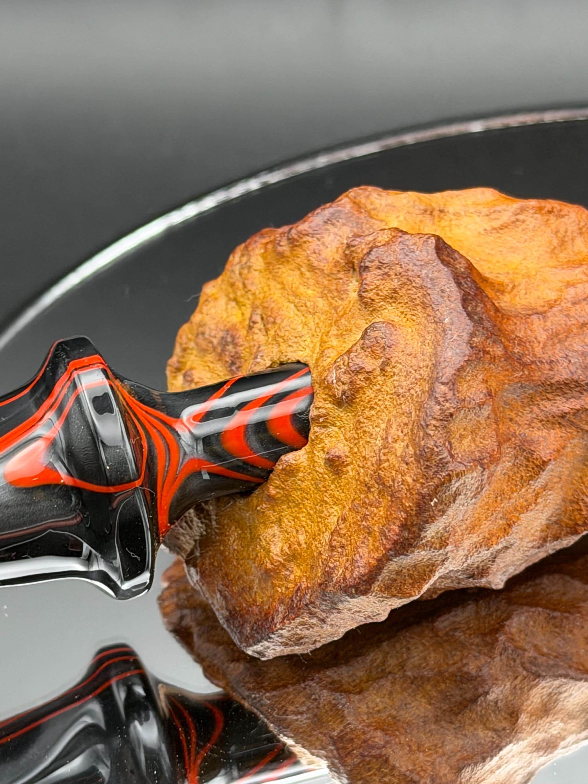 This is a handmade large briar pipe that has been carved and polished/rusticated by me here at the shop. Acrylic larger custom made stem machined and hand filed/polished. Non filtered. A very nice daily smoker. A large 1”x3” chamber and has been coated with a carbon starter cake.