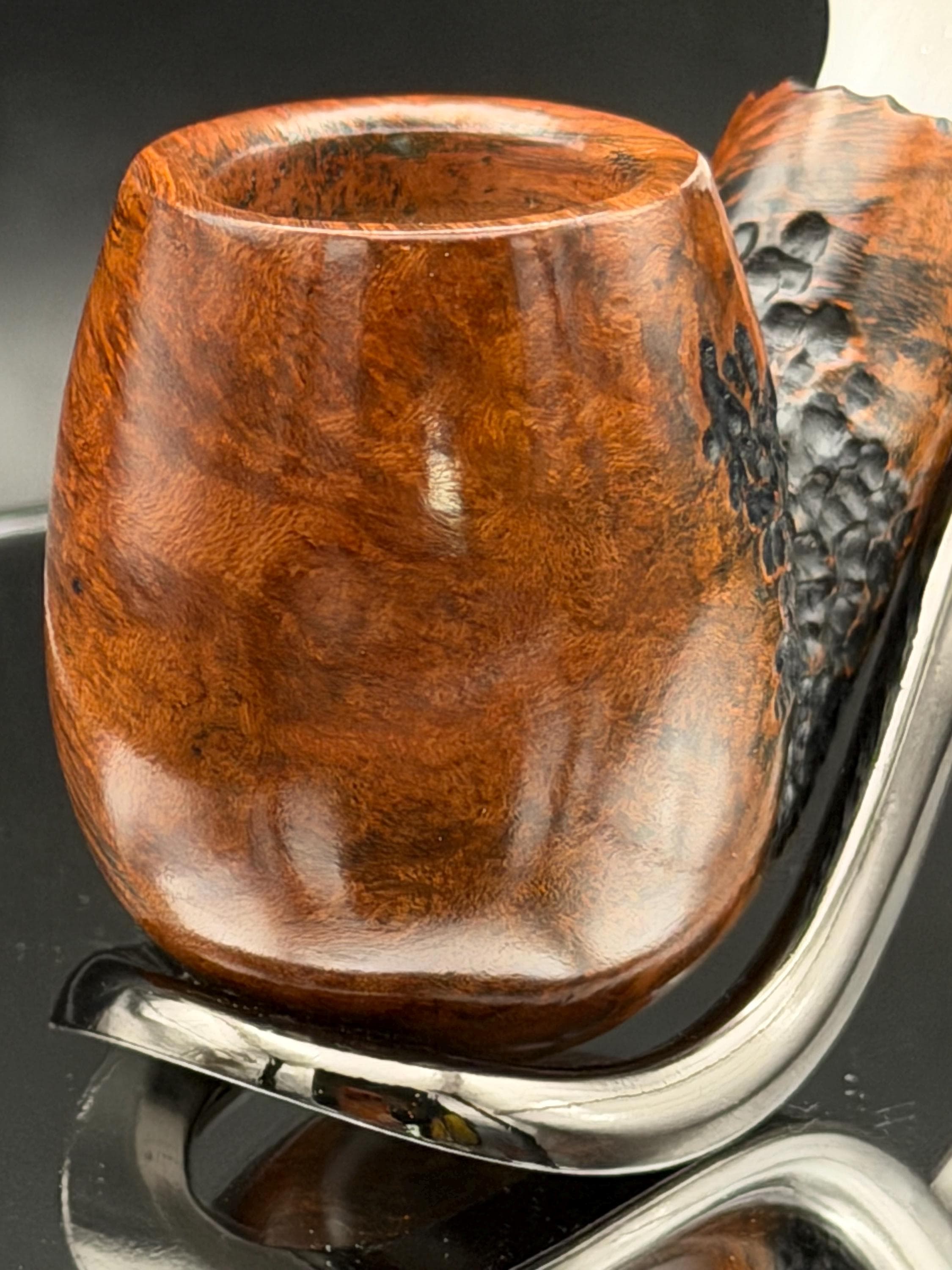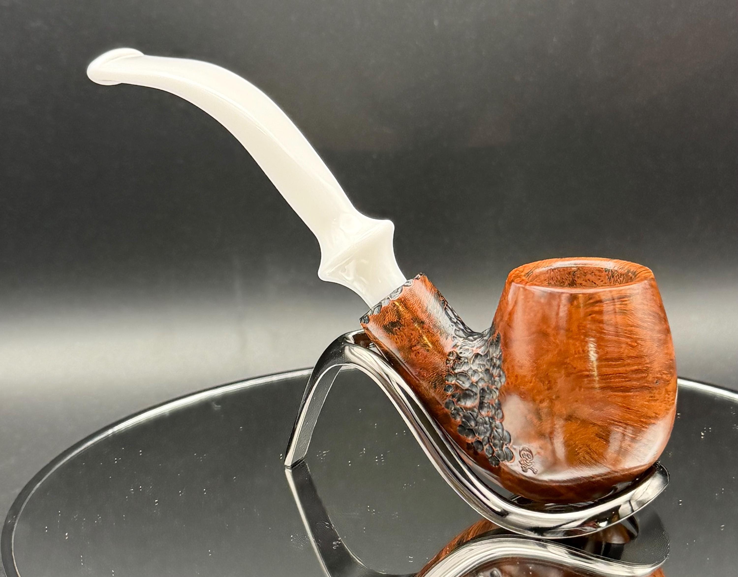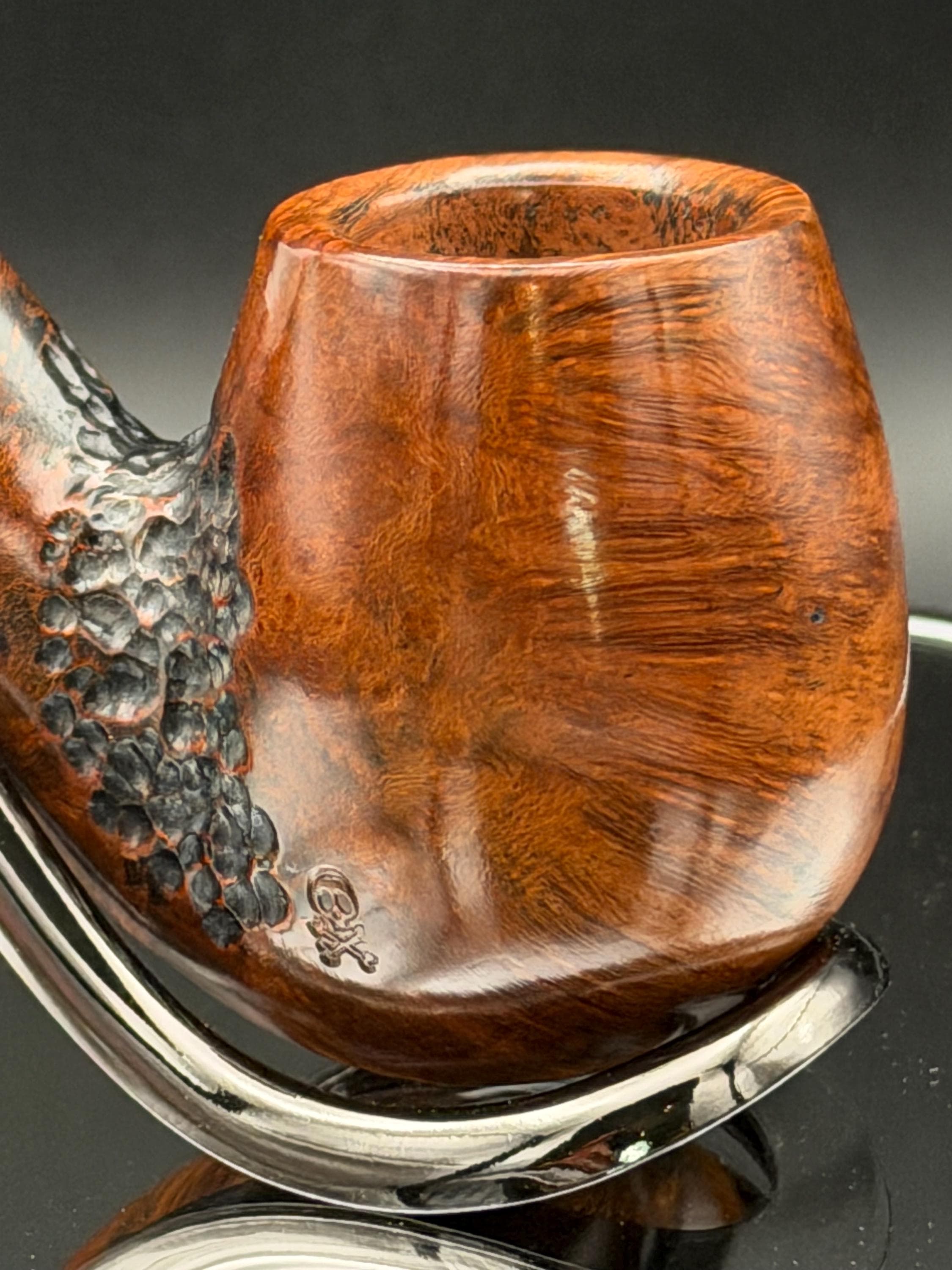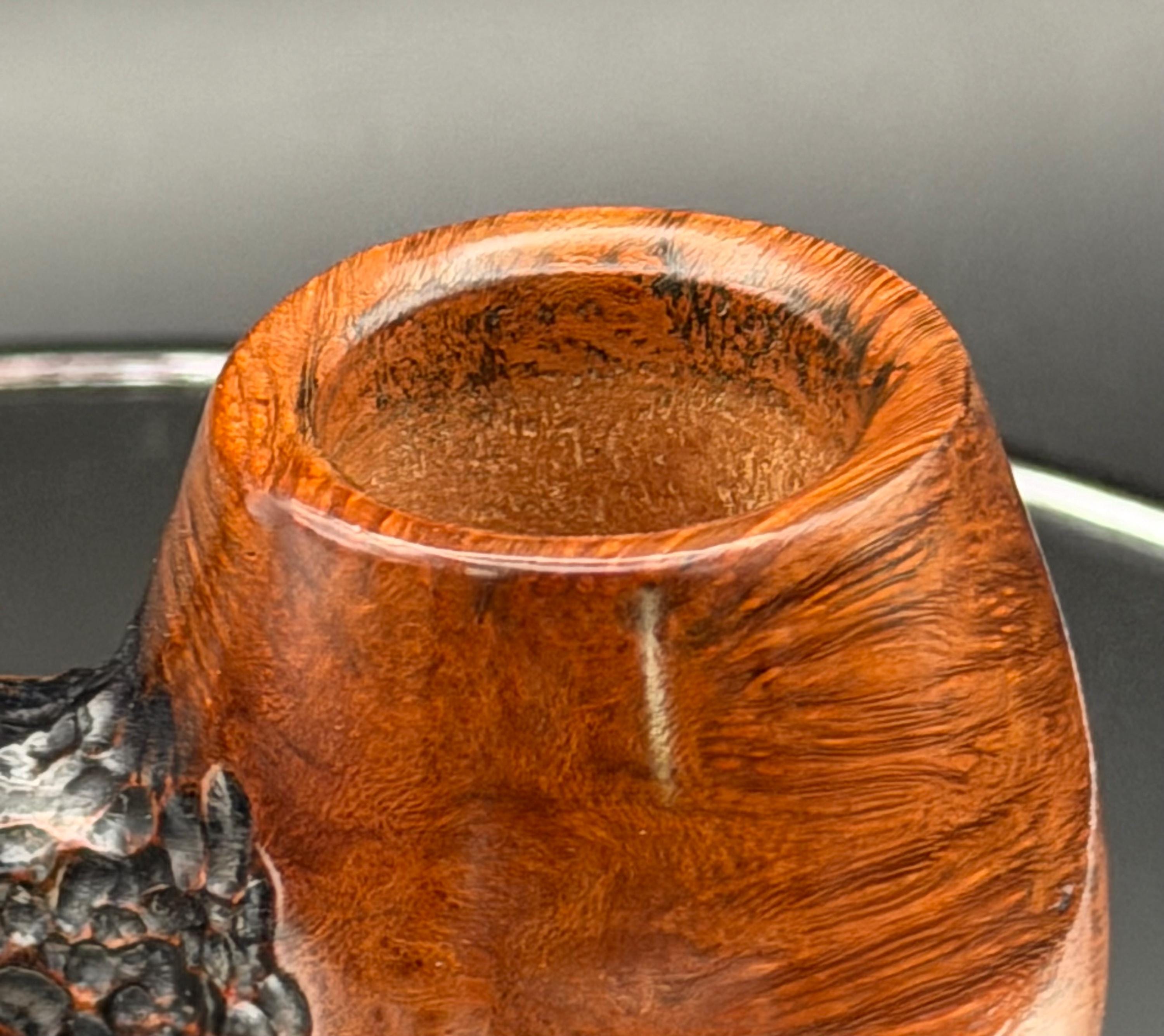 This is a handmade briar pipe that has been carved rusticated and sanded by hand . A beautiful acrylic custom made stem was made for it. Non filtered. A very nice daily smoker. Perfect size for your coat pocket! A nice sized bowl of 7/8x1.5” tapered was made into this one for a nice long smoke.
