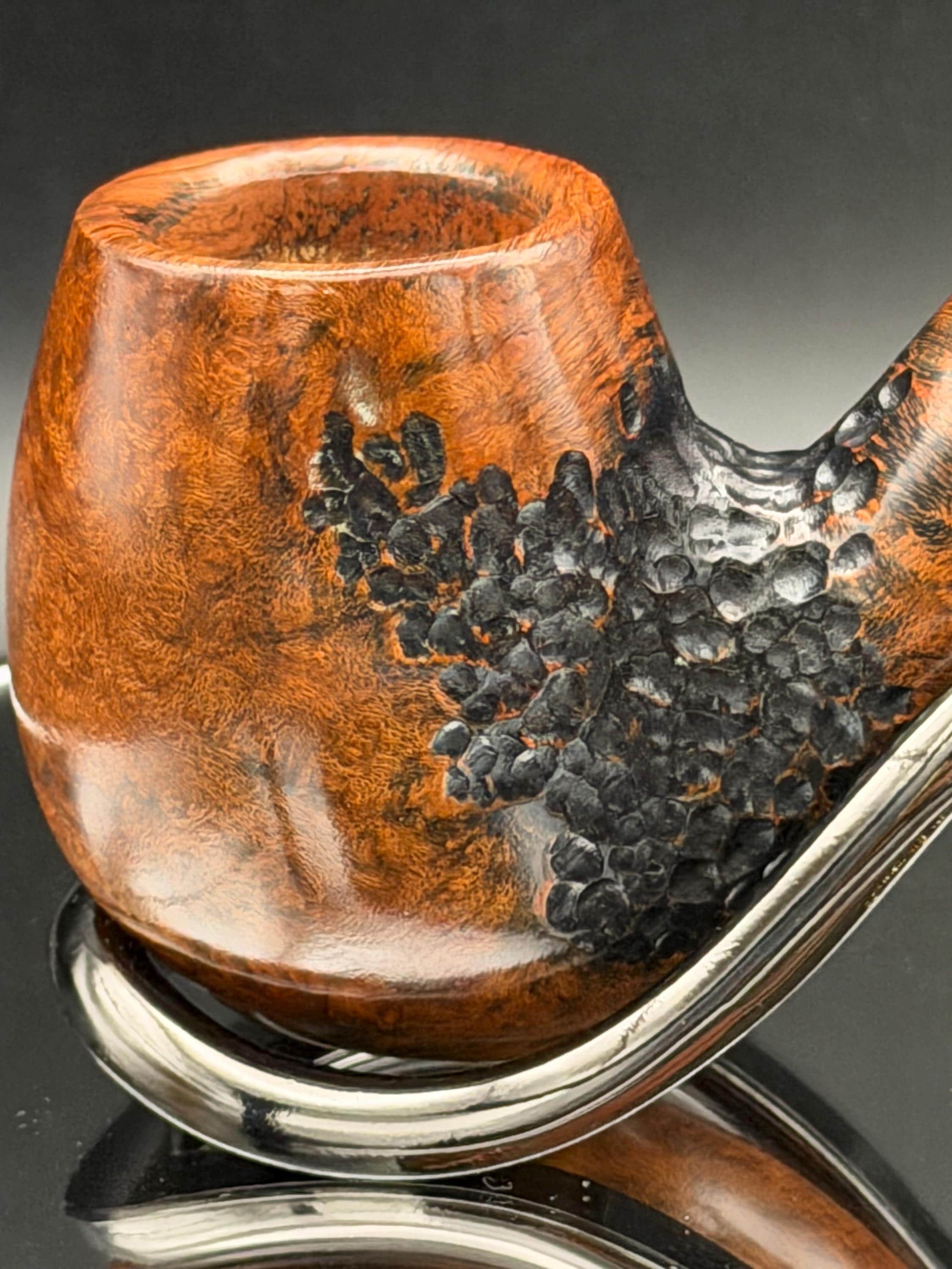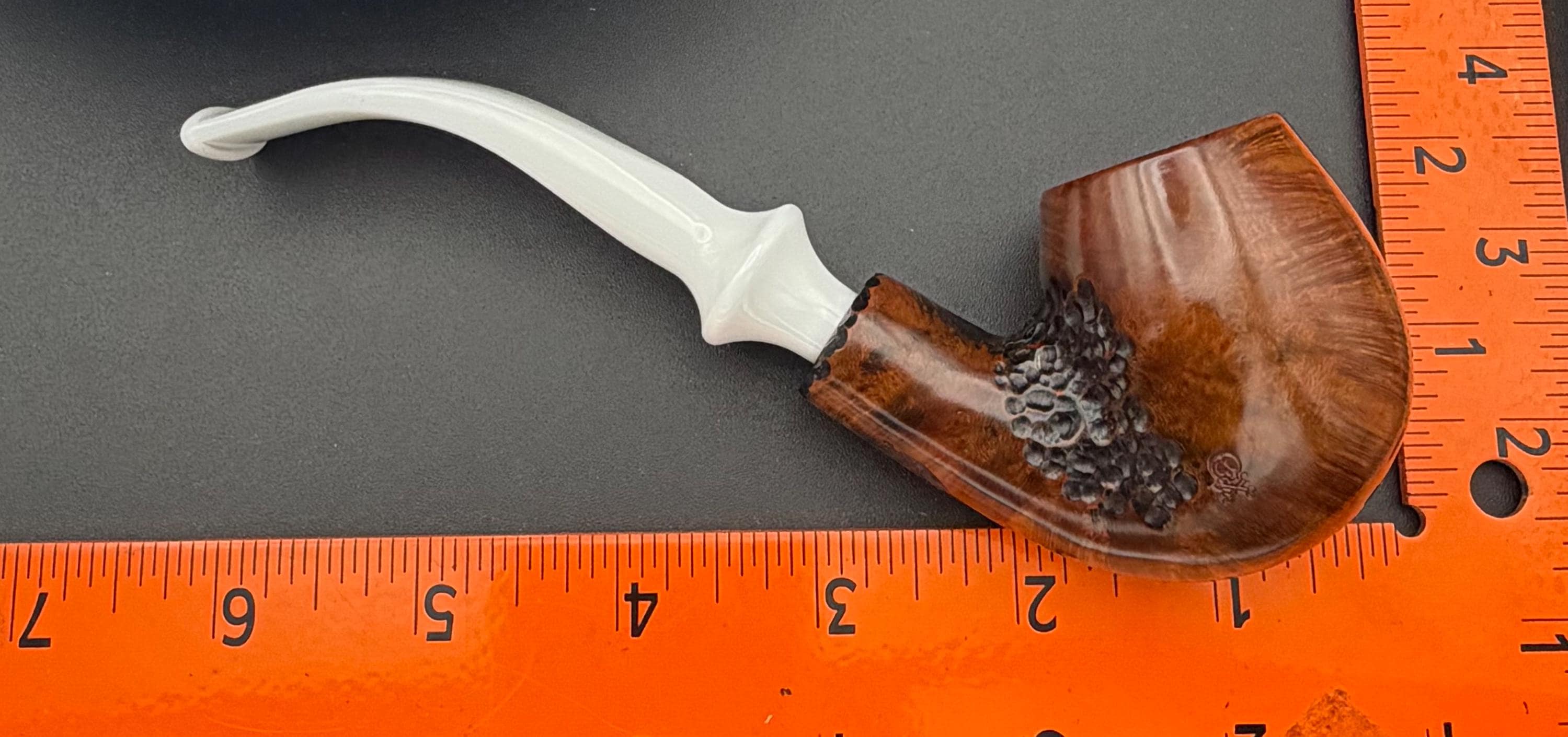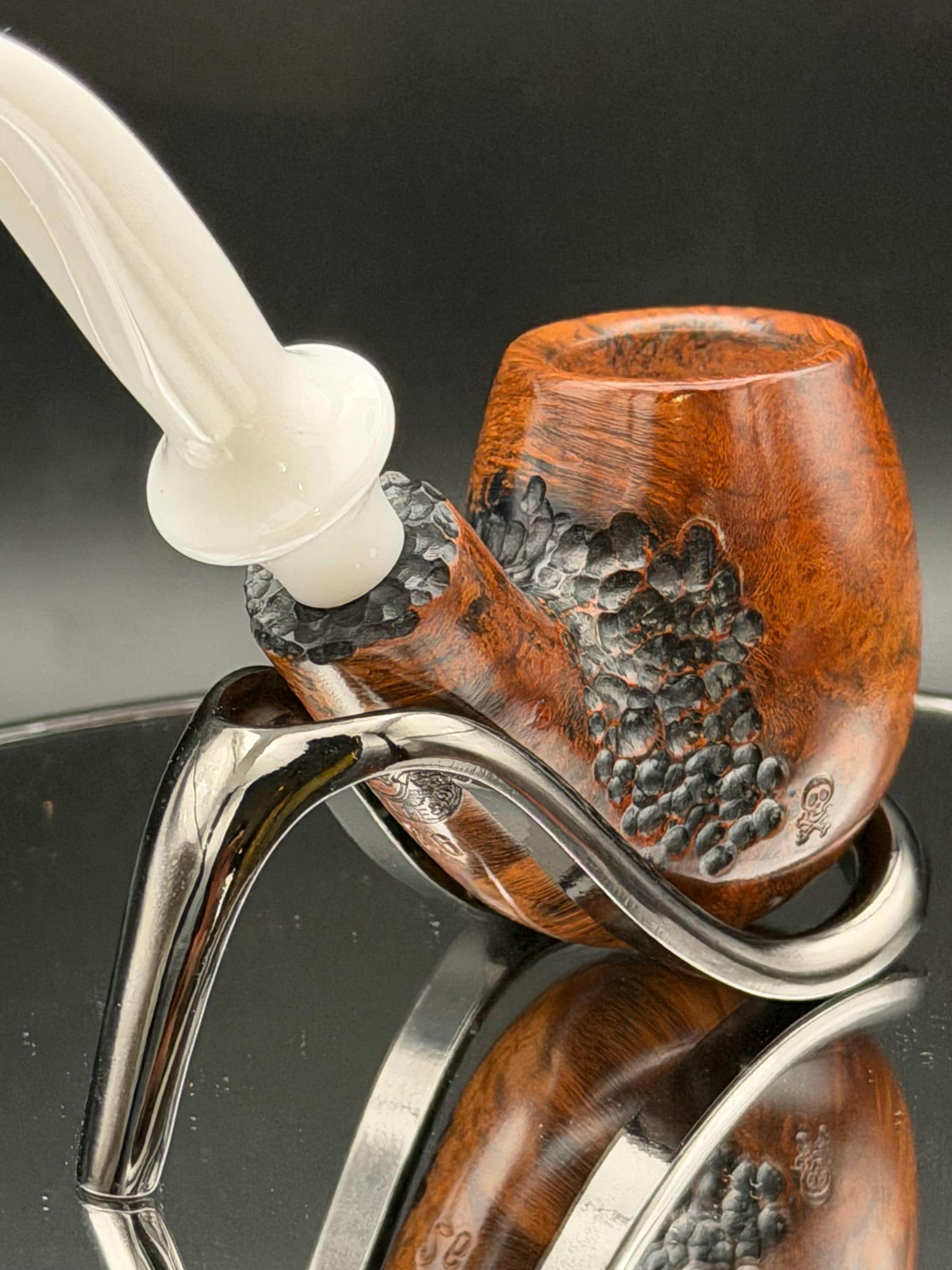 This is a handmade briar pipe that has been carved rusticated and sanded by hand . A beautiful acrylic custom made stem was made for it. Non filtered. A very nice daily smoker. Perfect size for your coat pocket! A nice sized bowl of 7/8x1.5” tapered was made into this one for a nice long smoke.