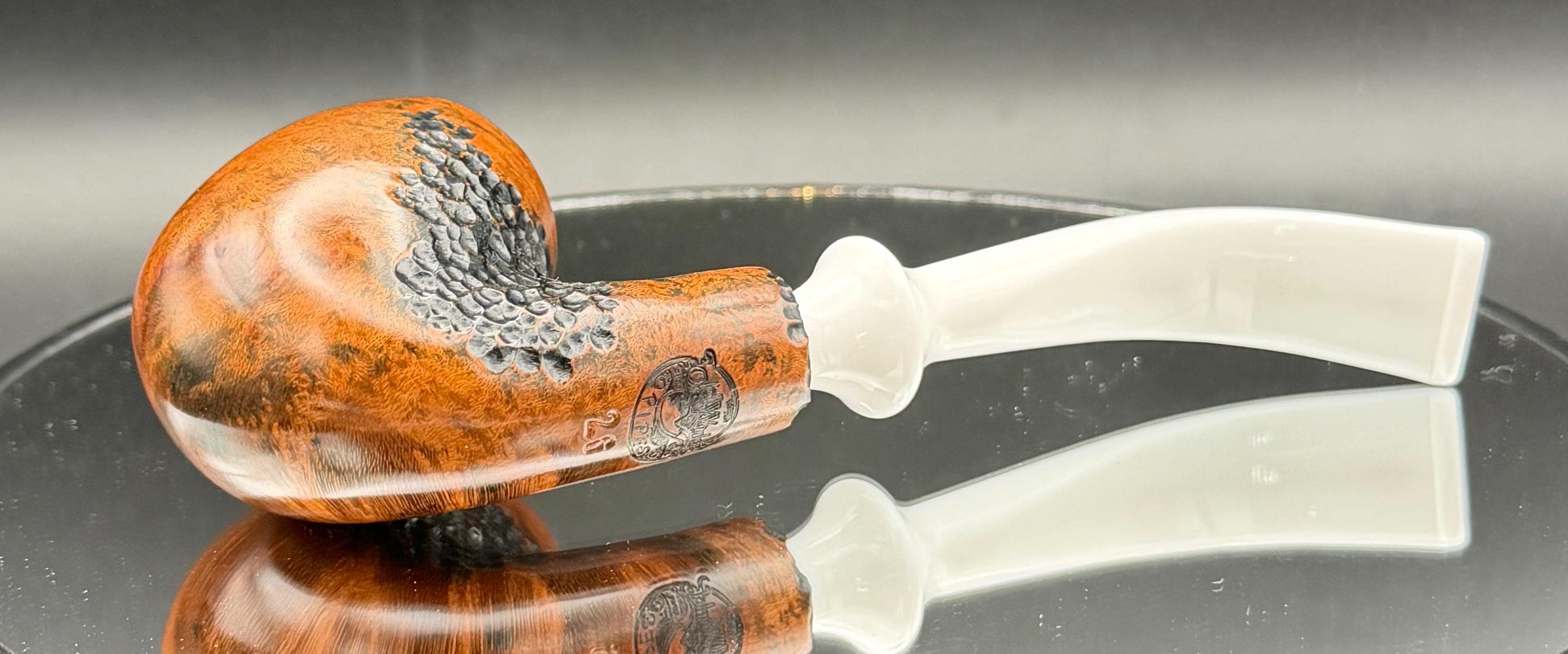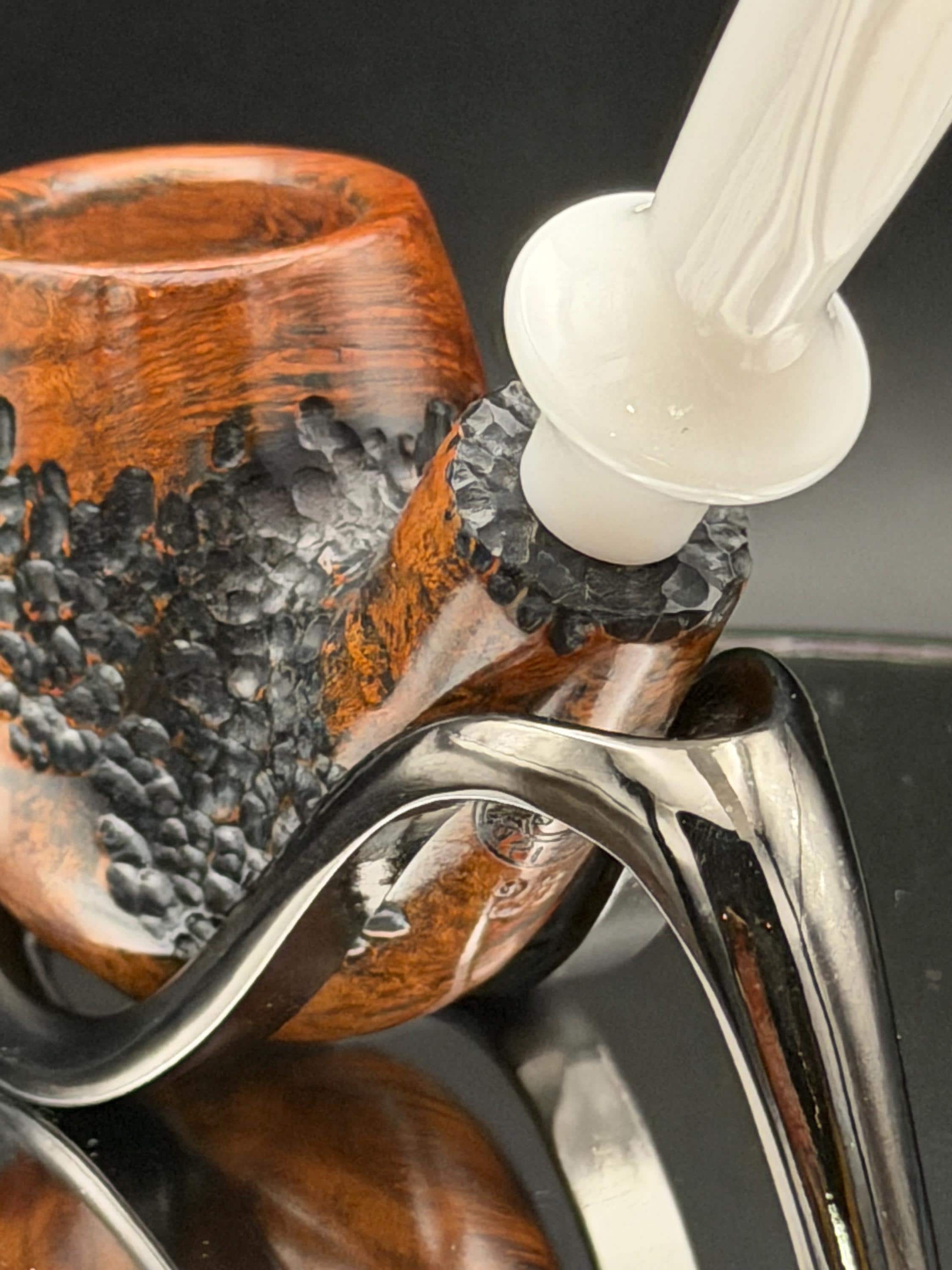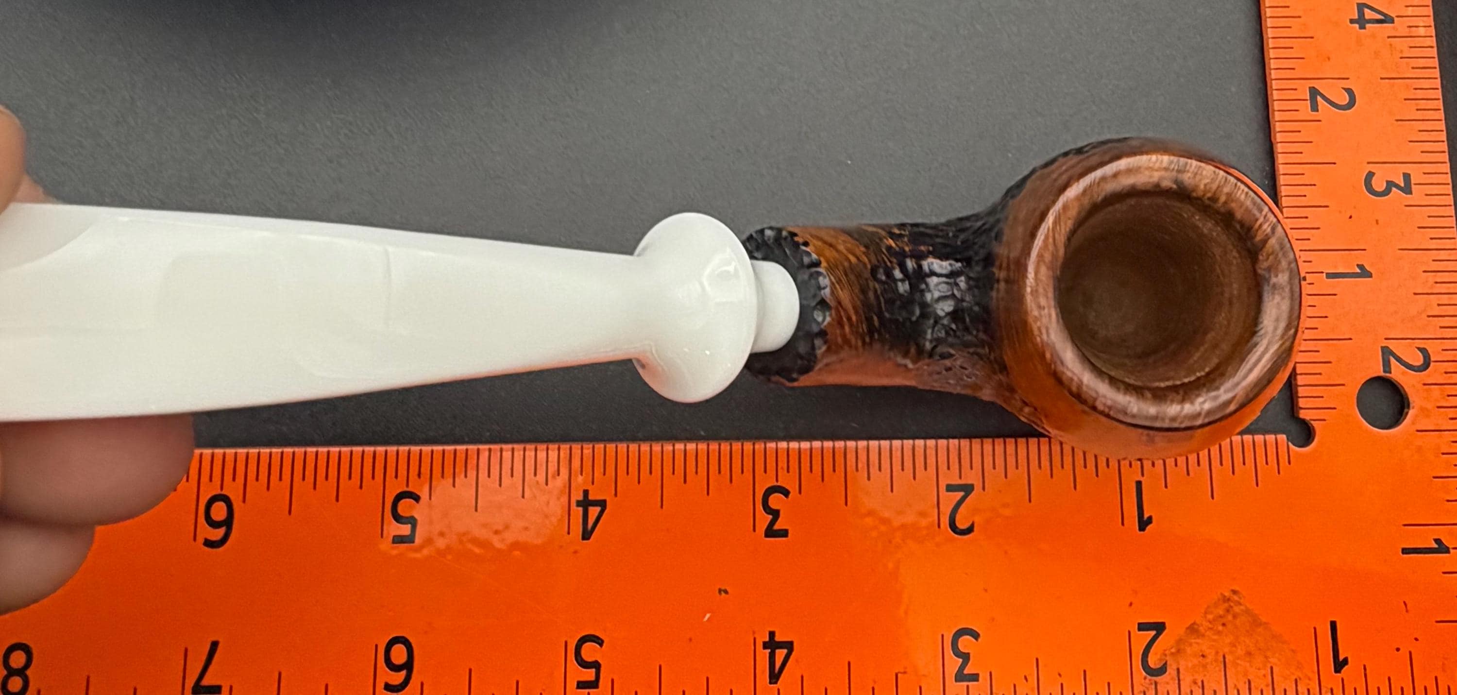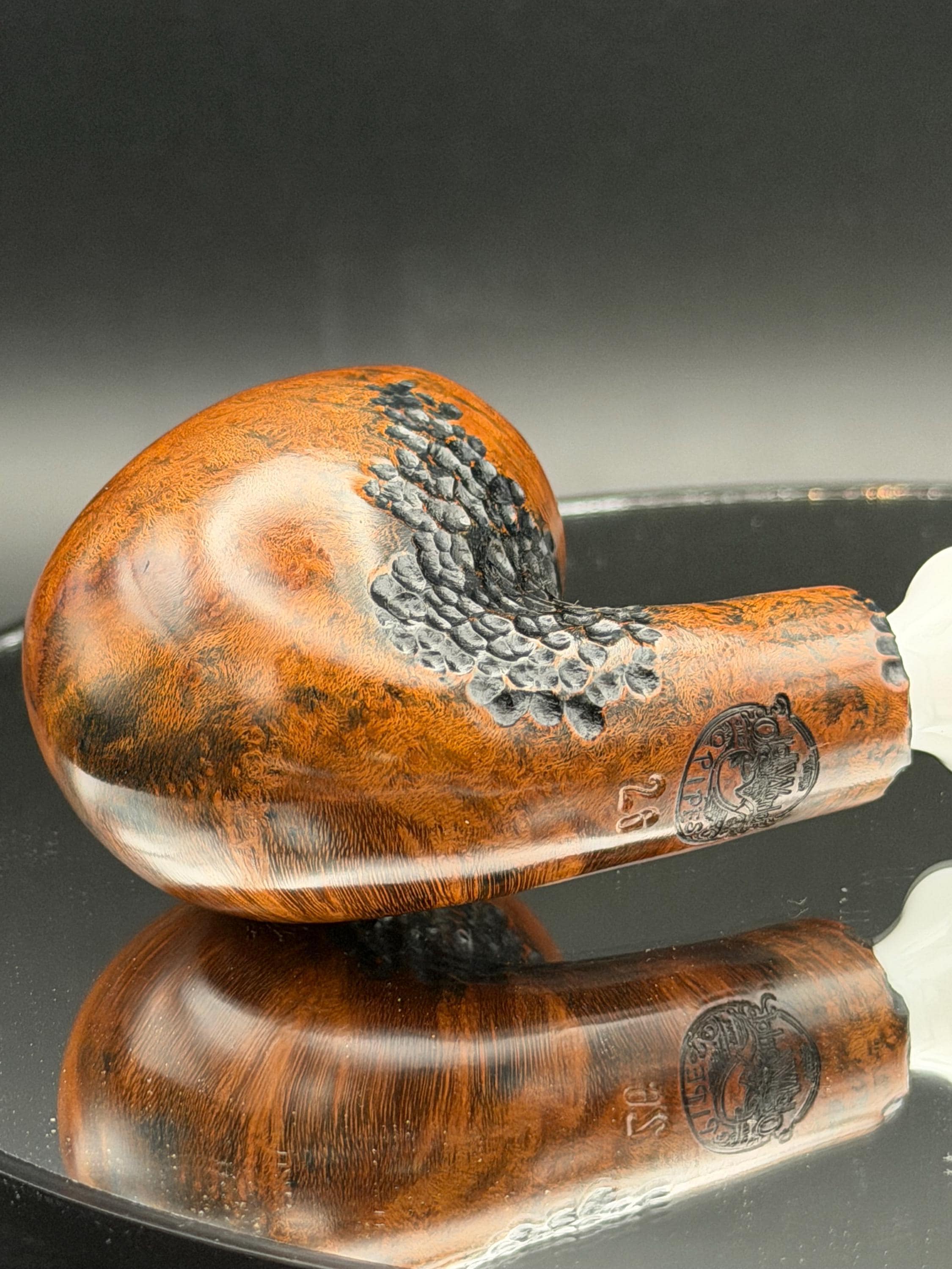This is a handmade briar pipe that has been carved rusticated and sanded by hand . A beautiful acrylic custom made stem was made for it. Non filtered. A very nice daily smoker. Perfect size for your coat pocket! A nice sized bowl of 7/8x1.5” tapered was made into this one for a nice long smoke.
