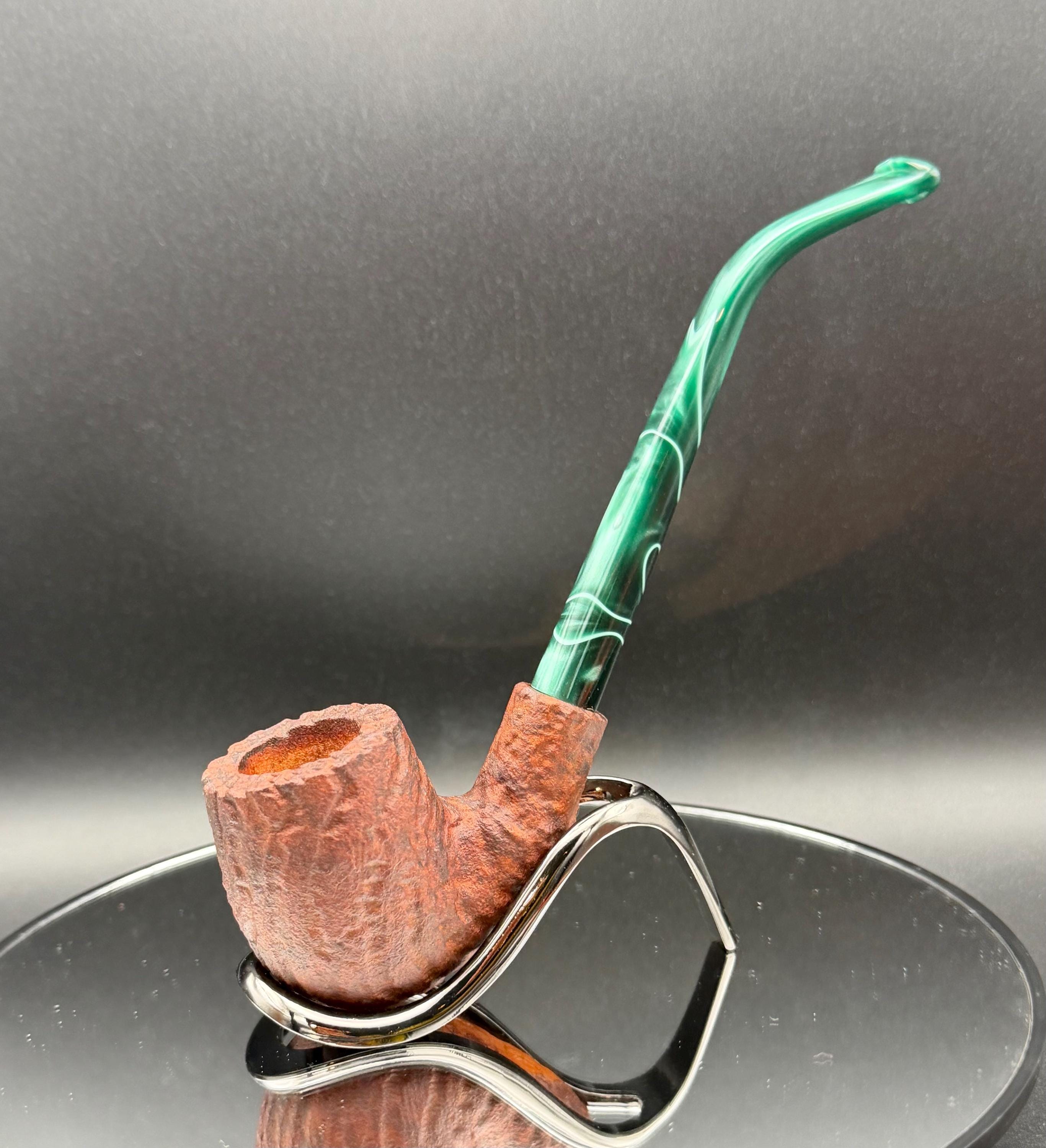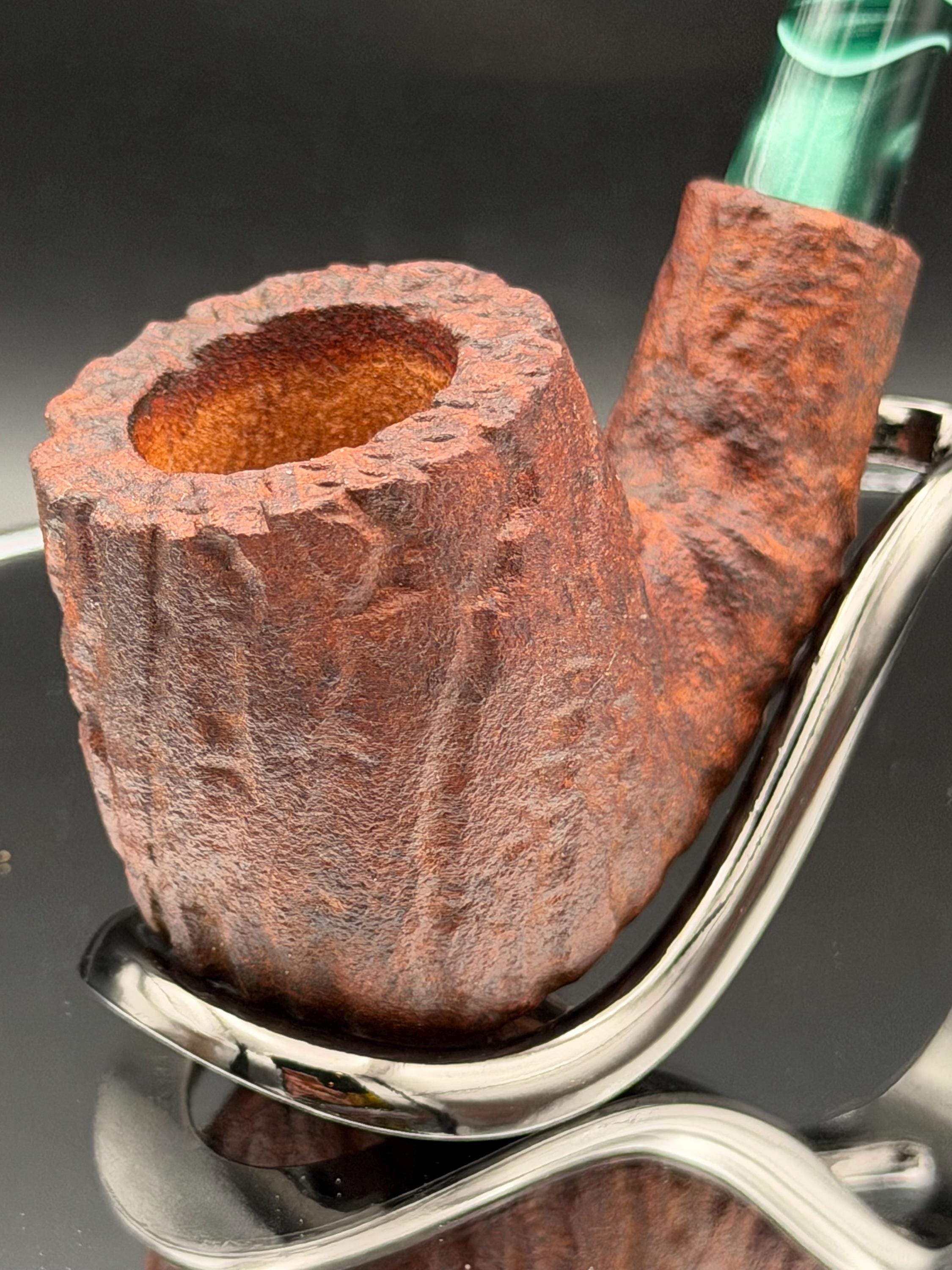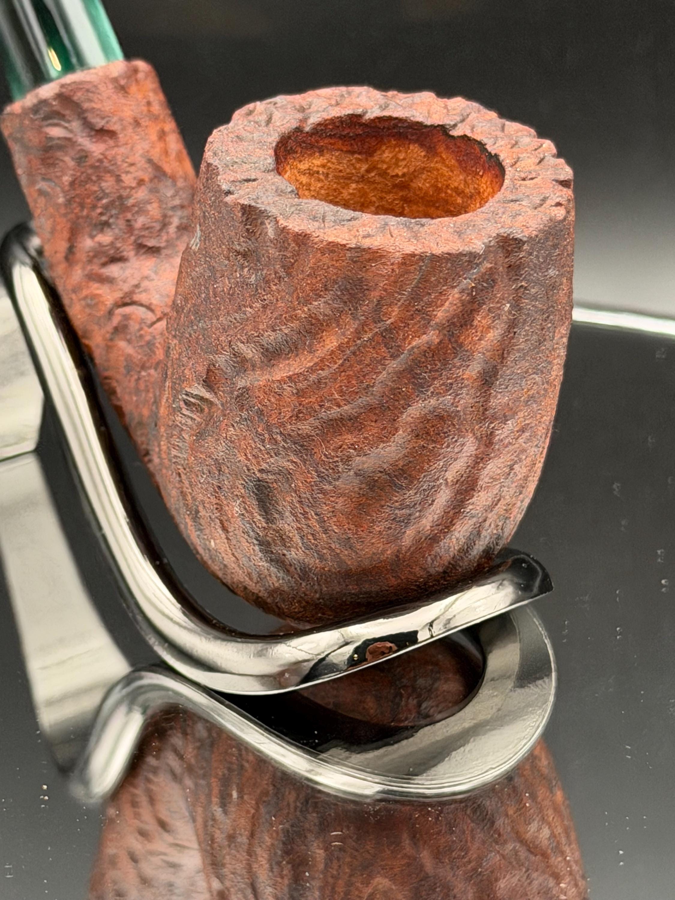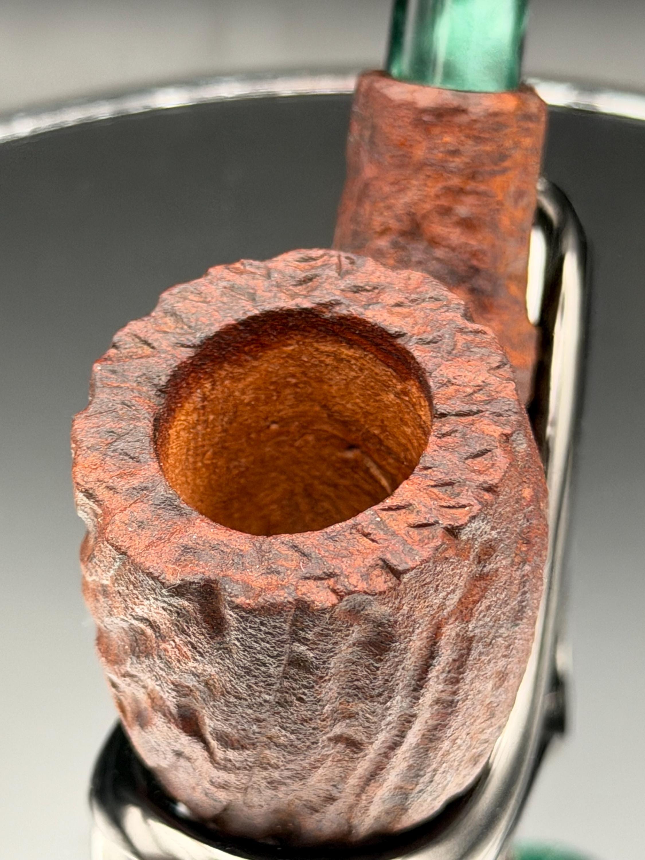 This is a handmade briar pipe that has been carved rusticated sanded and polished by hand. It has a nice Acrylic custom made stem machined to fit perfectly. This one is non filtered. A very nice daily smoker. Made to look rustic but a little polished. 7/8x1.5 chamber