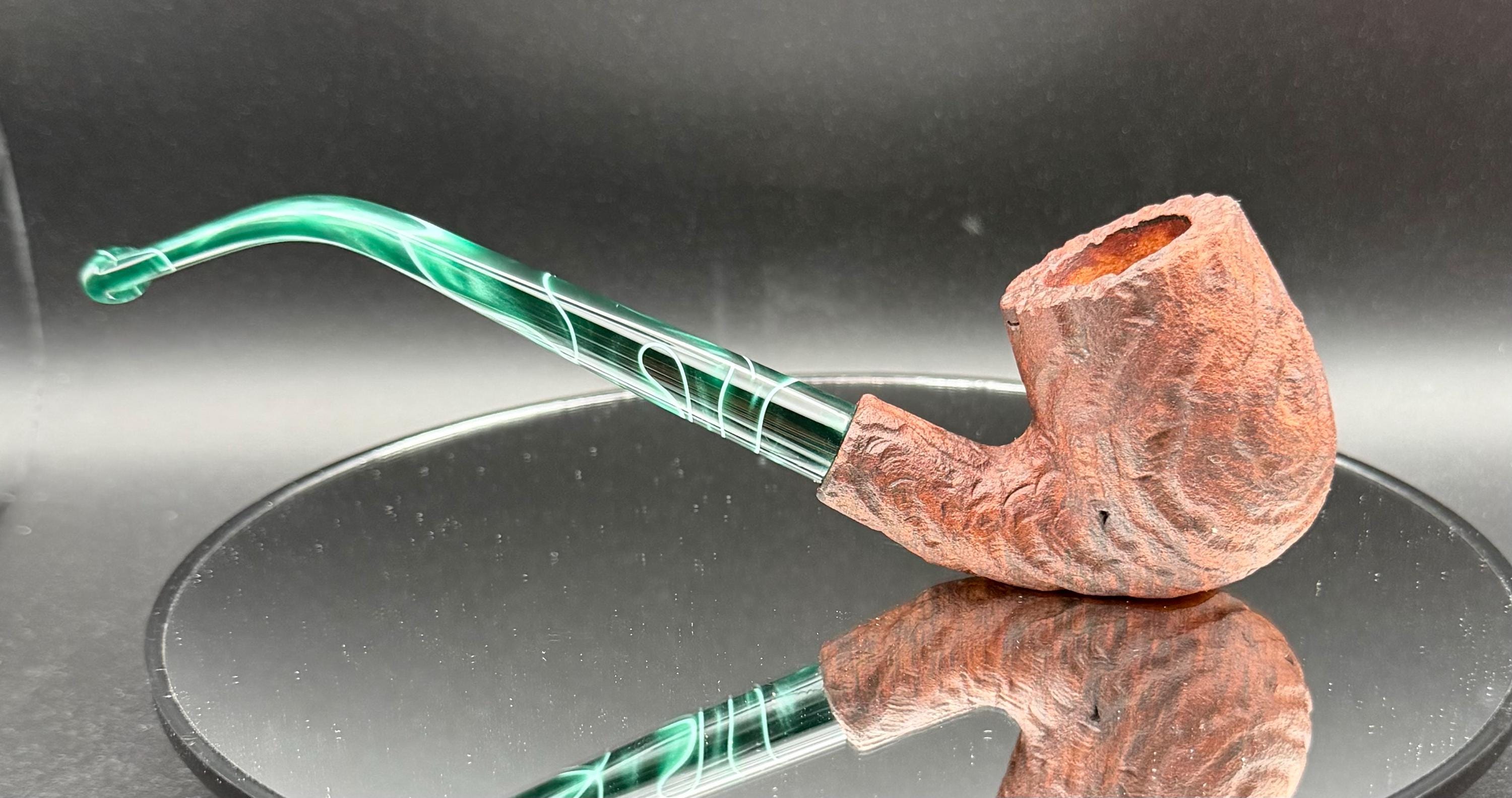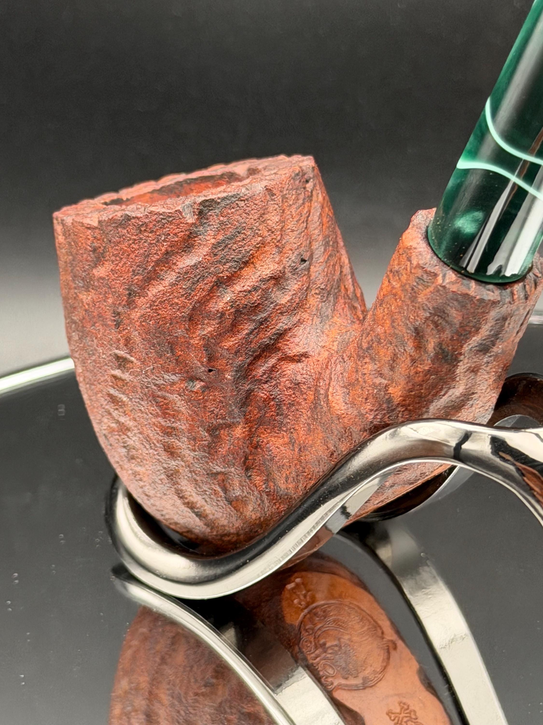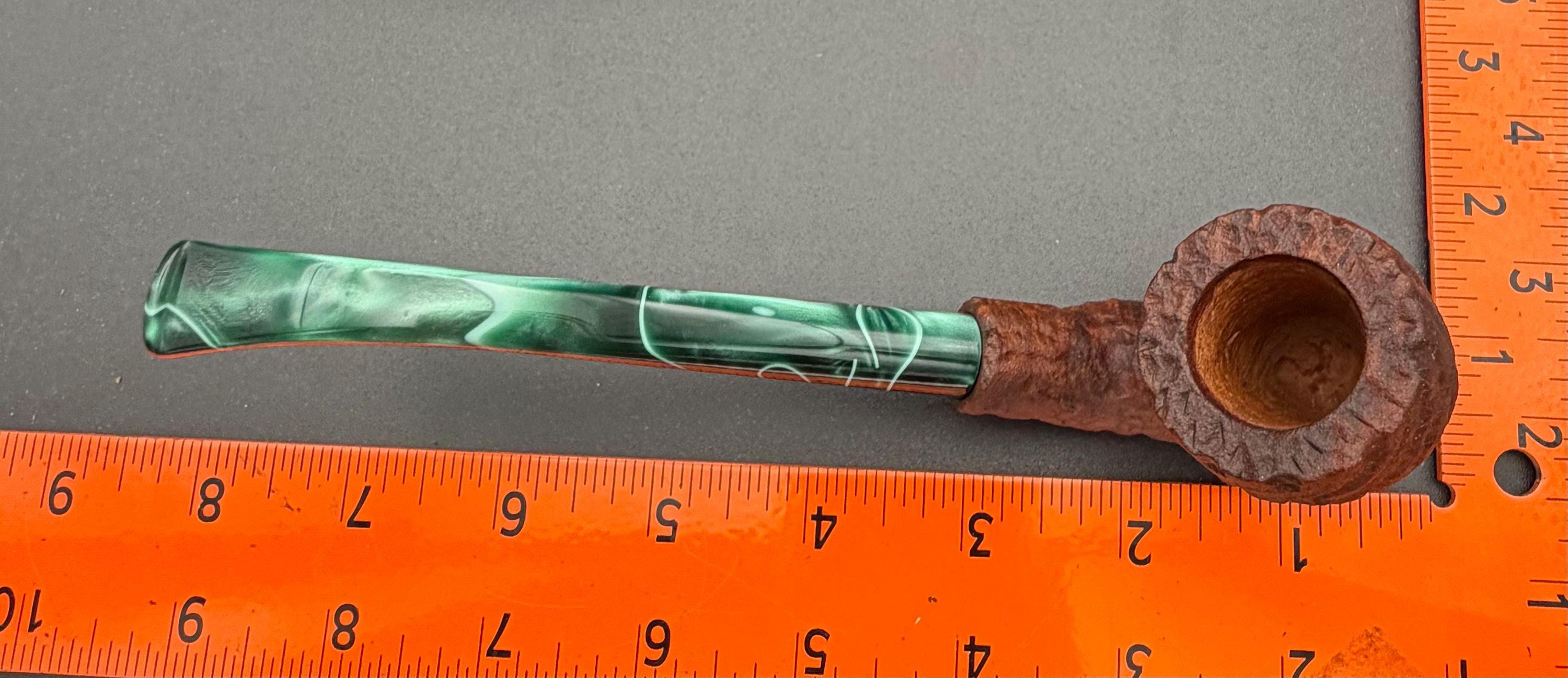 This is a handmade briar pipe that has been carved rusticated sanded and polished by hand. It has a nice Acrylic custom made stem machined to fit perfectly. This one is non filtered. A very nice daily smoker. Made to look rustic but a little polished. 7/8x1.5 chamber
