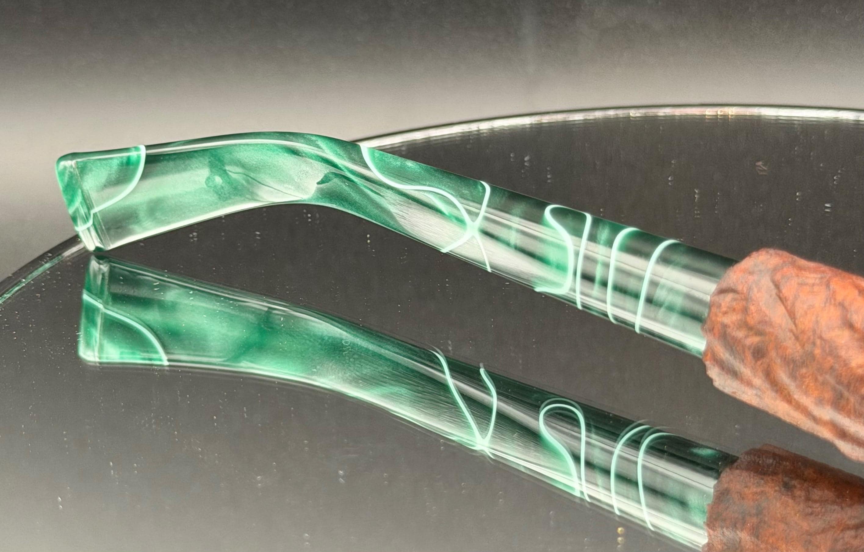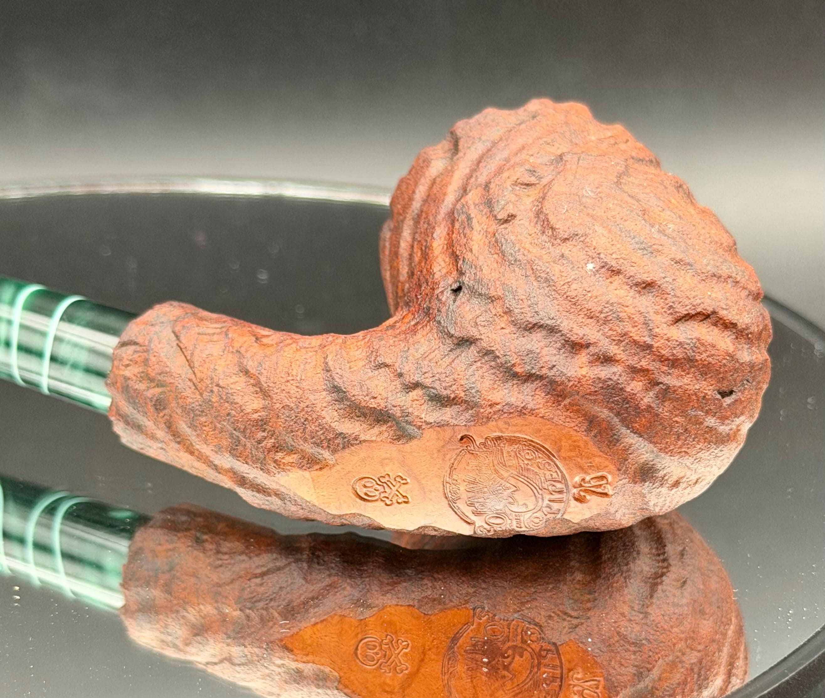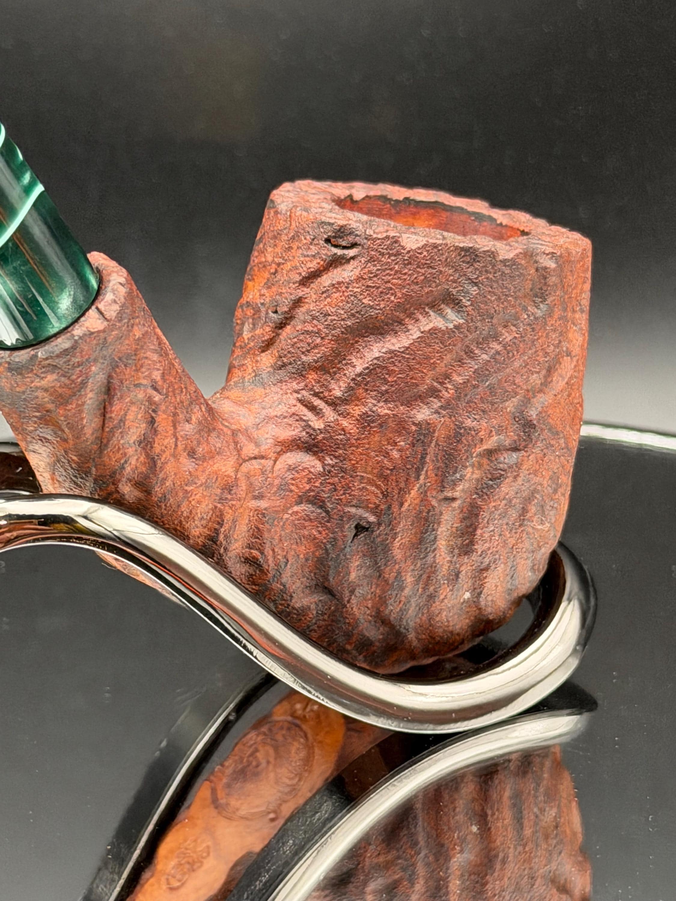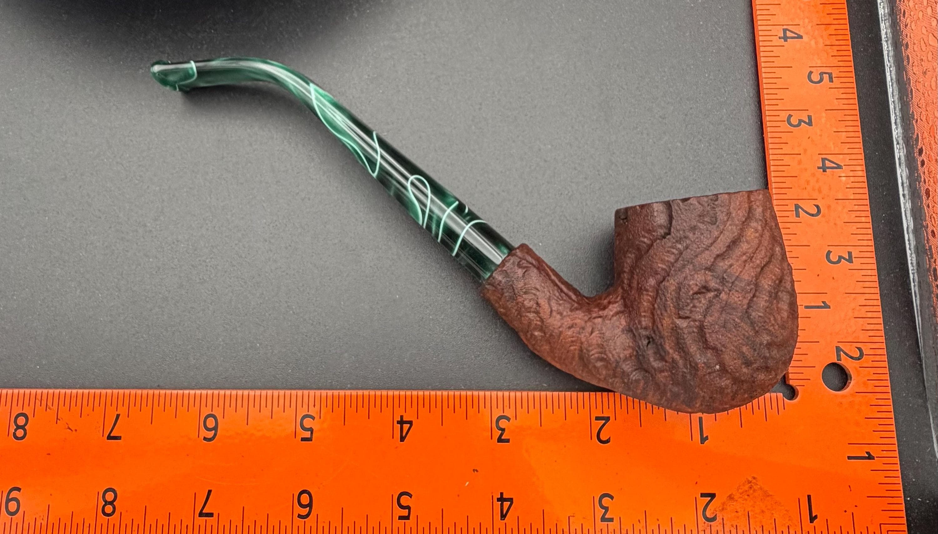 This is a handmade briar pipe that has been carved rusticated sanded and polished by hand. It has a nice Acrylic custom made stem machined to fit perfectly. This one is non filtered. A very nice daily smoker. Made to look rustic but a little polished. 7/8x1.5 chamber