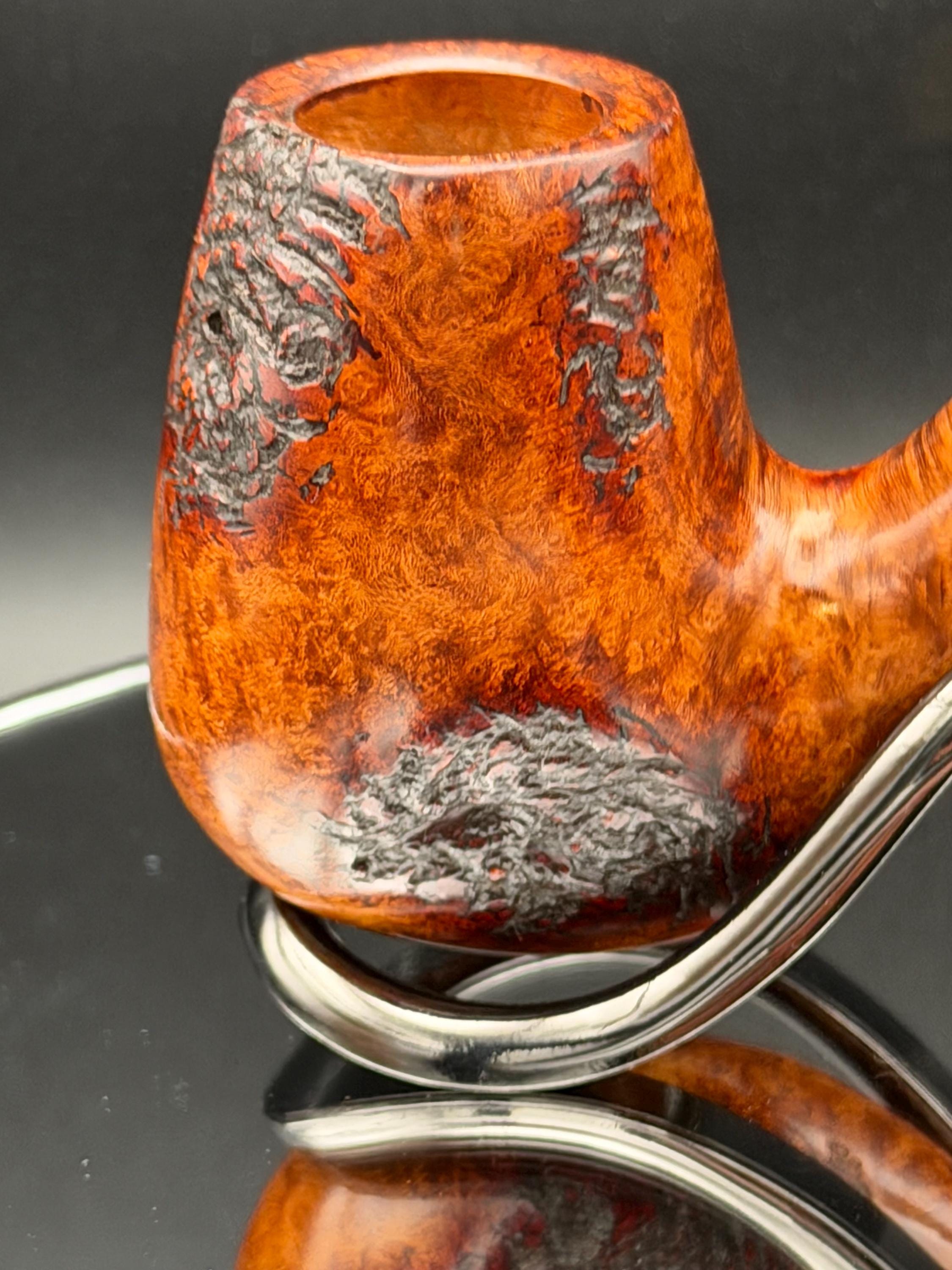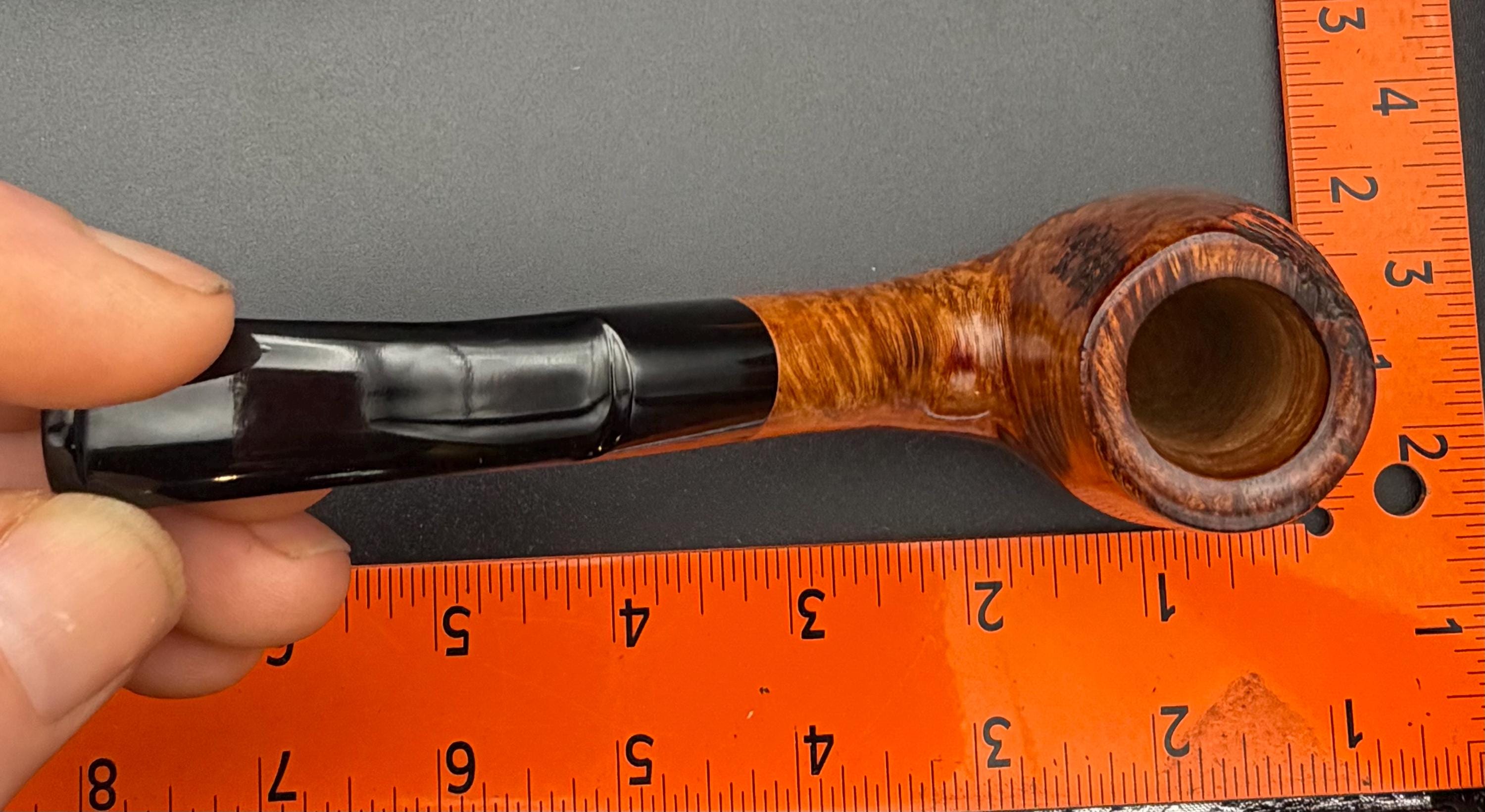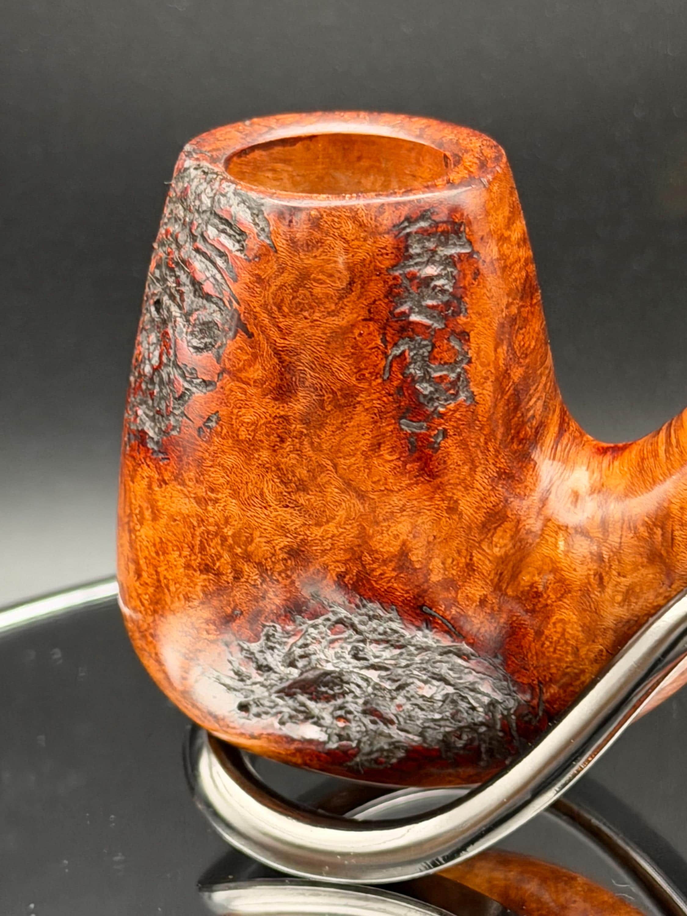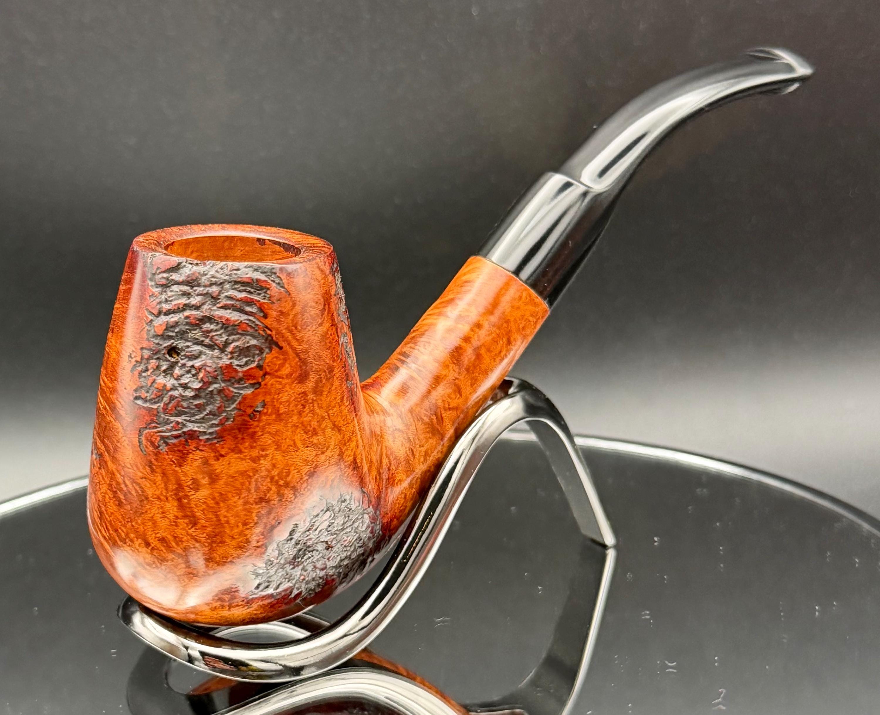 This is a handmade briar pipe that has been carved rusticated sanded and polished by hand. It has a nice Vulcanite custom made stem machined to fit perfectly. This one is non filtered. A very nice daily smoker. Made to look rustic but a little polished. 7/8x1.5 chamber
