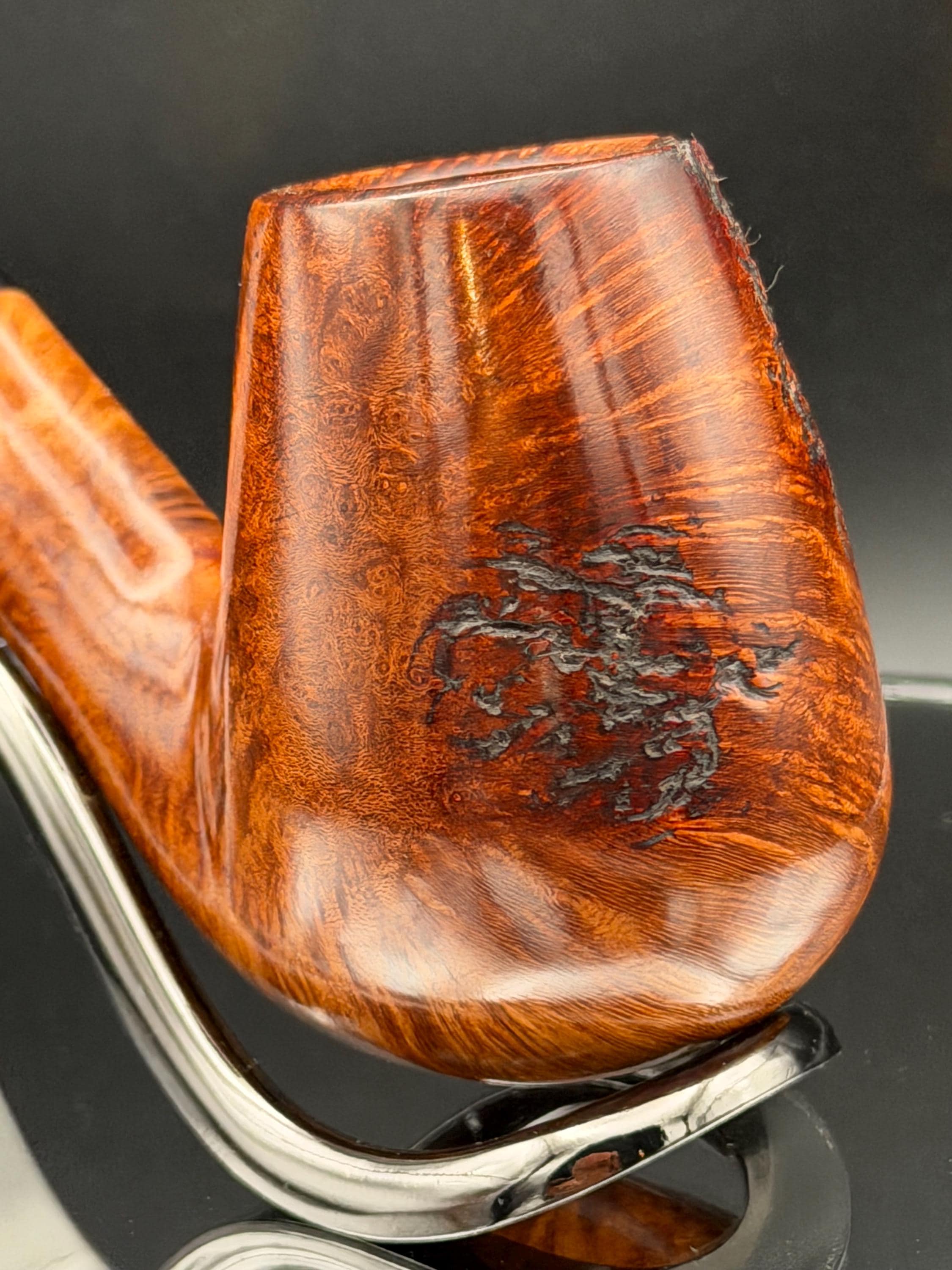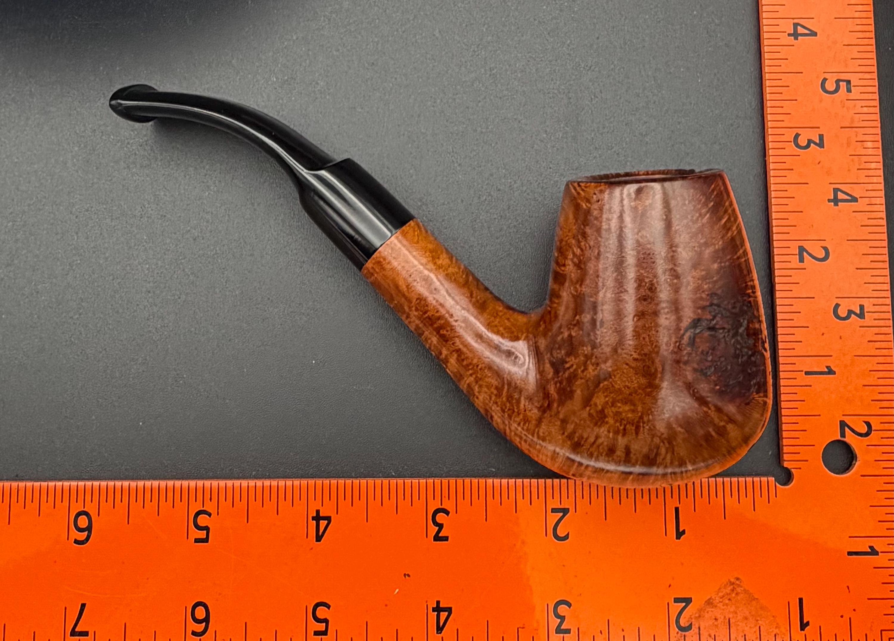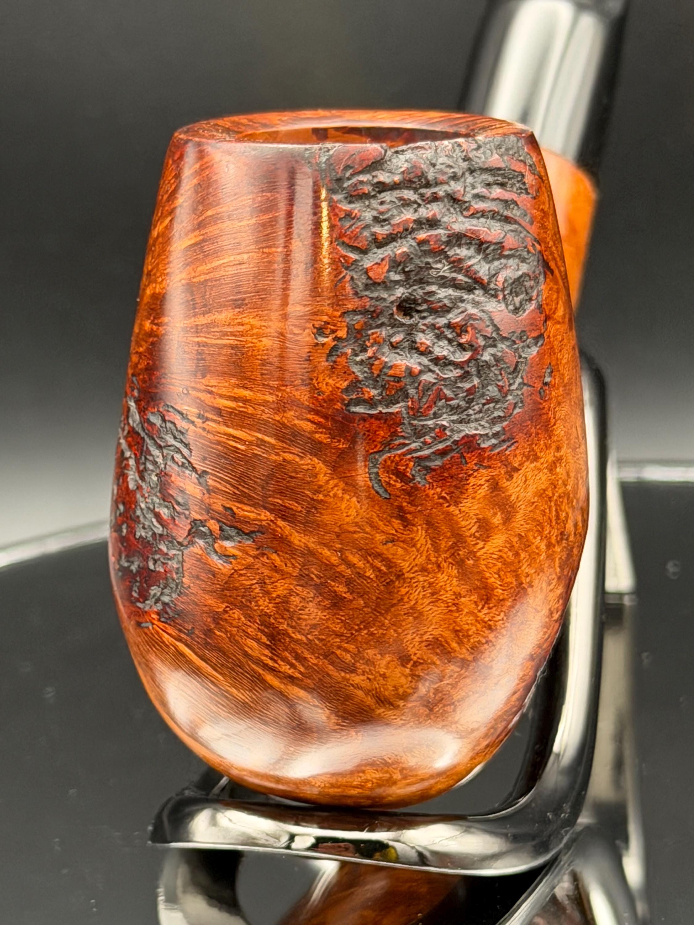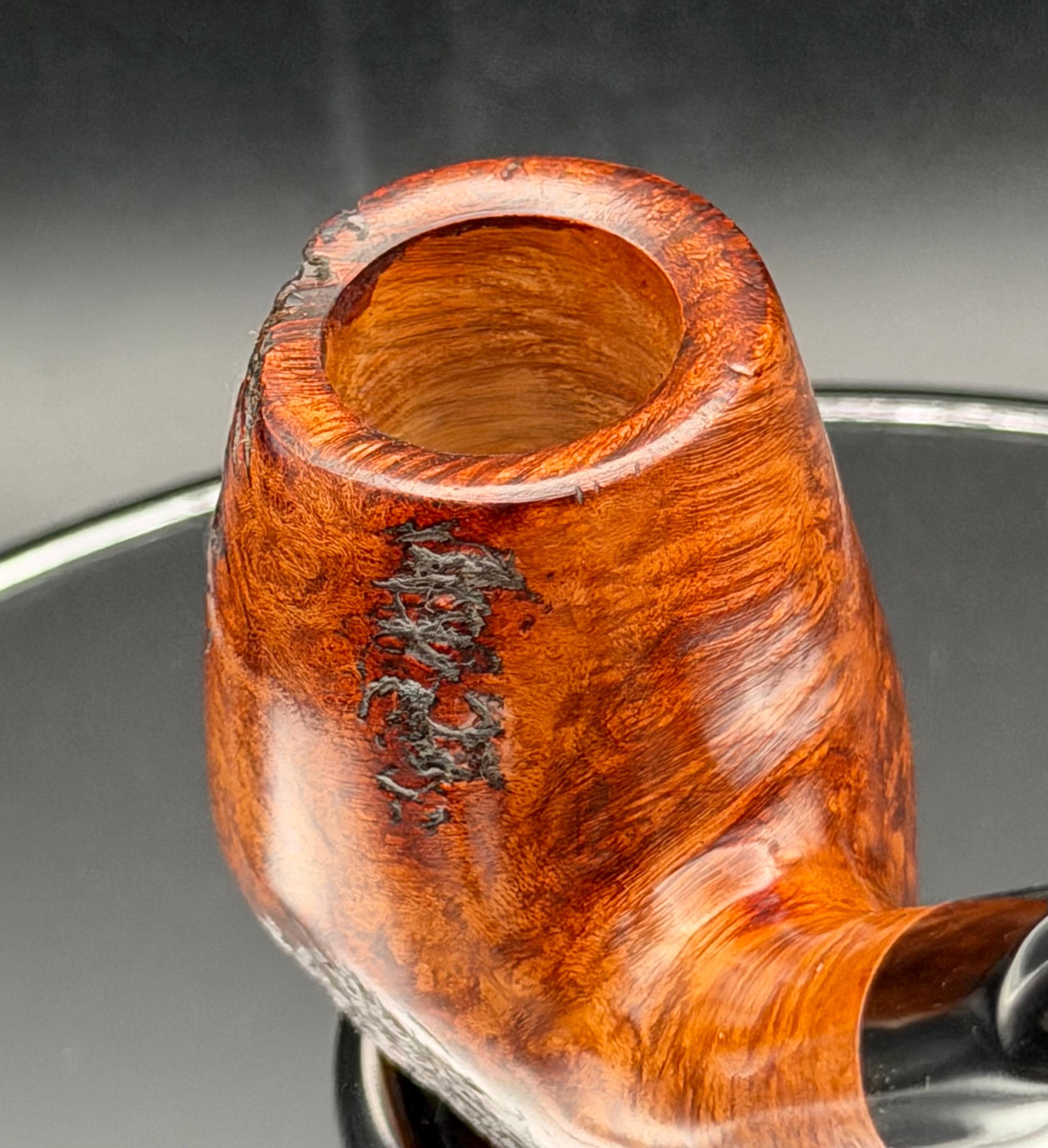This is a handmade briar pipe that has been carved rusticated sanded and polished by hand. It has a nice Vulcanite custom made stem machined to fit perfectly. This one is non filtered. A very nice daily smoker. Made to look rustic but a little polished. 7/8x1.5 chamber