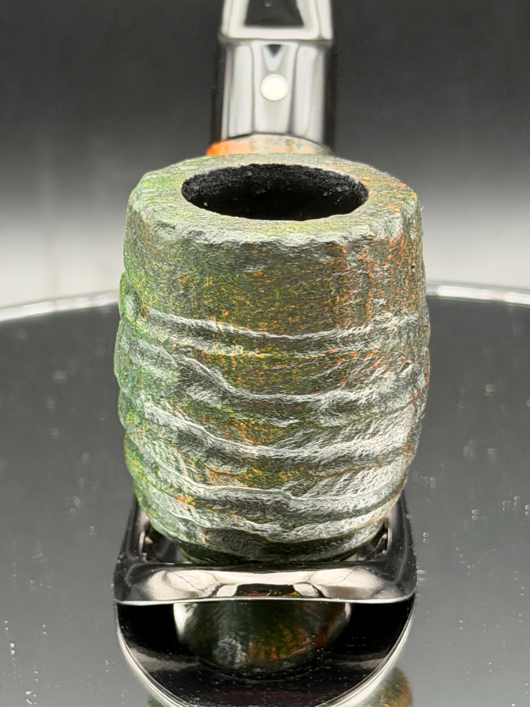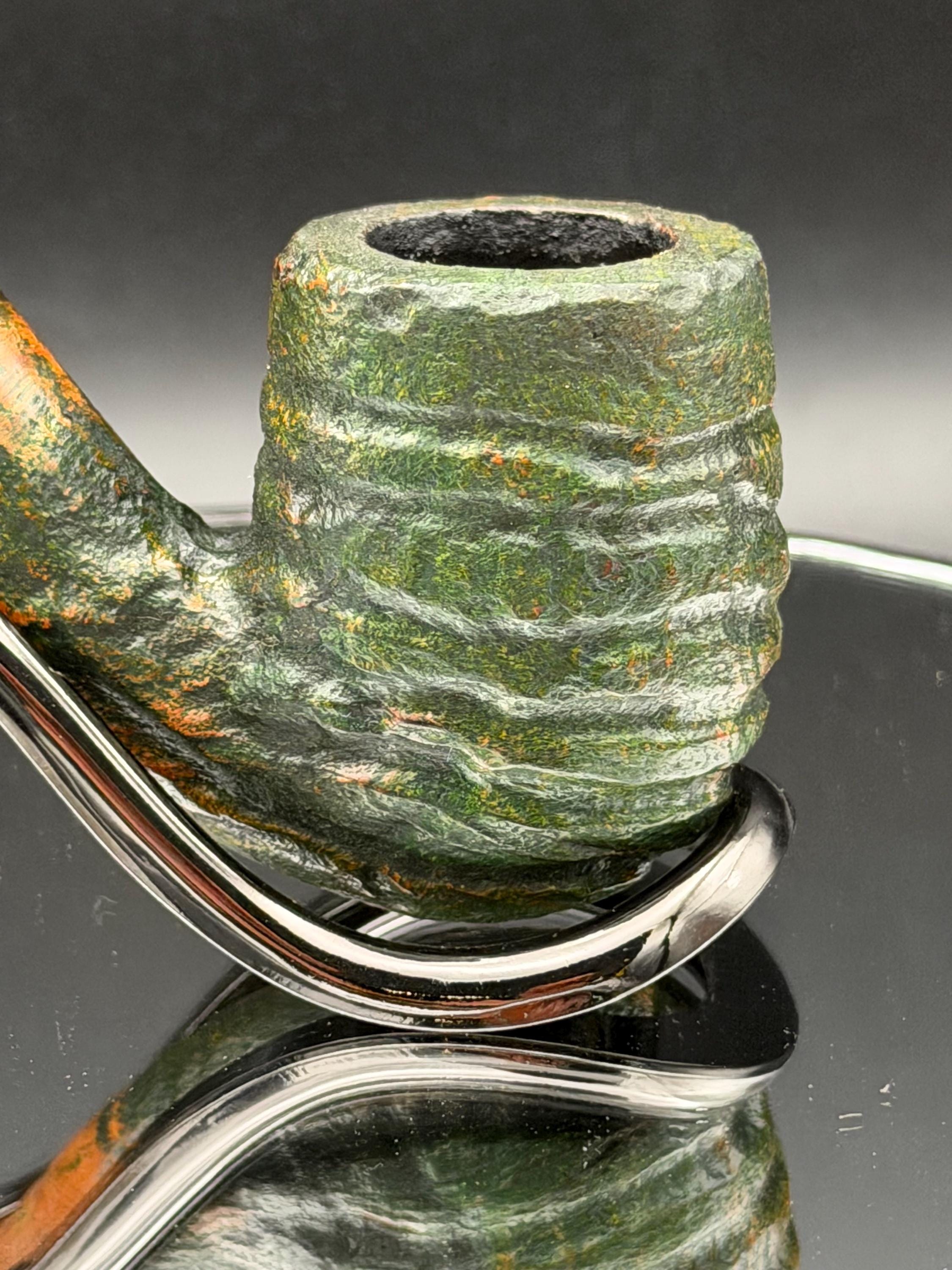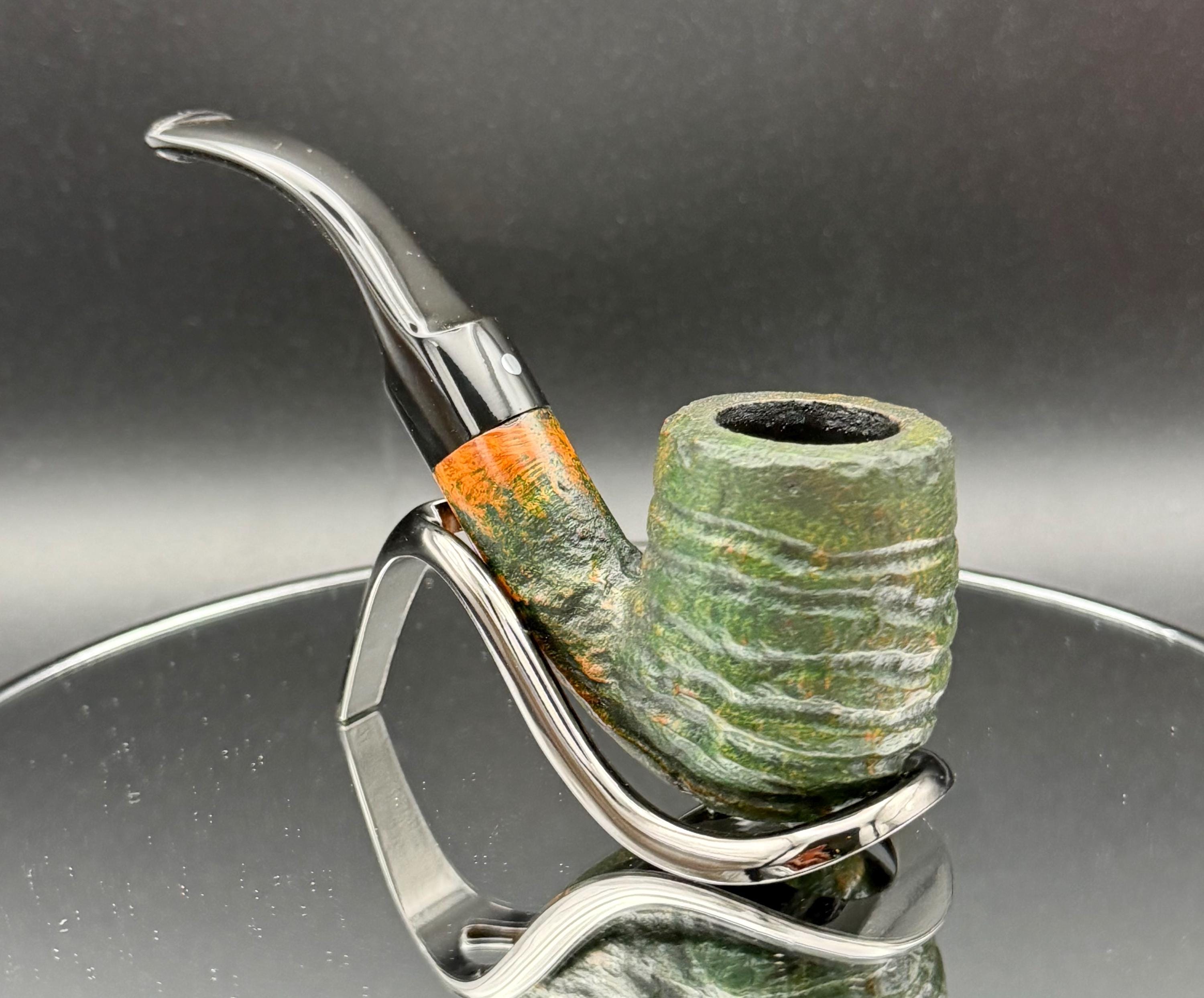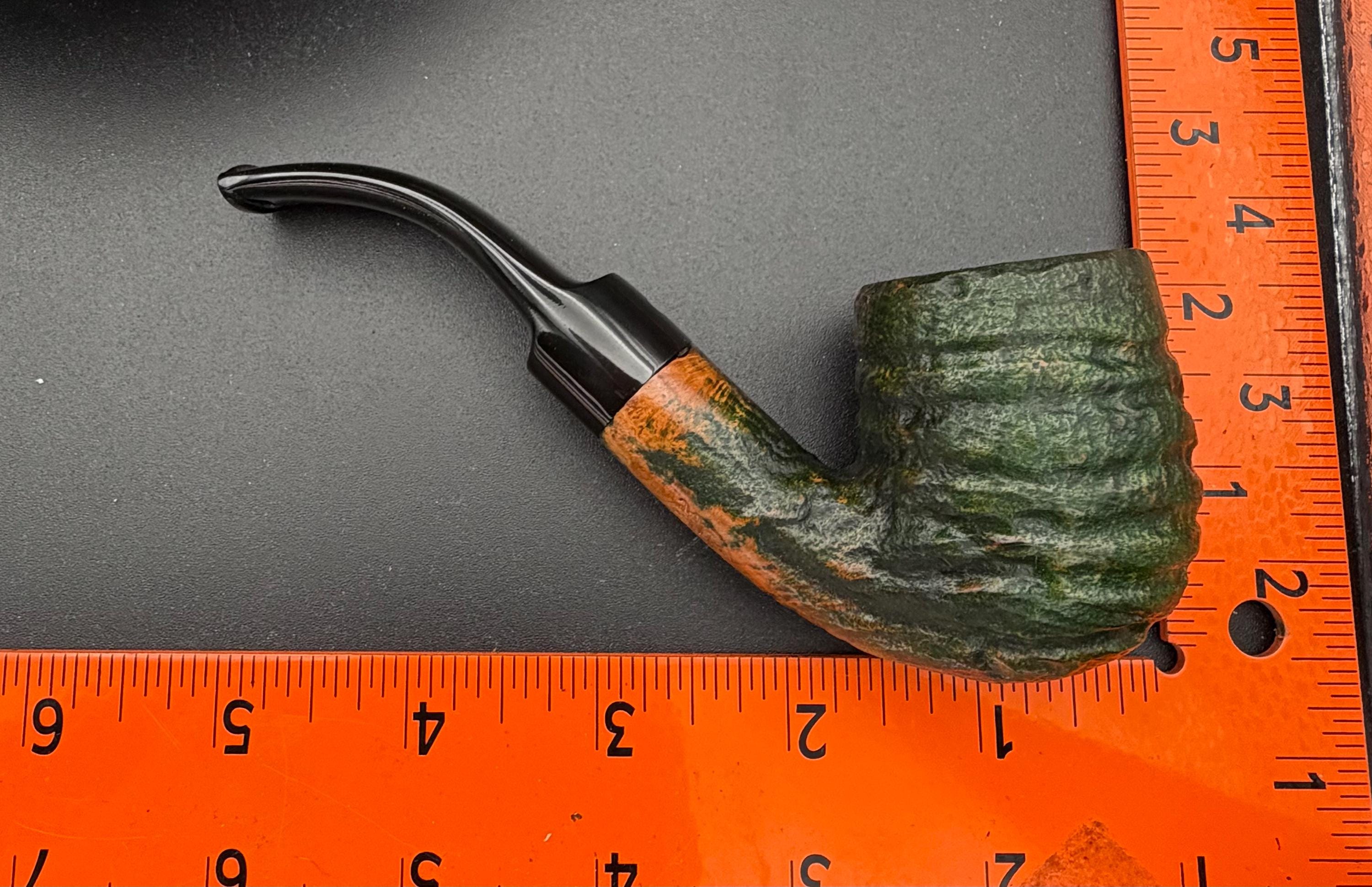 This is a handmade briar pipe that has been carved, rusticated, sandblasted, sanded,oiled, and polished by hand. It has a nice hand formed custom made vulcanite stem machined to fit perfectly. This one is non filtered. A very nice daily smoker. Made to look rustic but a little polished. 7/8x1.5 chamber and has a carbon coating for a starter