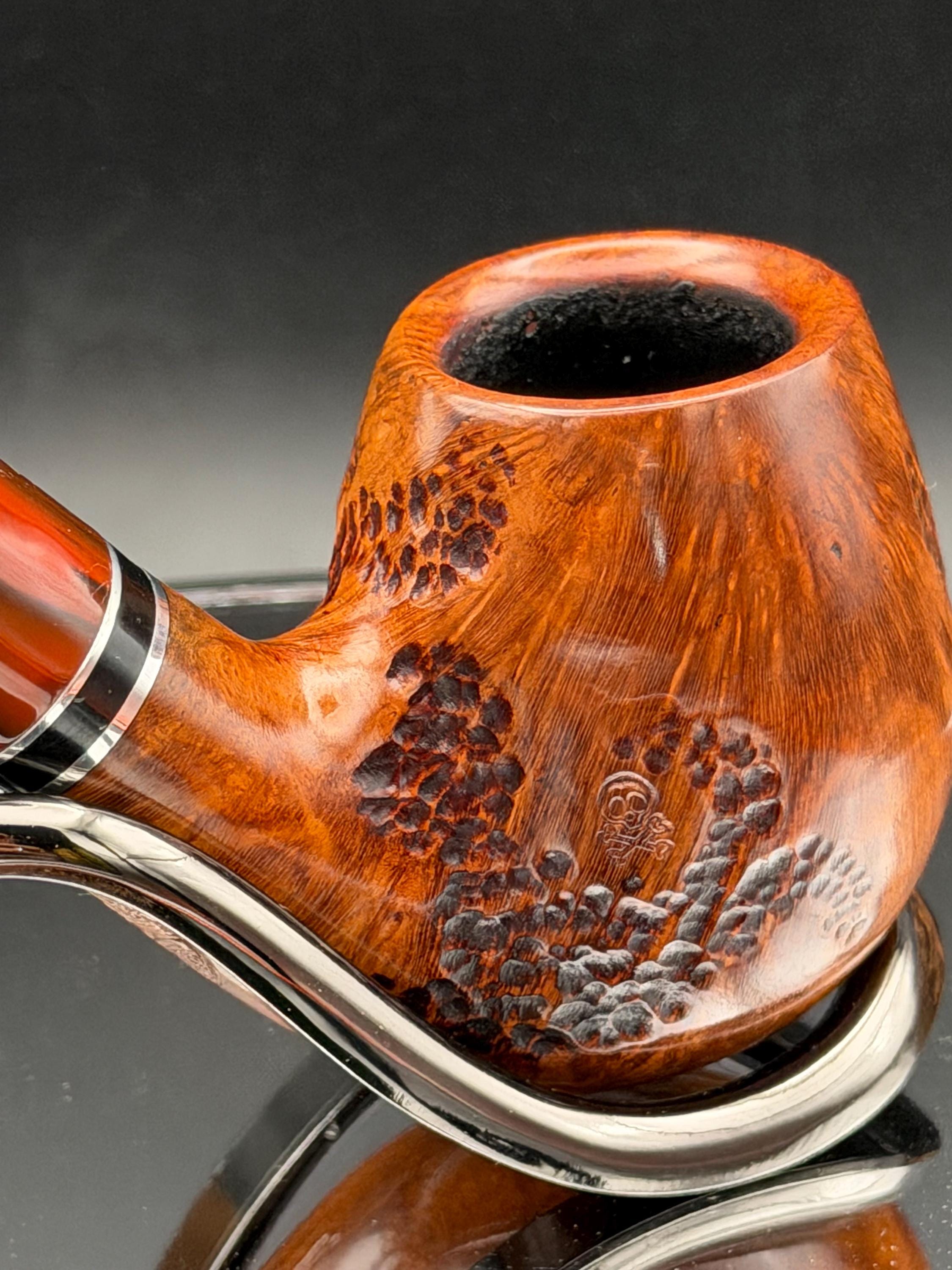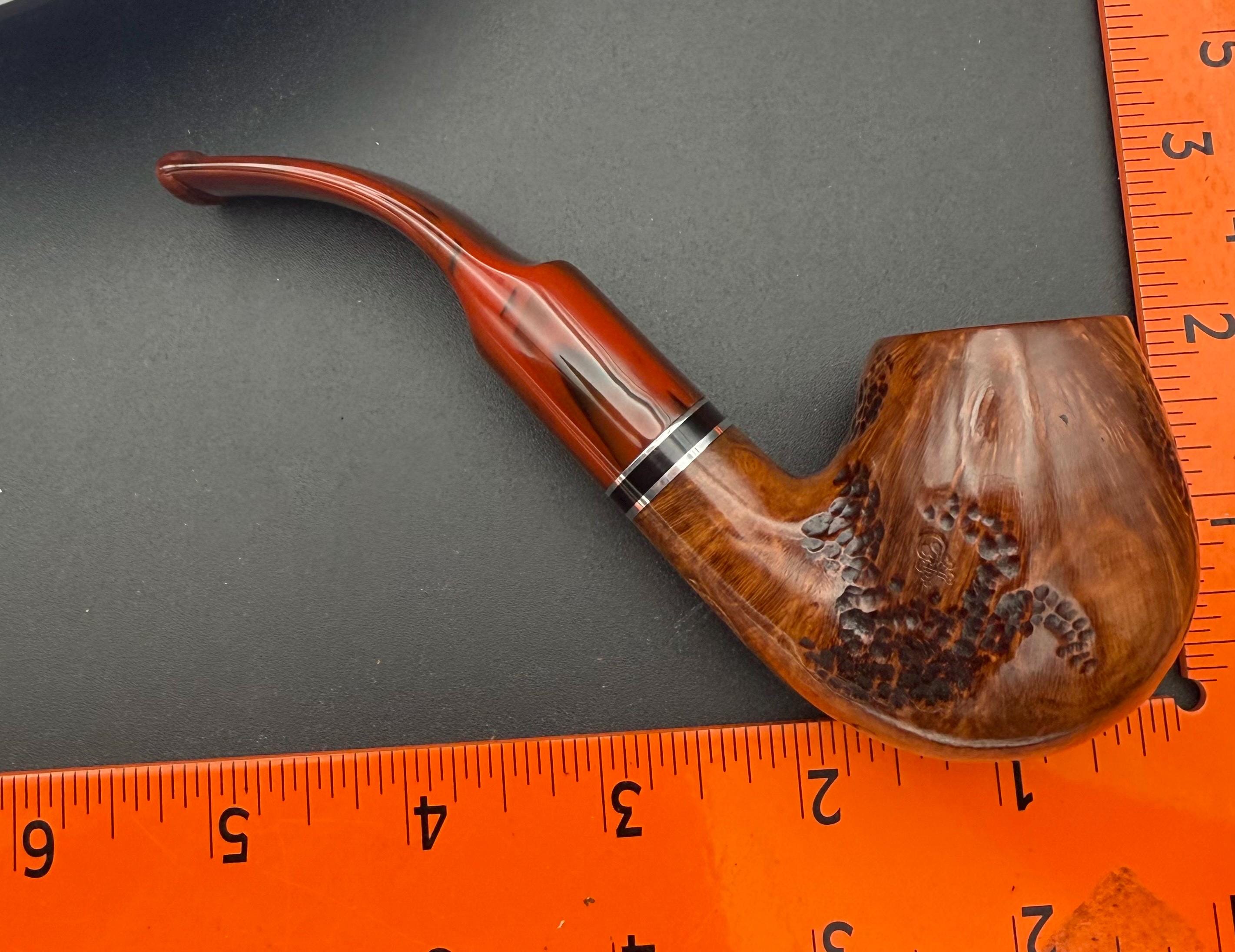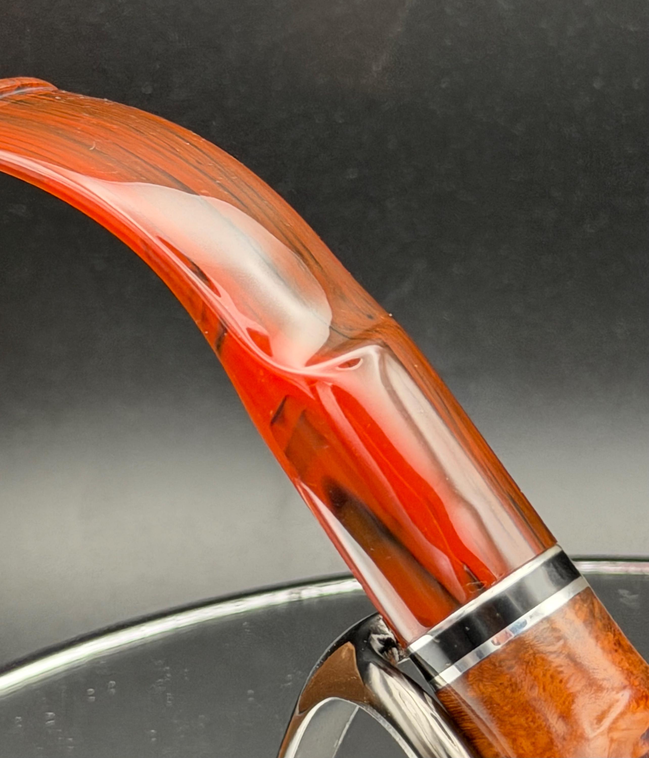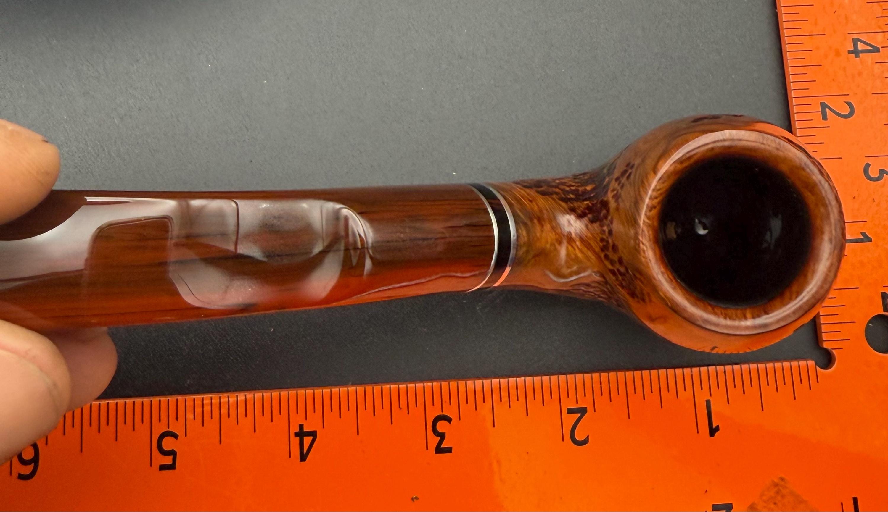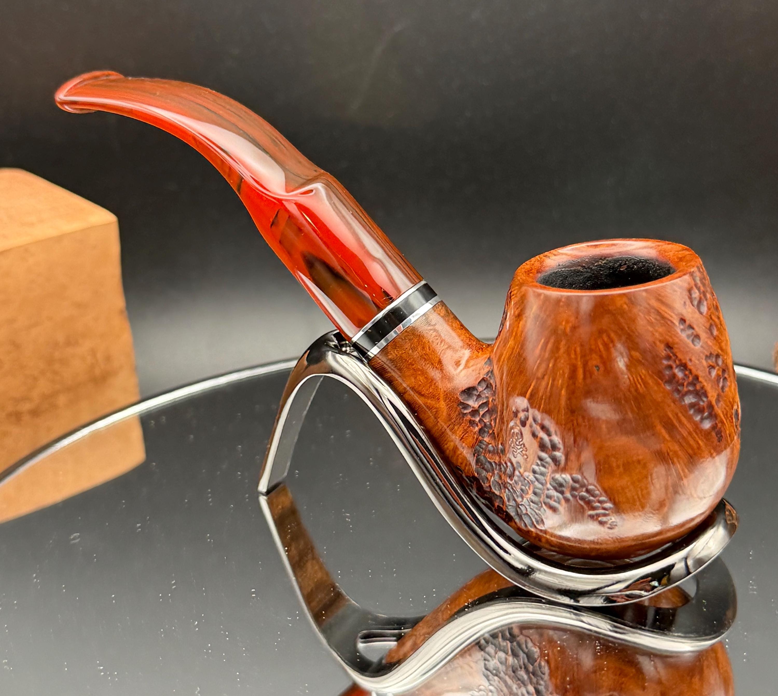 This is a handmade briar pipe that has been designed ,carved, and sanded by hand for around 4 hours . A beautiful acrylic custom made stem was made for it. Non filtered. A very nice daily smoker. This is a med/large sized bent pipe that has a larger 7/8x1.5” tapered bowl for a nice long smoke. very comfortable hanger. As always it’s been sealed and polished with an all natural carnuba wax. This was created from a premium block of Grecian briar and has the effect of some cat eye swirling and natural wood grain lining. An aluminum and acrylic spacer was machined onto the shank to ensure no cracking for longevity! The bowl has been coated with a carbon and waterglass coating so you can start smoking right away without the worry of a break in process.