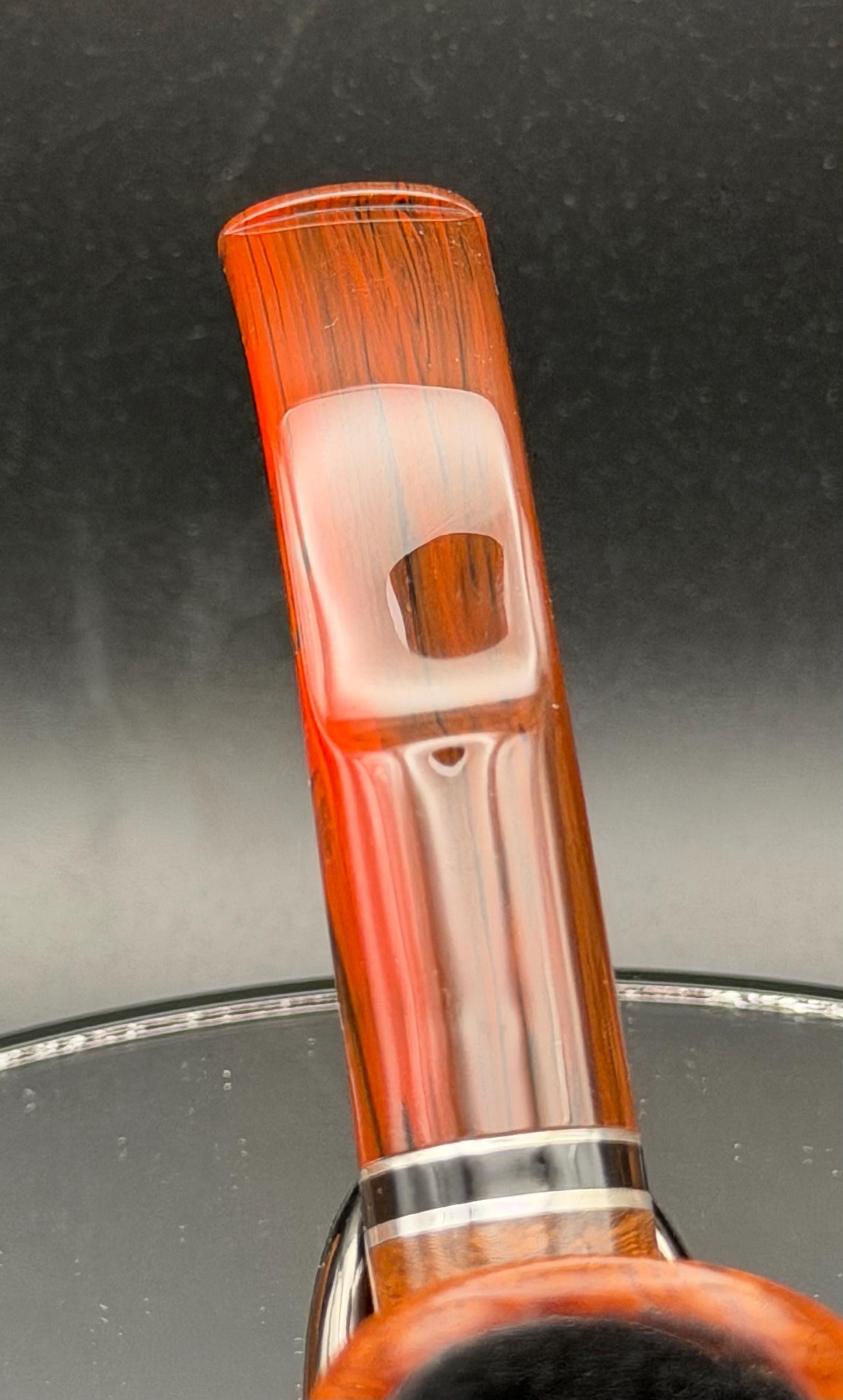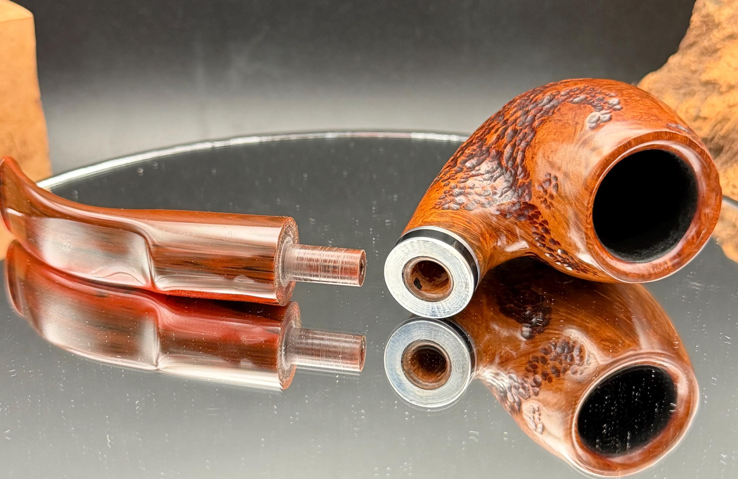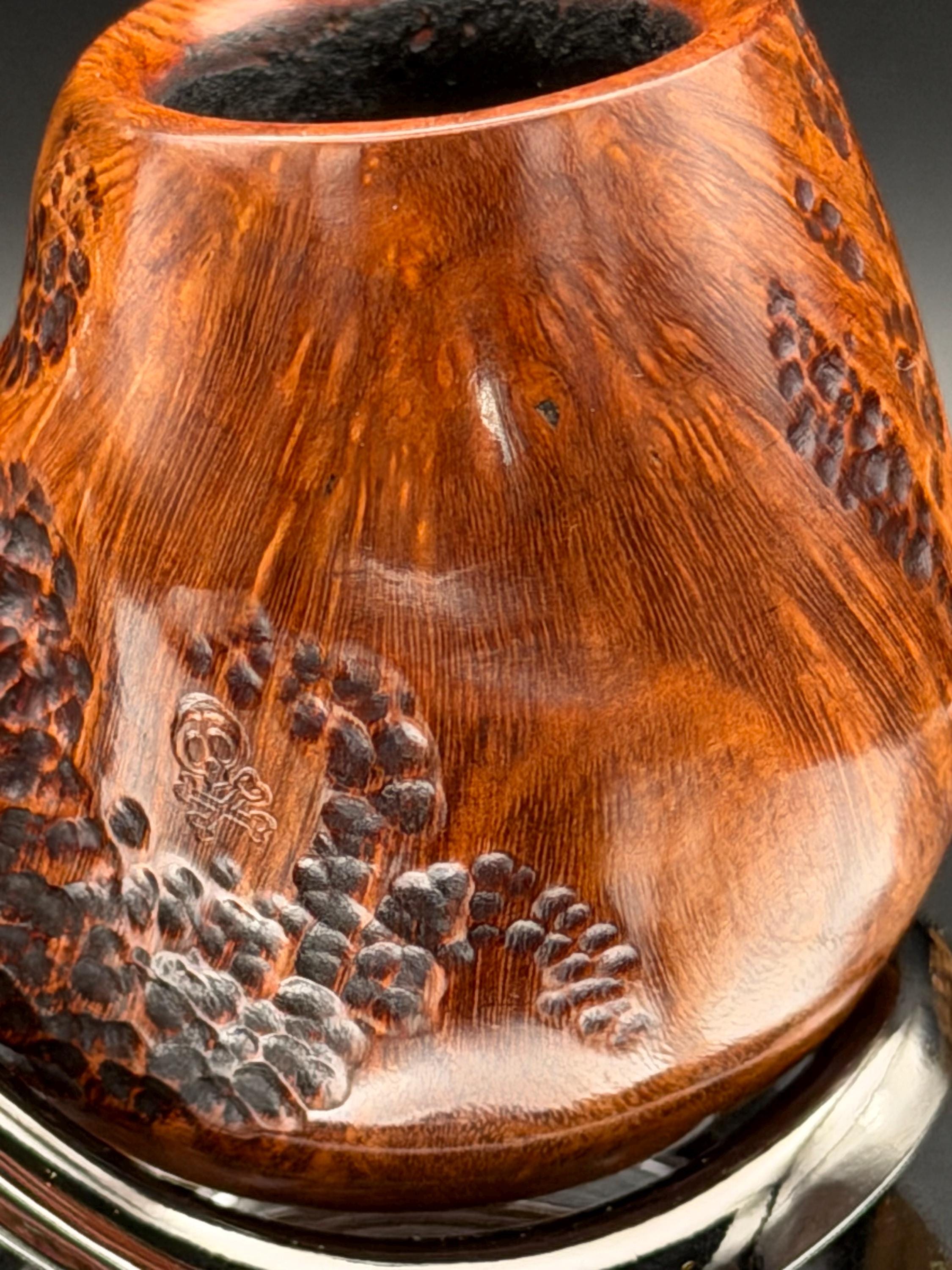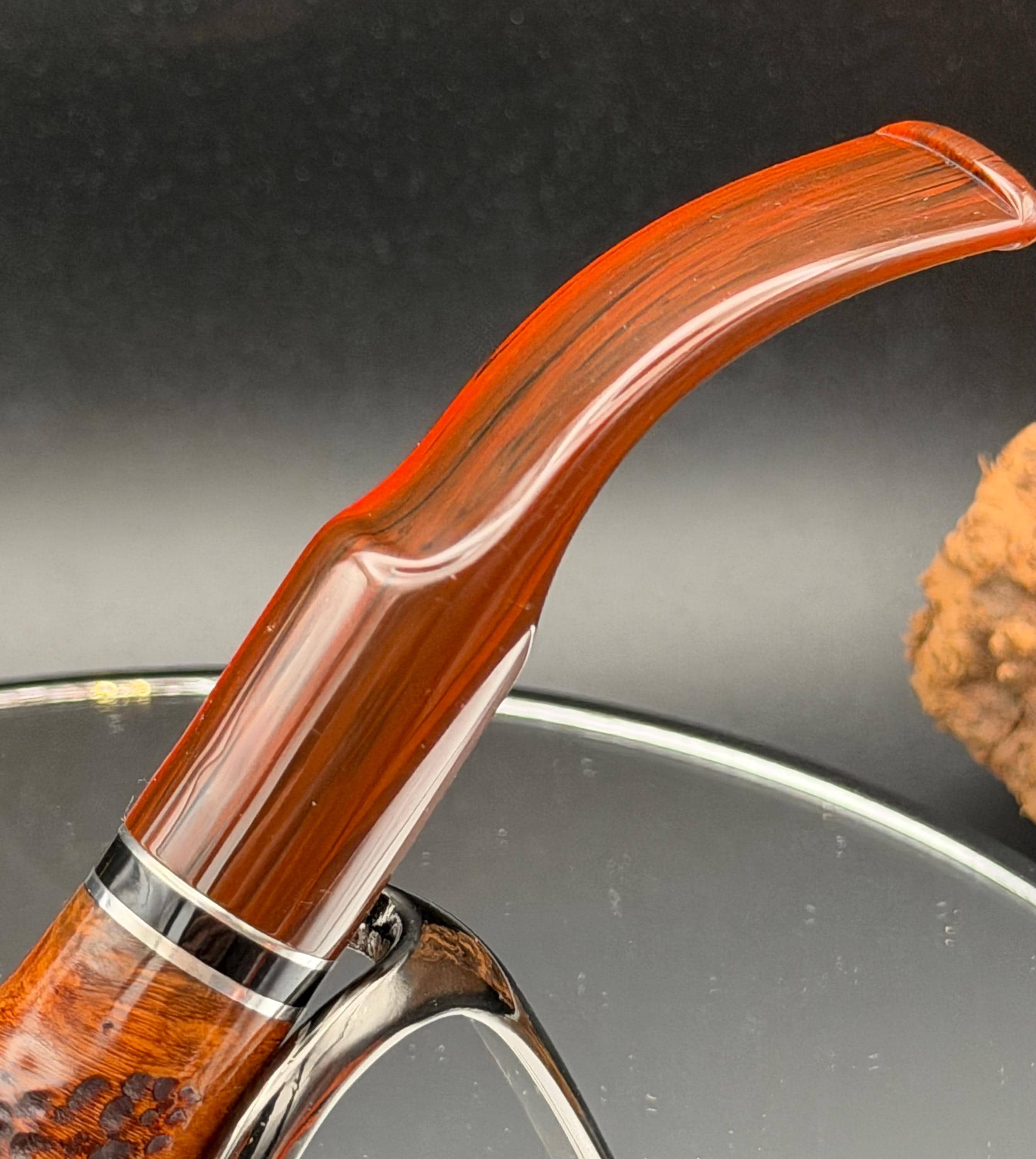This is a handmade briar pipe that has been designed ,carved, and sanded by hand for around 4 hours . A beautiful acrylic custom made stem was made for it. Non filtered. A very nice daily smoker. This is a med/large sized bent pipe that has a larger 7/8x1.5” tapered bowl for a nice long smoke. very comfortable hanger. As always it’s been sealed and polished with an all natural carnuba wax. This was created from a premium block of Grecian briar and has the effect of some cat eye swirling and natural wood grain lining. An aluminum and acrylic spacer was machined onto the shank to ensure no cracking for longevity! The bowl has been coated with a carbon and waterglass coating so you can start smoking right away without the worry of a break in process.