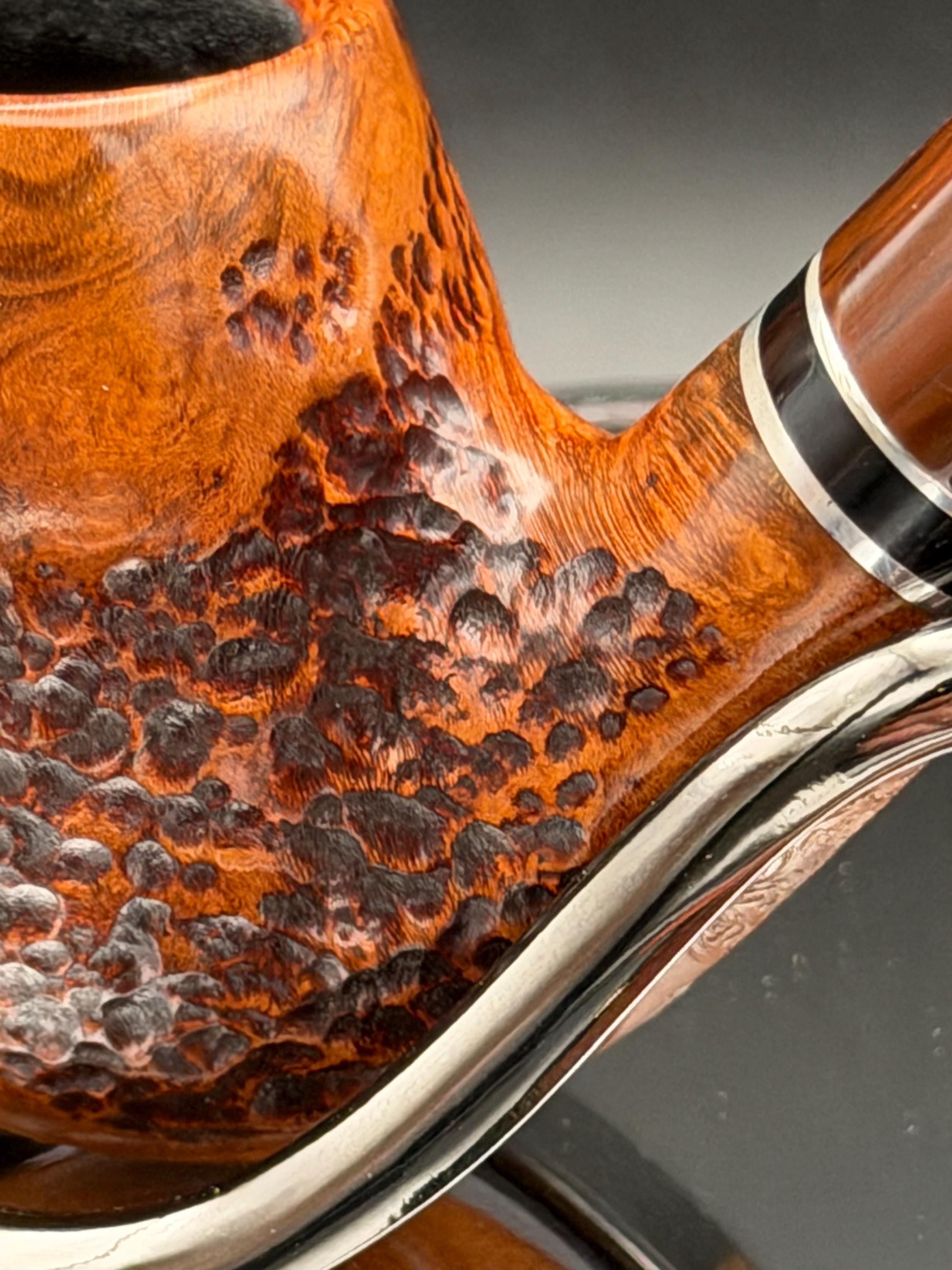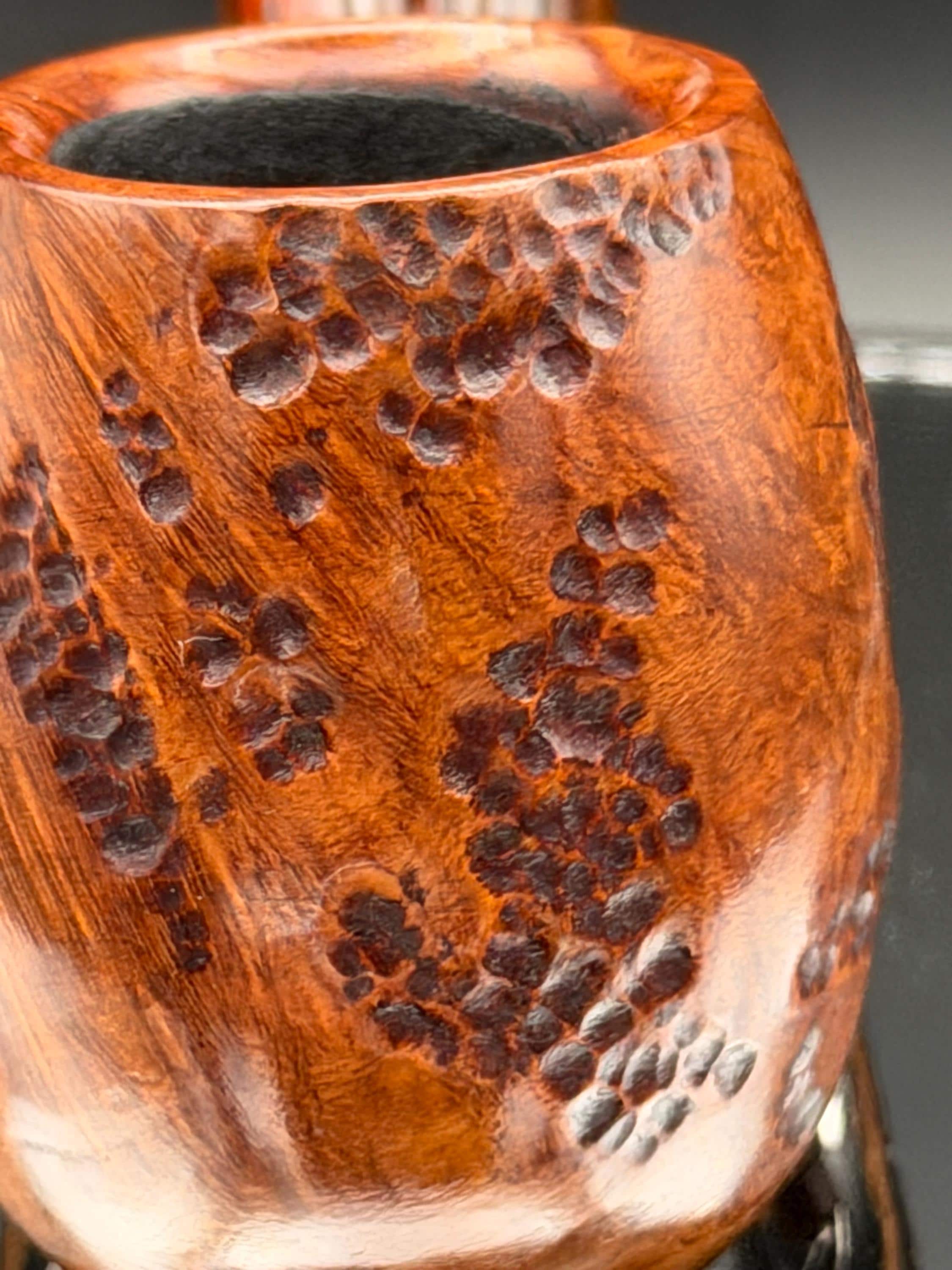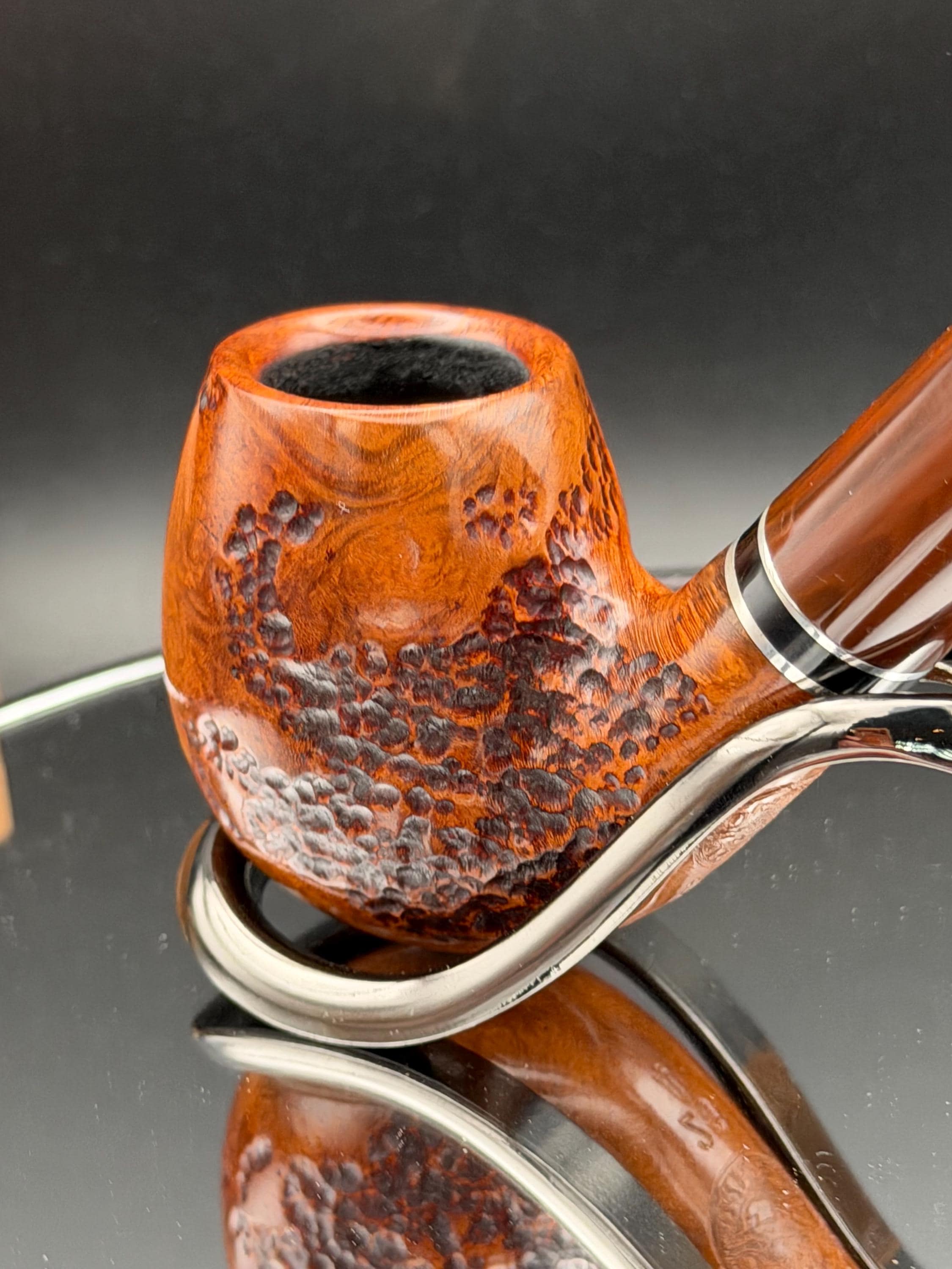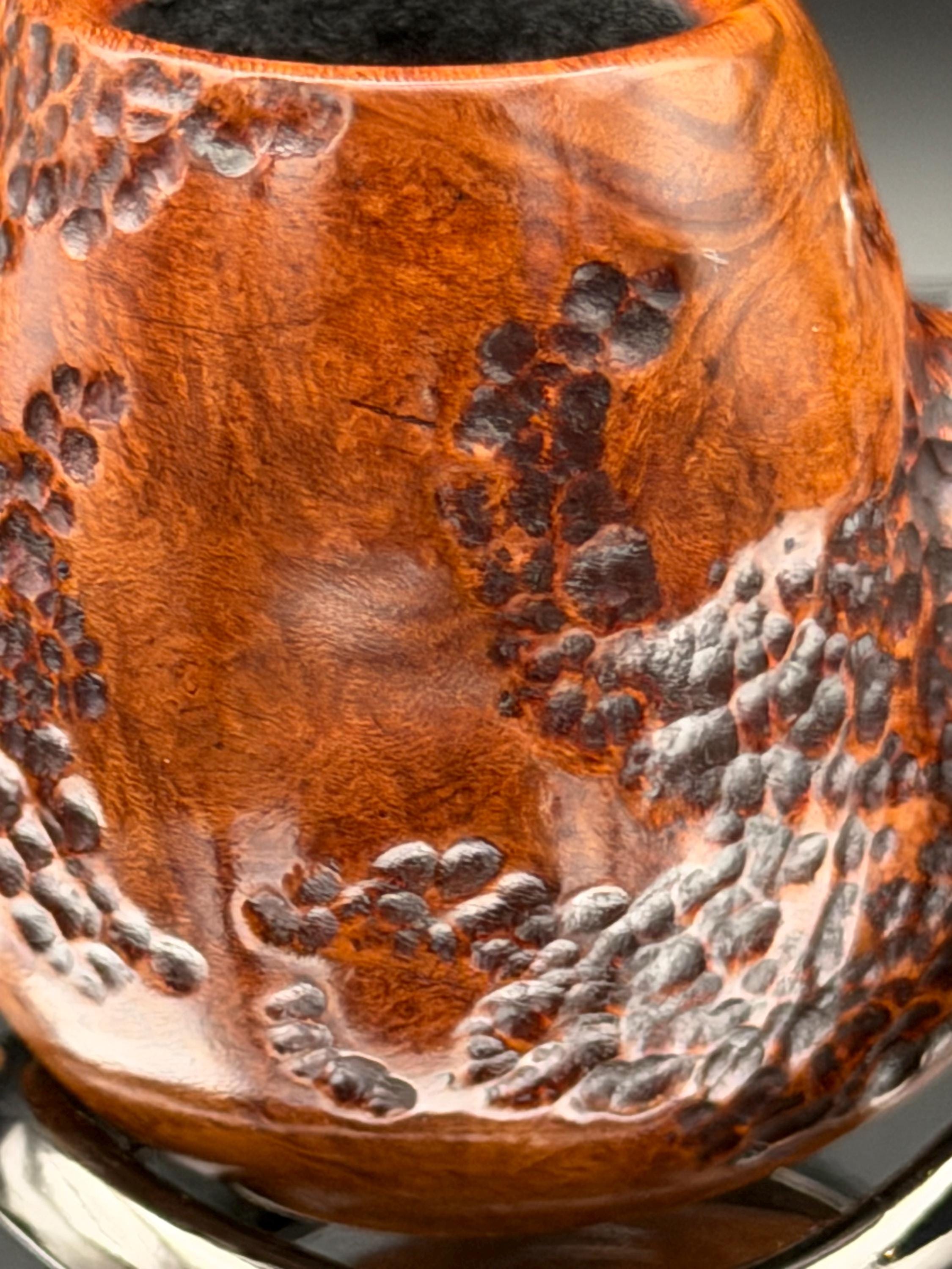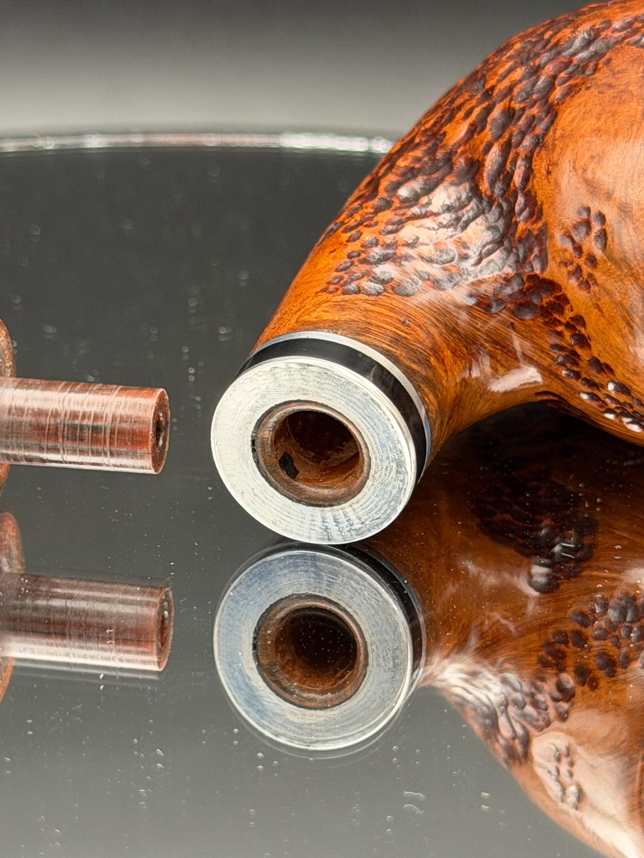 This is a handmade briar pipe that has been designed ,carved, and sanded by hand for around 4 hours . A beautiful acrylic custom made stem was made for it. Non filtered. A very nice daily smoker. This is a med/large sized bent pipe that has a larger 7/8x1.5” tapered bowl for a nice long smoke. very comfortable hanger. As always it’s been sealed and polished with an all natural carnuba wax. This was created from a premium block of Grecian briar and has the effect of some cat eye swirling and natural wood grain lining. An aluminum and acrylic spacer was machined onto the shank to ensure no cracking for longevity! The bowl has been coated with a carbon and waterglass coating so you can start smoking right away without the worry of a break in process.