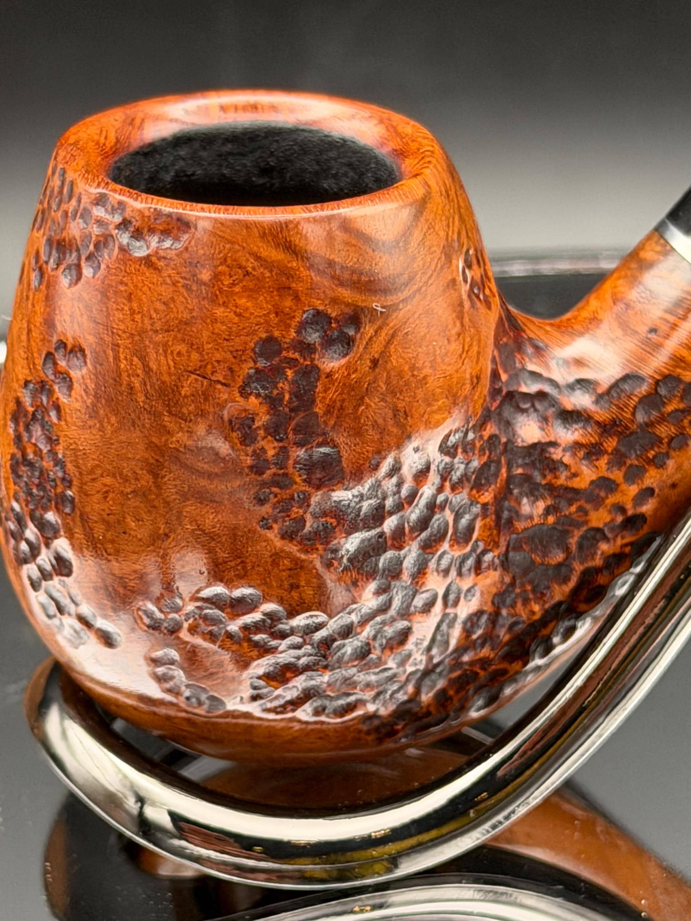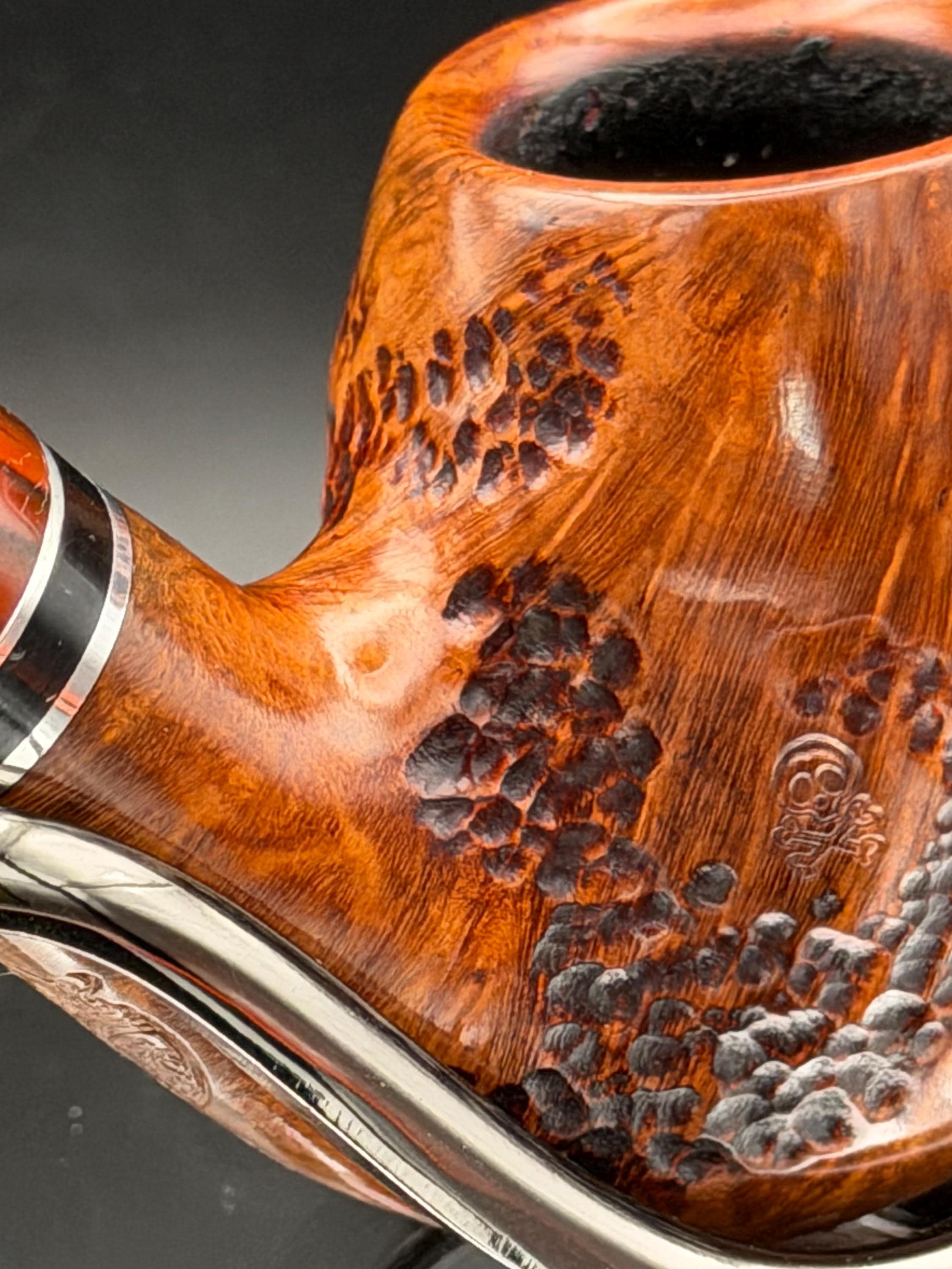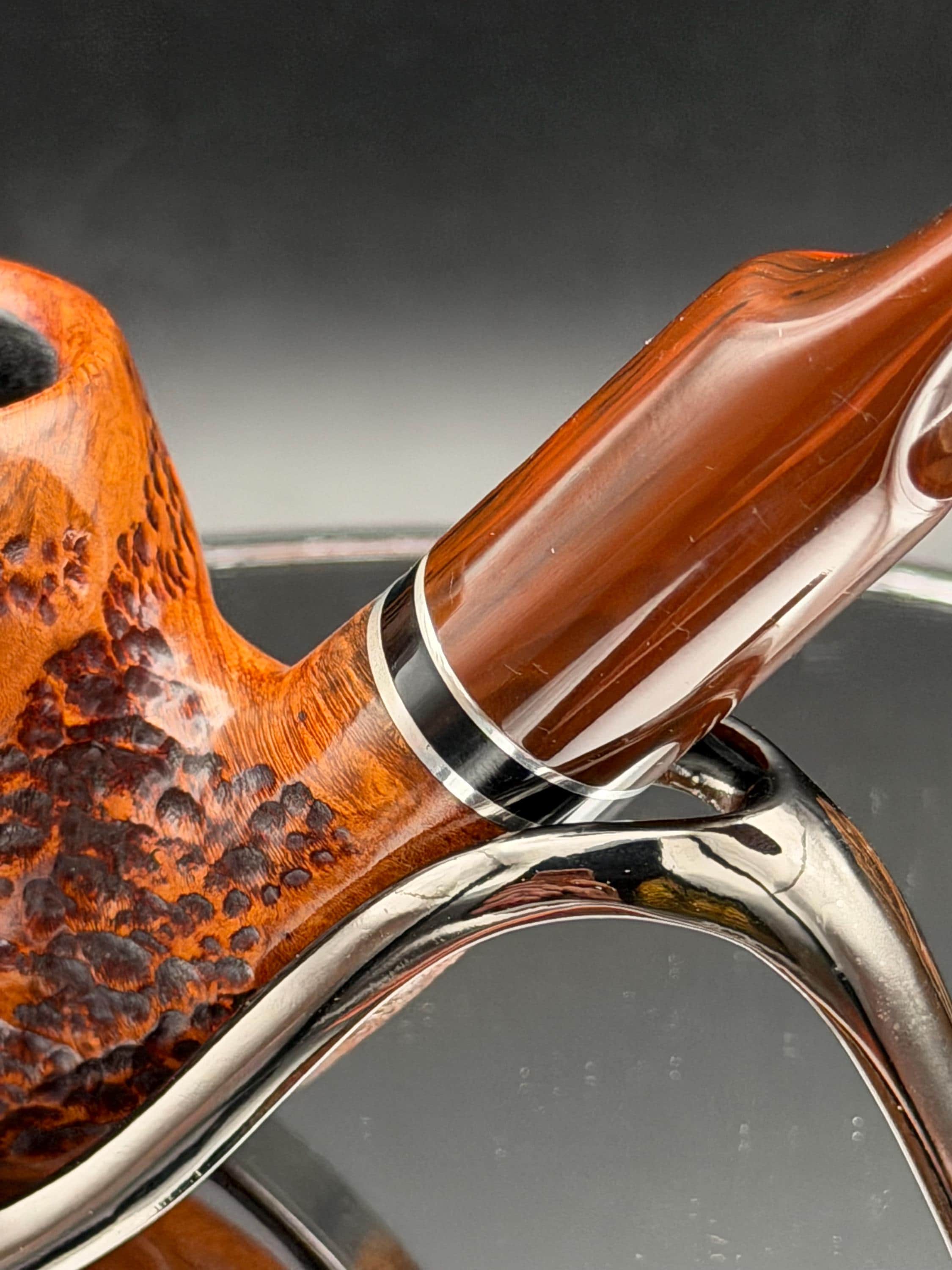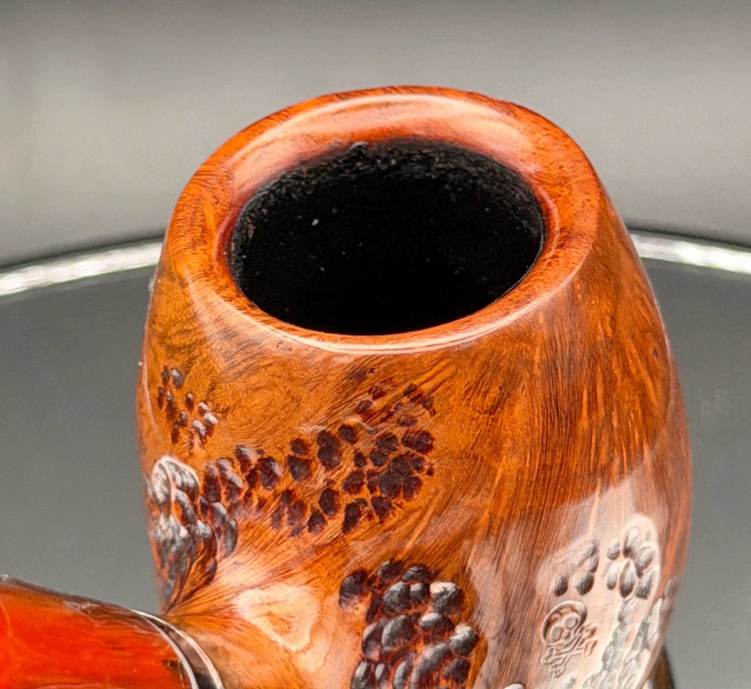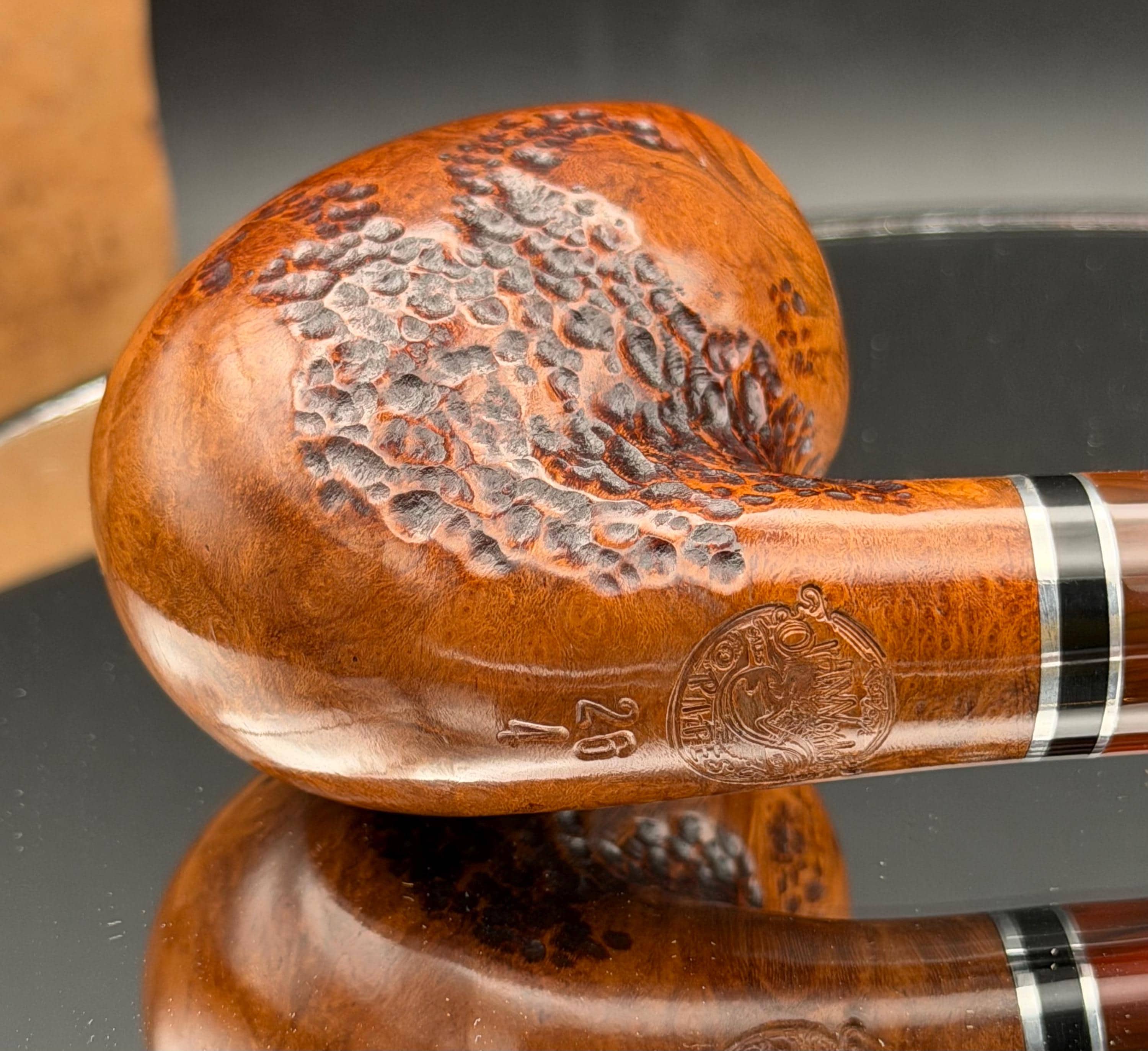 This is a handmade briar pipe that has been designed ,carved, and sanded by hand for around 4 hours . A beautiful acrylic custom made stem was made for it. Non filtered. A very nice daily smoker. This is a med/large sized bent pipe that has a larger 7/8x1.5” tapered bowl for a nice long smoke. very comfortable hanger. As always it’s been sealed and polished with an all natural carnuba wax. This was created from a premium block of Grecian briar and has the effect of some cat eye swirling and natural wood grain lining. An aluminum and acrylic spacer was machined onto the shank to ensure no cracking for longevity! The bowl has been coated with a carbon and waterglass coating so you can start smoking right away without the worry of a break in process.