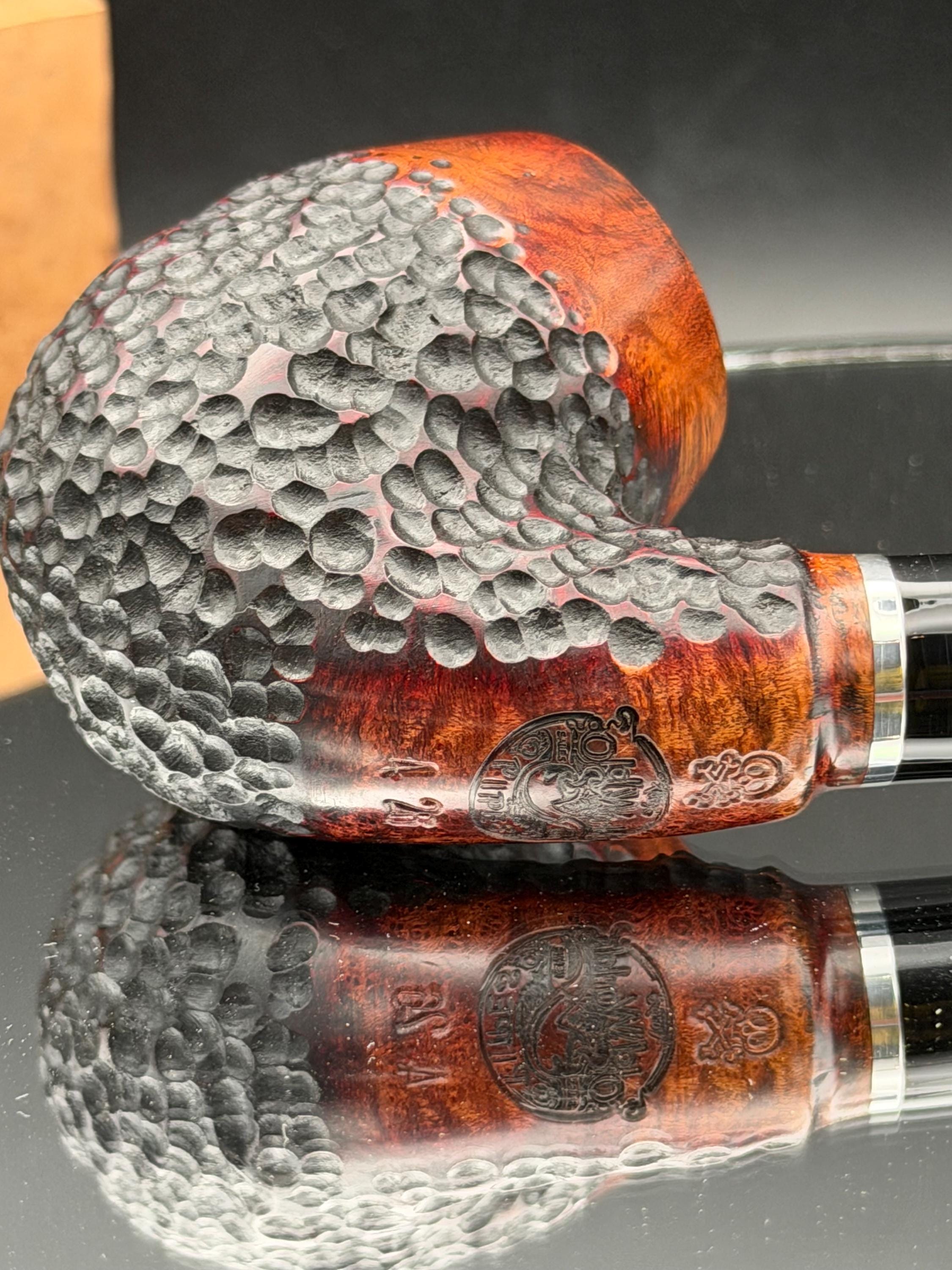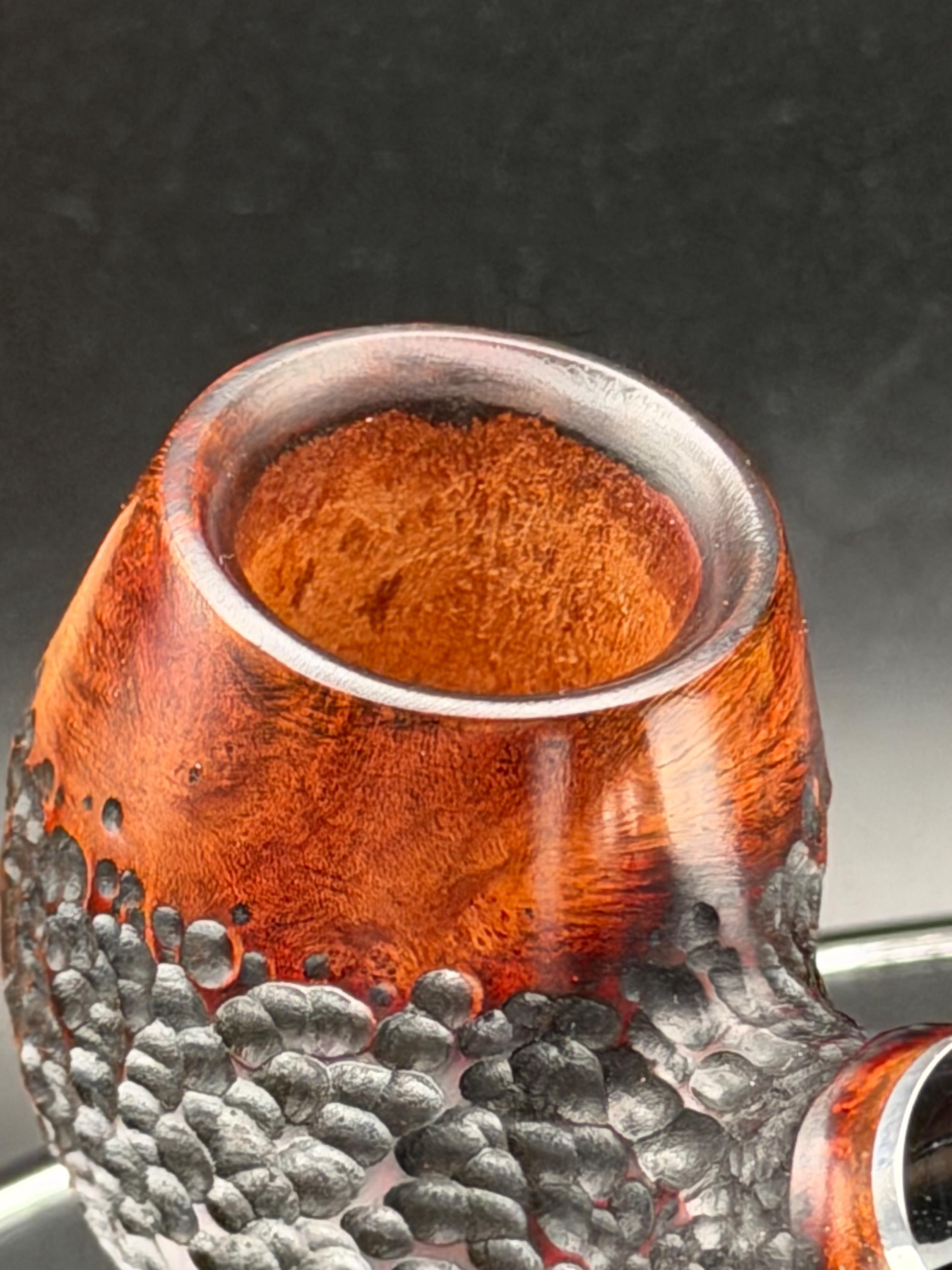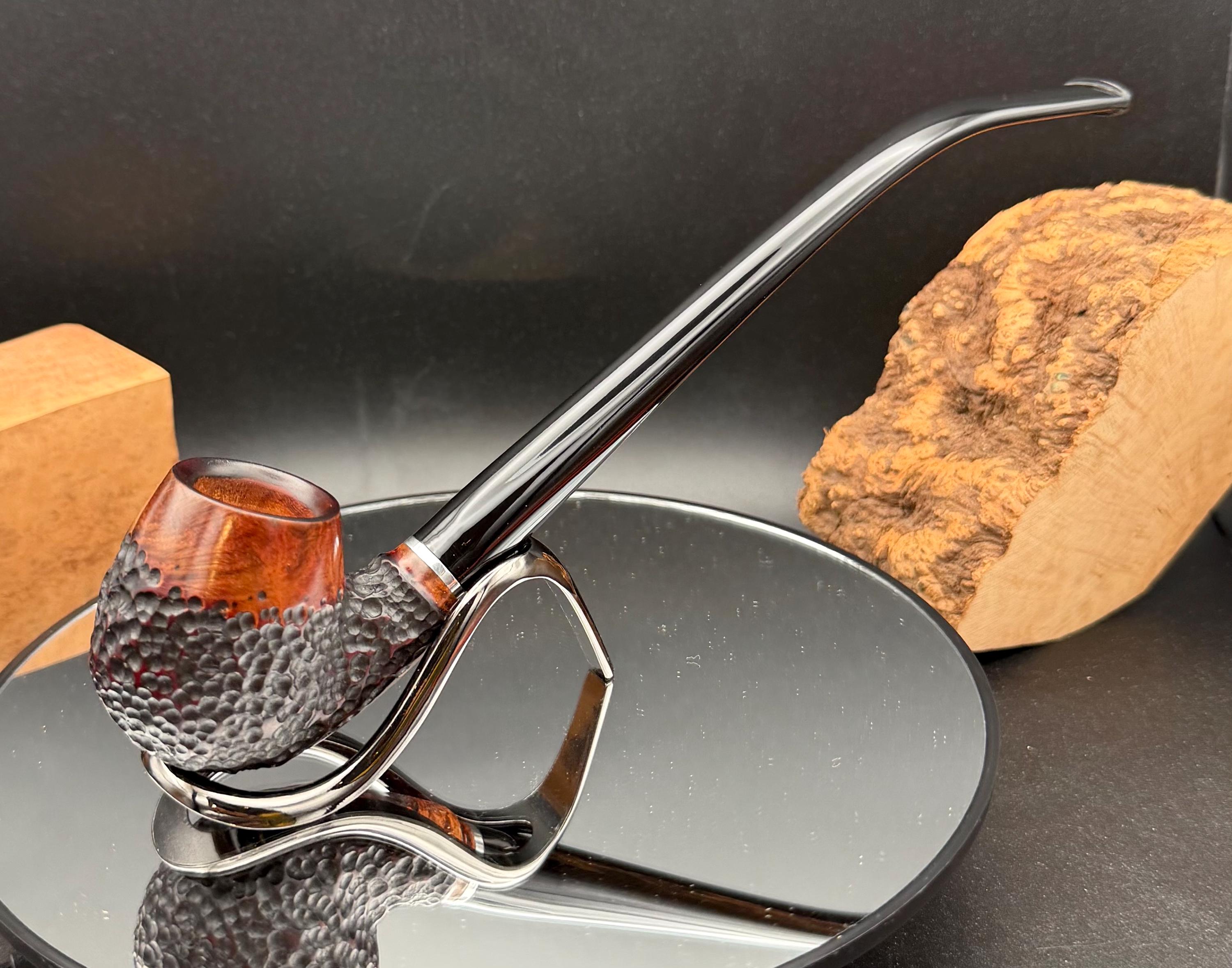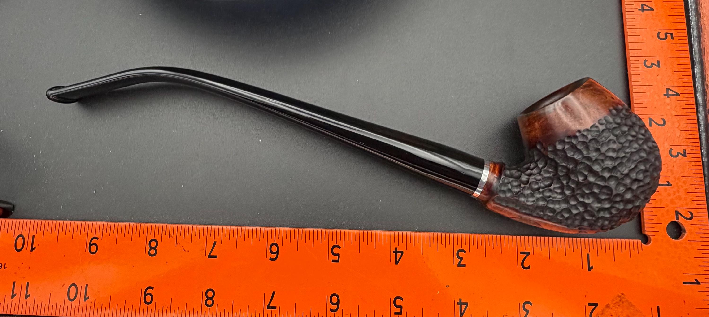 This is a handmade briar pipe that has been carved rusticated and sanded by hand . A beautiful acrylic custom made stem was made for it. Non filtered. A very nice daily smoker. Nice sized church warden and has a little length to it. 7/8x1 1/2” bowl