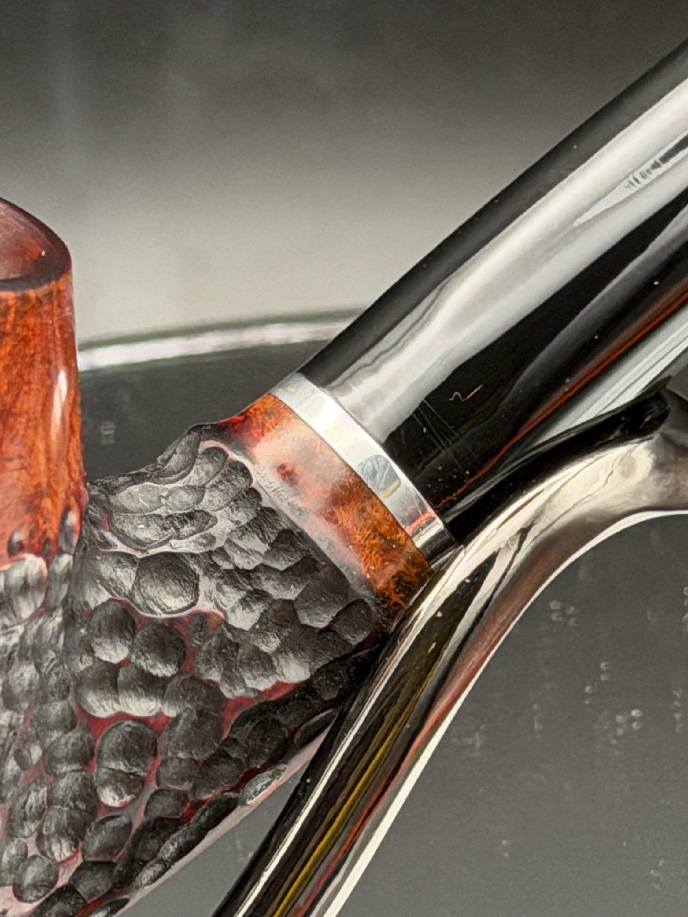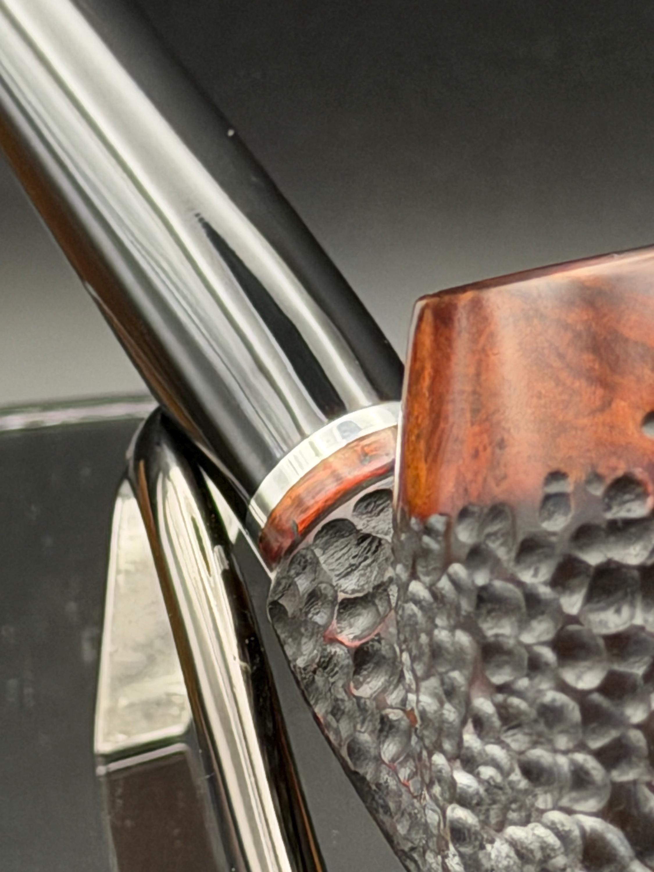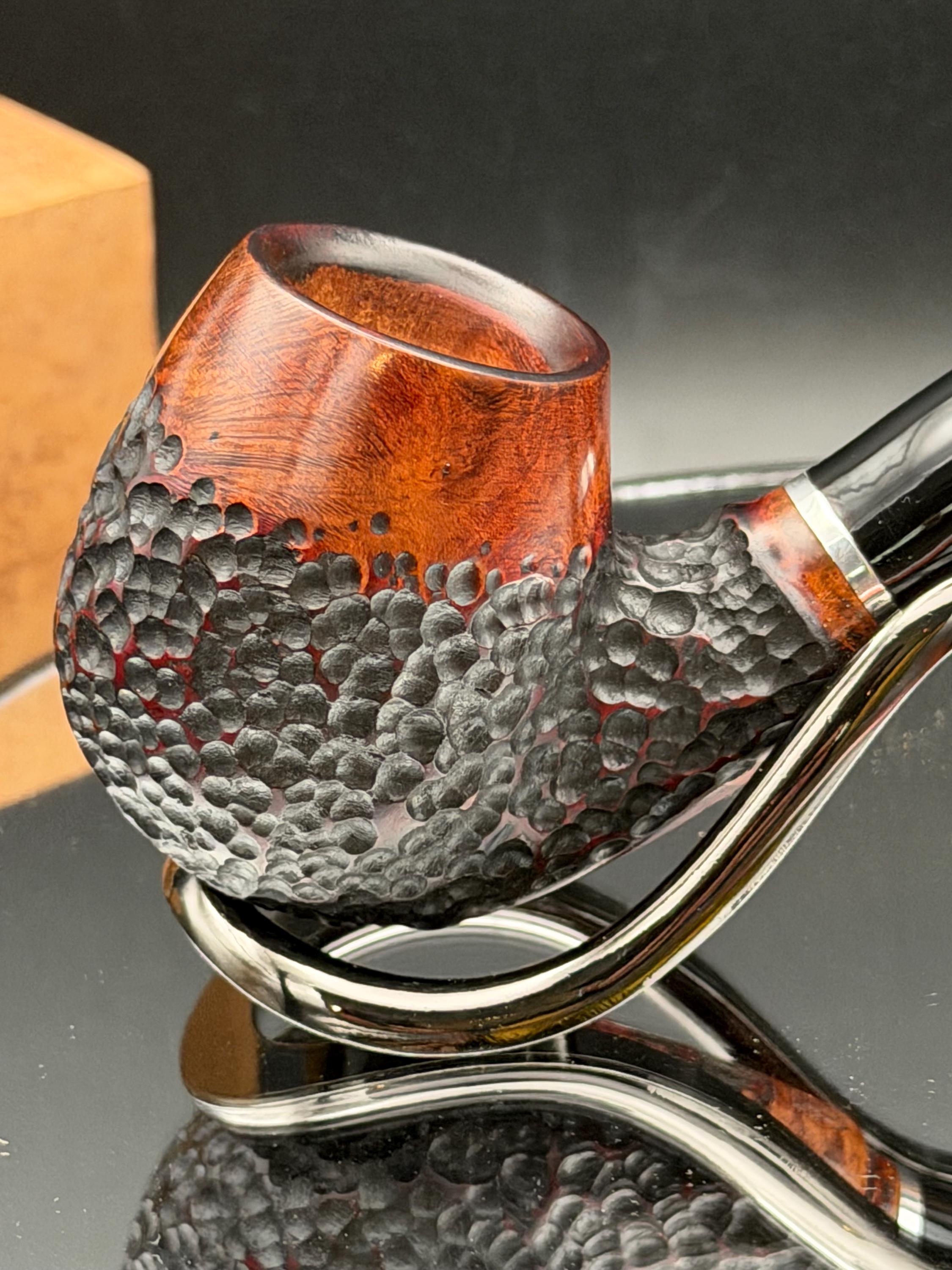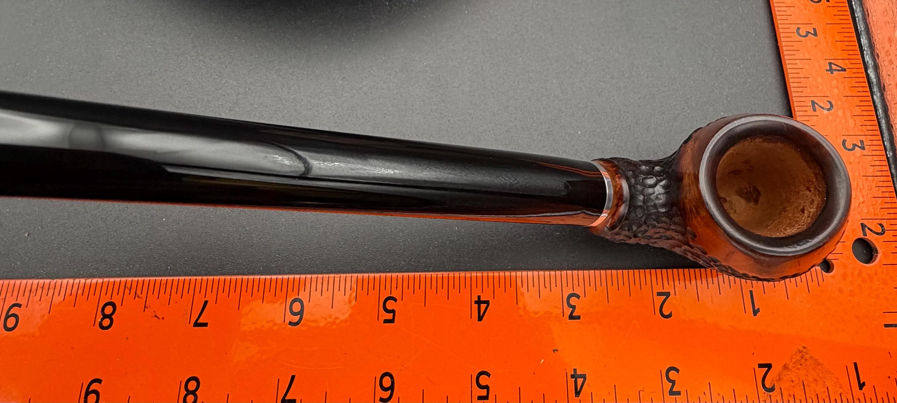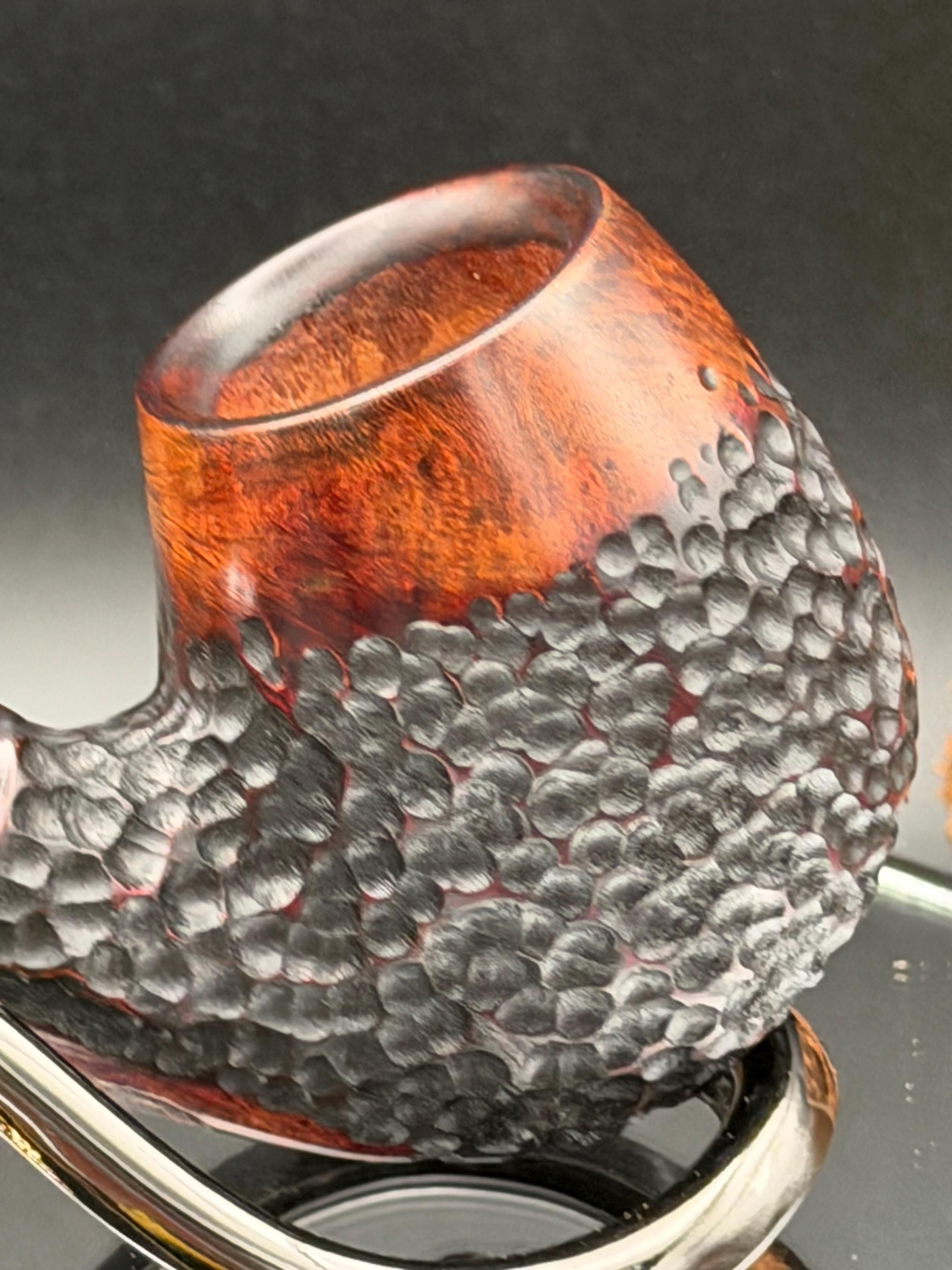 This is a handmade briar pipe that has been carved rusticated and sanded by hand . A beautiful acrylic custom made stem was made for it. Non filtered. A very nice daily smoker. Nice sized church warden and has a little length to it. 7/8x1 1/2” bowl