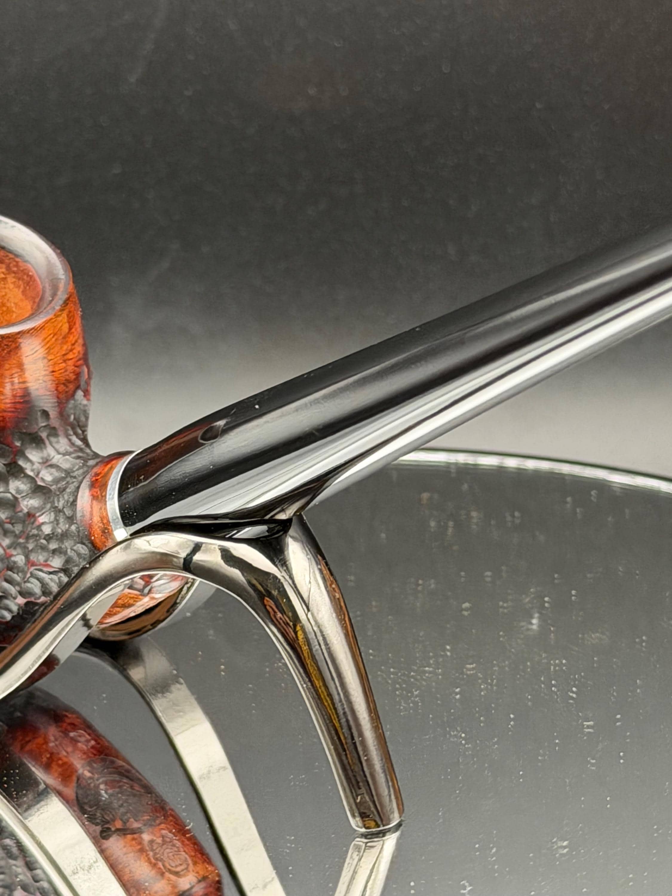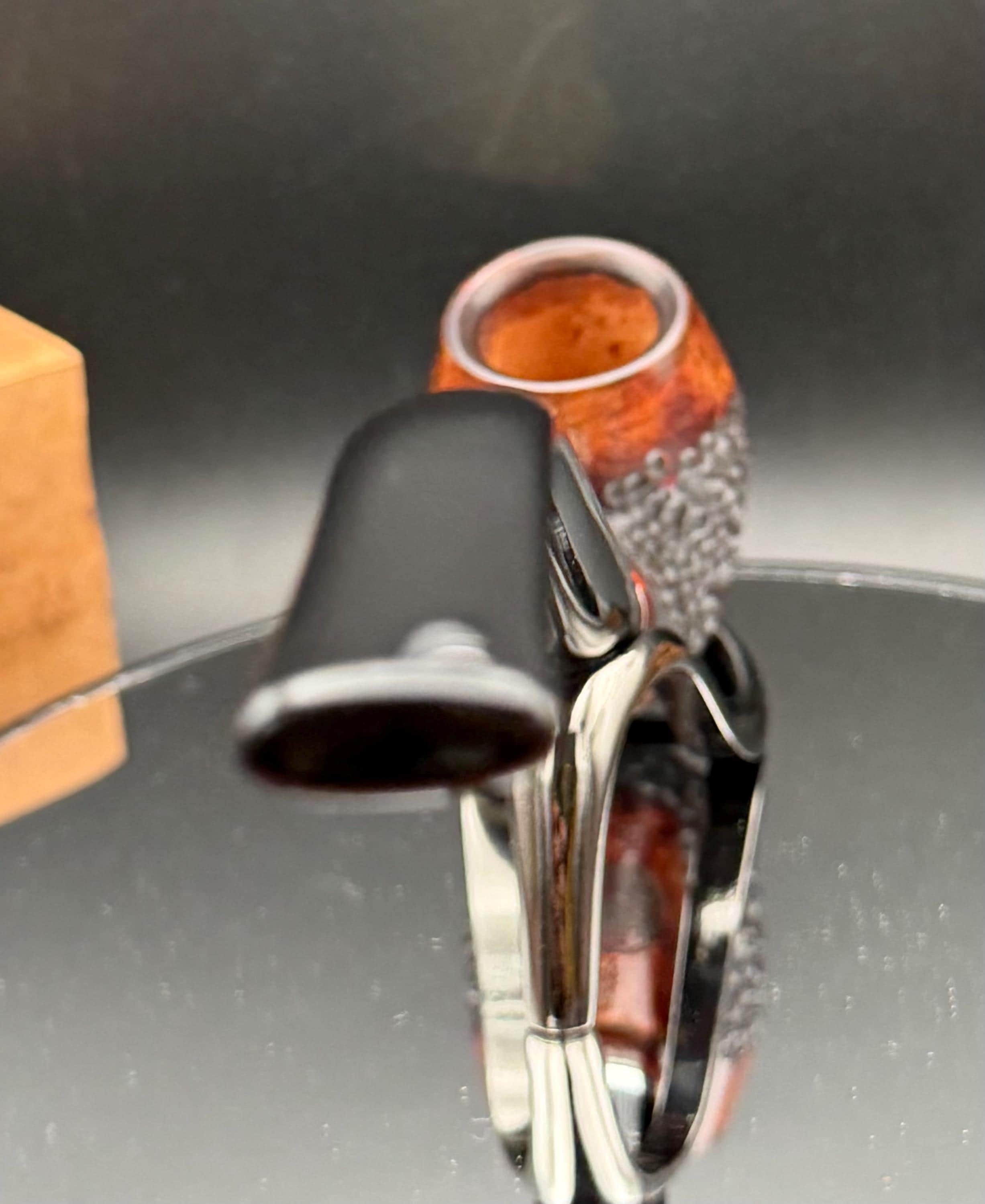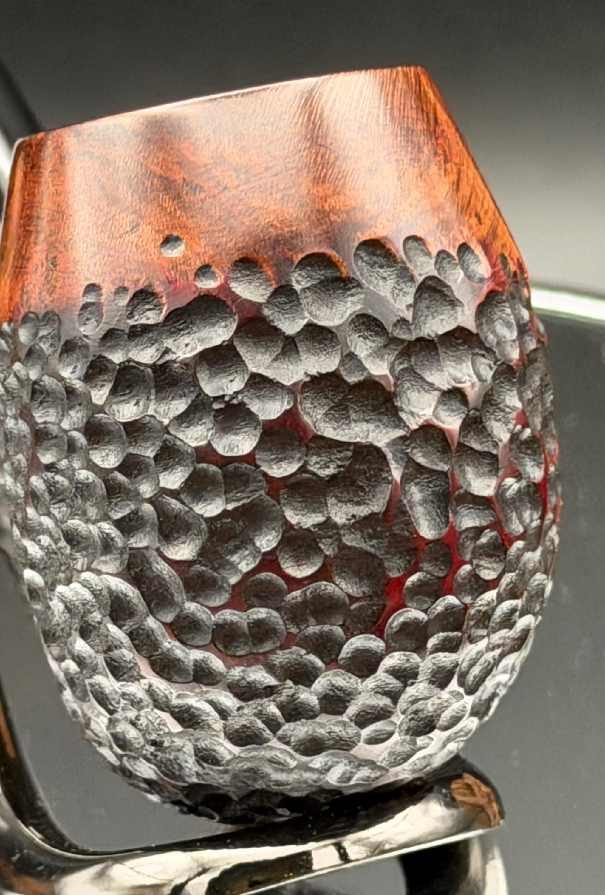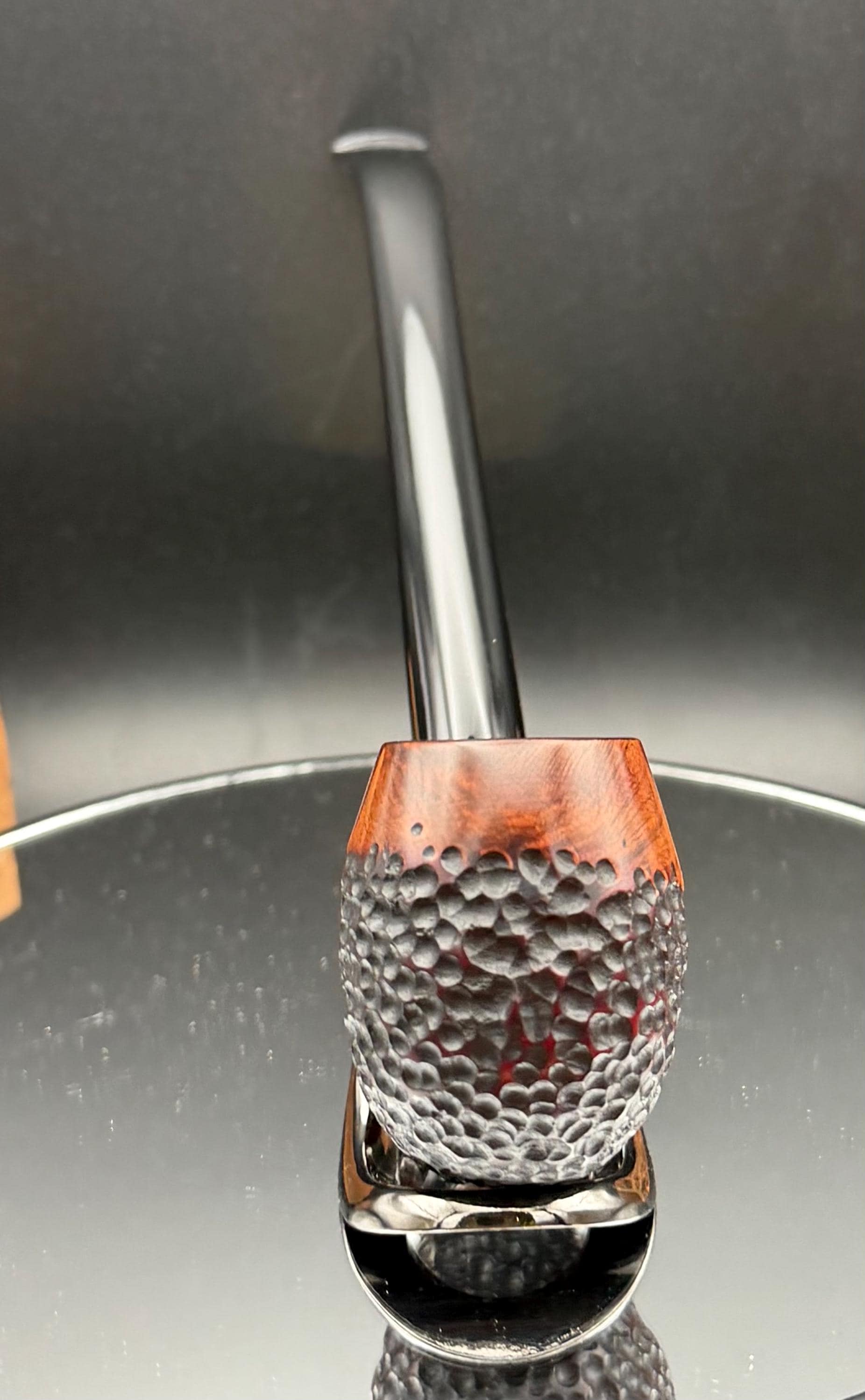 This is a handmade briar pipe that has been carved rusticated and sanded by hand . A beautiful acrylic custom made stem was made for it. Non filtered. A very nice daily smoker. Nice sized church warden and has a little length to it. 7/8x1 1/2” bowl