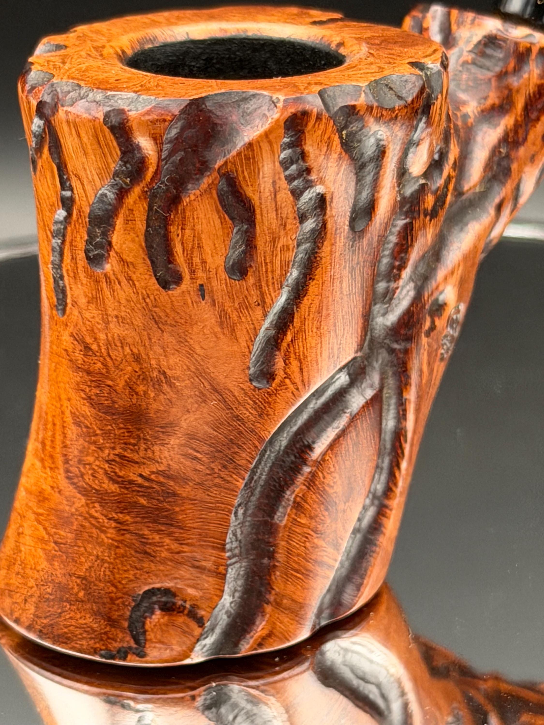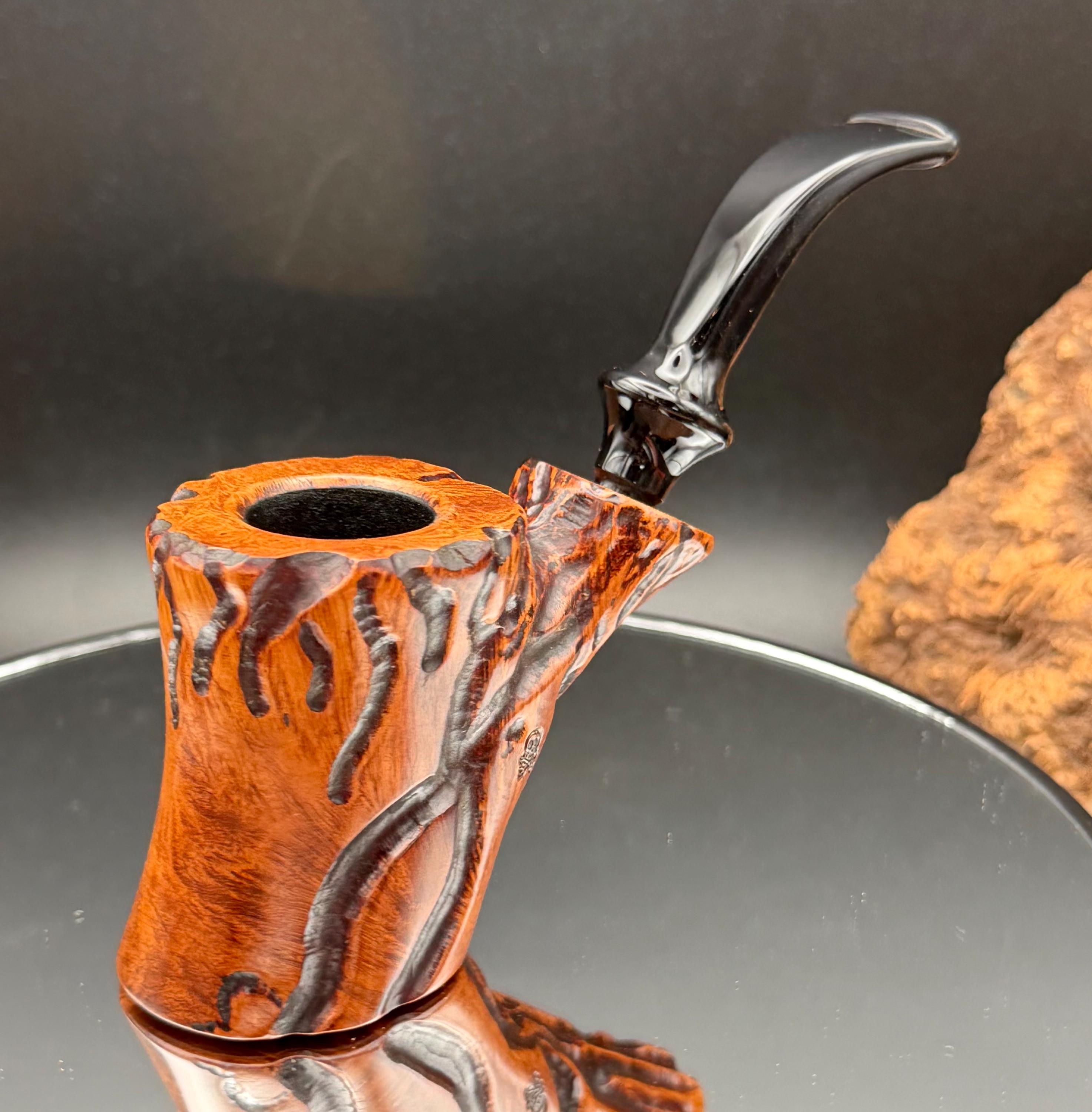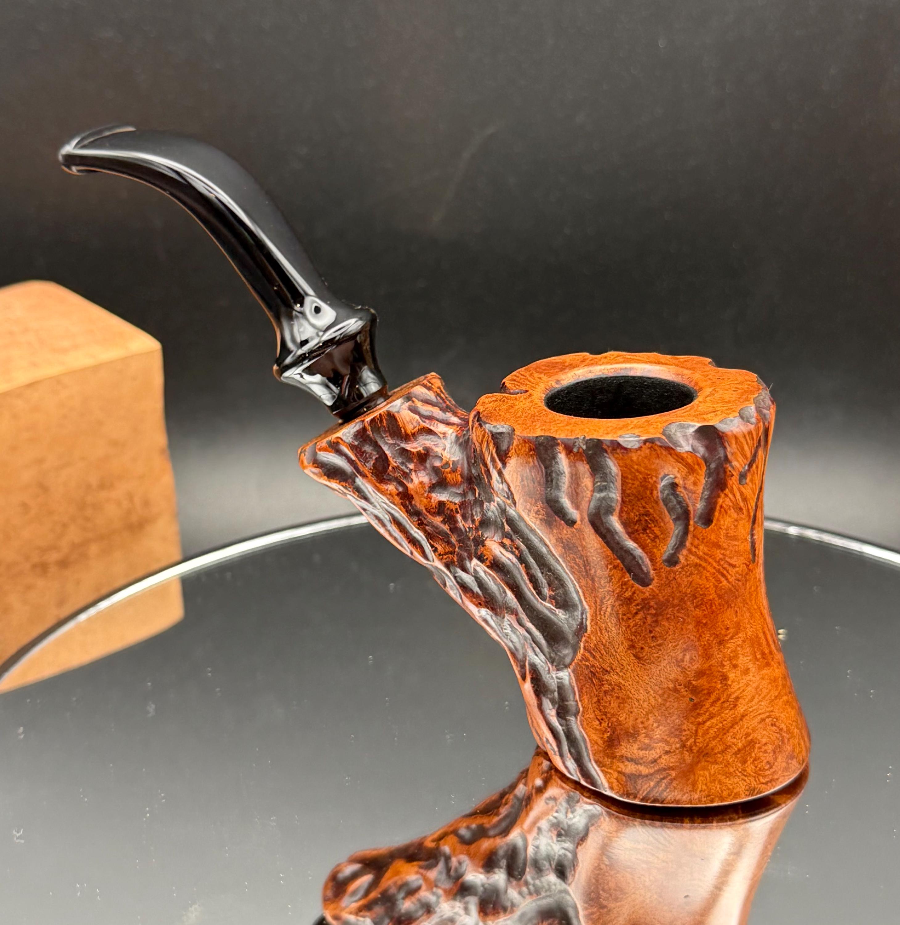 This is a handmade Grecian briar pipe that has been carved and sanded by hand for several hours and polished by me here at the shop. Acrylic custom made stem machined and hand filed/polished. Non filtered. A very nice daily smoker. It has a nice sized 7/8”x 2” chamber and has been coated with a carbon starter cake. discounted price due to balance being off just a bit. It stands on it’s bottom but wants to tip back.
