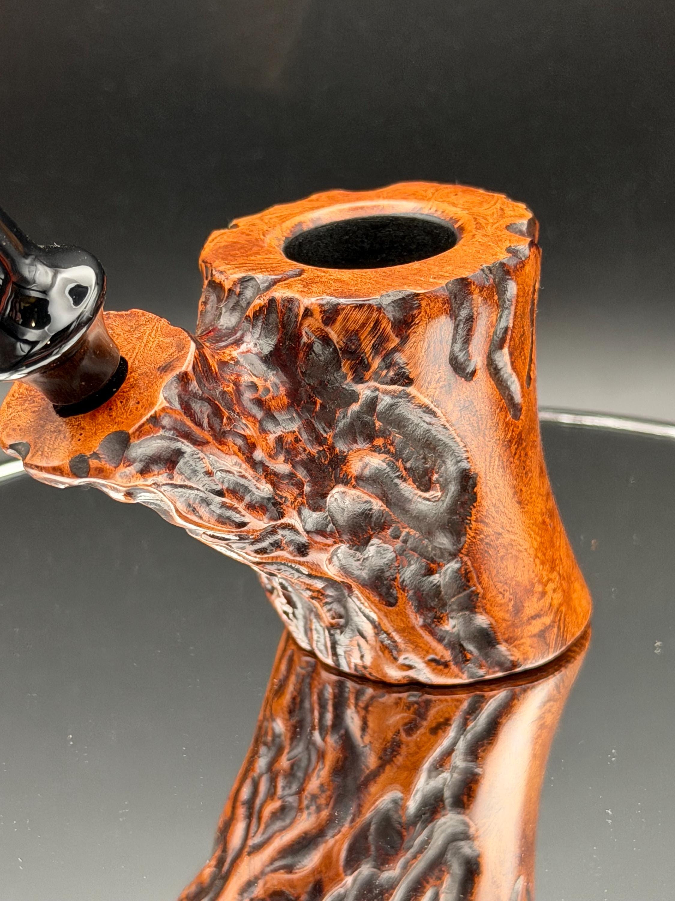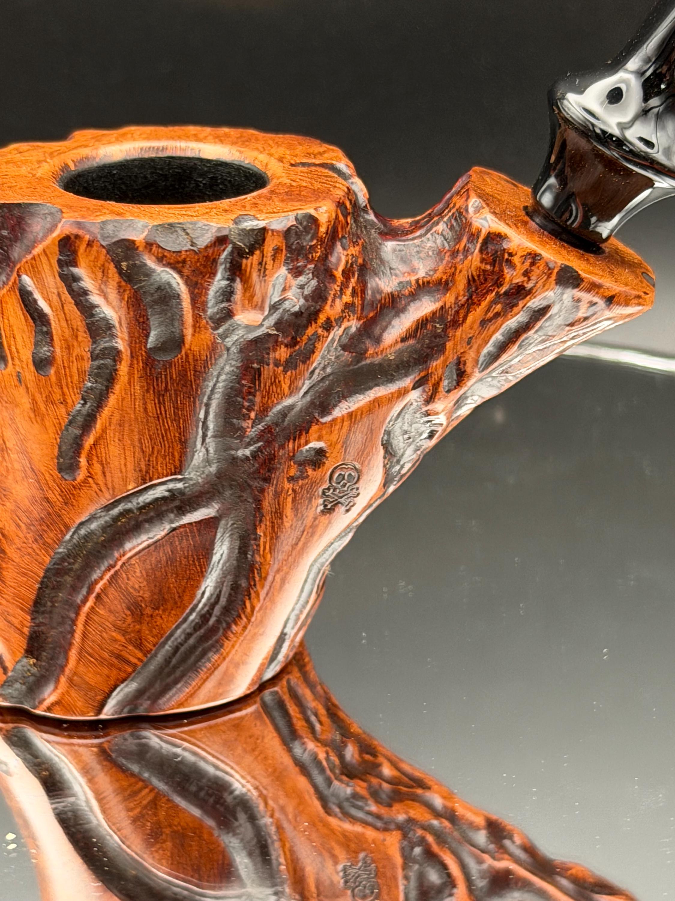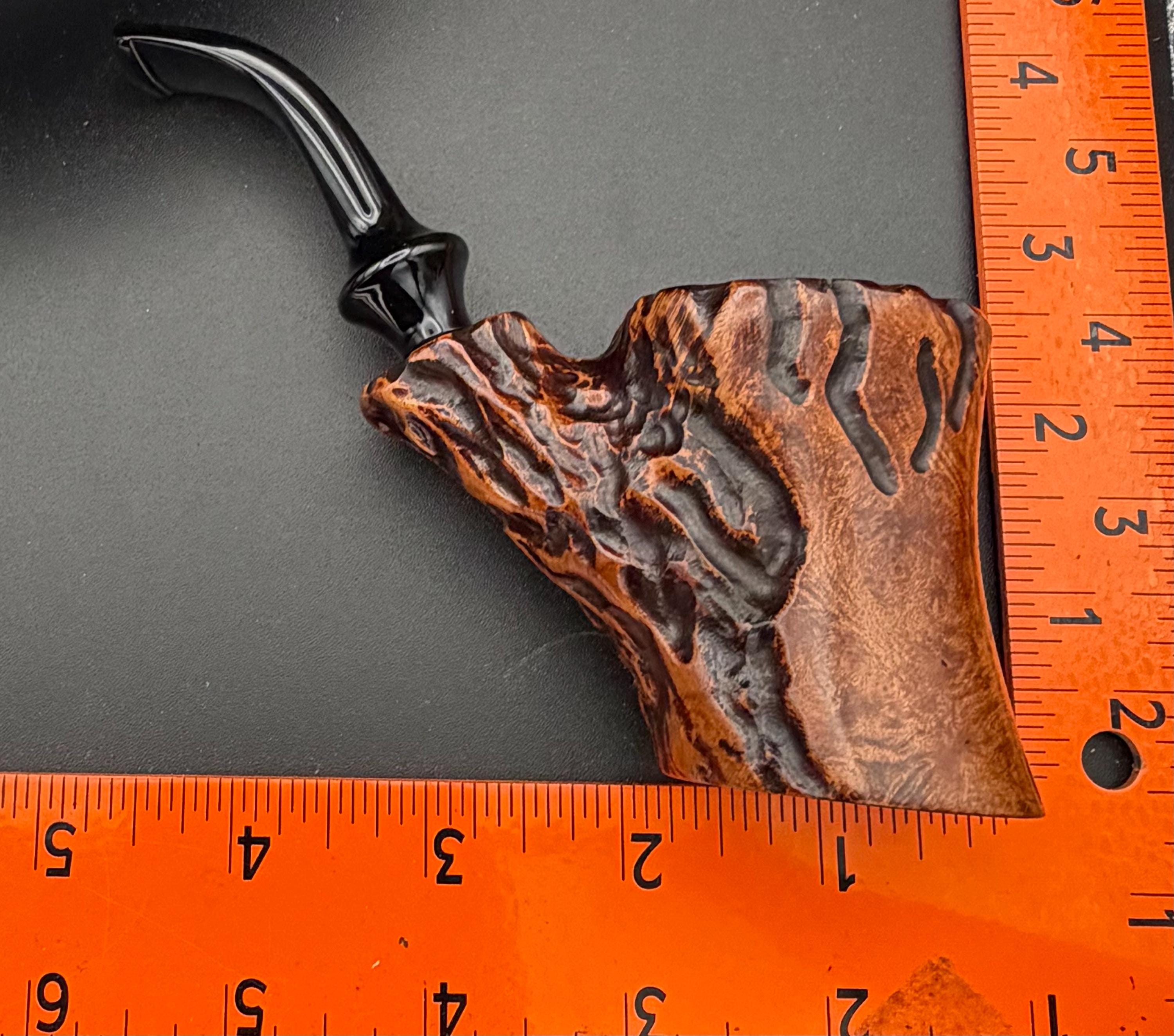 This is a handmade Grecian briar pipe that has been carved and sanded by hand for several hours and polished by me here at the shop. Acrylic custom made stem machined and hand filed/polished. Non filtered. A very nice daily smoker. It has a nice sized 7/8”x 2” chamber and has been coated with a carbon starter cake. discounted price due to balance being off just a bit. It stands on it’s bottom but wants to tip back.