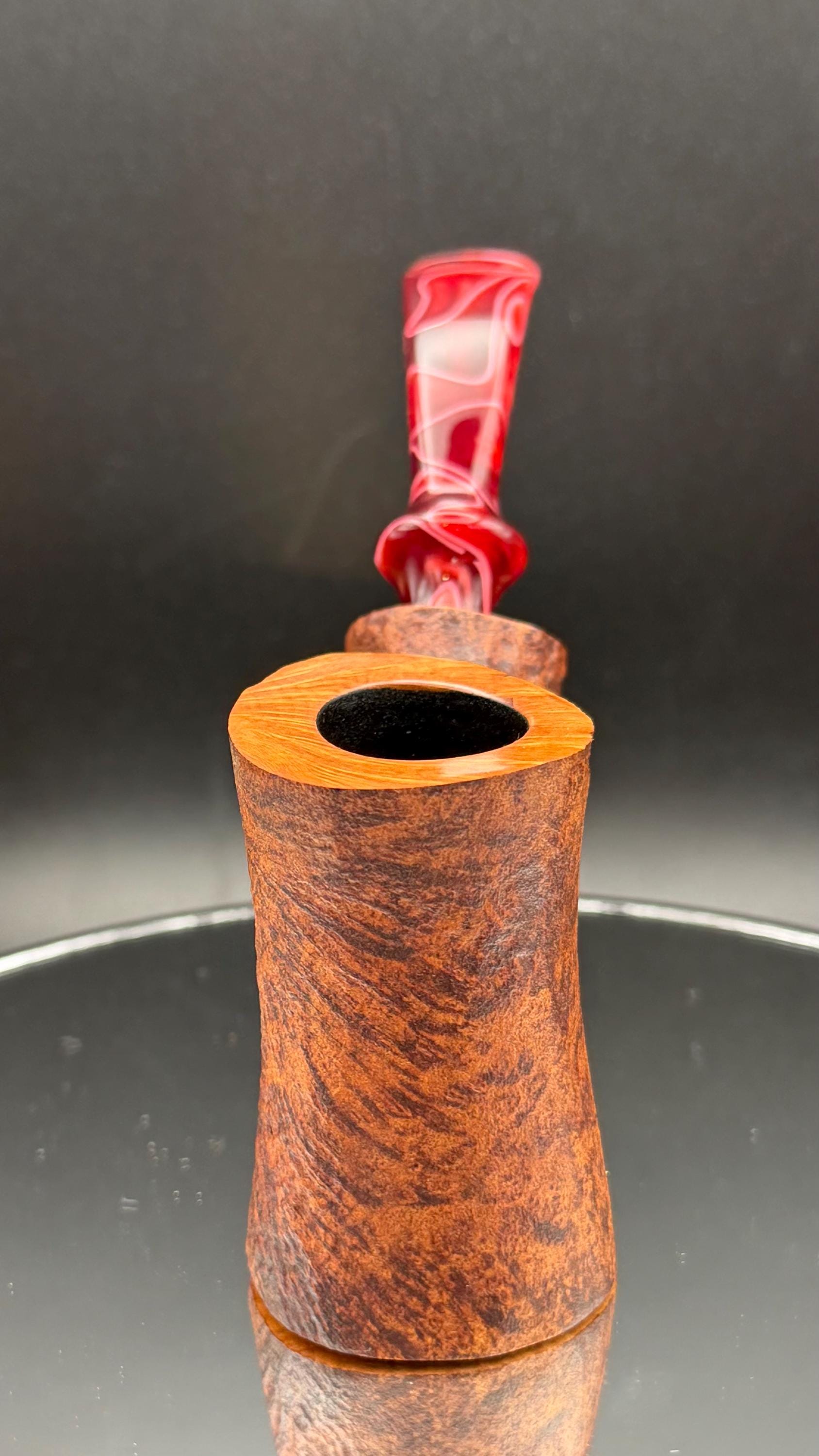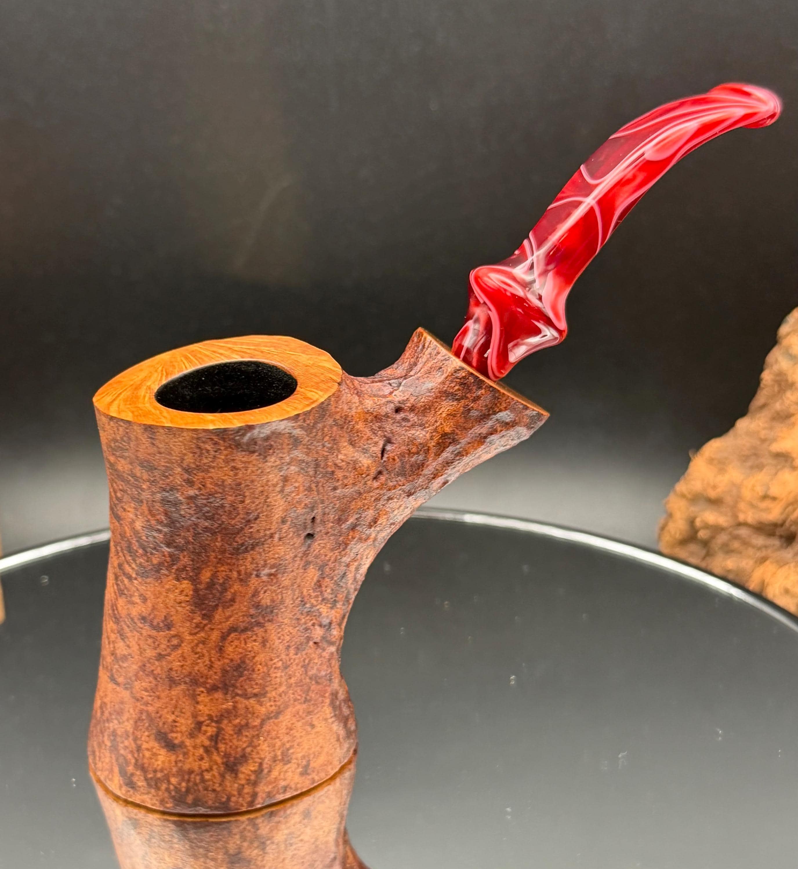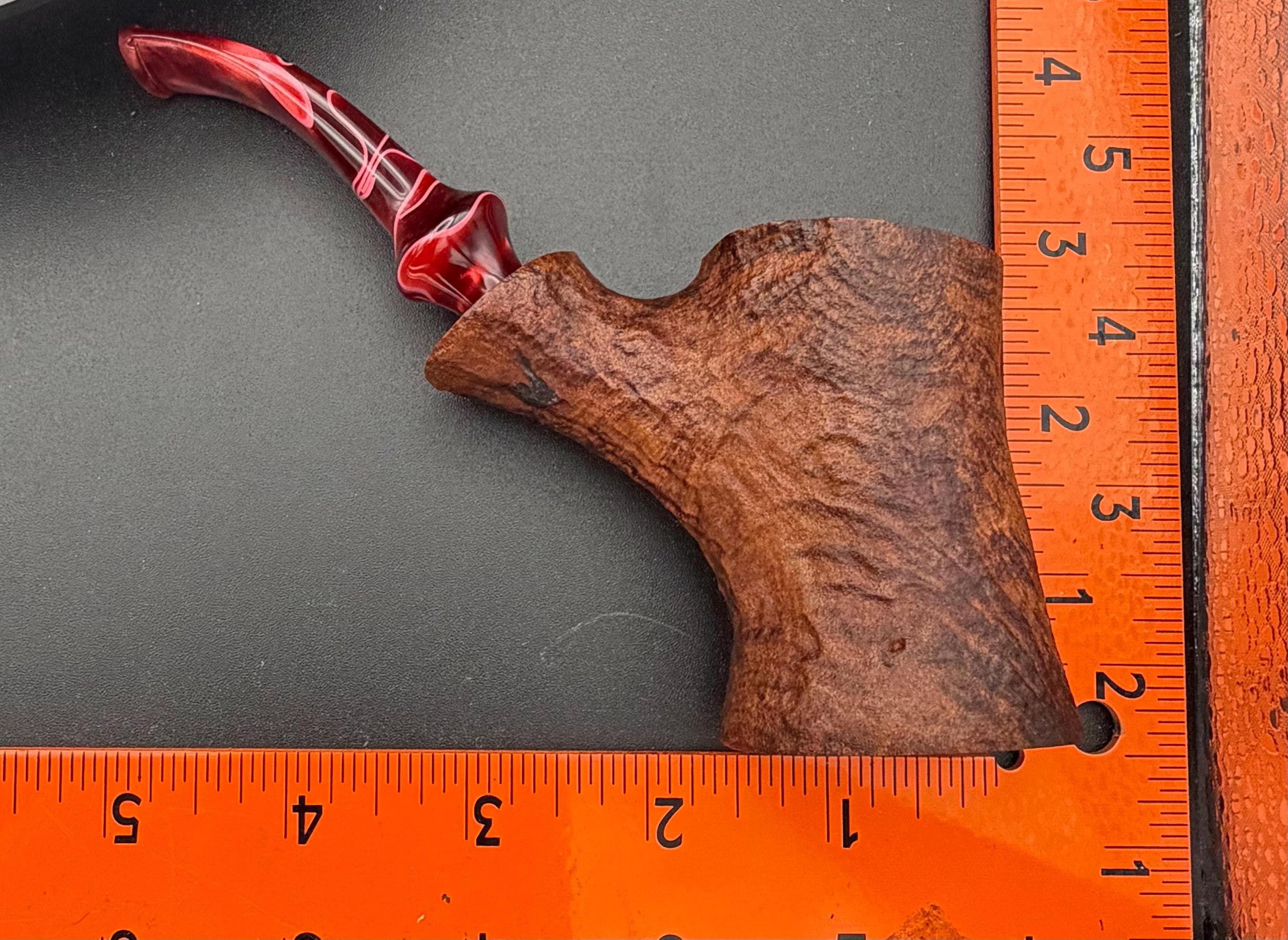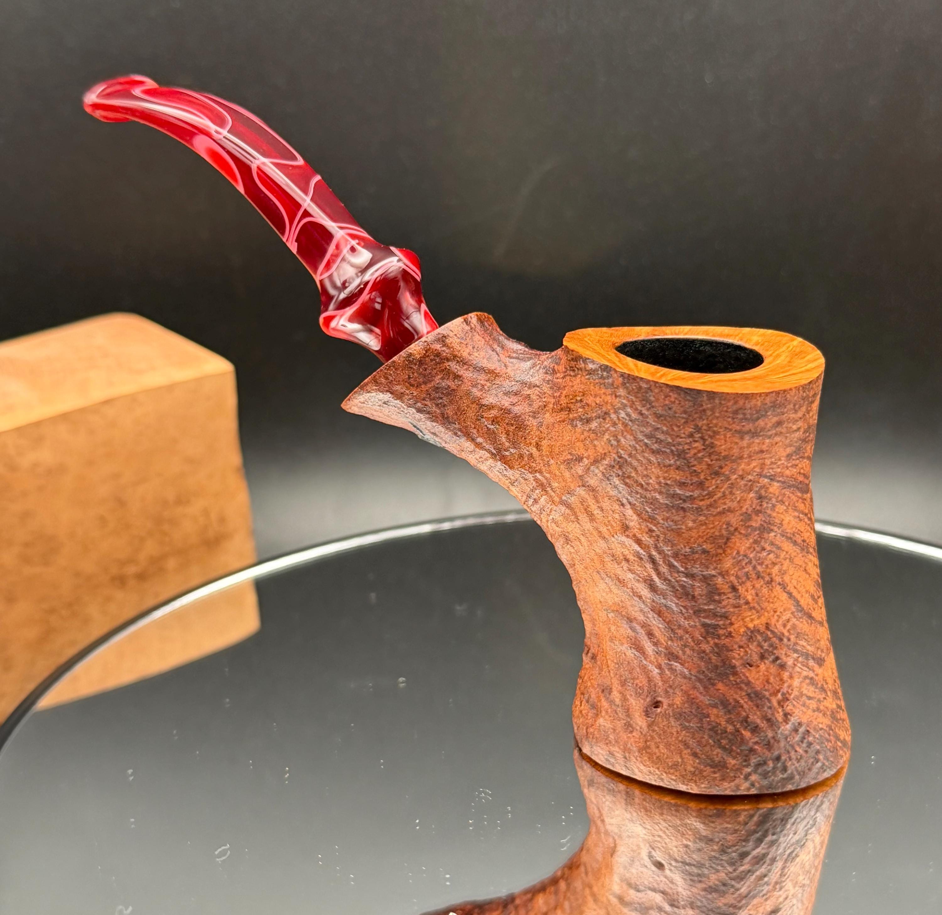 This is a handmade Grecian briar pipe that has been carved and sandblasted by hand for several hours and polished by me here at the shop. Acrylic custom made stem machined and hand filed/polished. Non filtered. A very nice daily smoker. It has a nice sized 7/8”x 2” chamber and has been coated with a carbon starter cake.