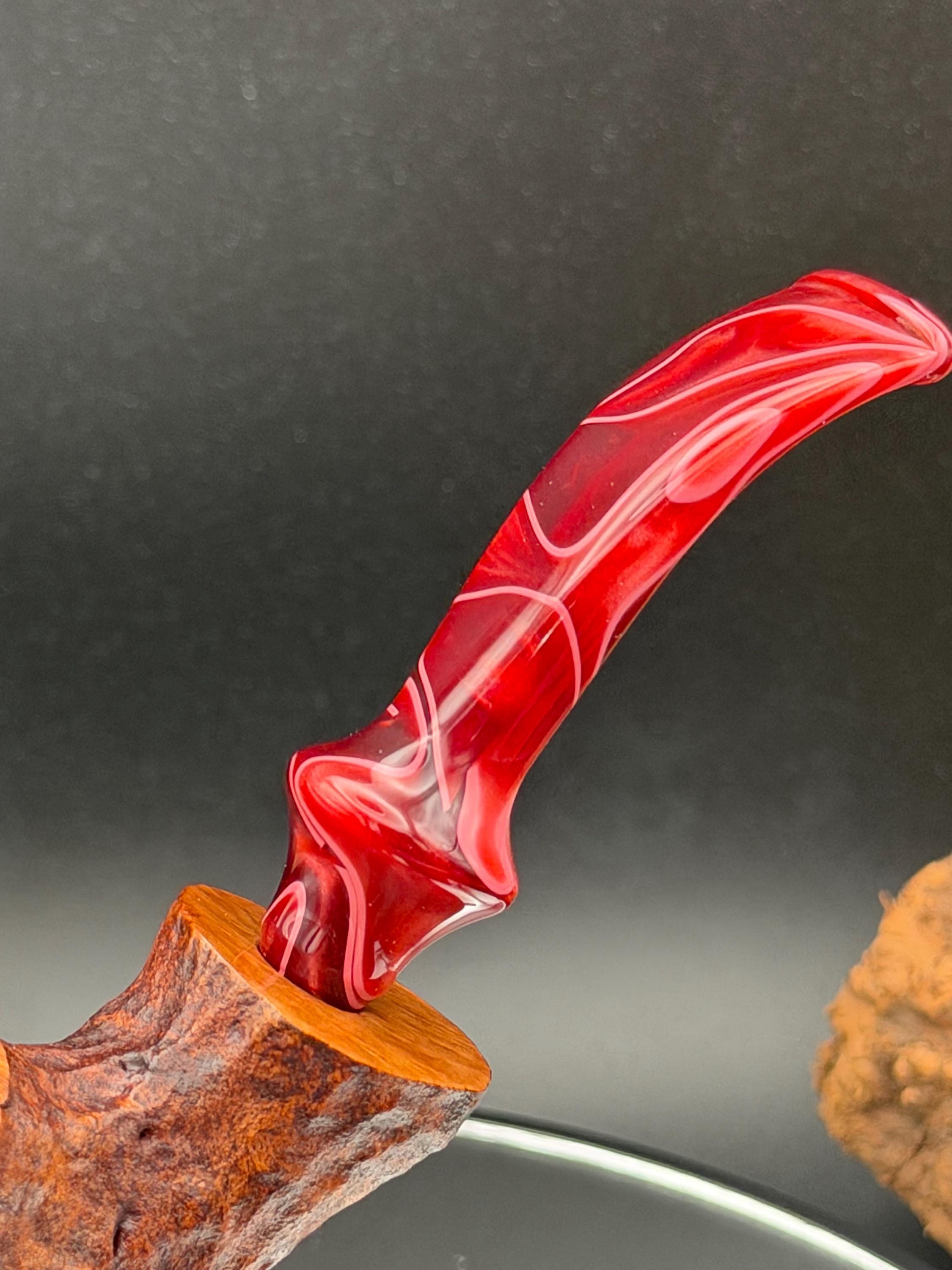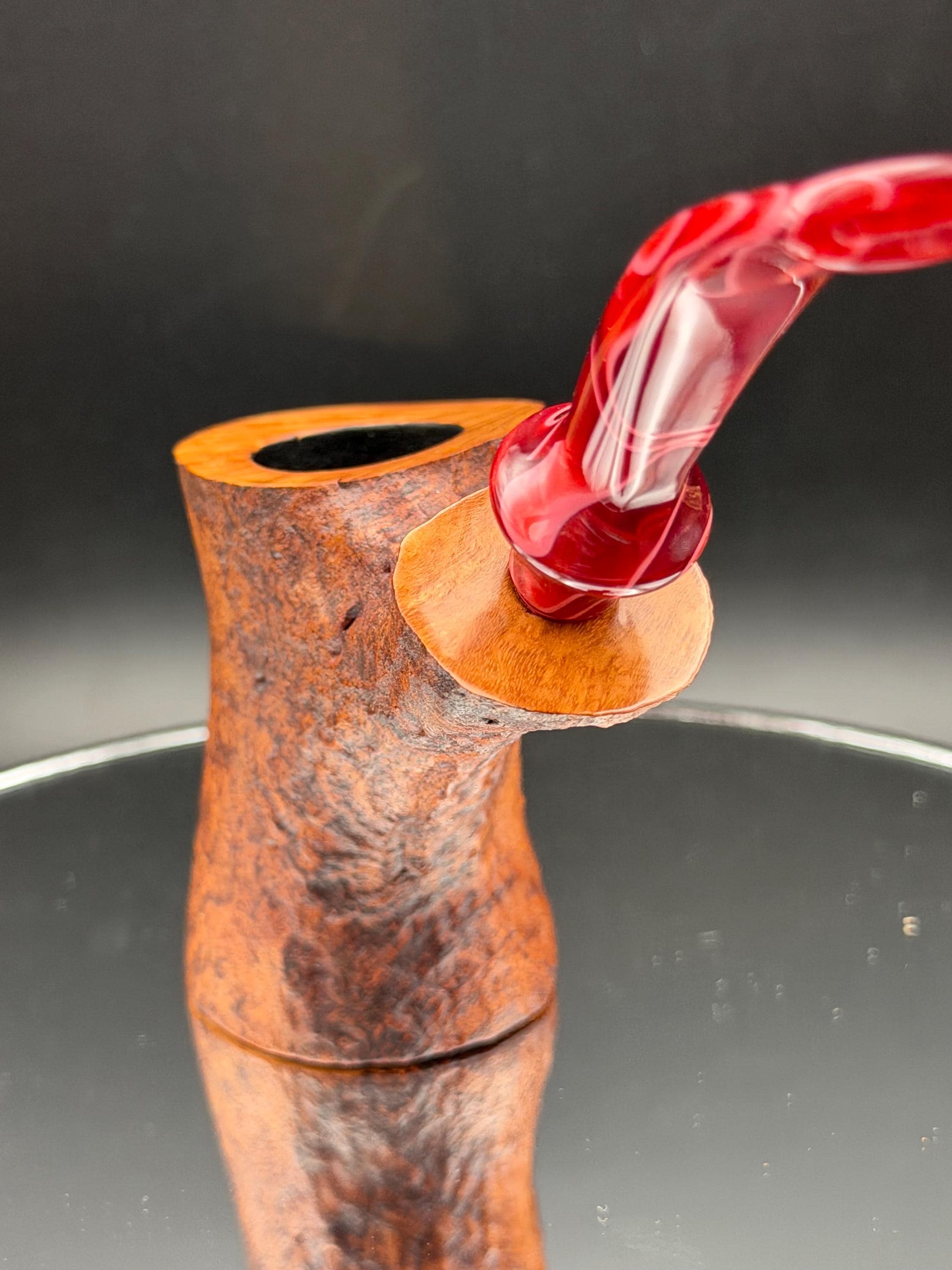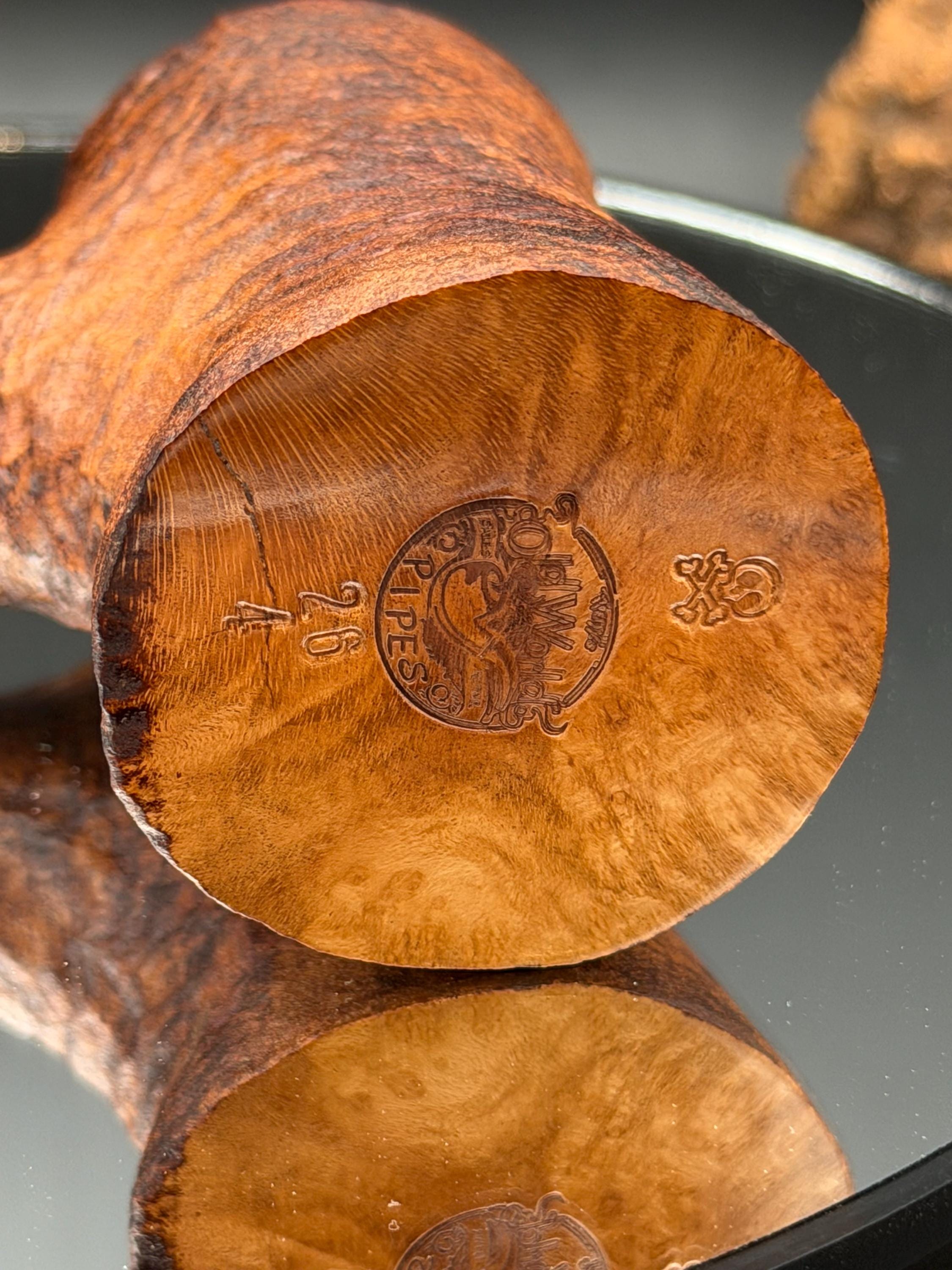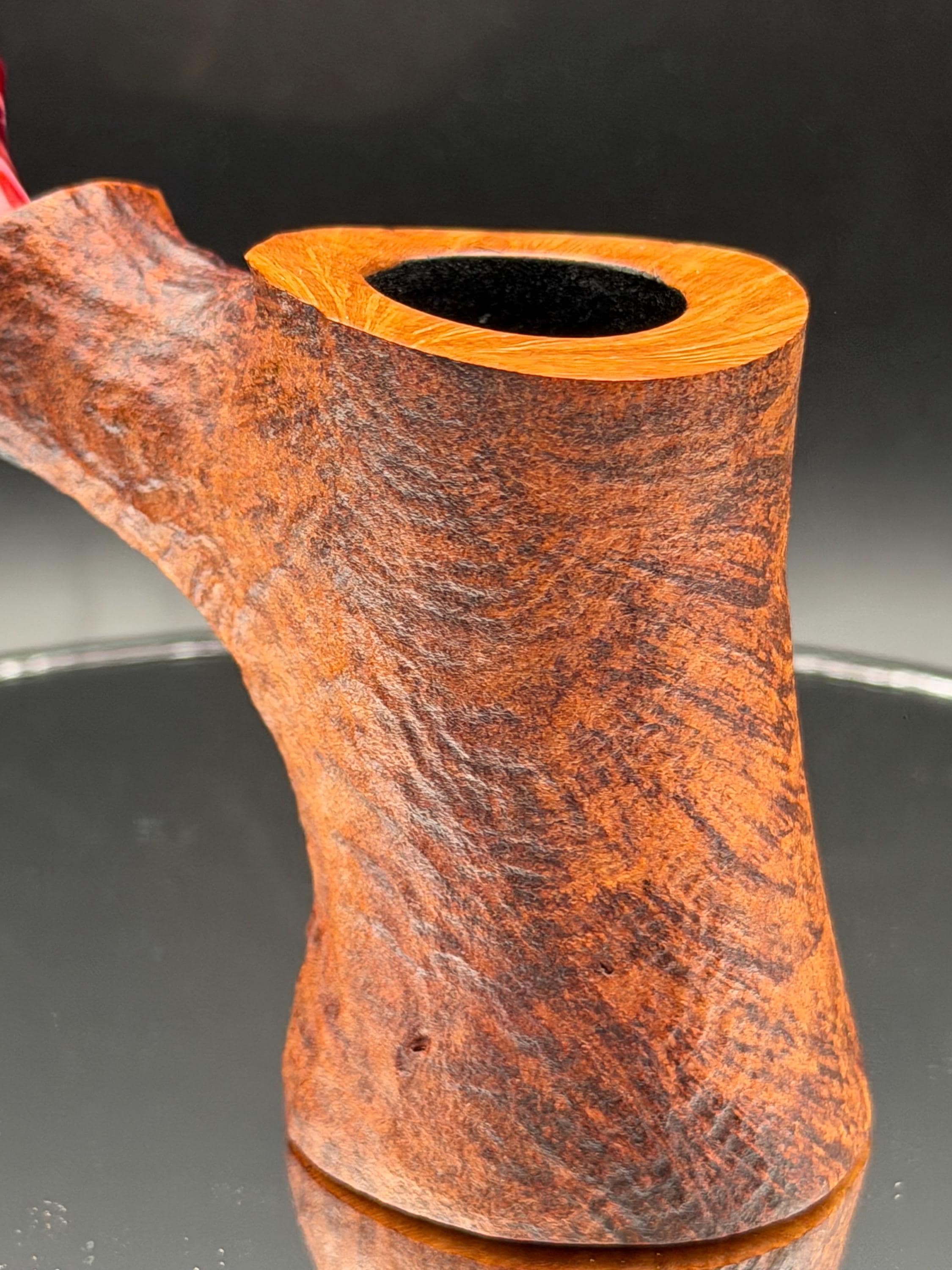 This is a handmade Grecian briar pipe that has been carved and sandblasted by hand for several hours and polished by me here at the shop. Acrylic custom made stem machined and hand filed/polished. Non filtered. A very nice daily smoker. It has a nice sized 7/8”x 2” chamber and has been coated with a carbon starter cake.