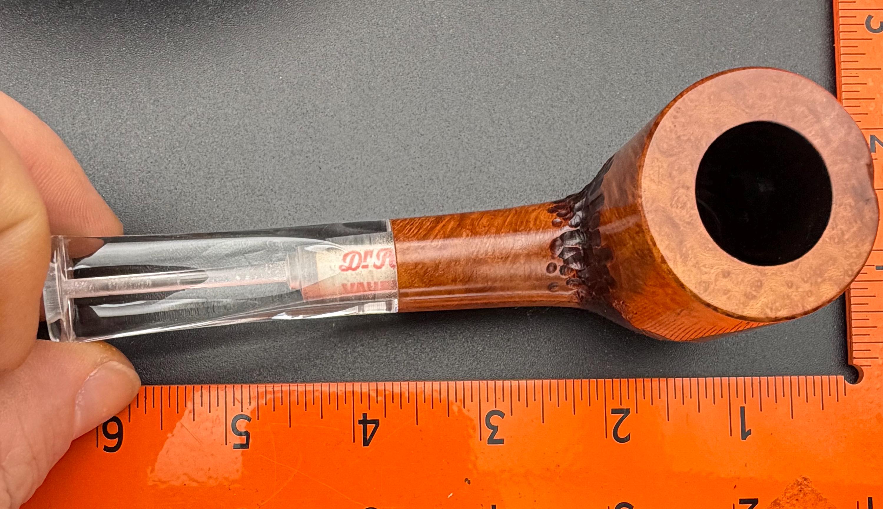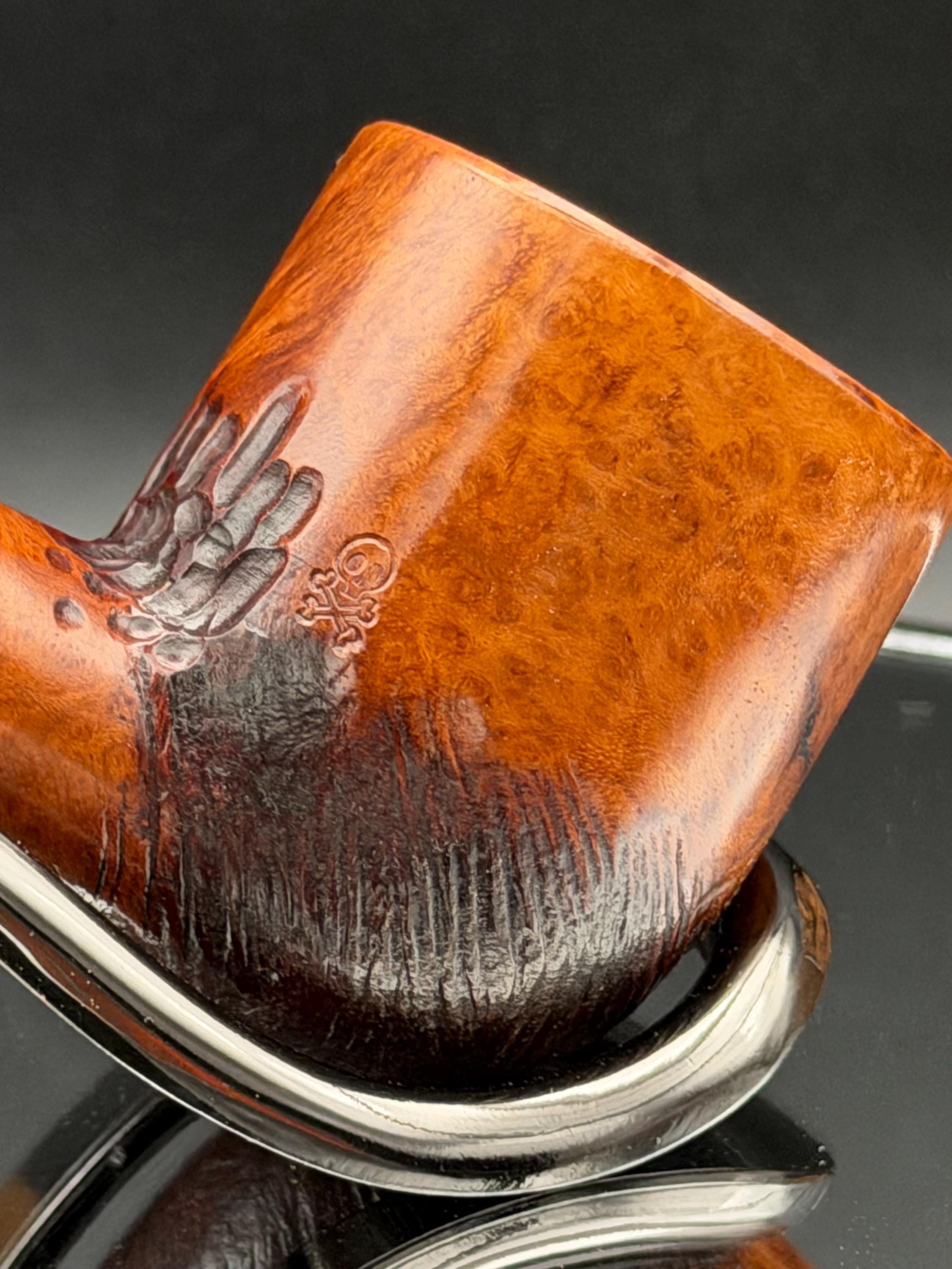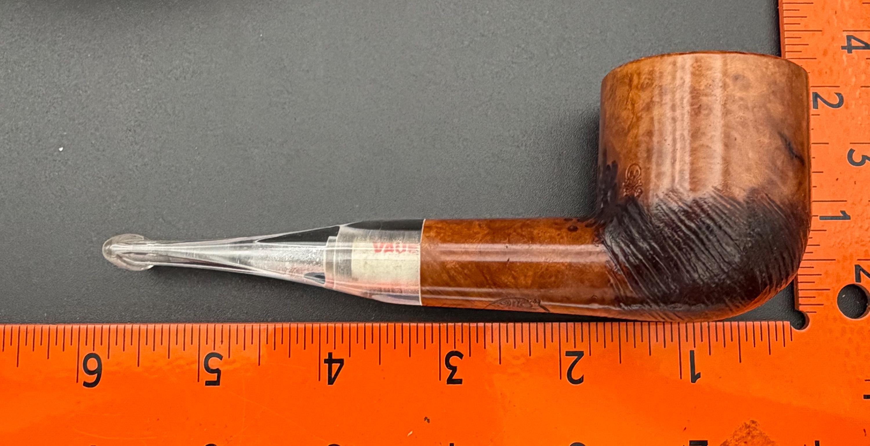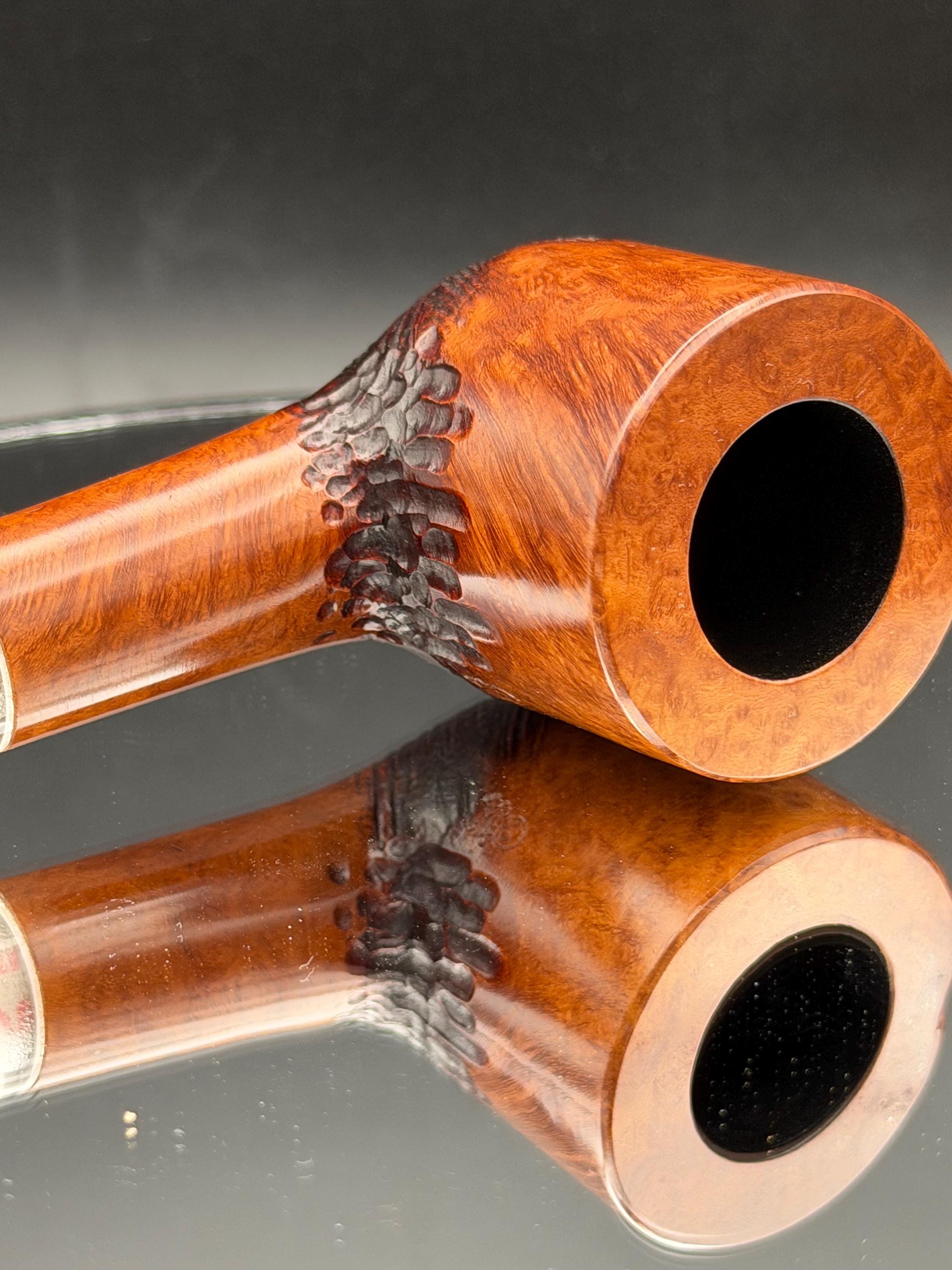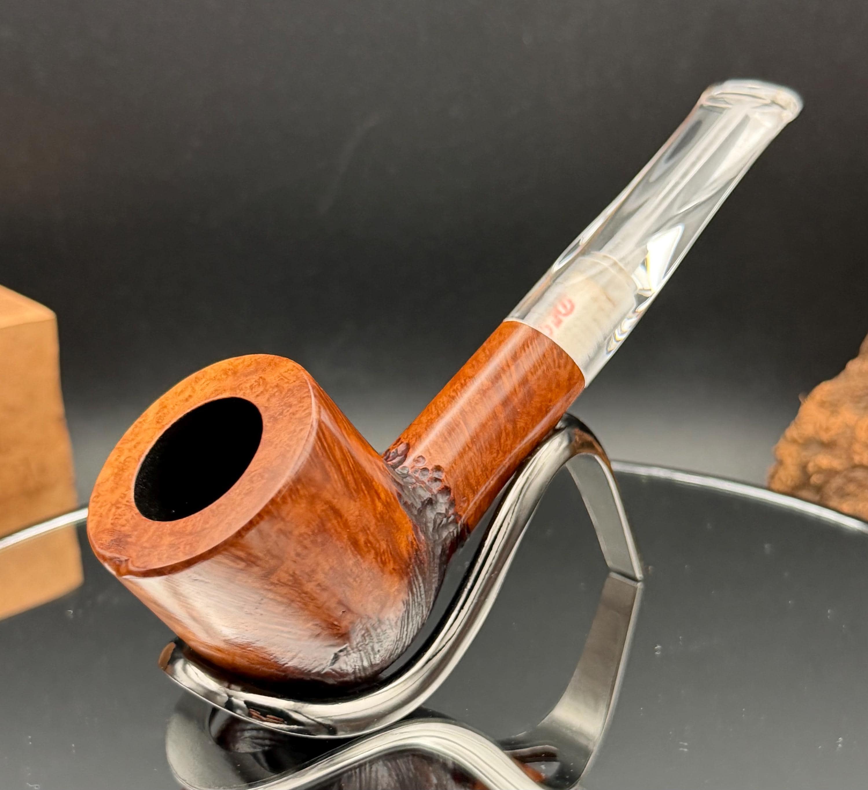 This is a handmade briar pipe that has been carved, rusticated, sanded,oiled, and polished by hand. It has a nice hand formed custom made acrylic stem machined to fit perfectly. This one is 9mm filtered. A very nice daily smoker. Made to look rustic but a little polished. 7/8x1.5 chamber. Uses a 9mm Dr. Pearl Jr filter.