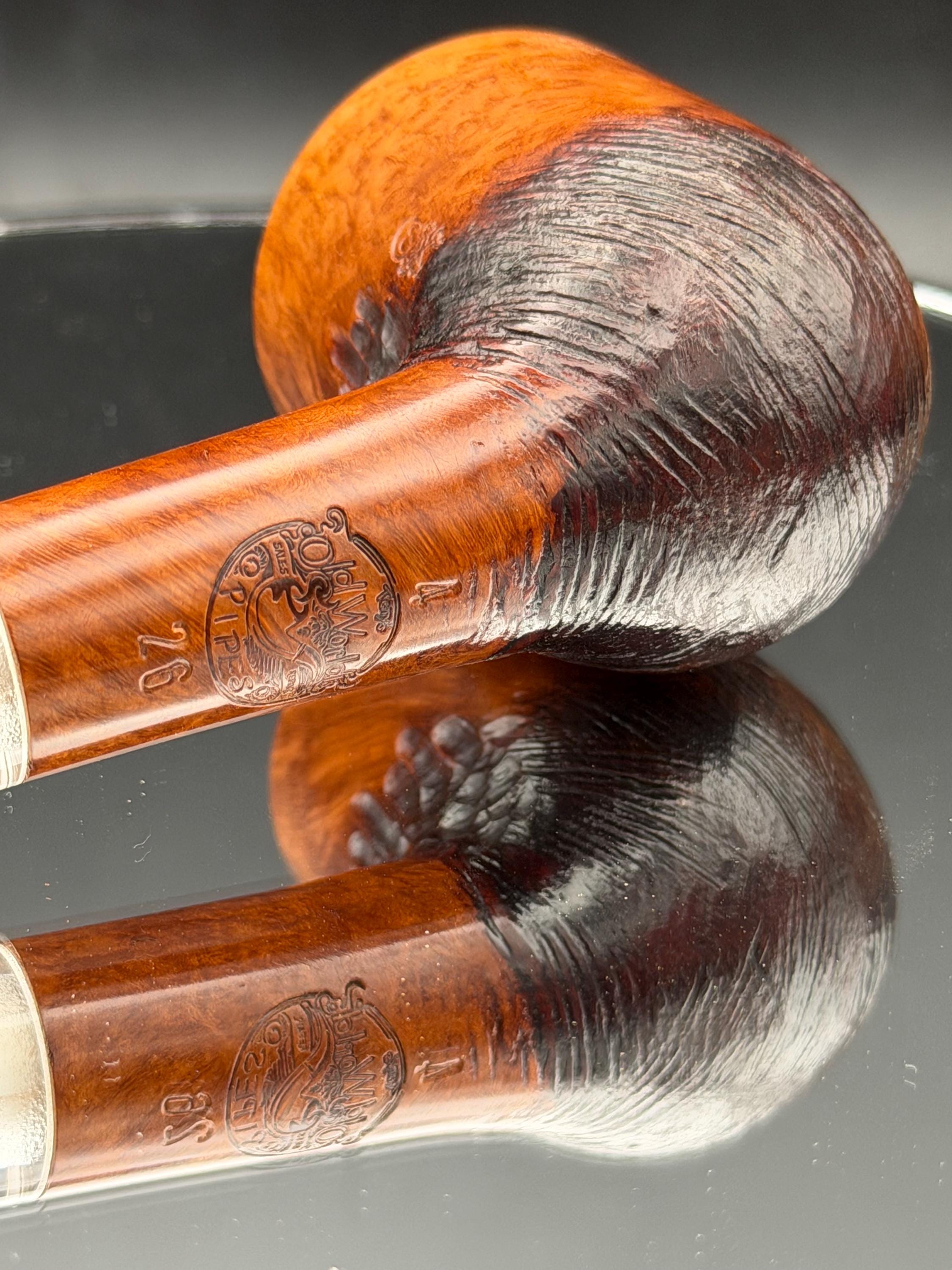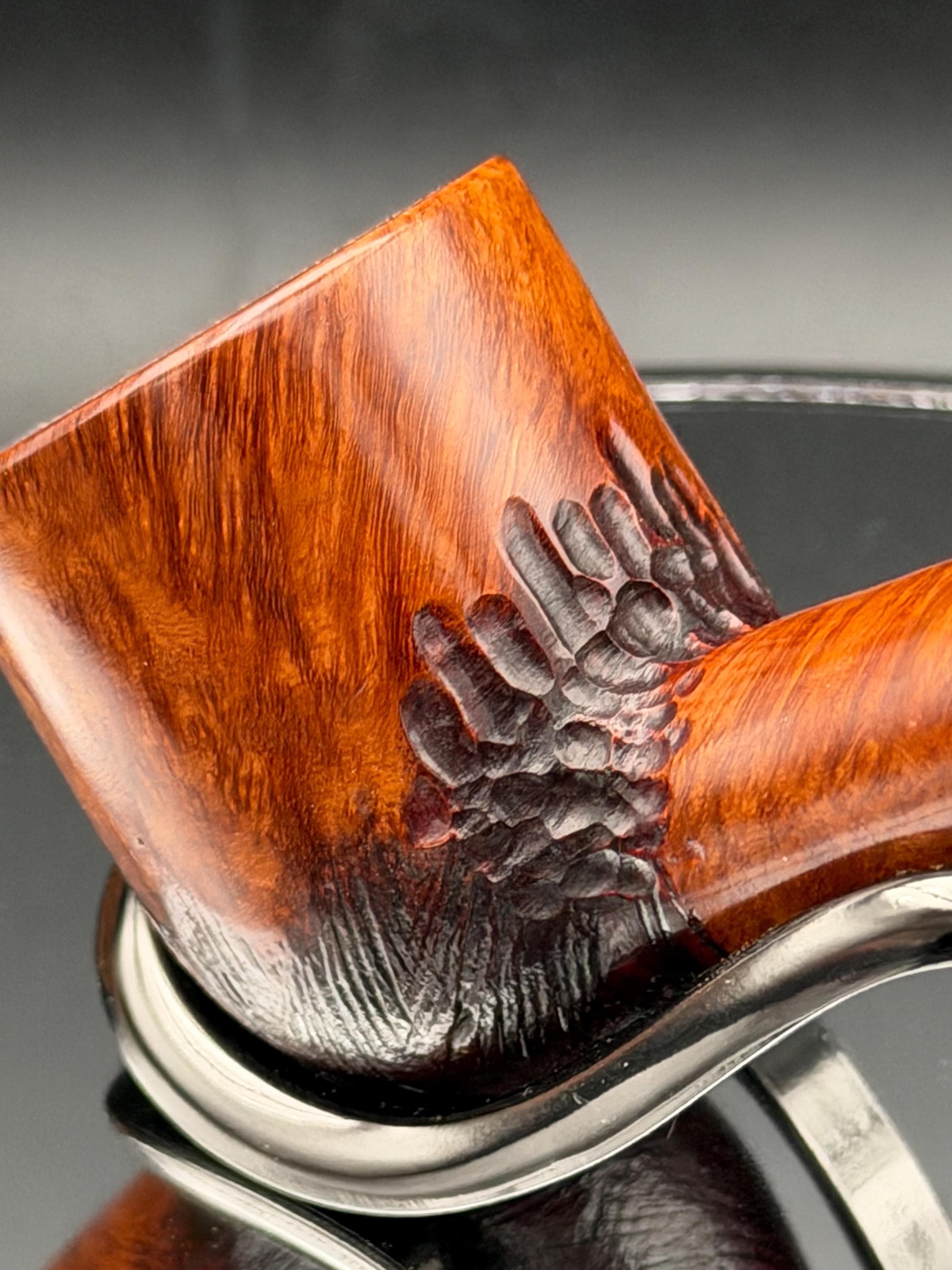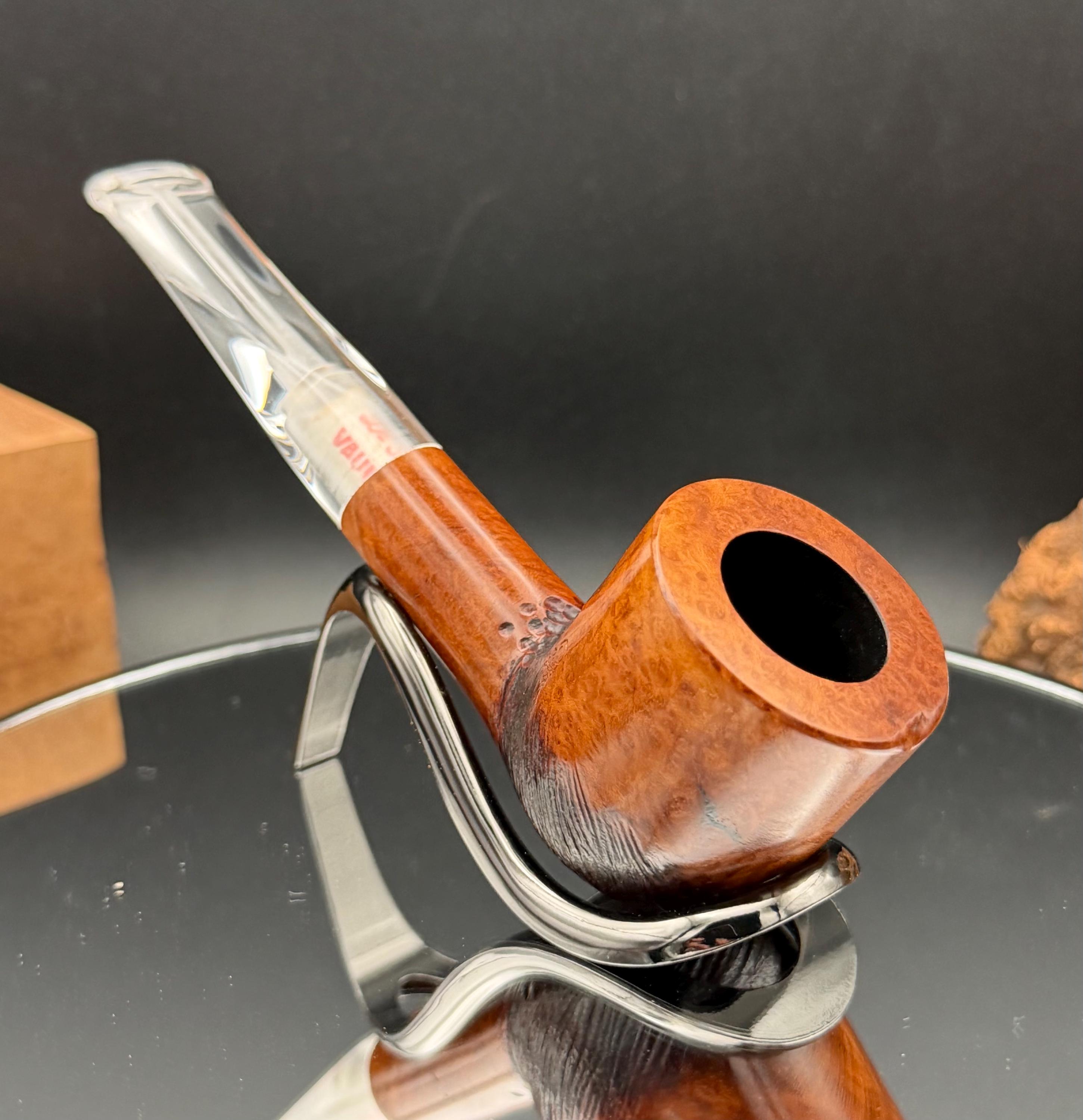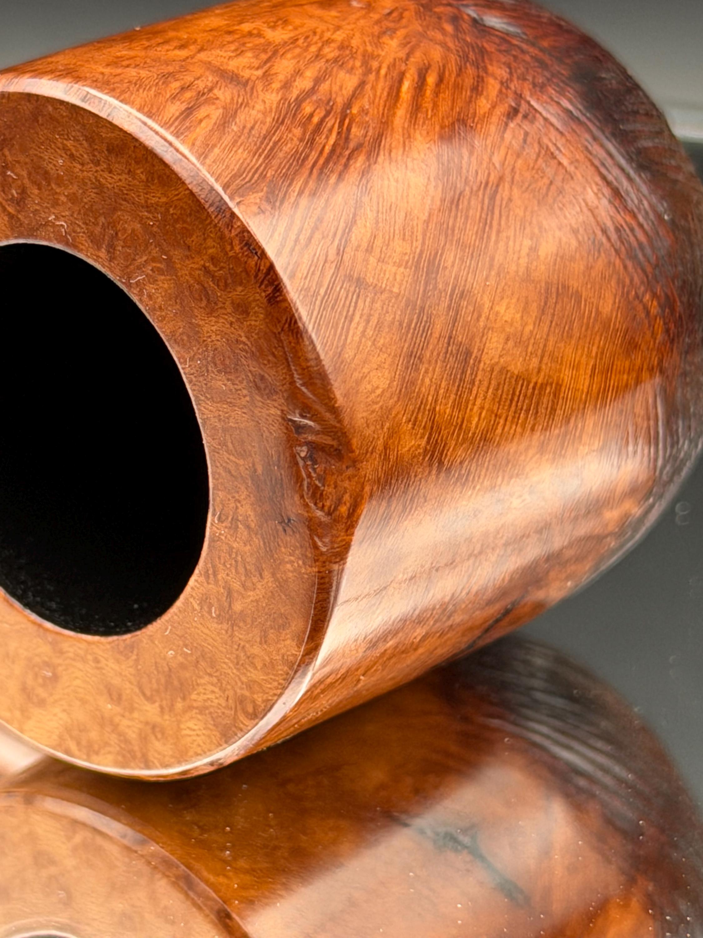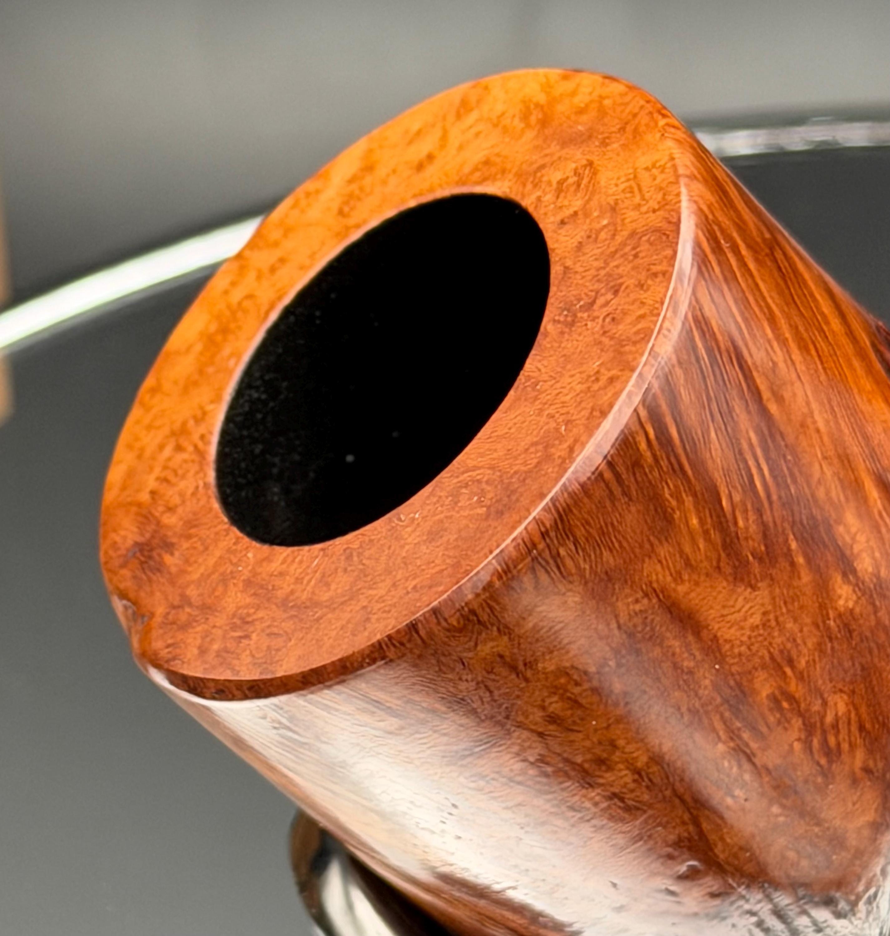 This is a handmade briar pipe that has been carved, rusticated, sanded,oiled, and polished by hand. It has a nice hand formed custom made acrylic stem machined to fit perfectly. This one is 9mm filtered. A very nice daily smoker. Made to look rustic but a little polished. 7/8x1.5 chamber. Uses a 9mm Dr. Pearl Jr filter.