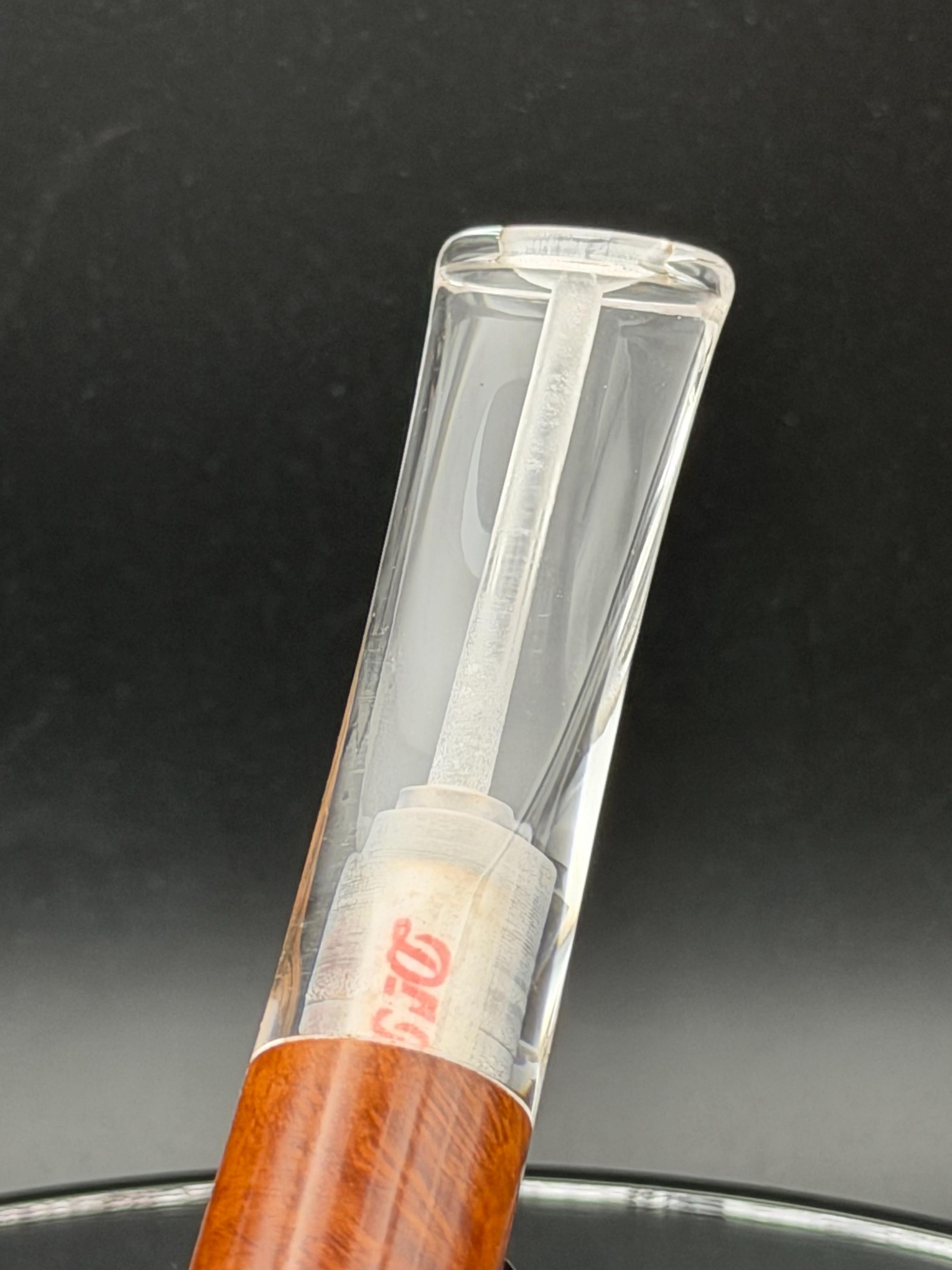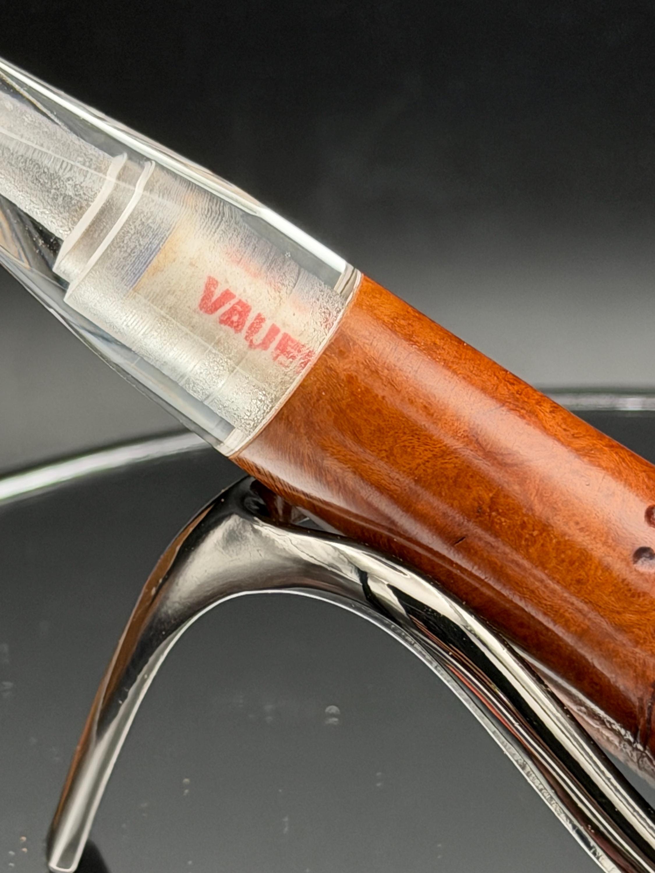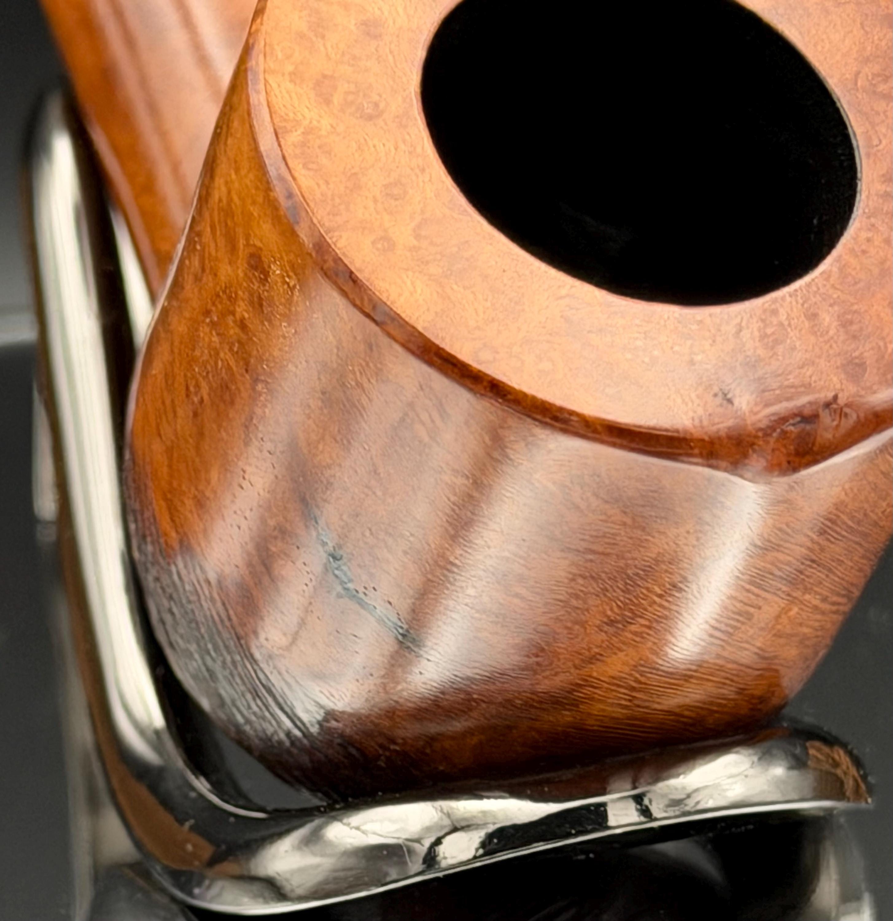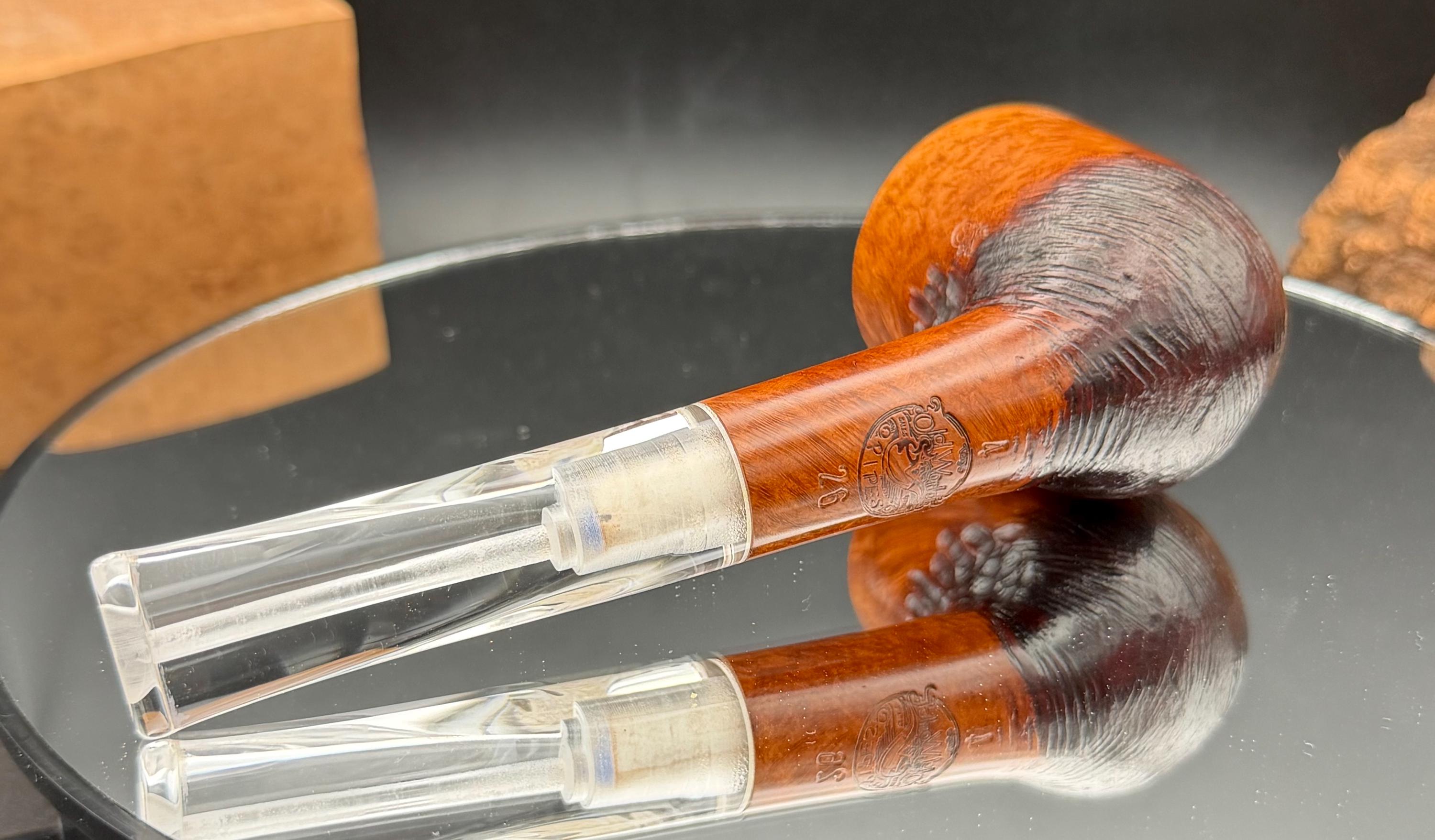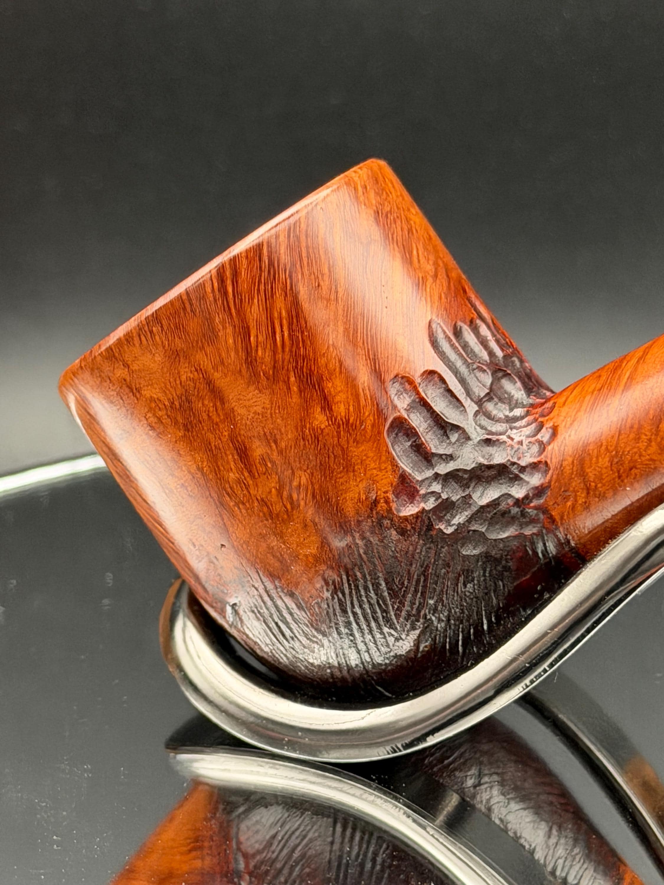 This is a handmade briar pipe that has been carved, rusticated, sanded,oiled, and polished by hand. It has a nice hand formed custom made acrylic stem machined to fit perfectly. This one is 9mm filtered. A very nice daily smoker. Made to look rustic but a little polished. 7/8x1.5 chamber. Uses a 9mm Dr. Pearl Jr filter.