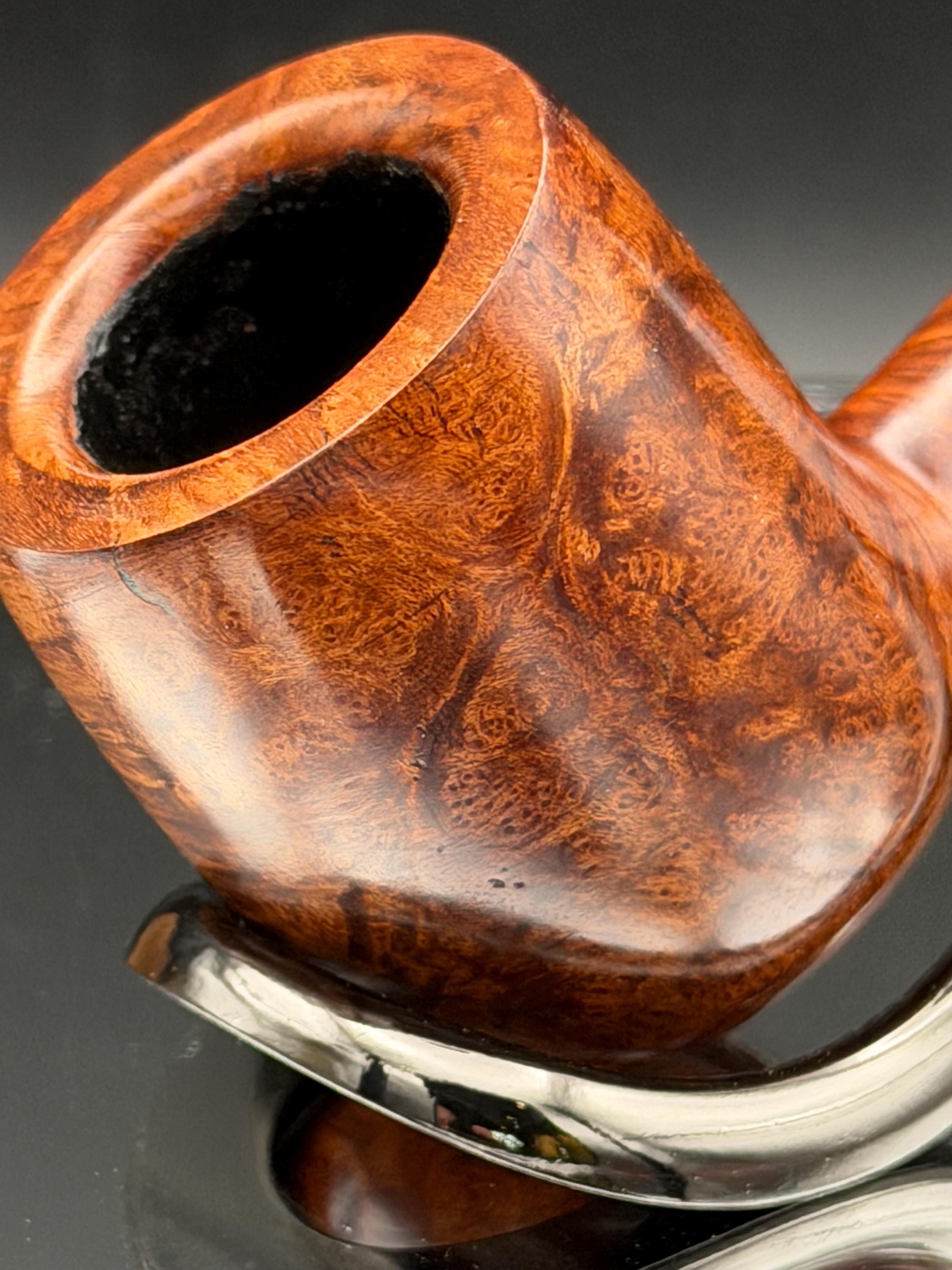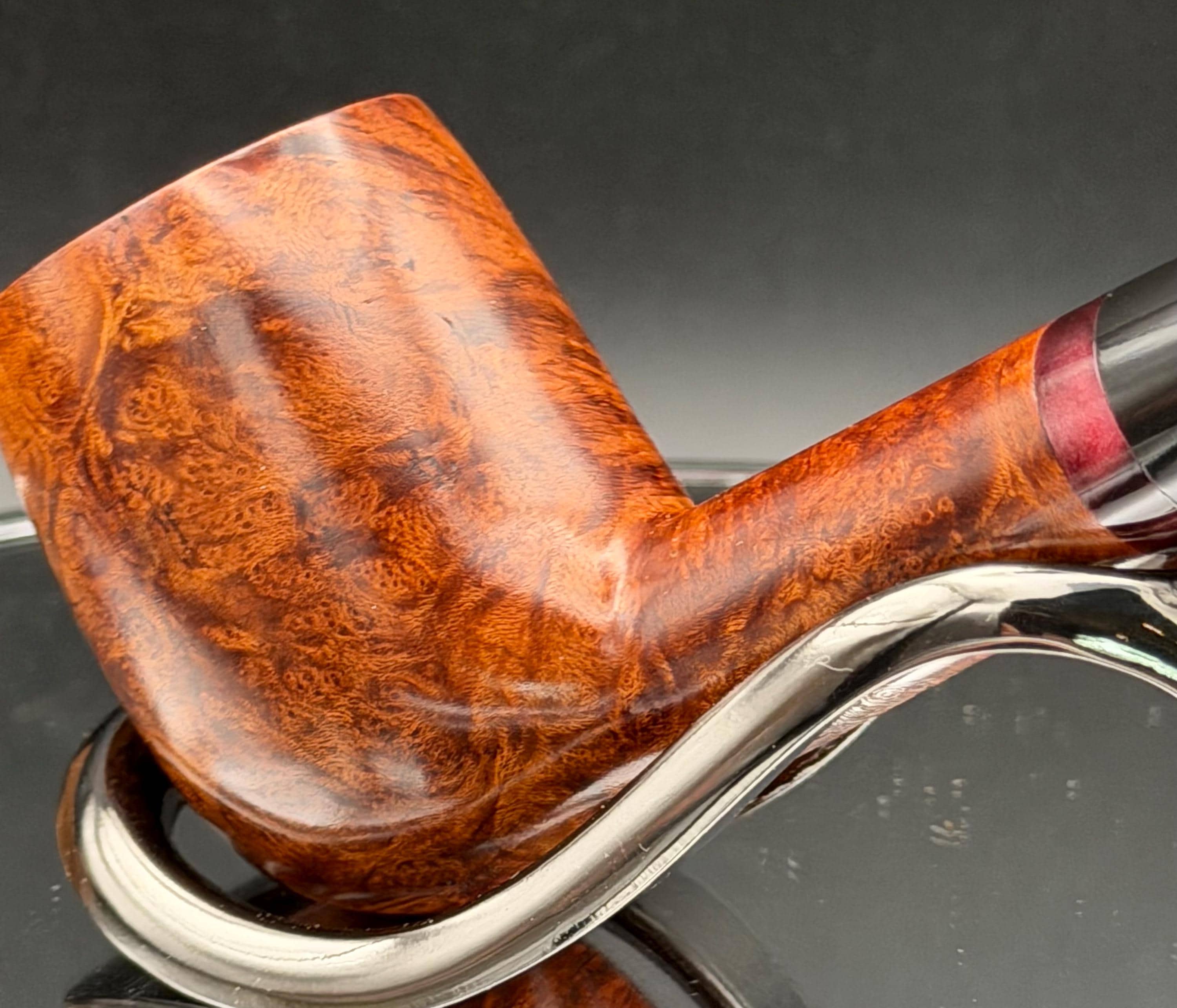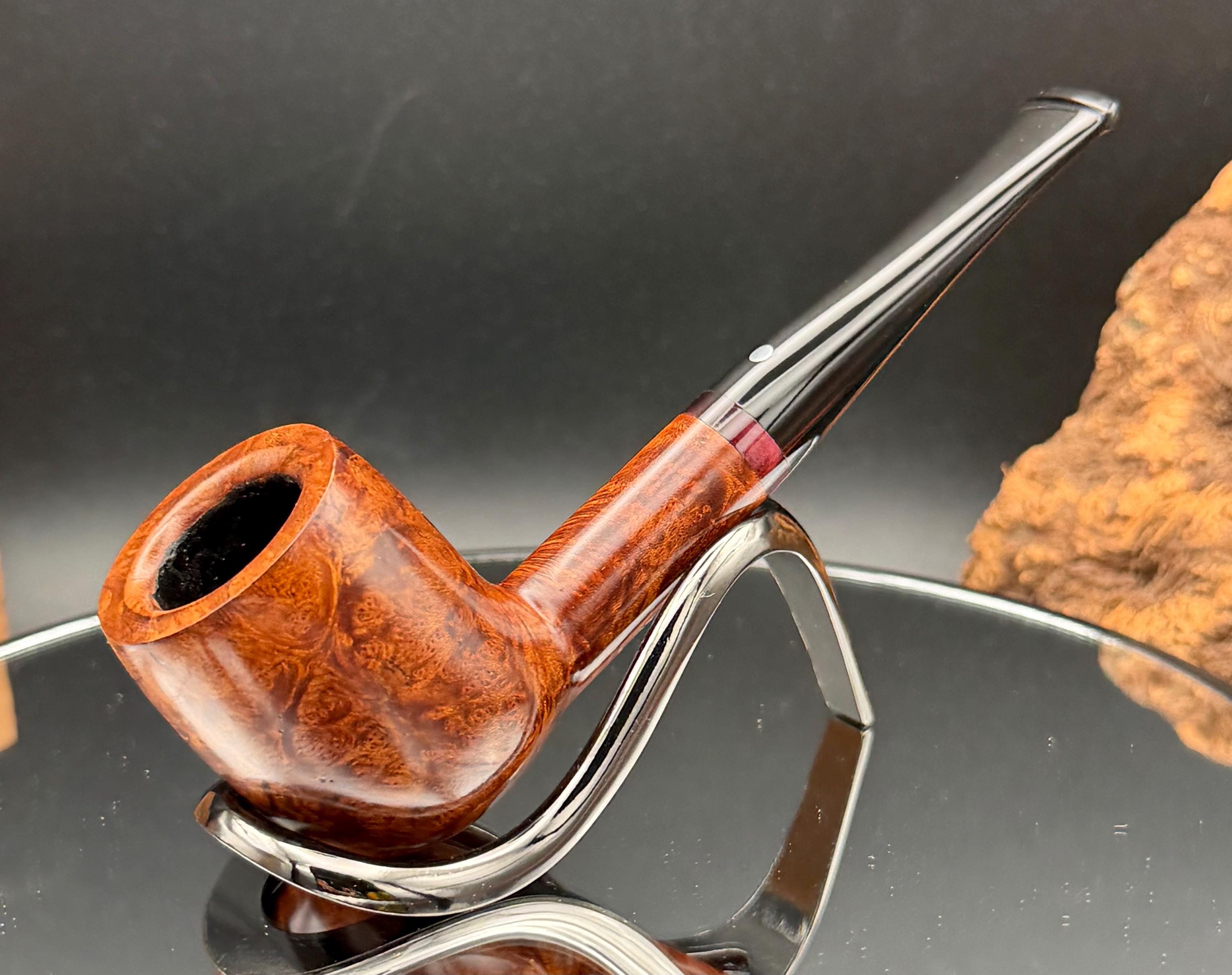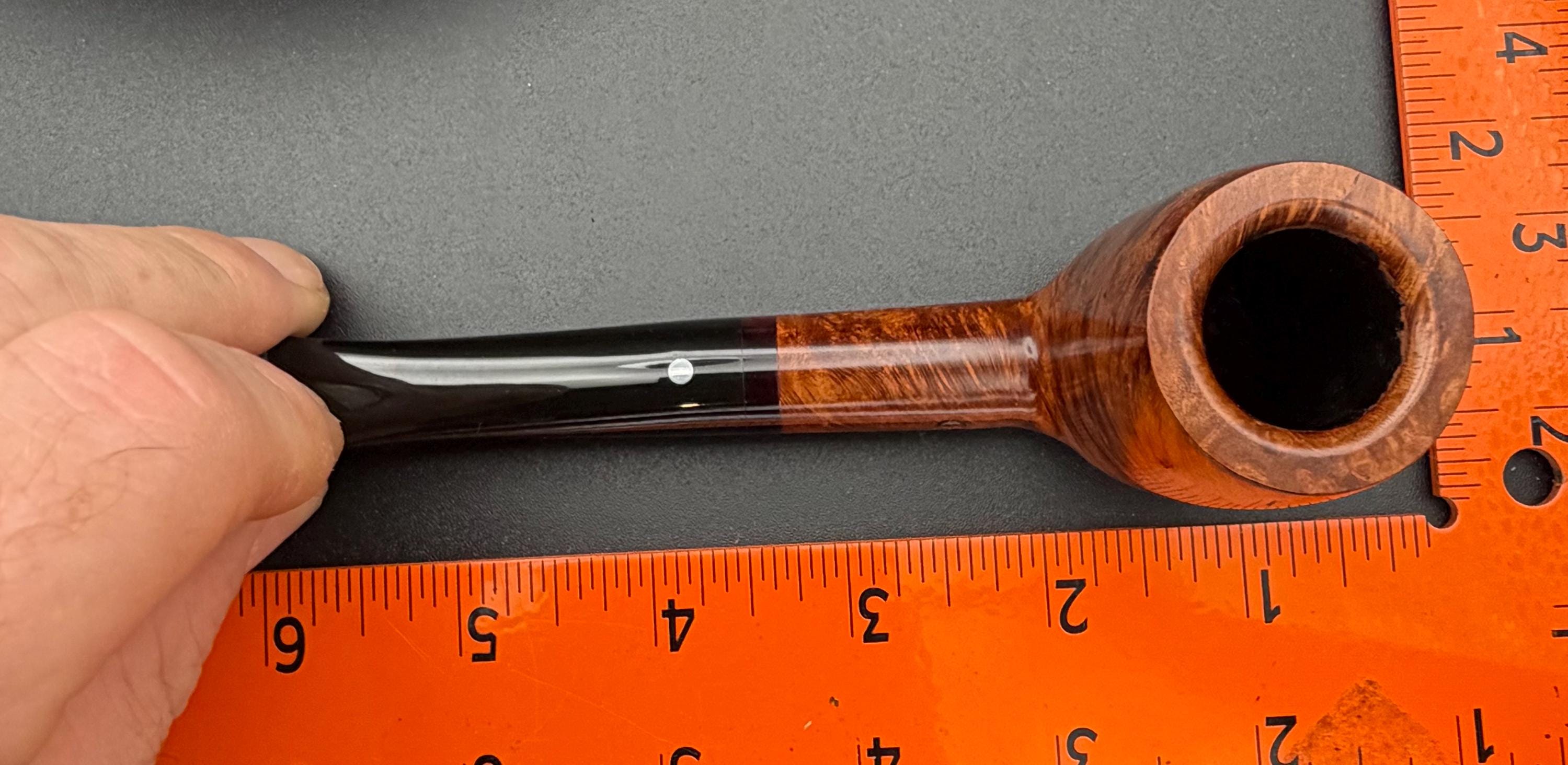 This is a handmade briar pipe that has been carved and hand sanded . A nice polished acrylic ring was machined to fit the shank perfectly. A beautiful custom made vulcanite stem was formed by hand and machined to fit perfectly . Non filtered. A very nice daily smoker. 7/8”x1.25” bowl and has a carbon coating applied