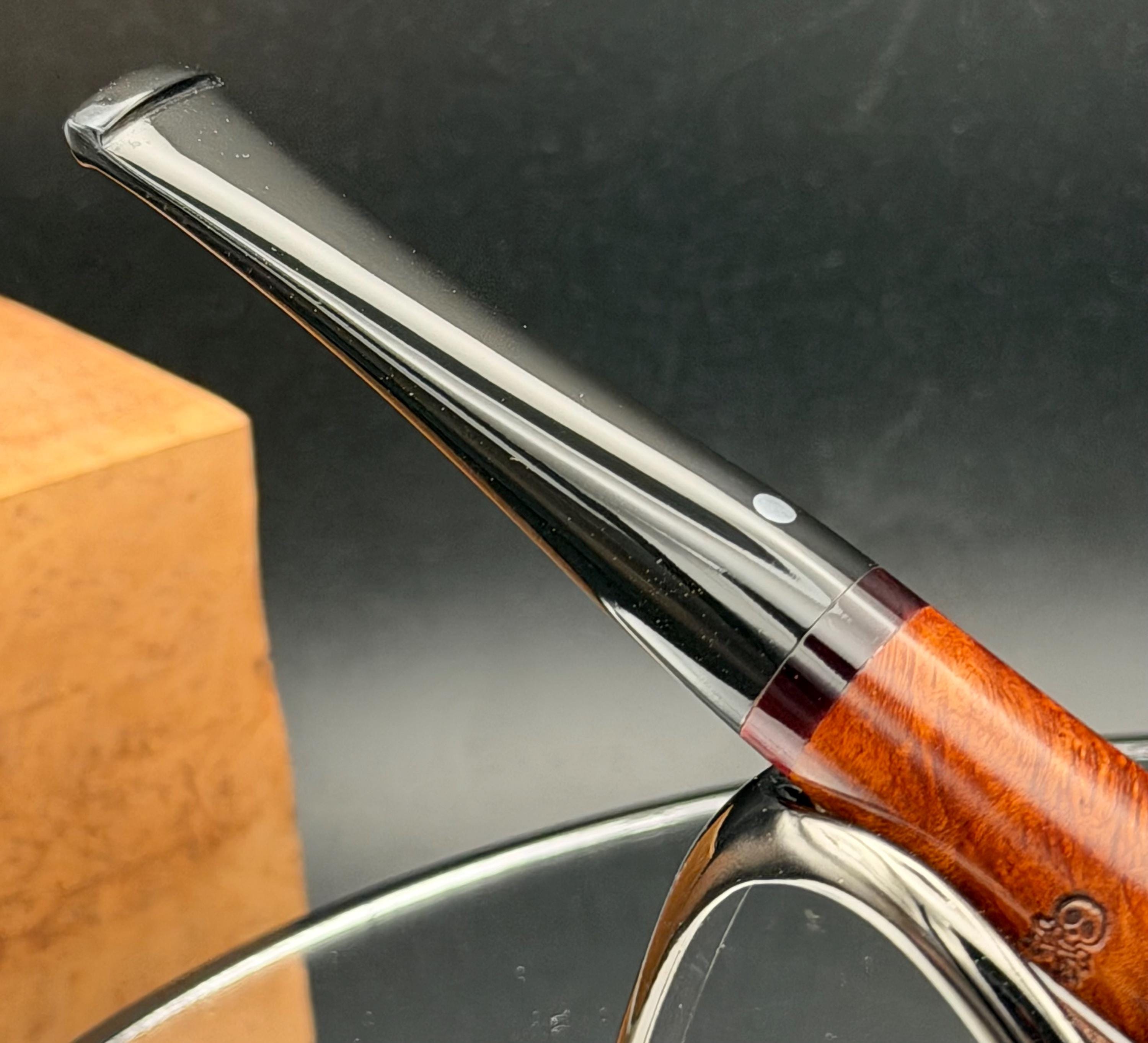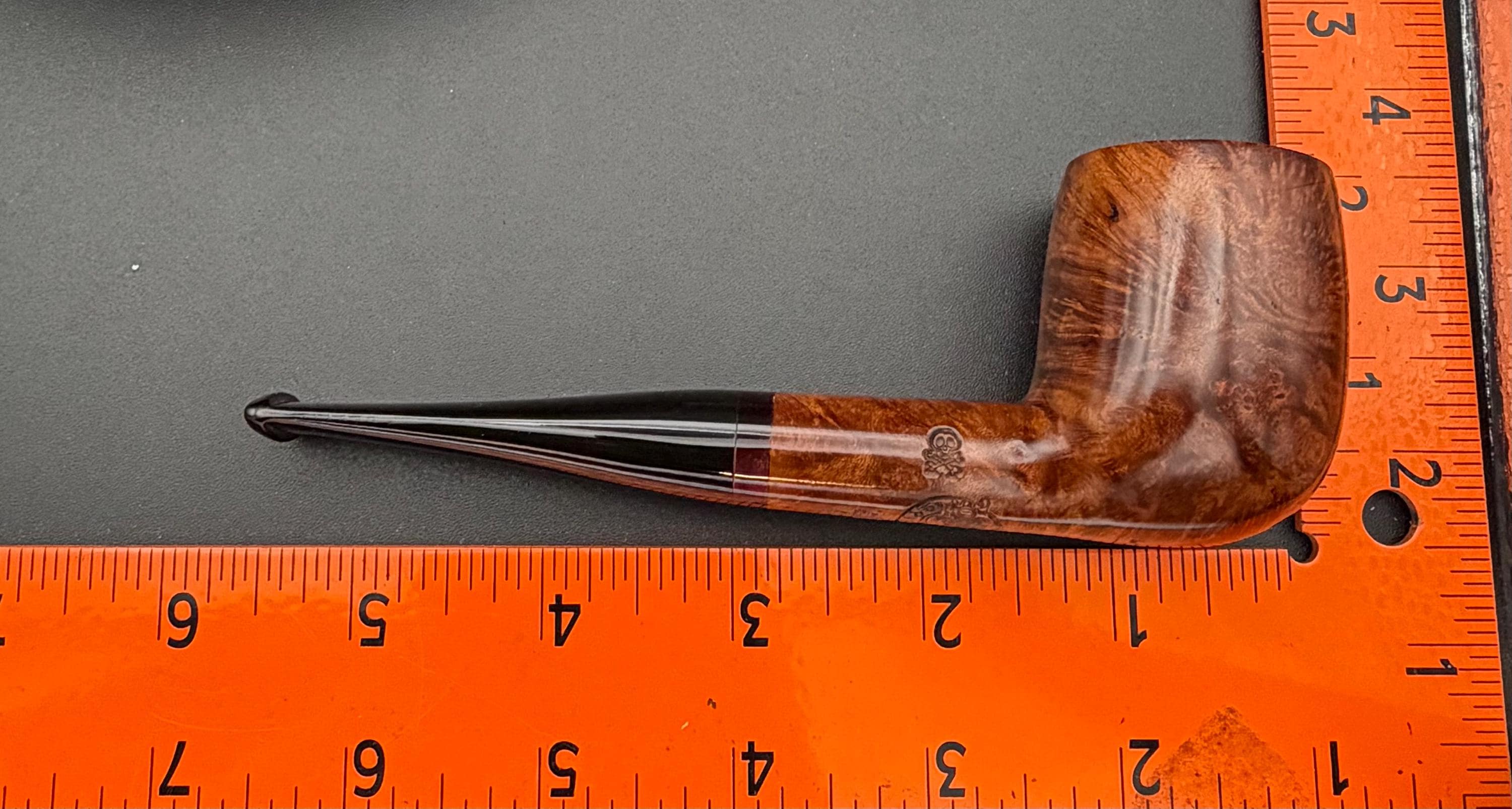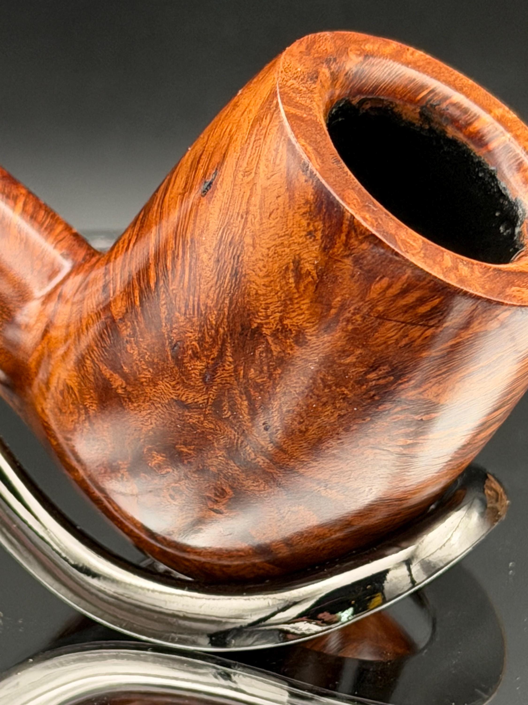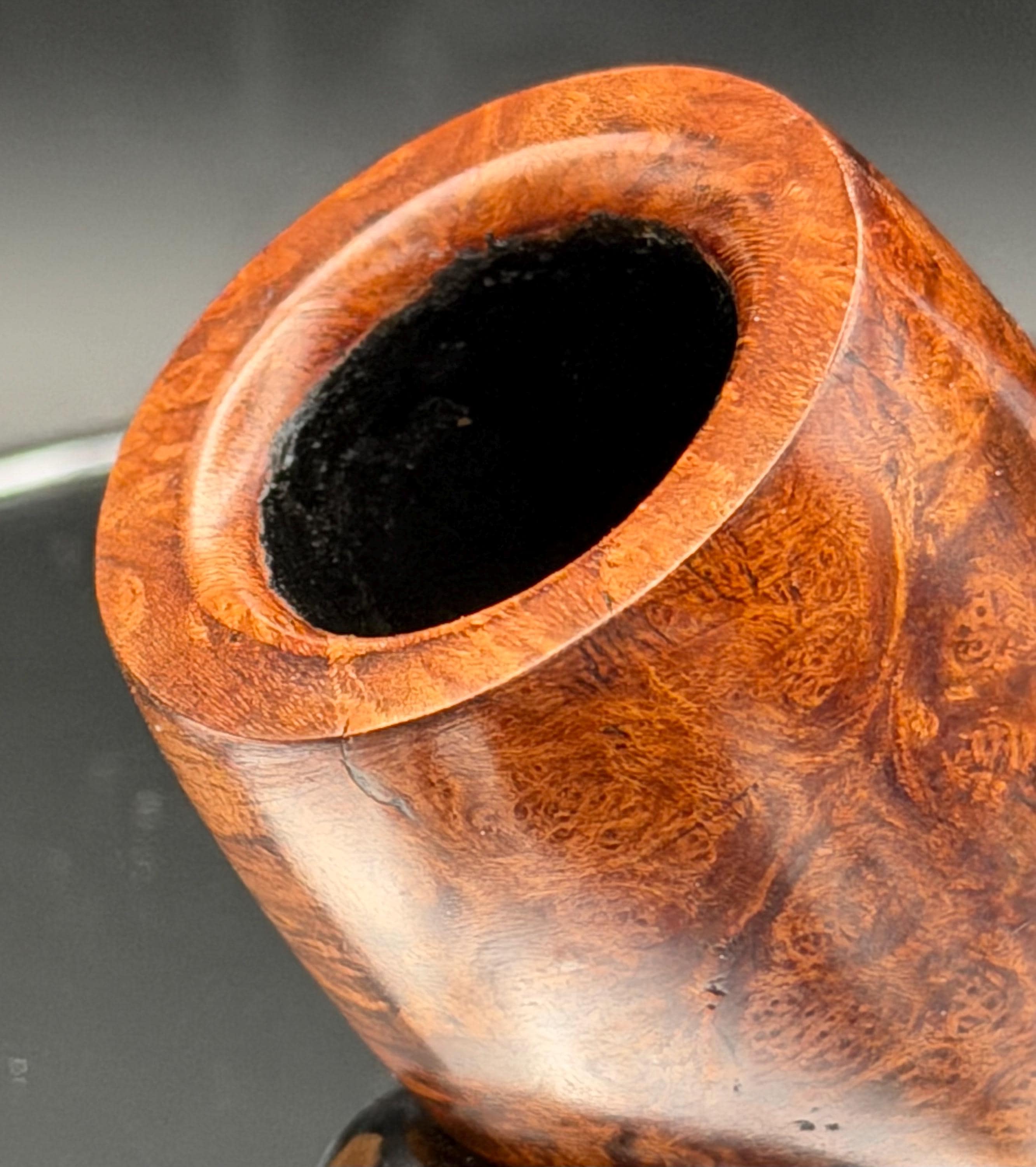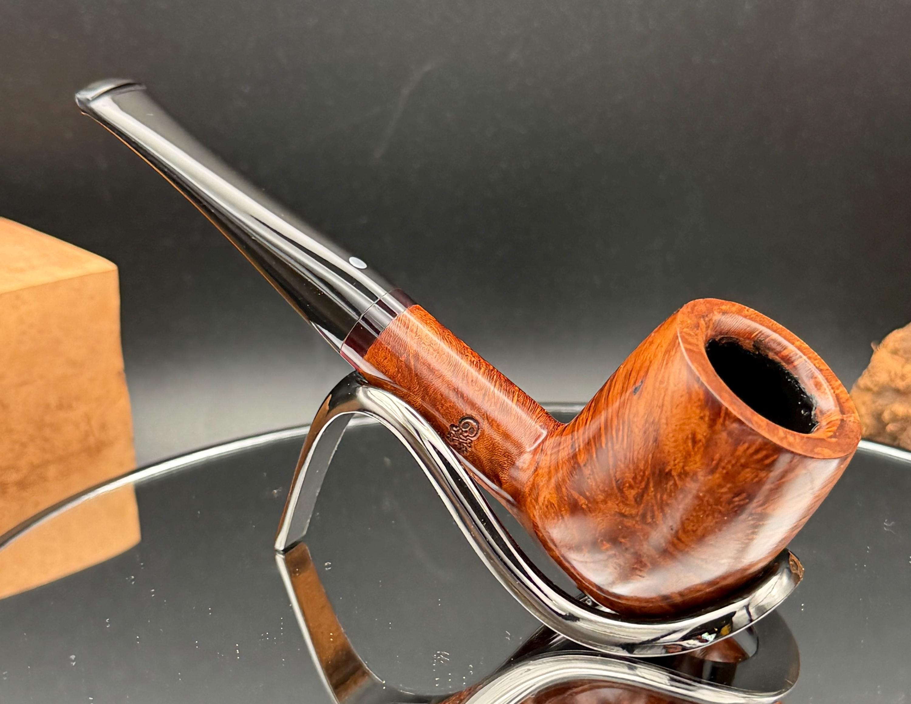 This is a handmade briar pipe that has been carved and hand sanded . A nice polished acrylic ring was machined to fit the shank perfectly. A beautiful custom made vulcanite stem was formed by hand and machined to fit perfectly . Non filtered. A very nice daily smoker. 7/8”x1.25” bowl and has a carbon coating applied