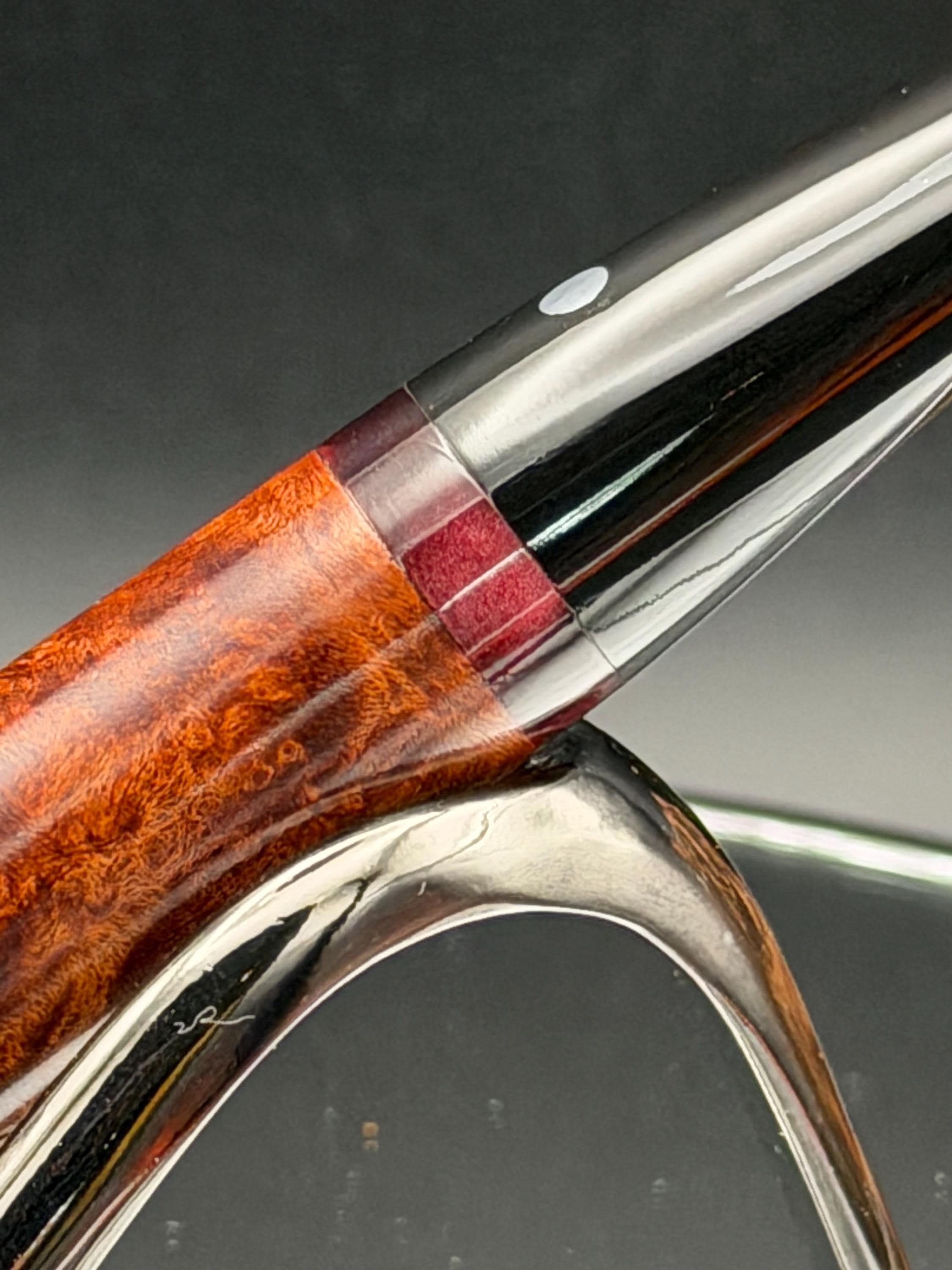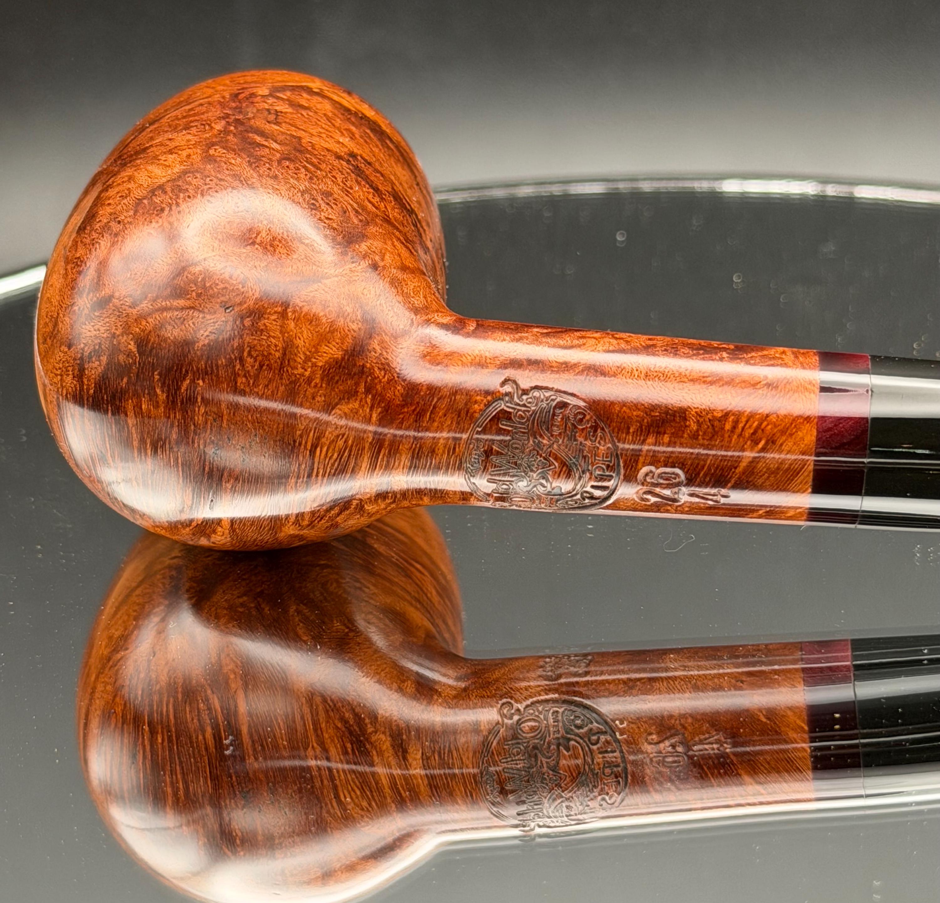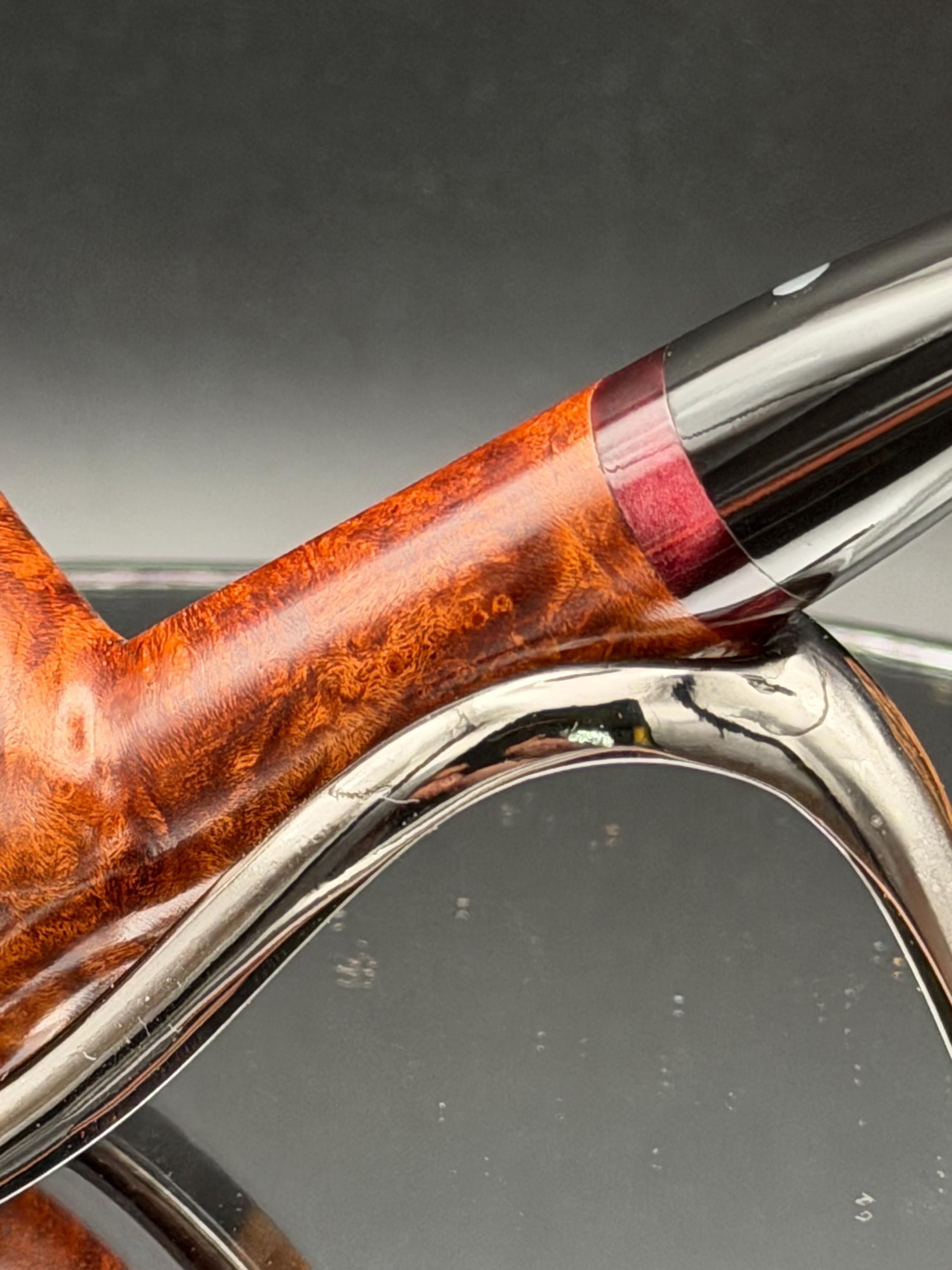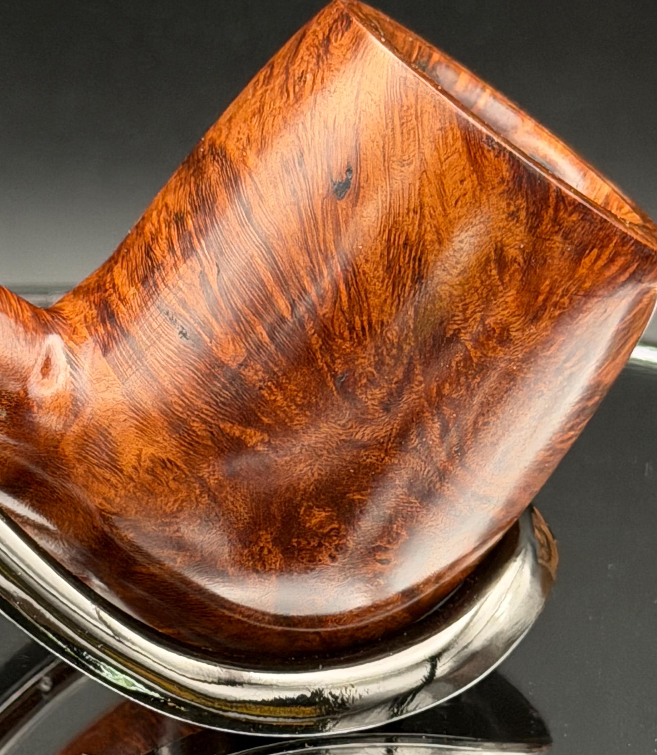 This is a handmade briar pipe that has been carved and hand sanded . A nice polished acrylic ring was machined to fit the shank perfectly. A beautiful custom made vulcanite stem was formed by hand and machined to fit perfectly . Non filtered. A very nice daily smoker. 7/8”x1.25” bowl and has a carbon coating applied