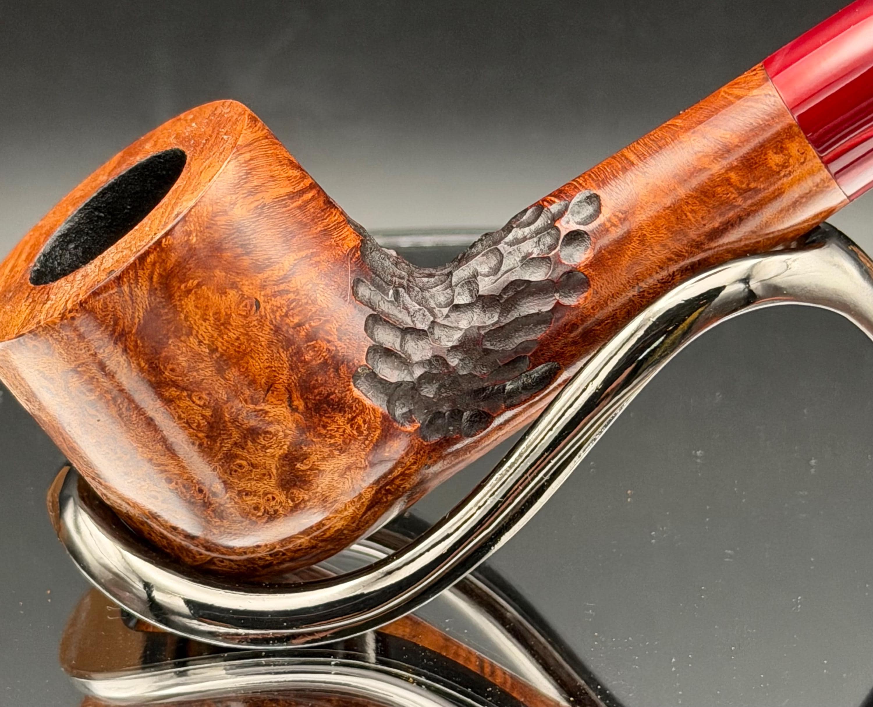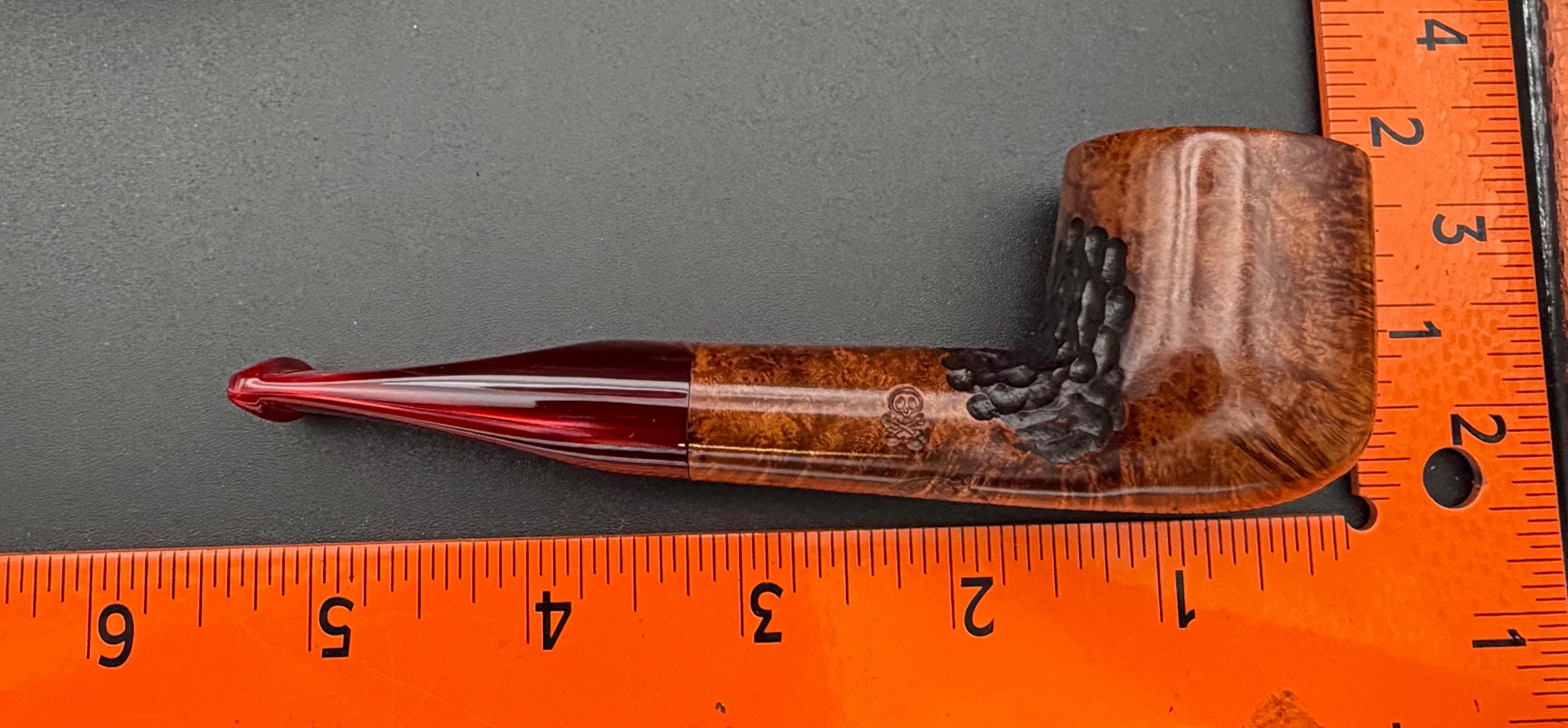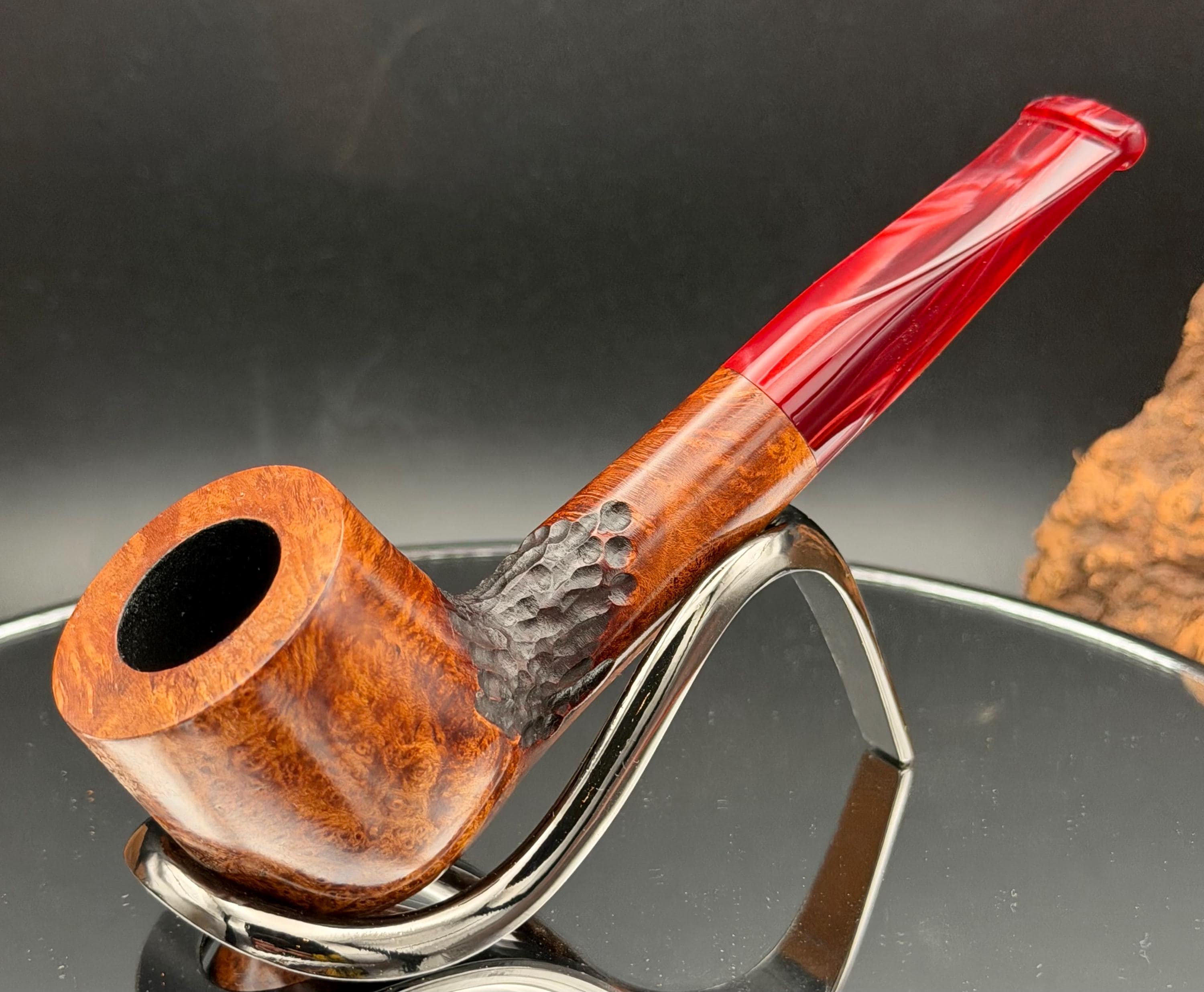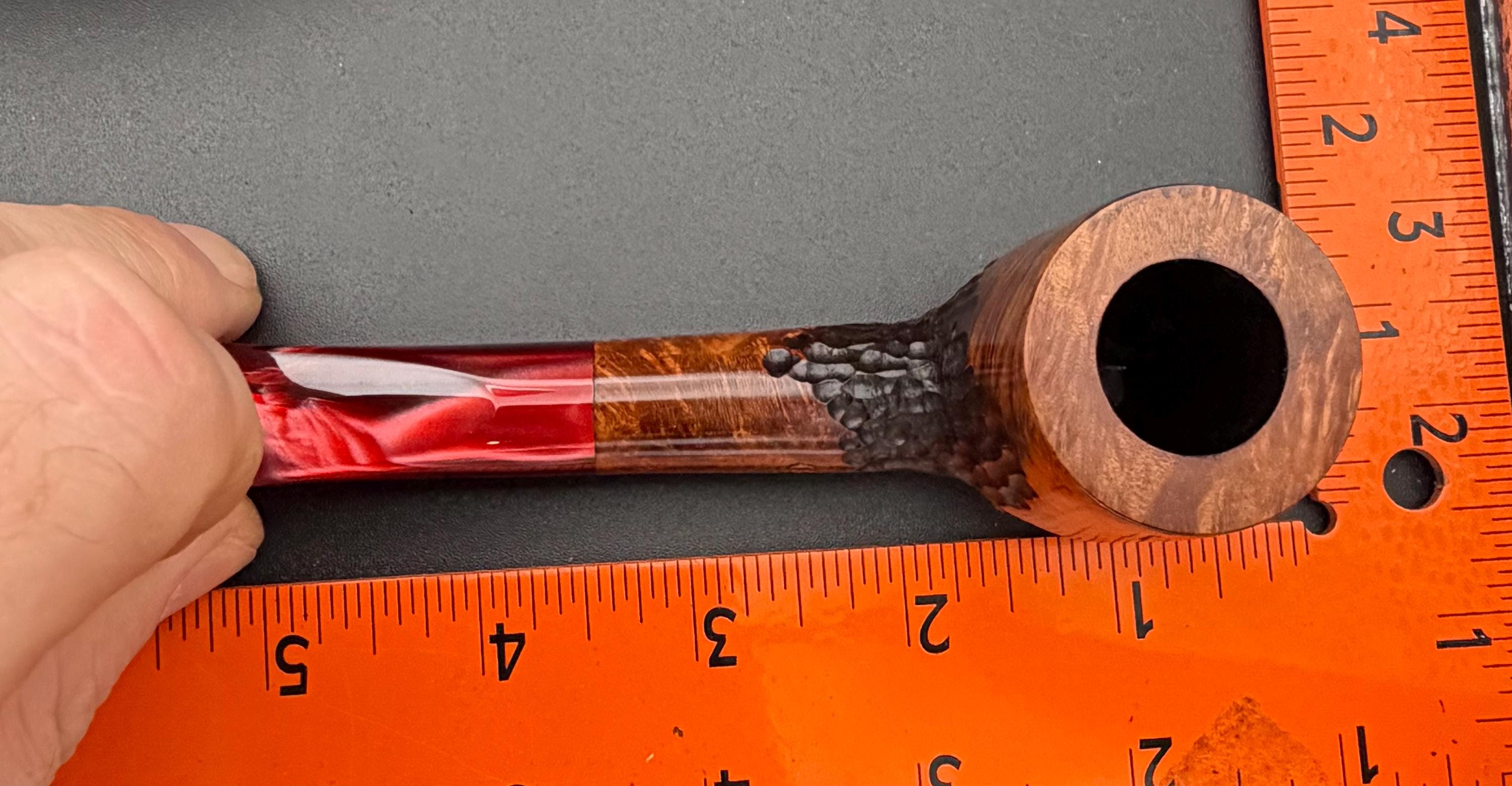 This is a handmade briar pipe that has been carved, sanded and polished by hand for several hours right here at my shop. A nice custom acrylic stem has been built for this one. These are built to be beautiful but also for every day smoking. This is a medium pipe perfect for the pocket. This one has a smaller 3/4” x 1 1/4”” bowl for a quicker smoke and the bowl has a carbon coating for a nice starter cake.