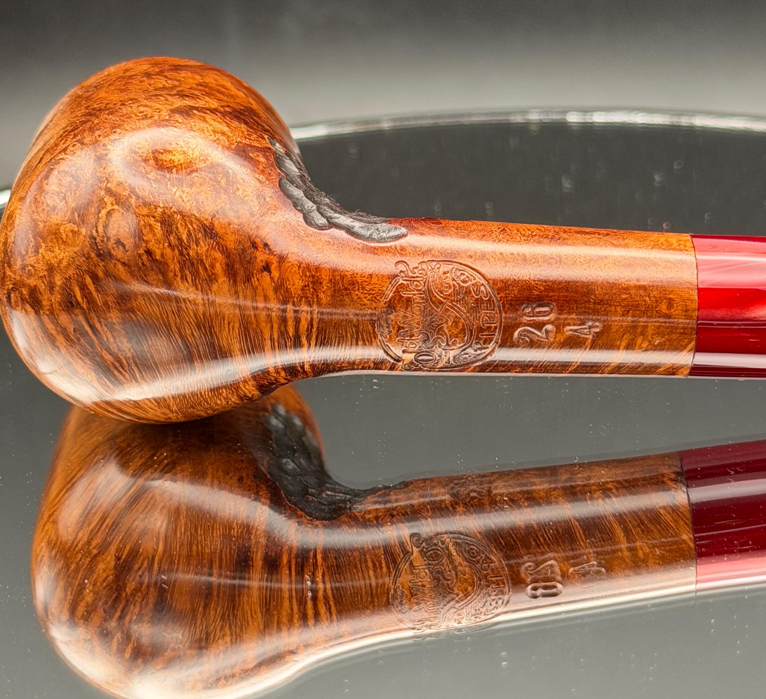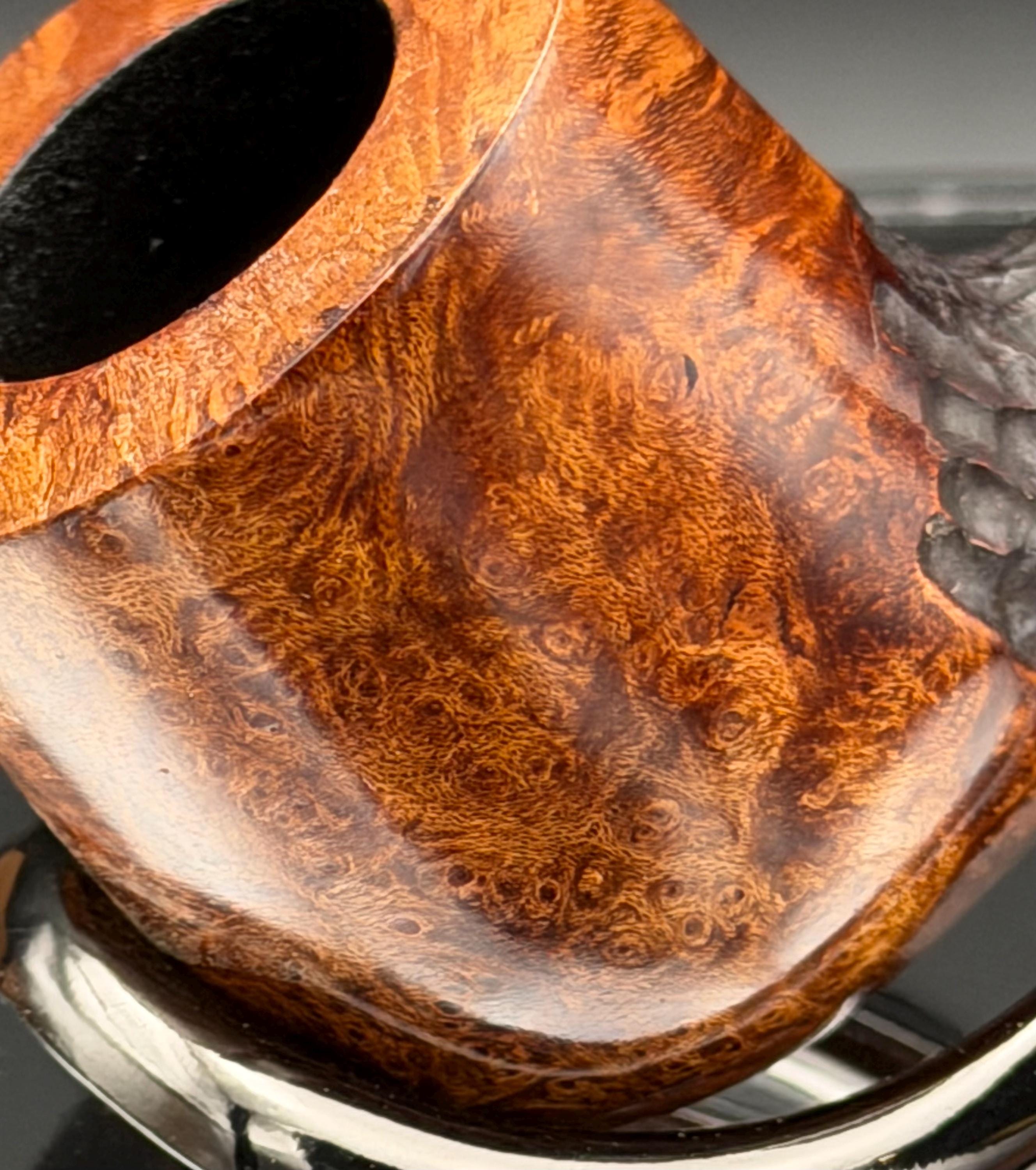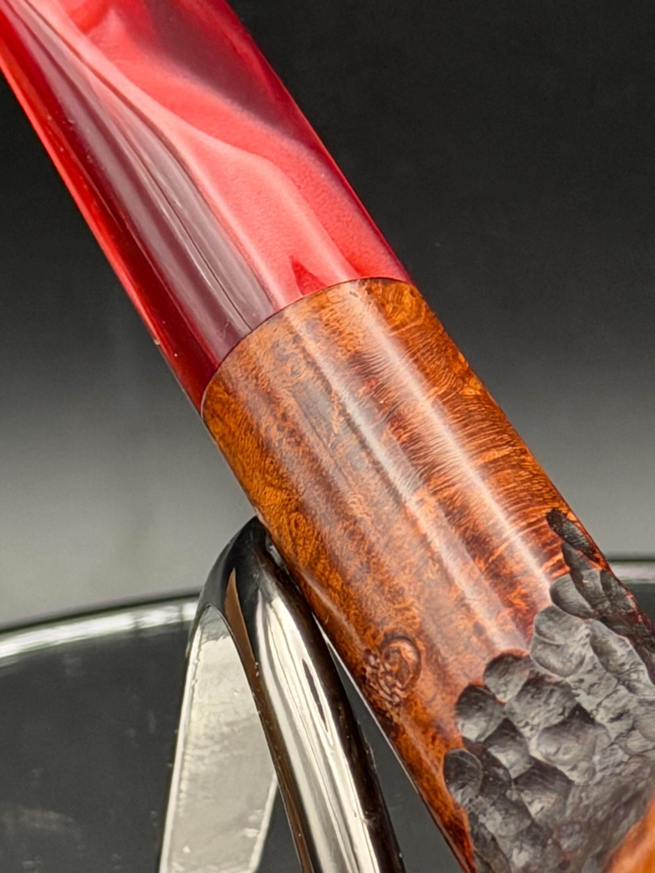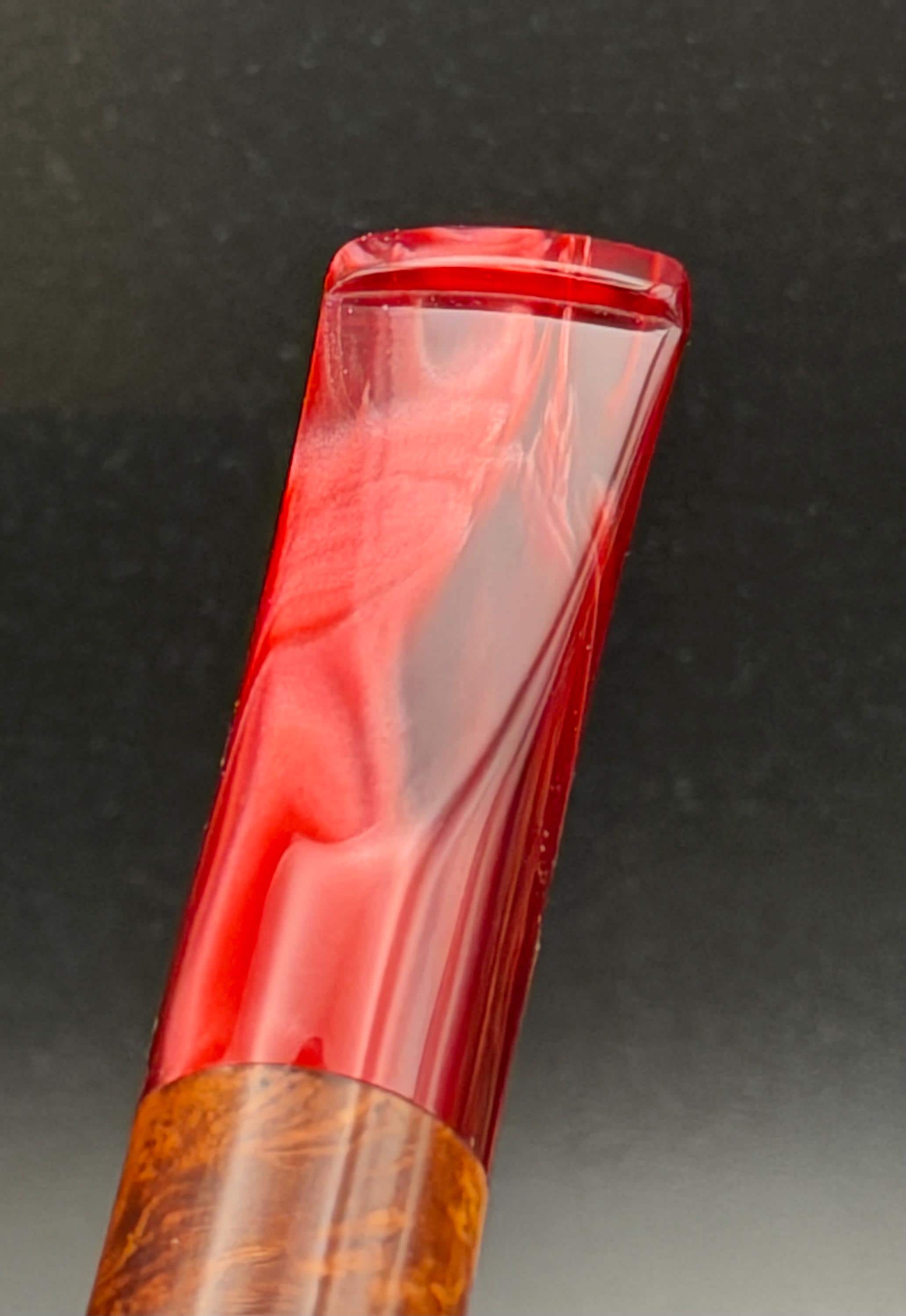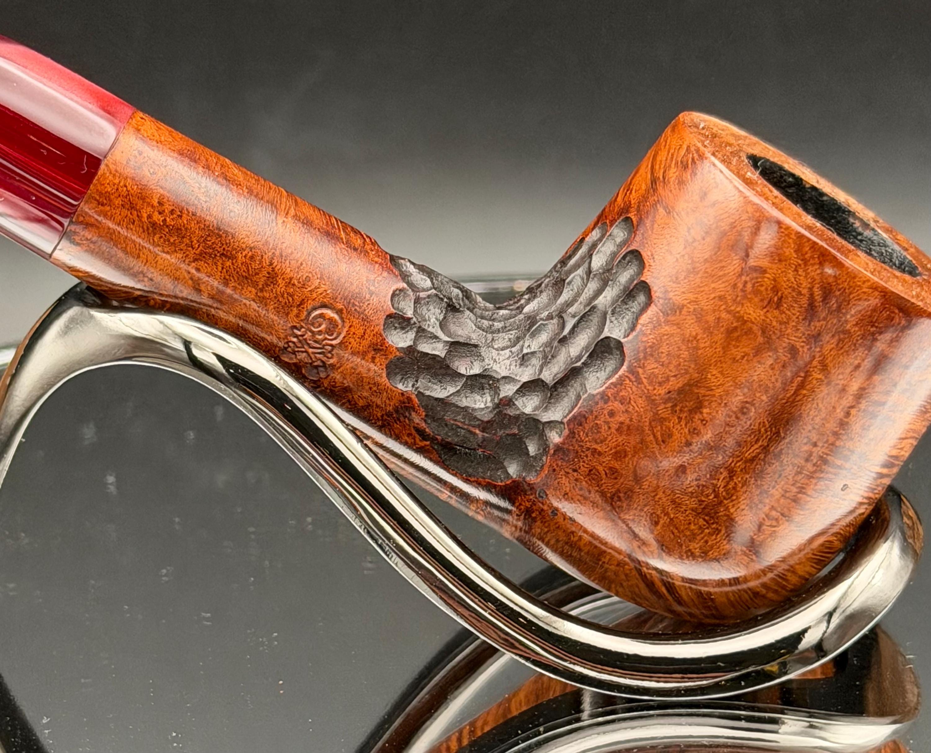 This is a handmade briar pipe that has been carved, sanded and polished by hand for several hours right here at my shop. A nice custom acrylic stem has been built for this one. These are built to be beautiful but also for every day smoking. This is a medium pipe perfect for the pocket. This one has a smaller 3/4” x 1 1/4”” bowl for a quicker smoke and the bowl has a carbon coating for a nice starter cake.