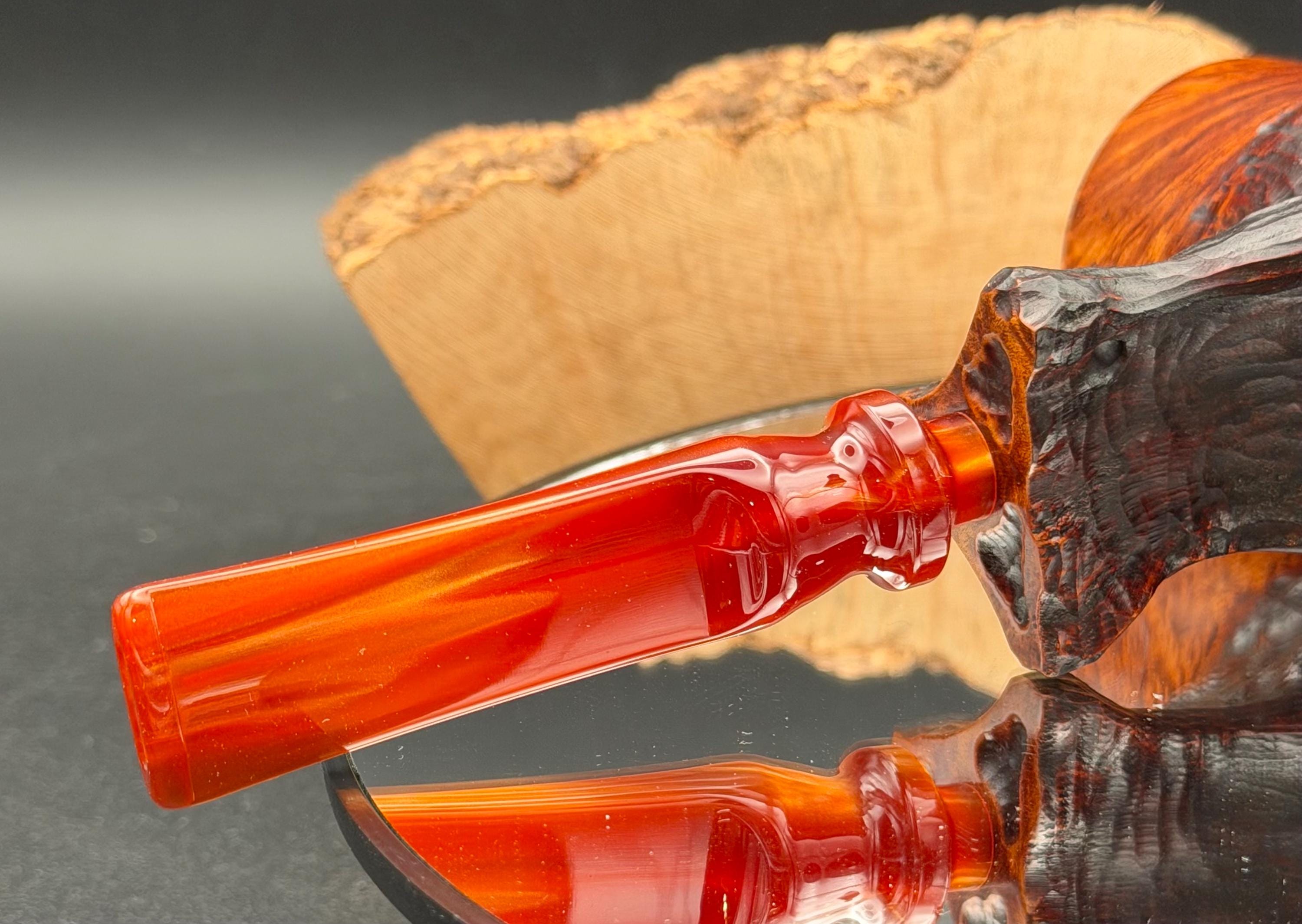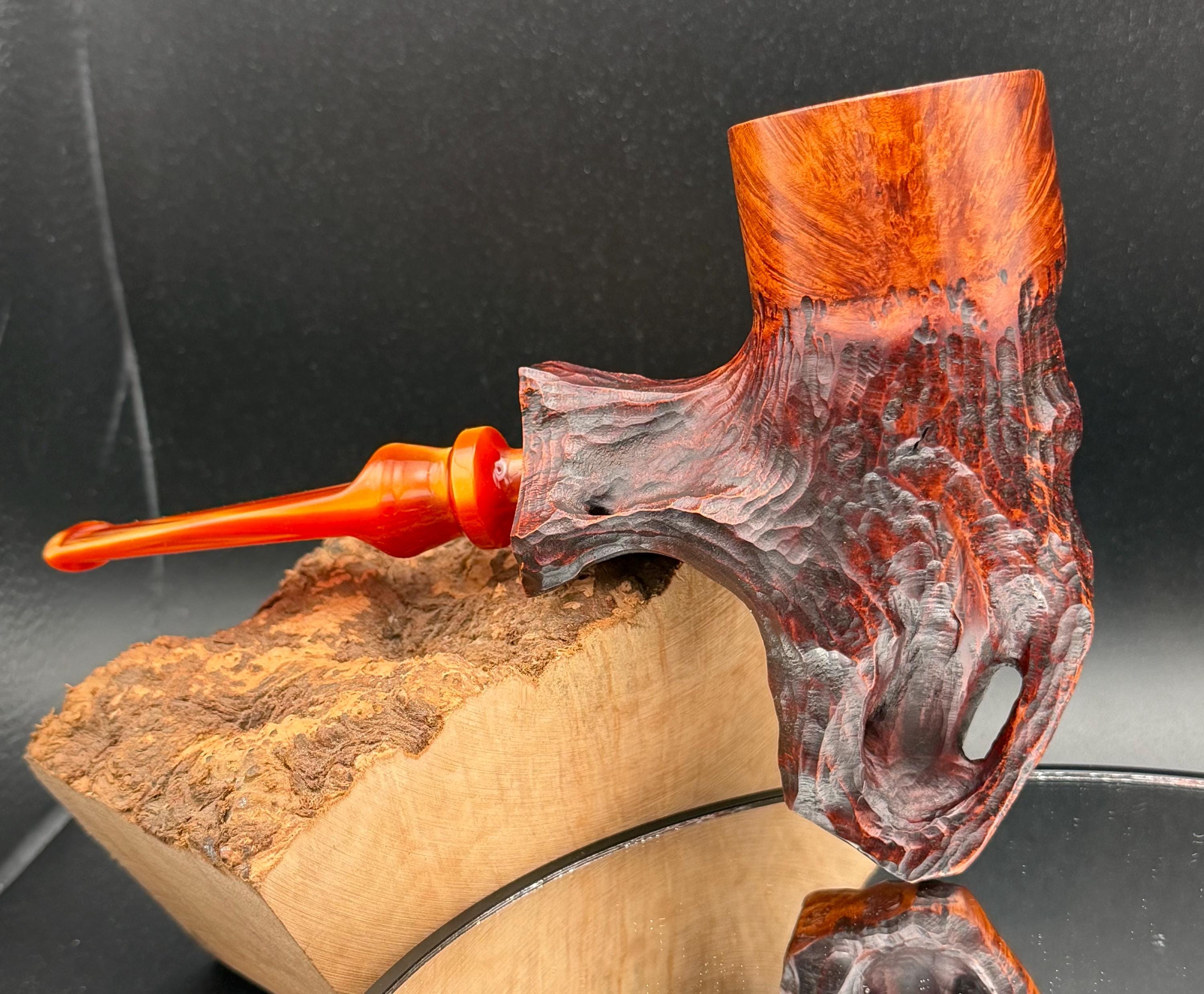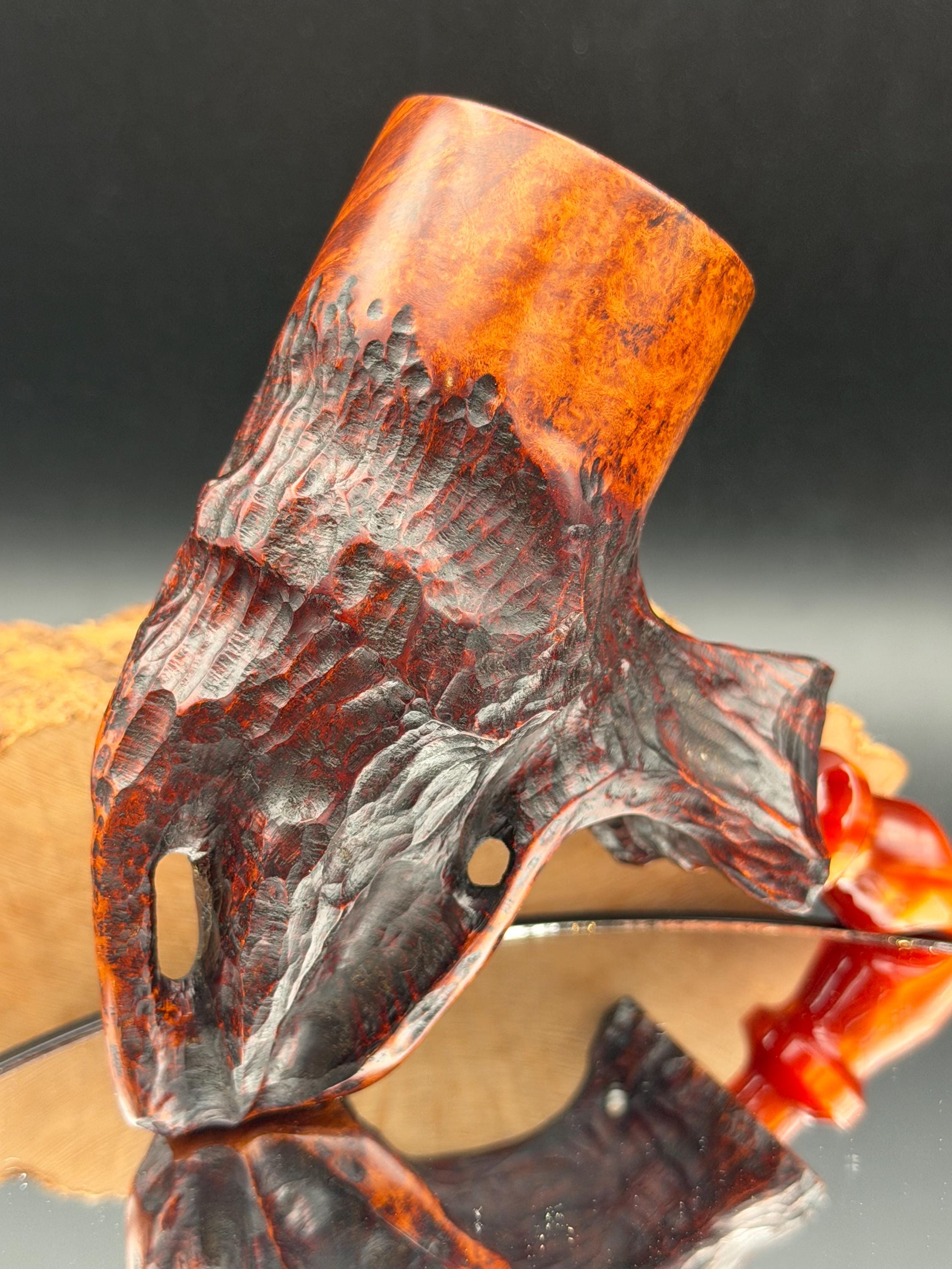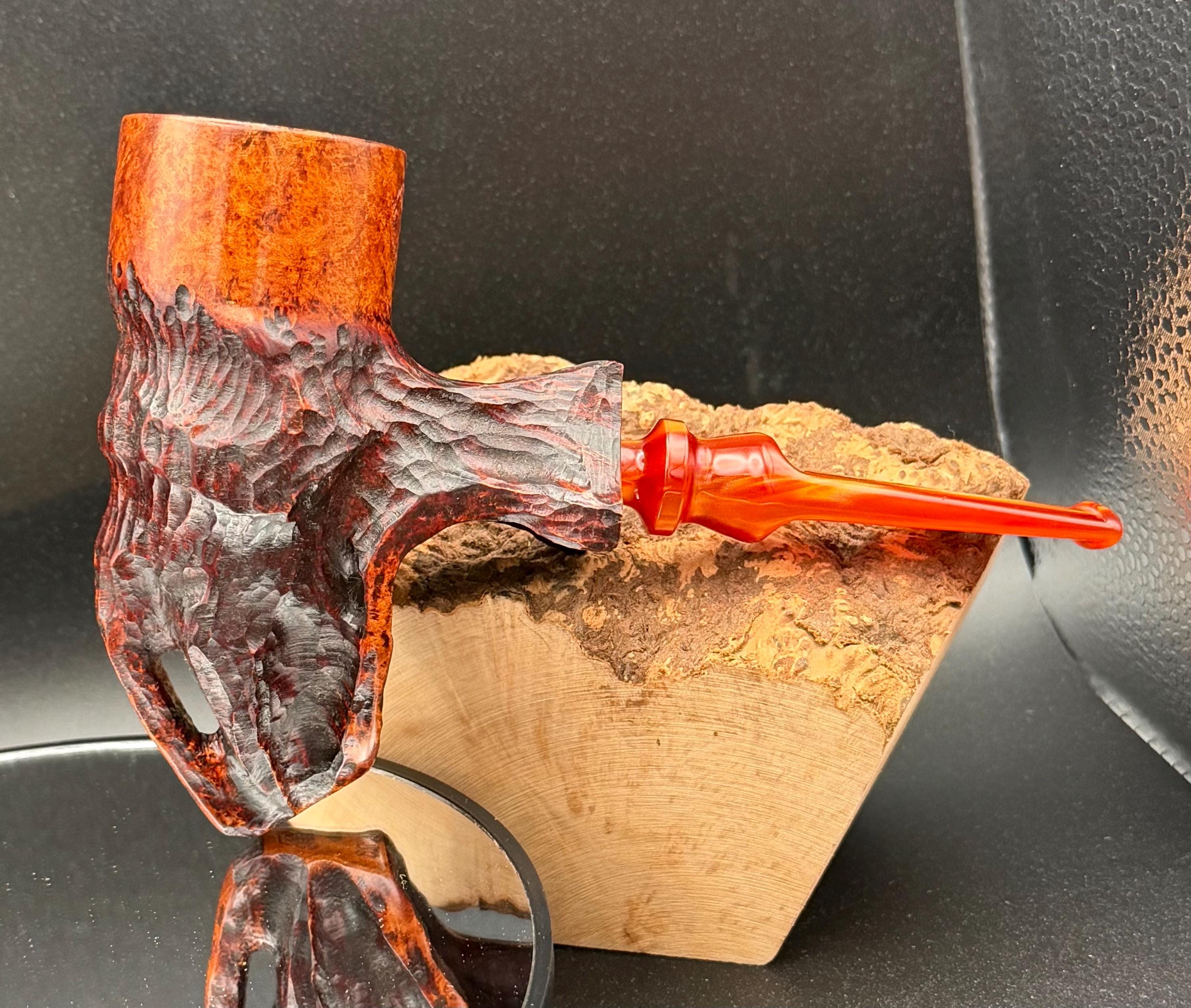 This is a handmade Grecian briar custom pick axe style pipe that has been carved and sanded by hand for several hours and polished by me here at the shop. Acrylic custom made stem machined and hand filed/polished. Non filtered. A very nice daily smoker. It has a nice sized 7/8”x 2” chamber and has been coated with a carbon starter cake.