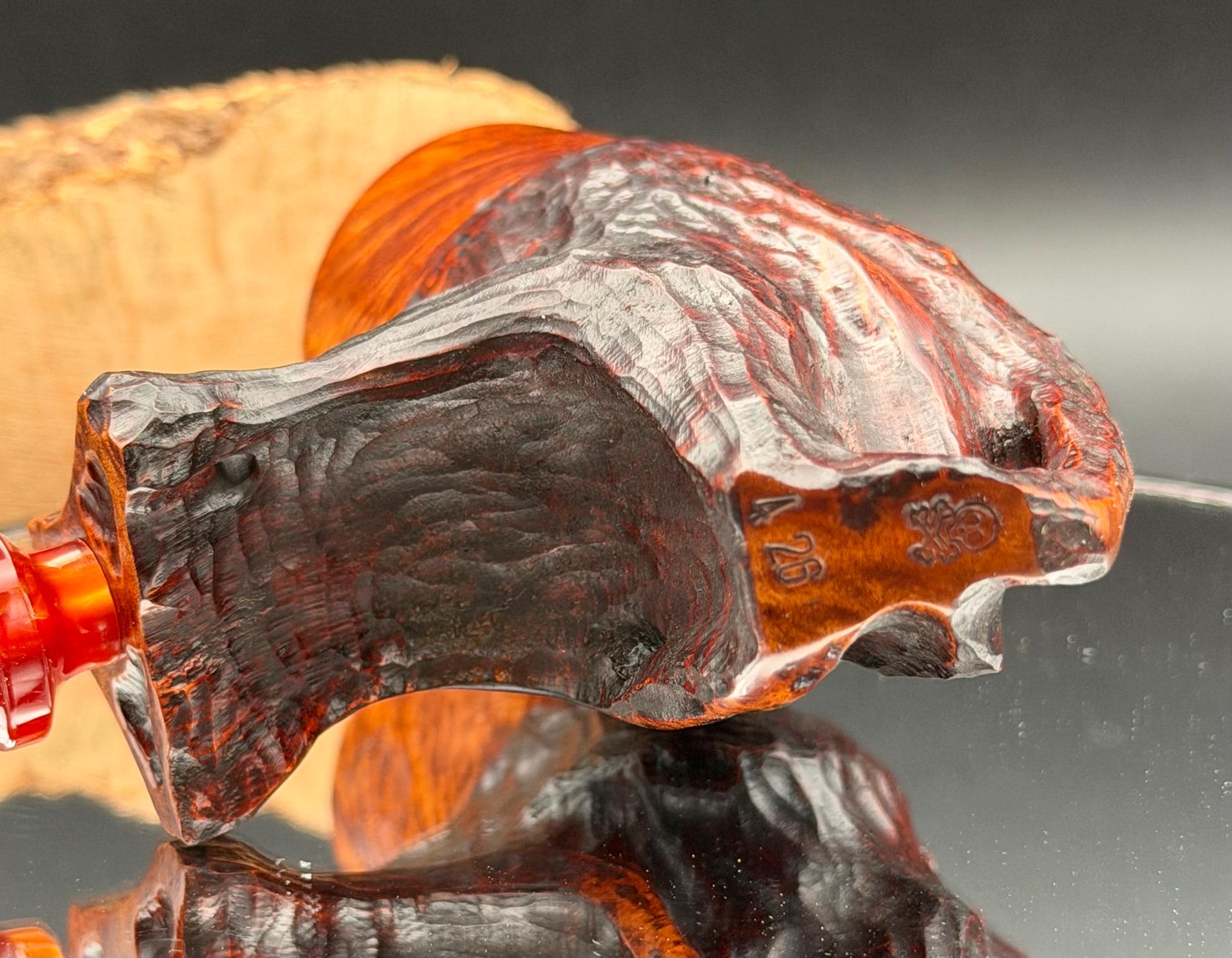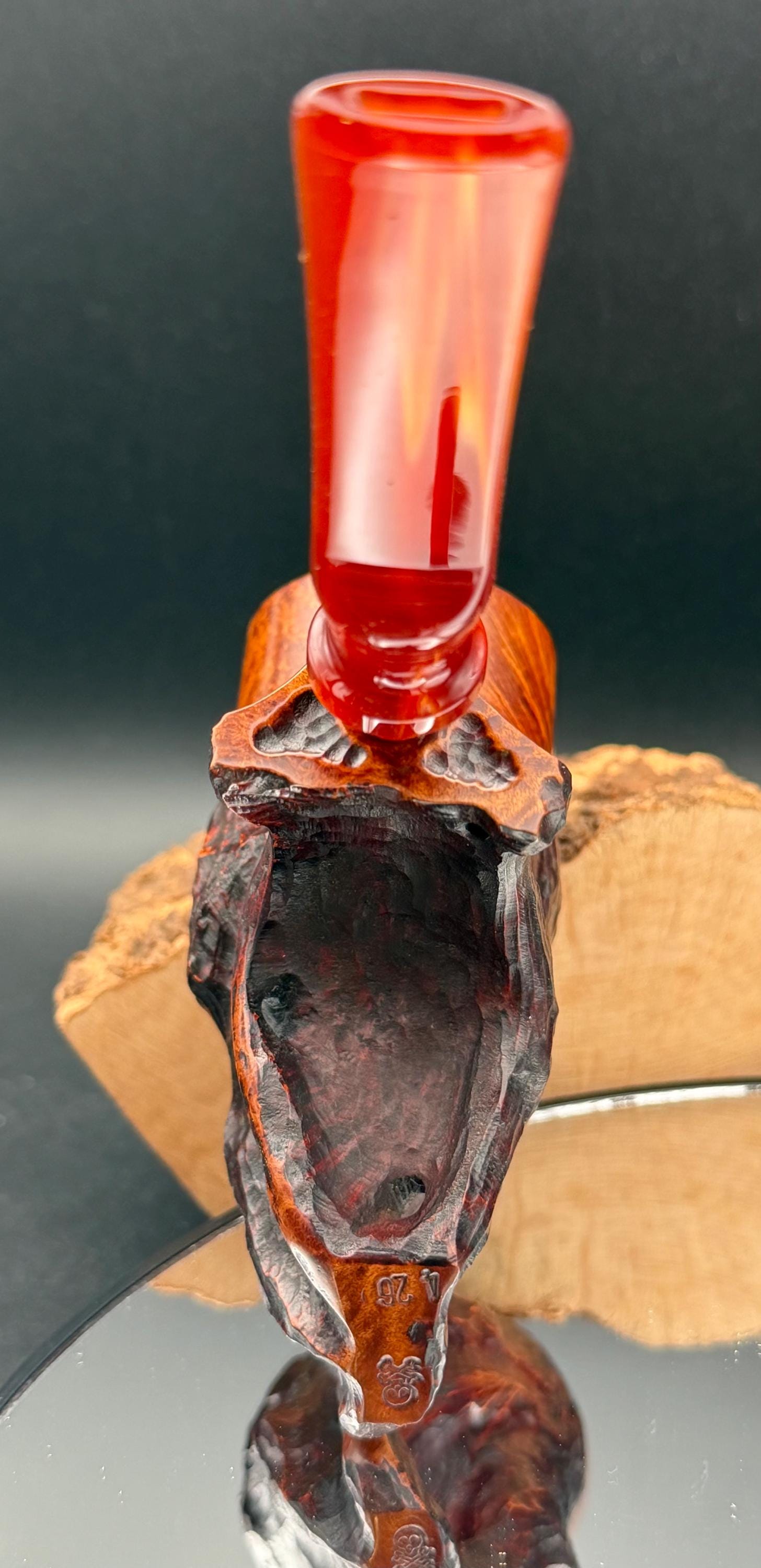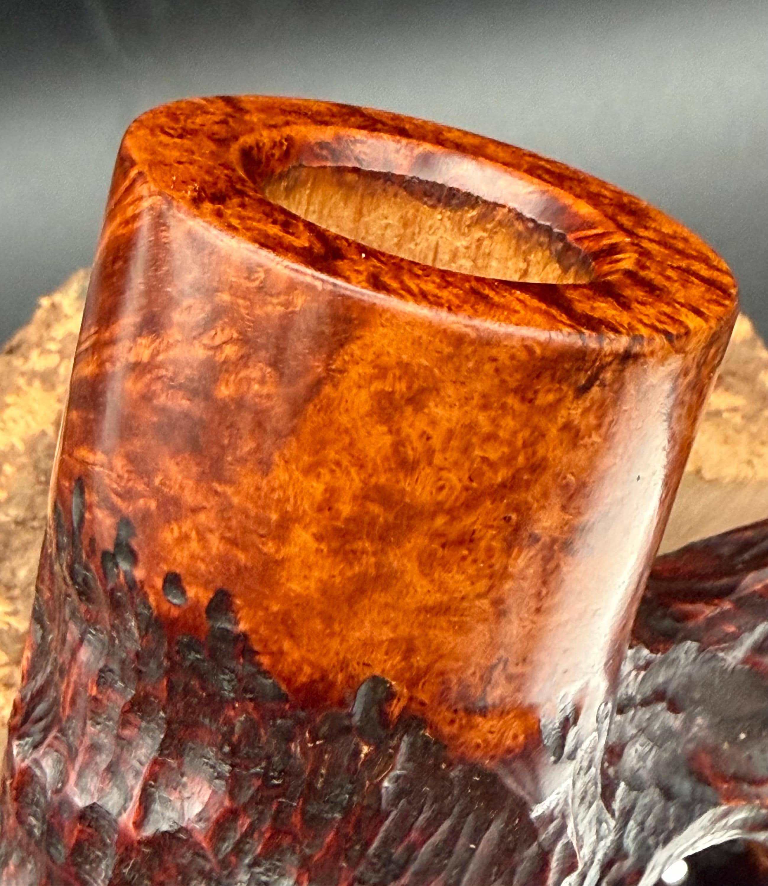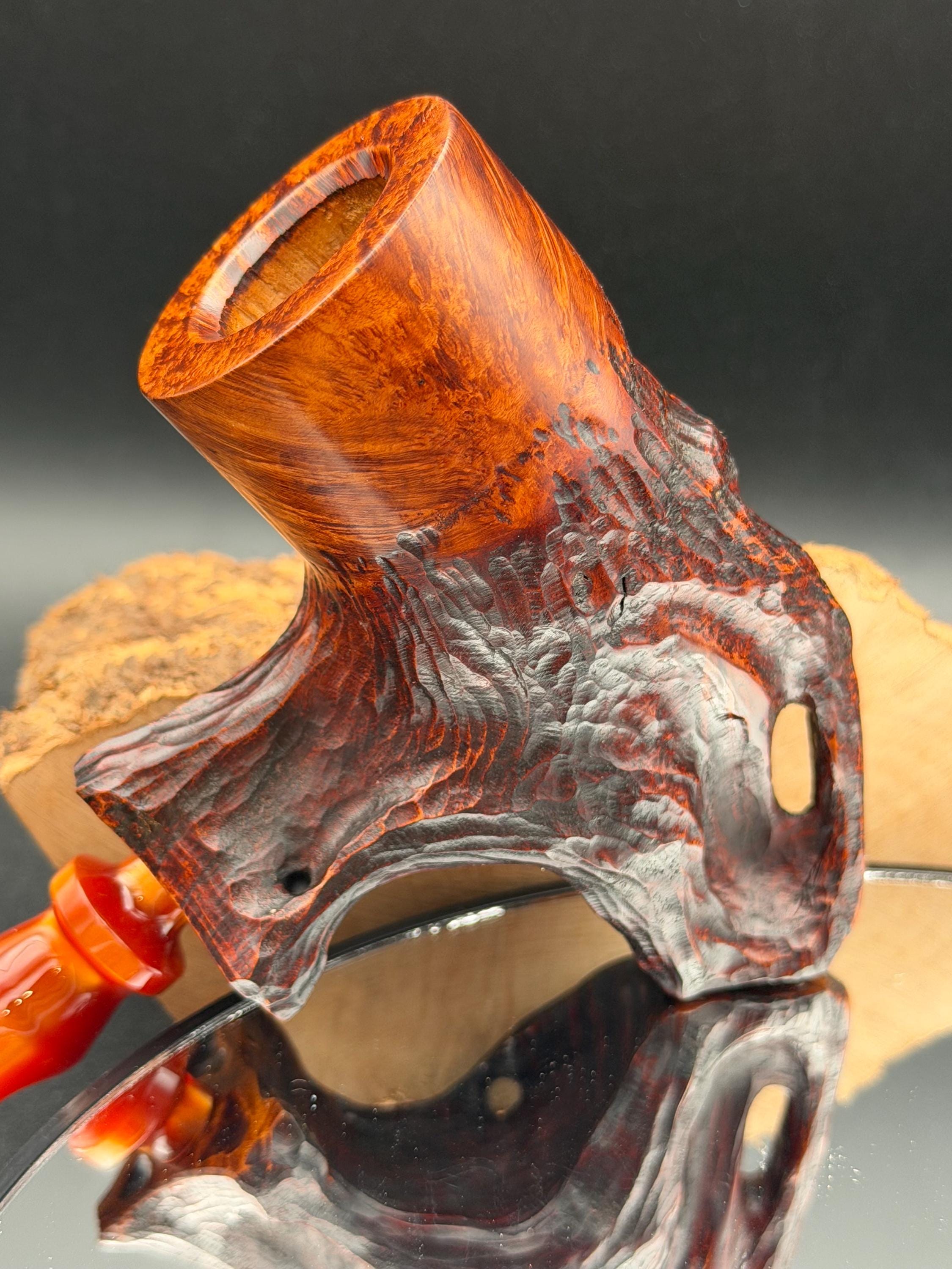 This is a handmade Grecian briar custom pick axe style pipe that has been carved and sanded by hand for several hours and polished by me here at the shop. Acrylic custom made stem machined and hand filed/polished. Non filtered. A very nice daily smoker. It has a nice sized 7/8”x 2” chamber and has been coated with a carbon starter cake.