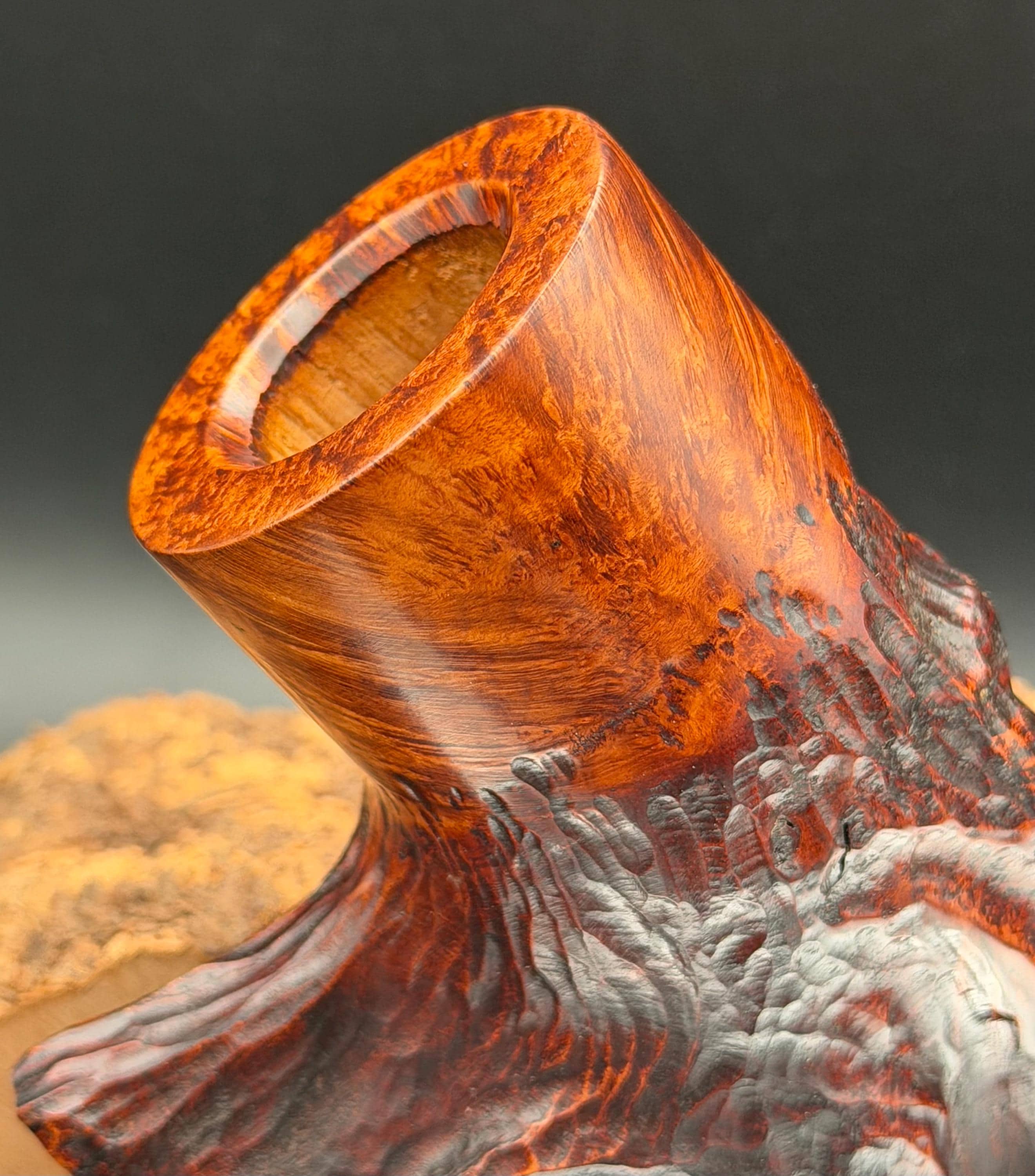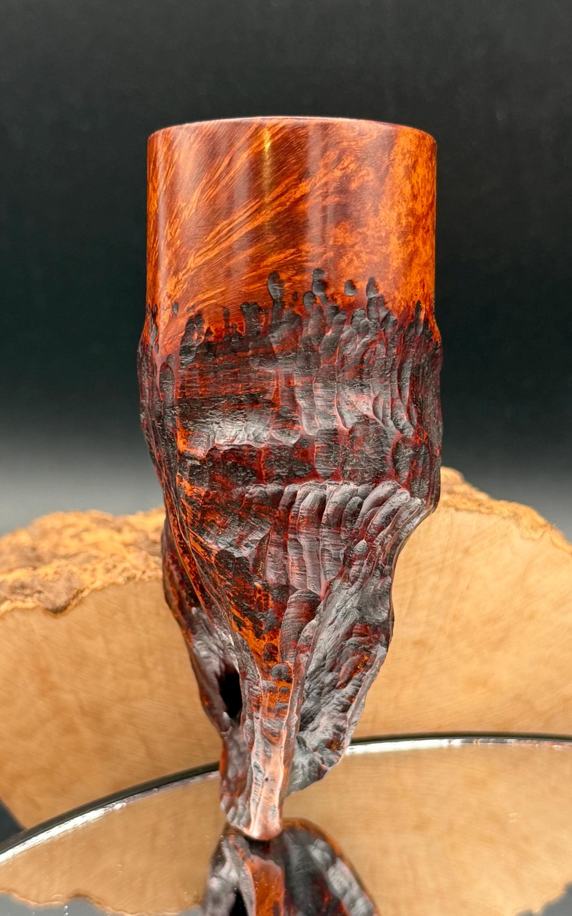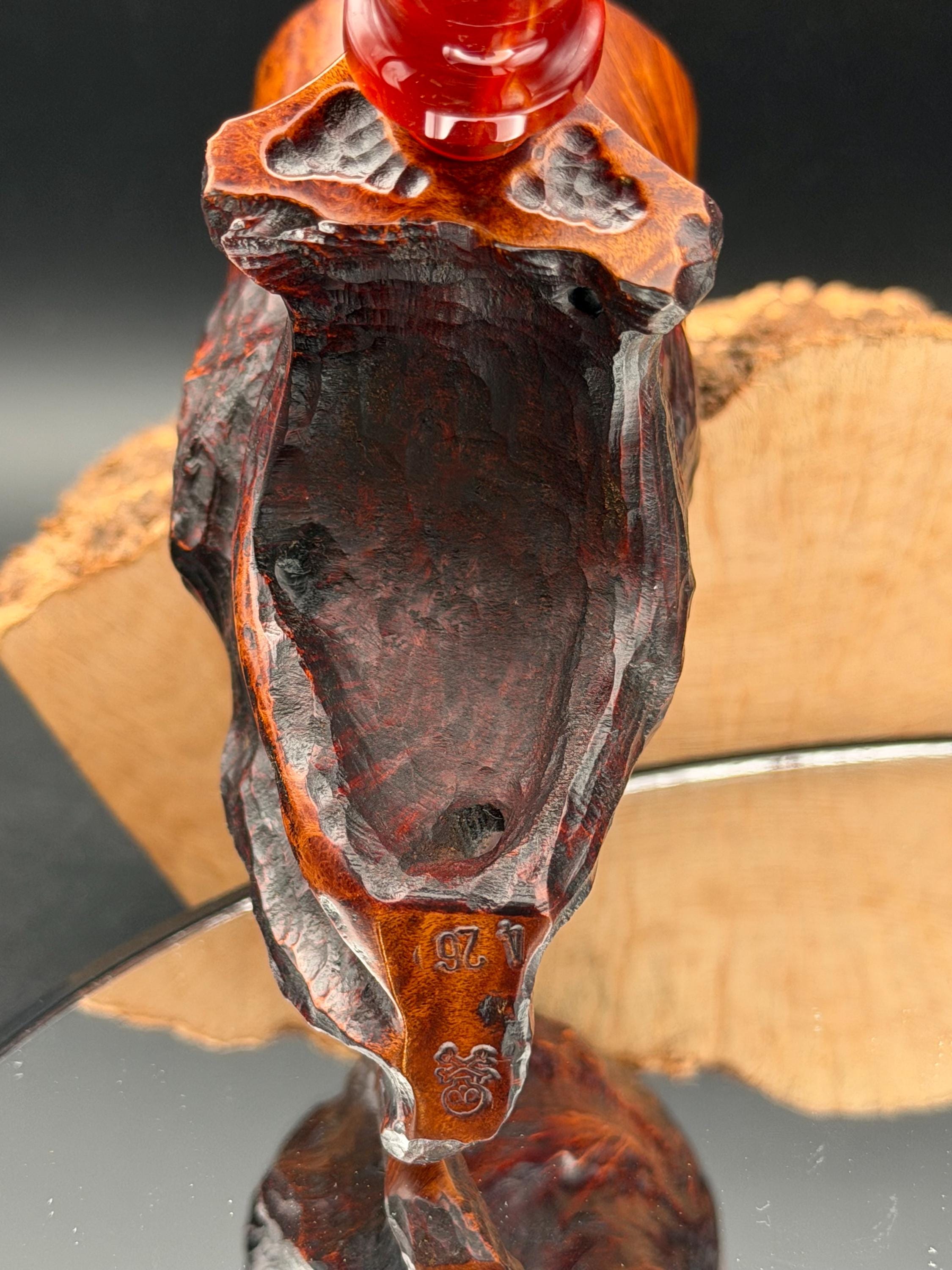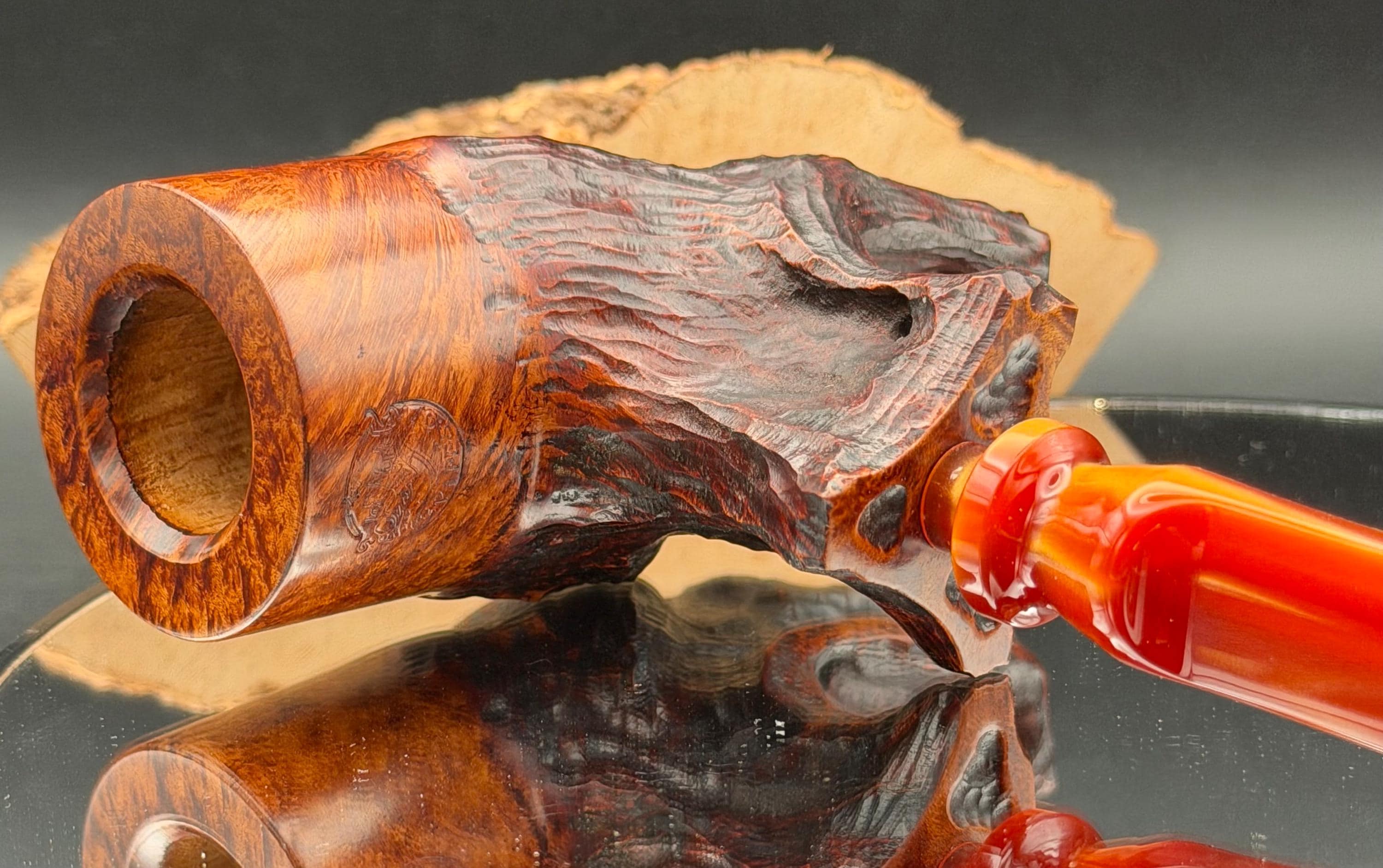 This is a handmade Grecian briar custom pick axe style pipe that has been carved and sanded by hand for several hours and polished by me here at the shop. Acrylic custom made stem machined and hand filed/polished. Non filtered. A very nice daily smoker. It has a nice sized 7/8”x 2” chamber and has been coated with a carbon starter cake.