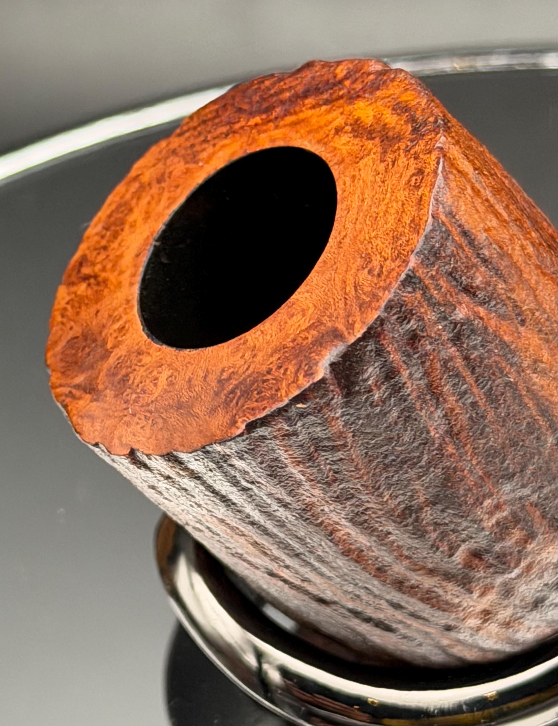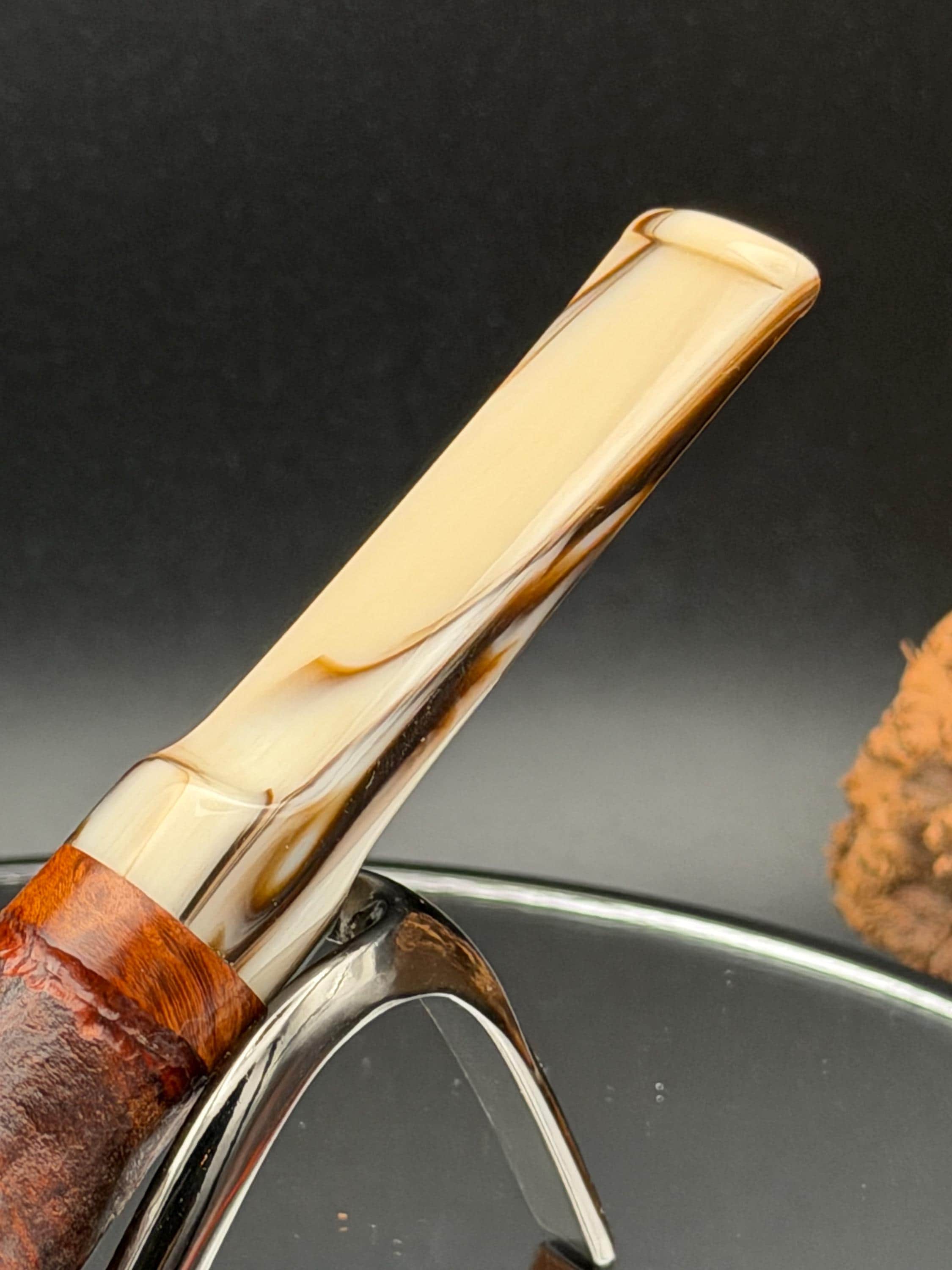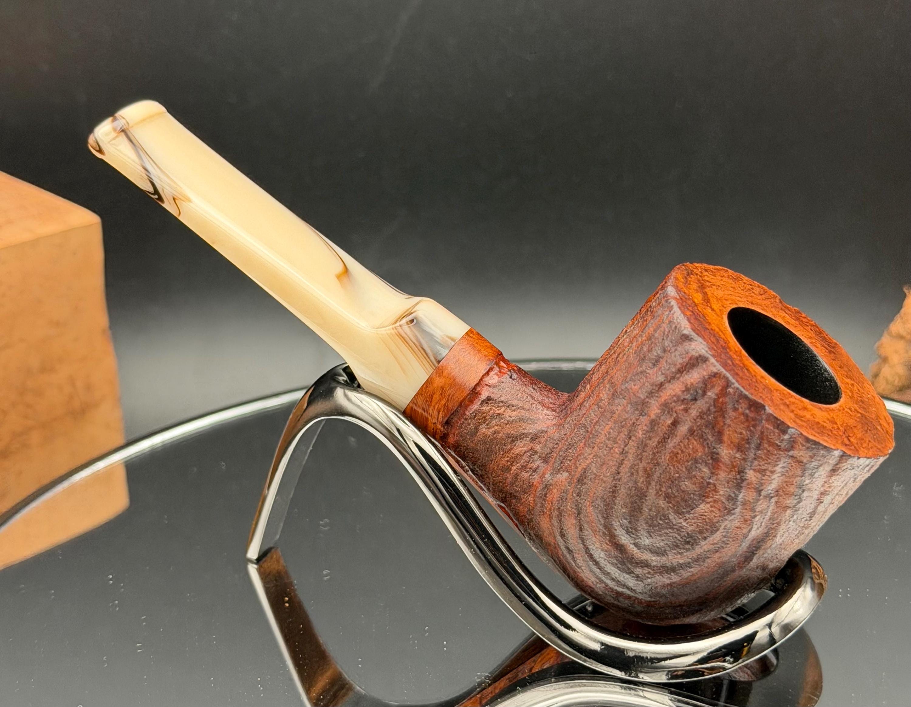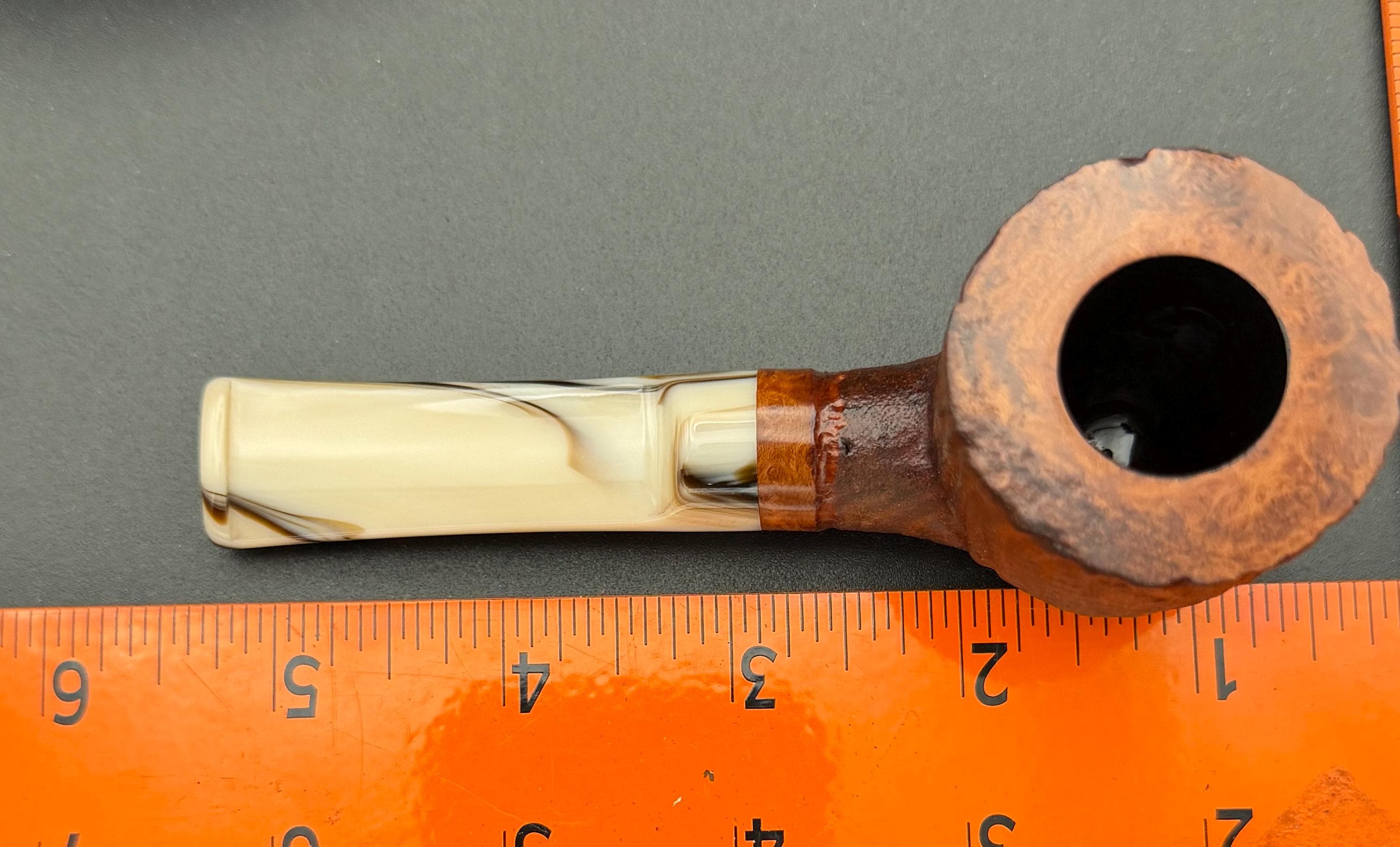 This is a handmade briar pipe that has been carved, sanded, sandblasted and polished by hand for several hours .A nice acrylic custom made stem was machined to fit perfectly. This one is non filtered. A very nice daily smoker. Bowl is a smaller diameter on this one to accommodate the shorter length of this pipe at 3/4” x 1.5” and has been coated with a carbon starter.
