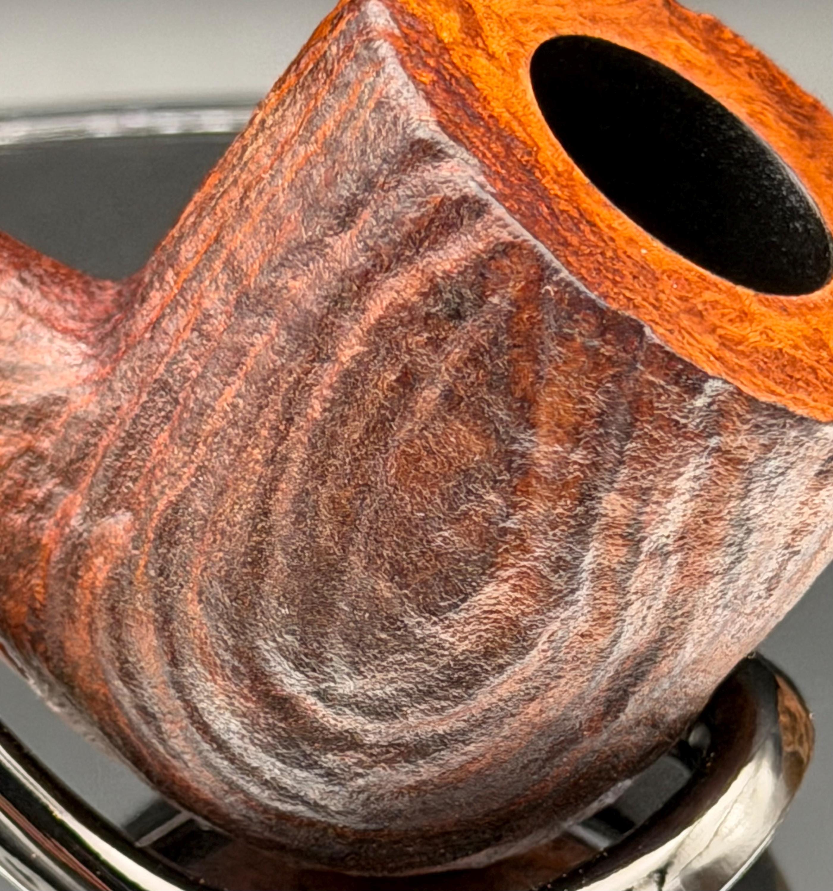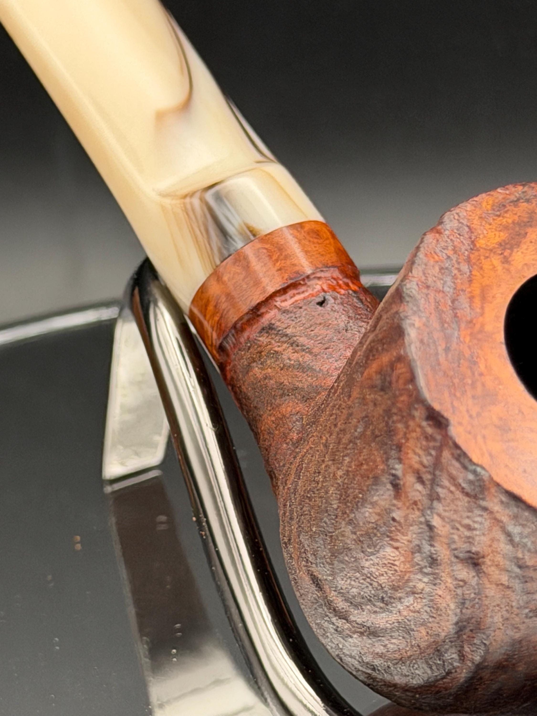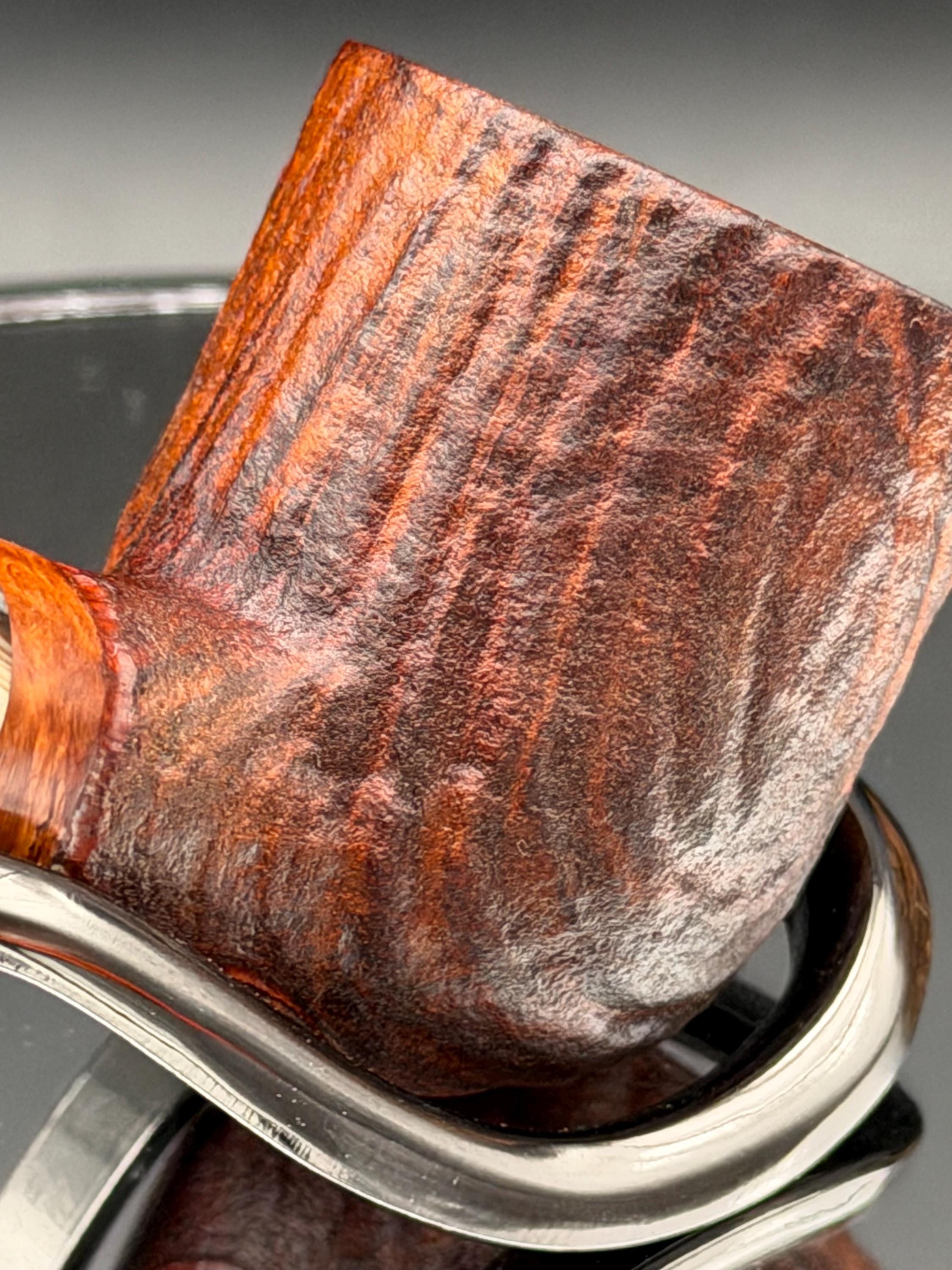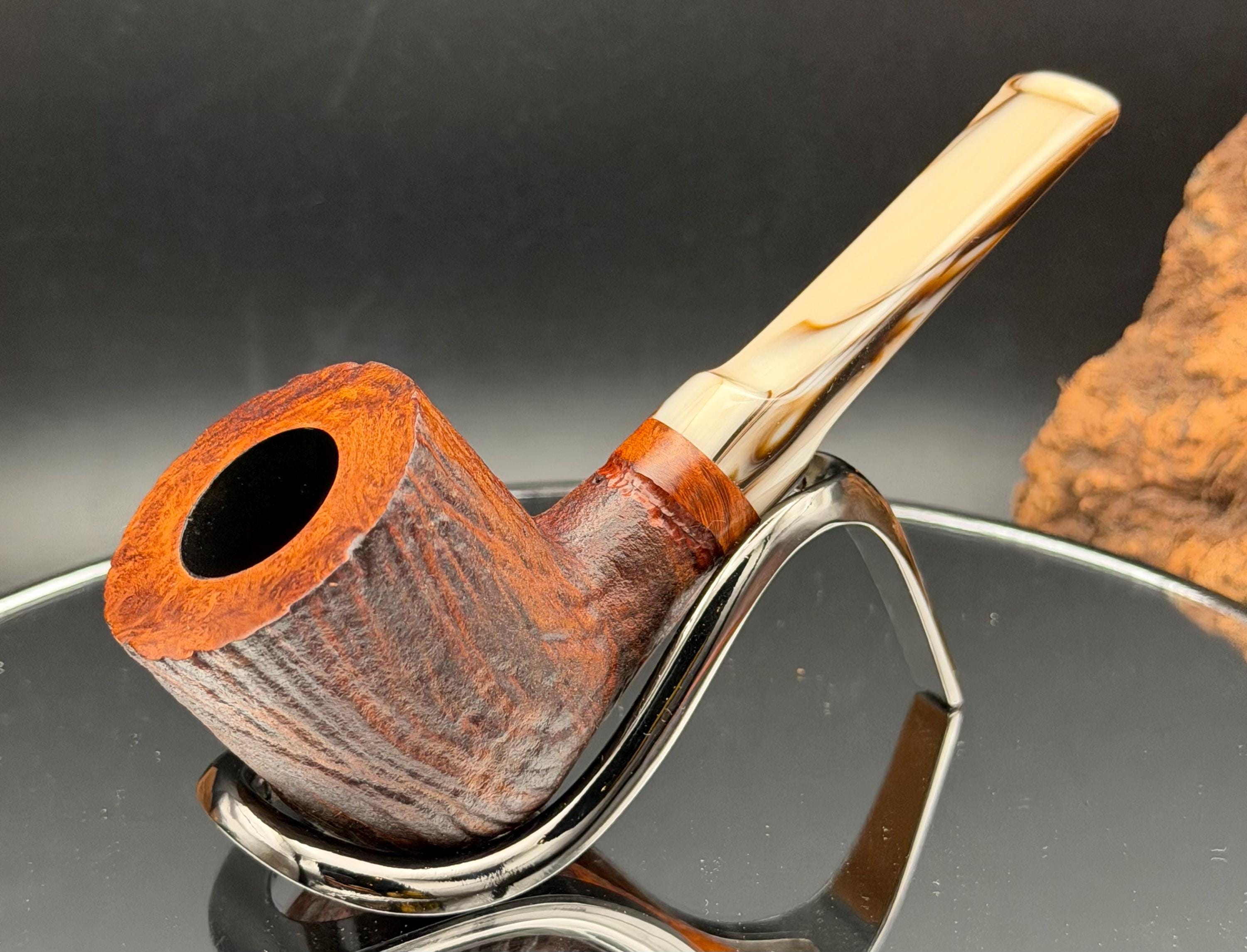 This is a handmade briar pipe that has been carved, sanded, sandblasted and polished by hand for several hours .A nice acrylic custom made stem was machined to fit perfectly. This one is non filtered. A very nice daily smoker. Bowl is a smaller diameter on this one to accommodate the shorter length of this pipe at 3/4” x 1.5” and has been coated with a carbon starter.